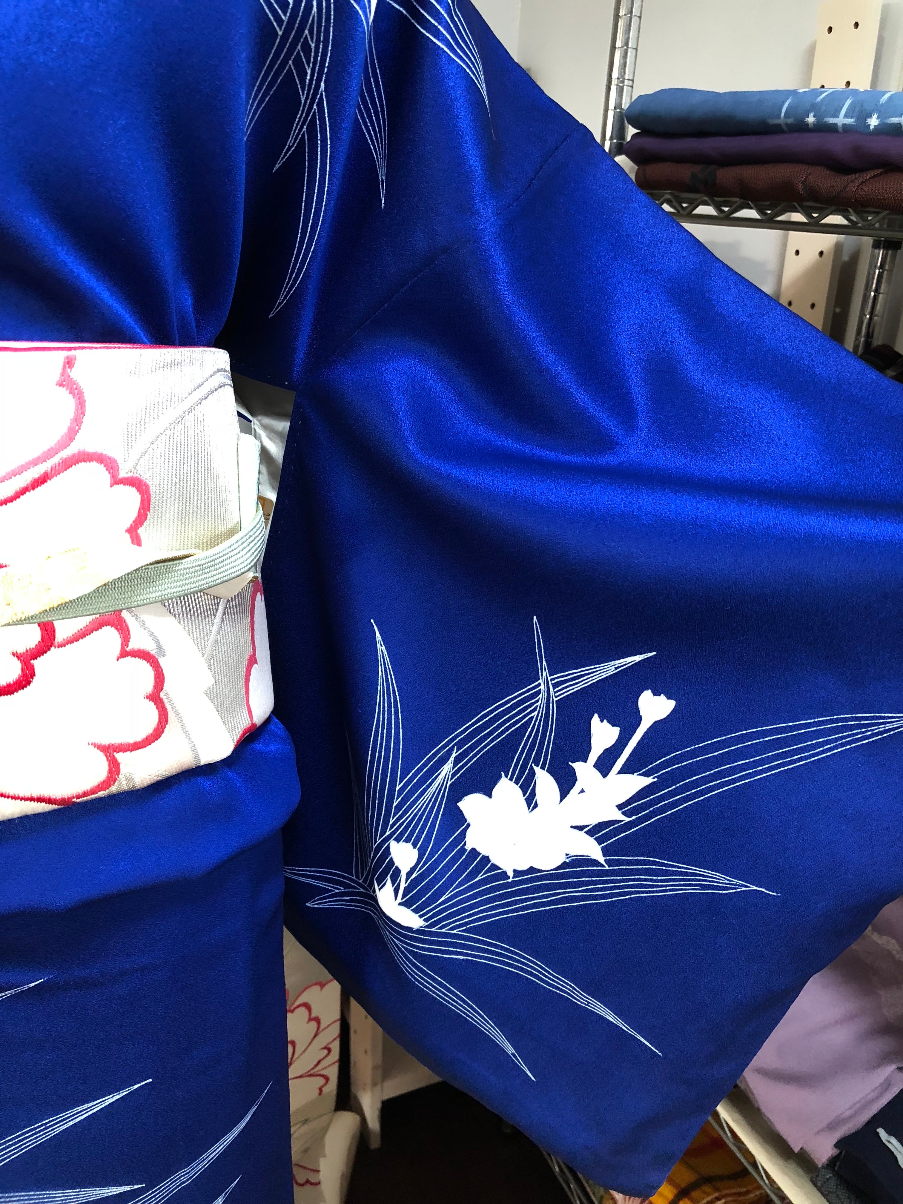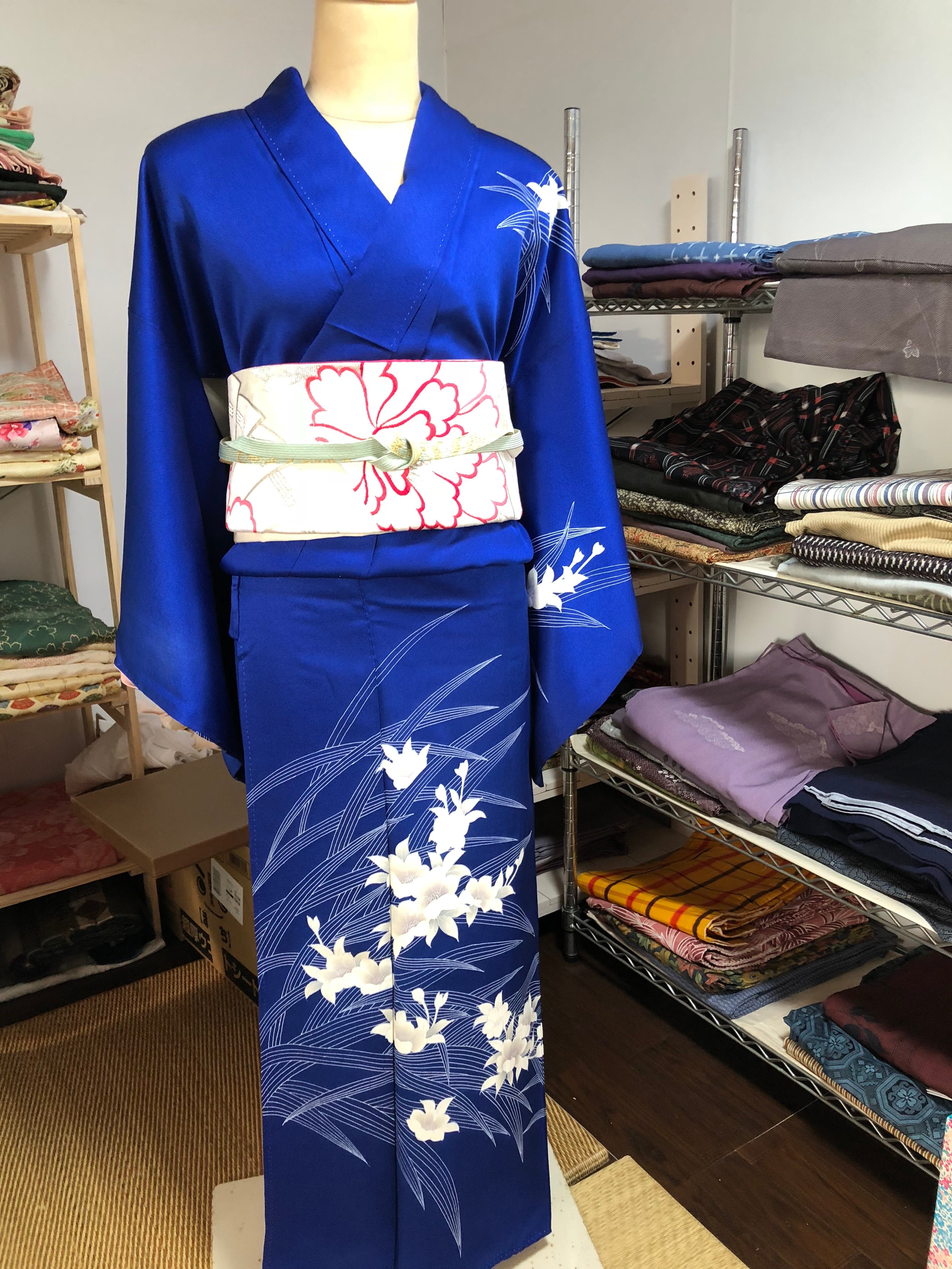美しい光沢のロイヤルブルー地に白百合が映える訪問着。