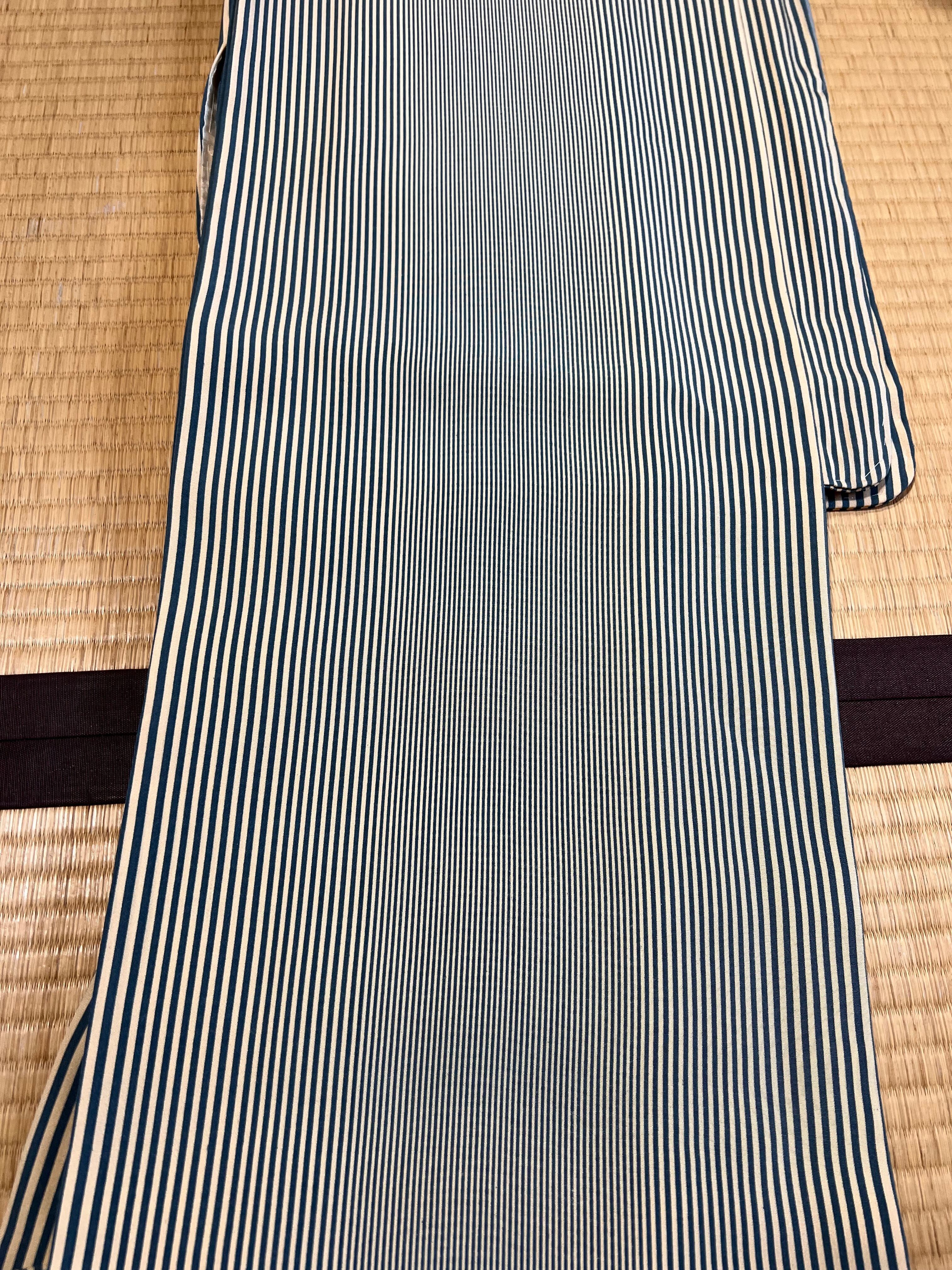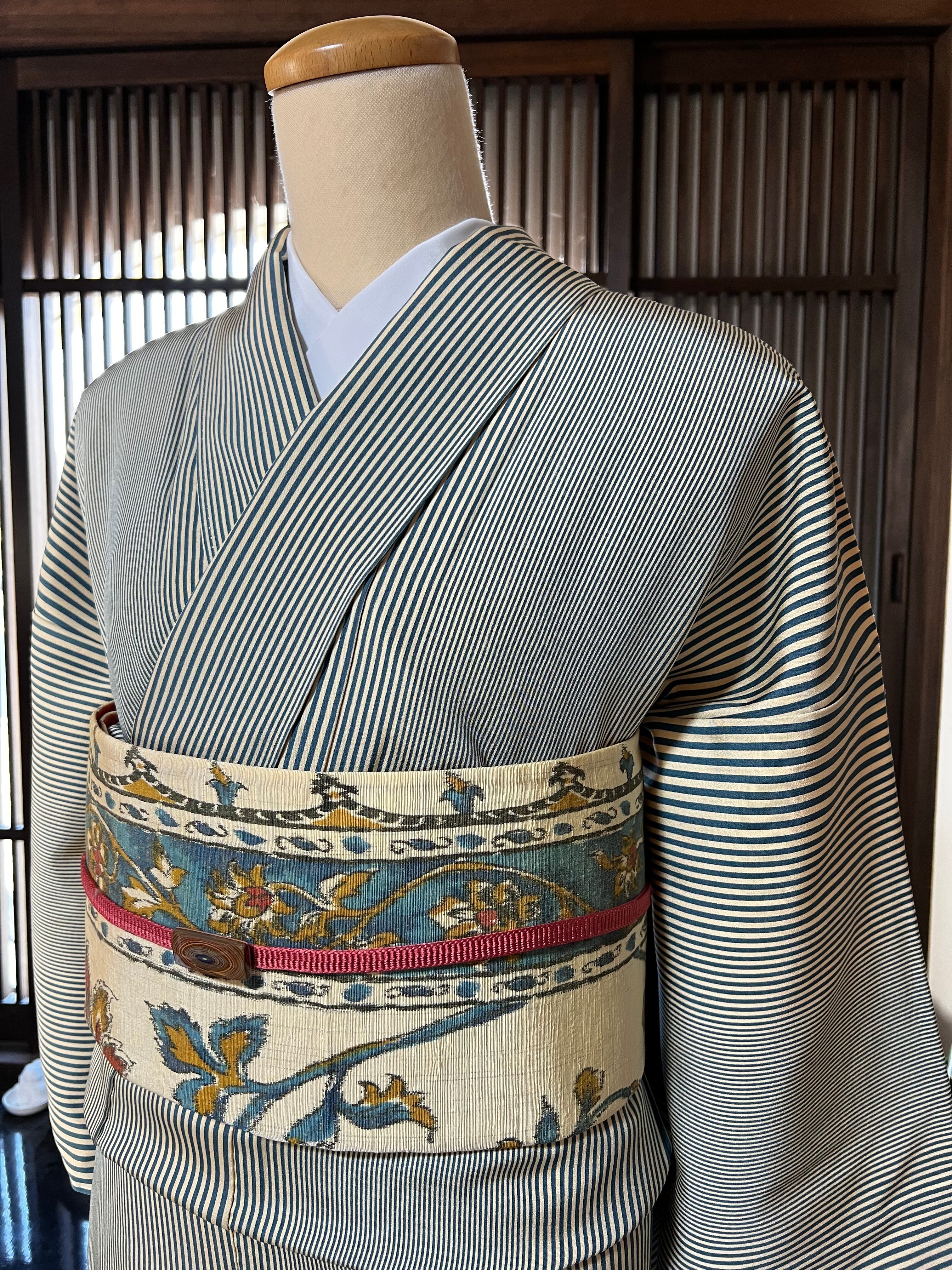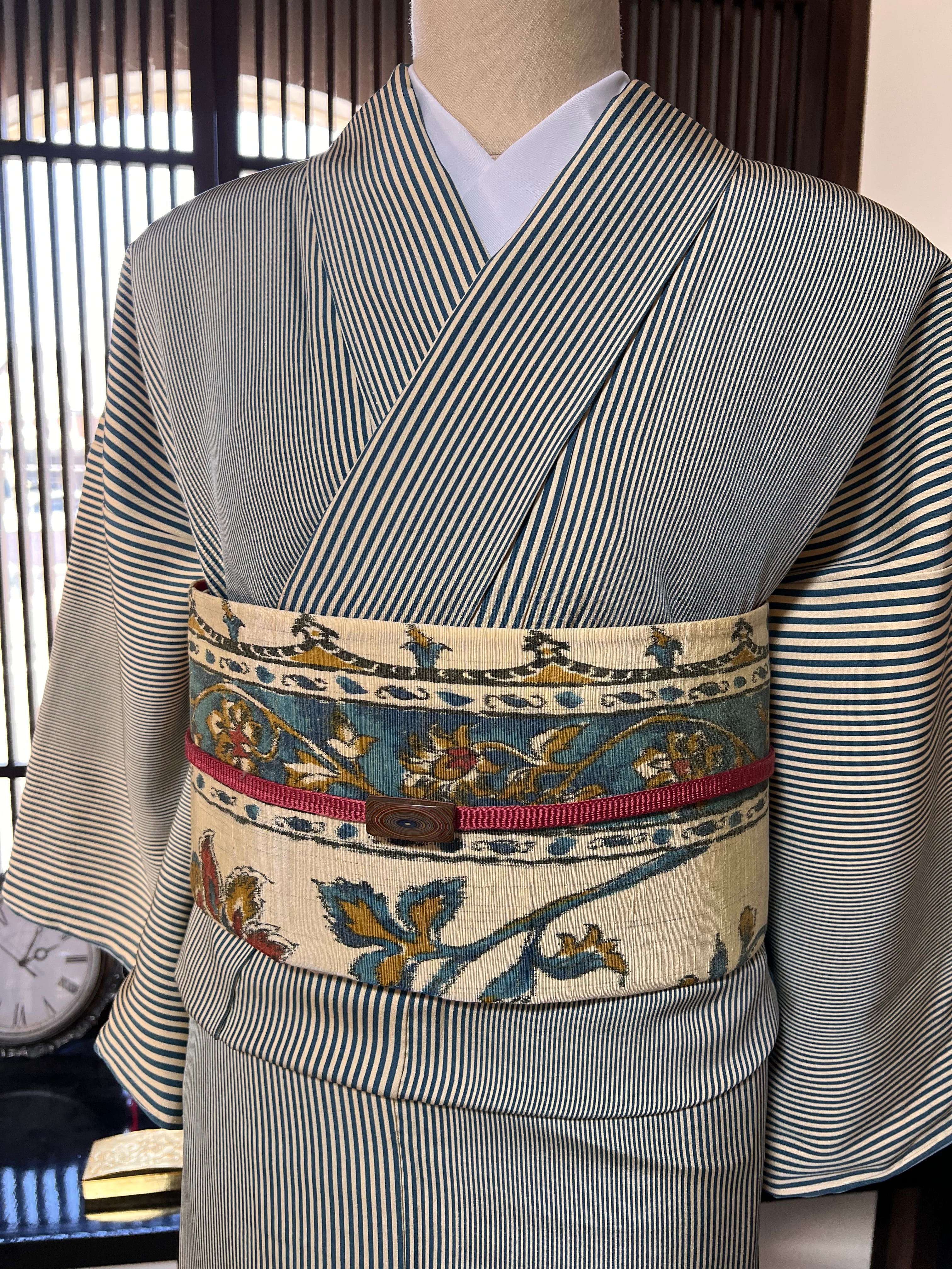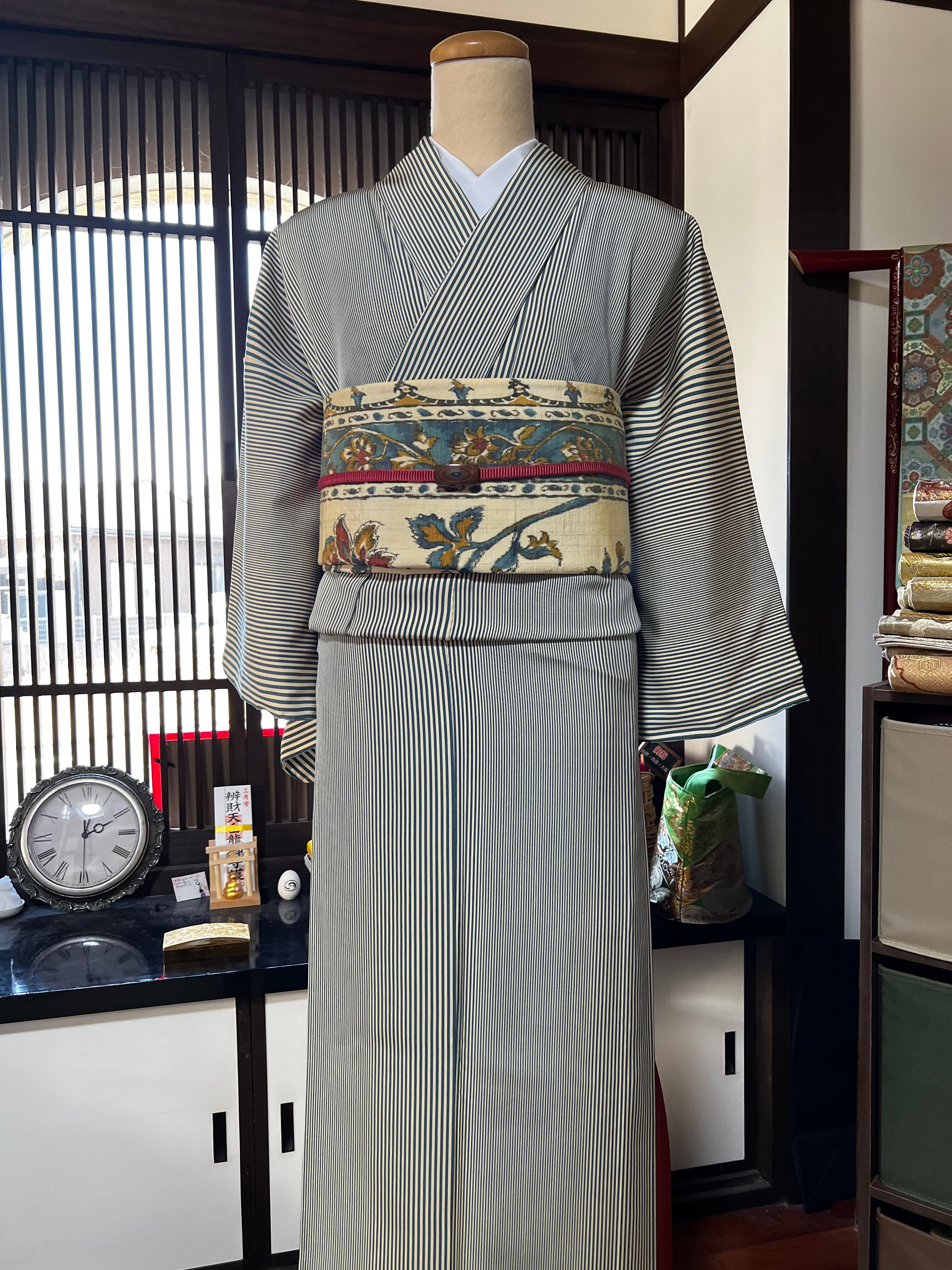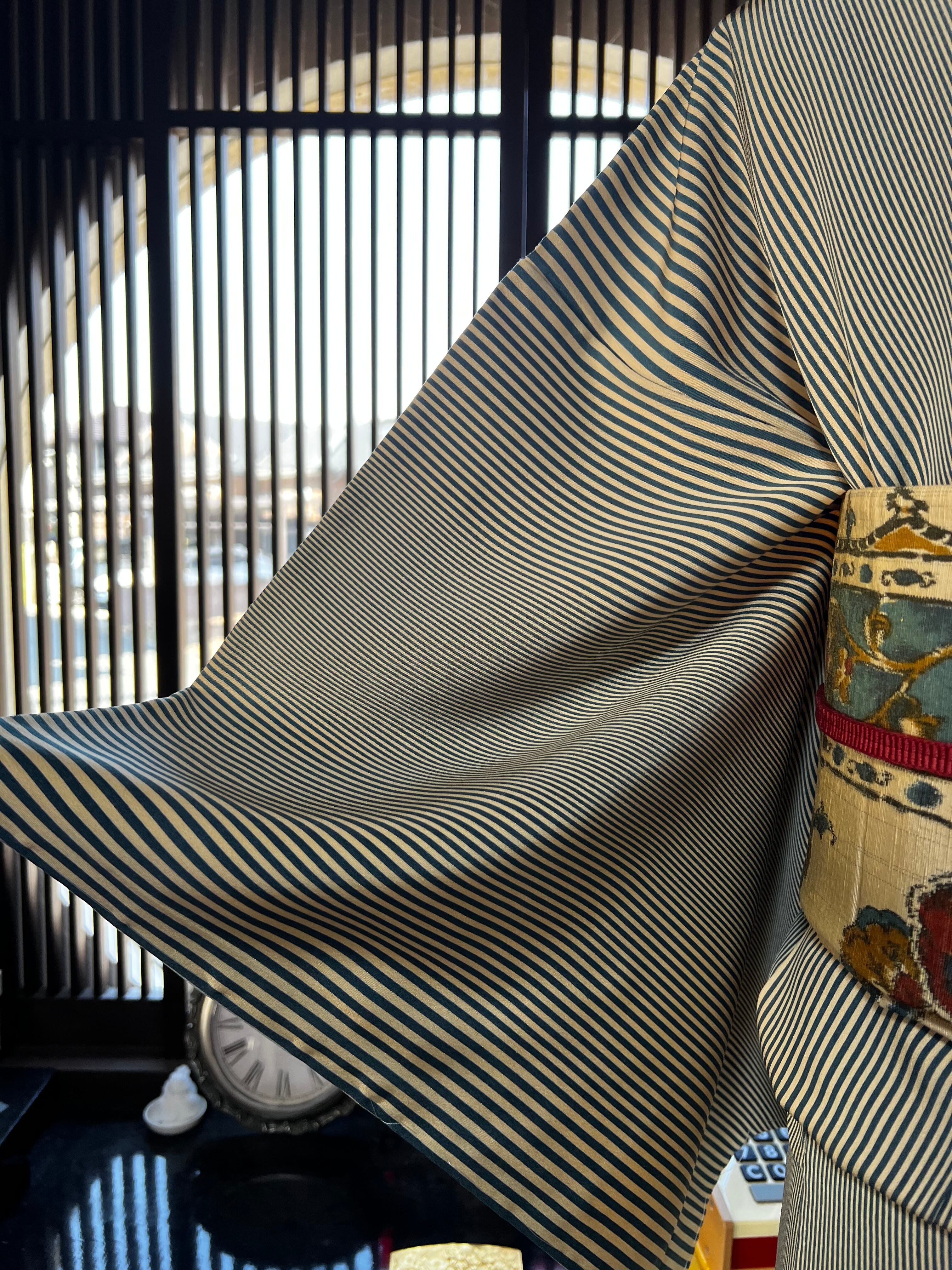 ベージュ地に優しい緑の変わりストライプが印象的な小紋です!この一品は、独自の柄行きが特徴で、カジュアルな場面でも重宝する洗練されたデザインが魅力です♪