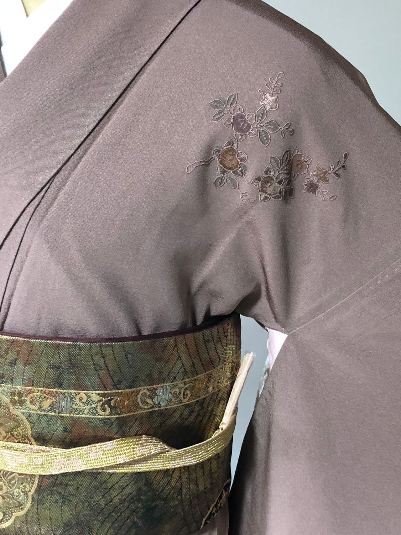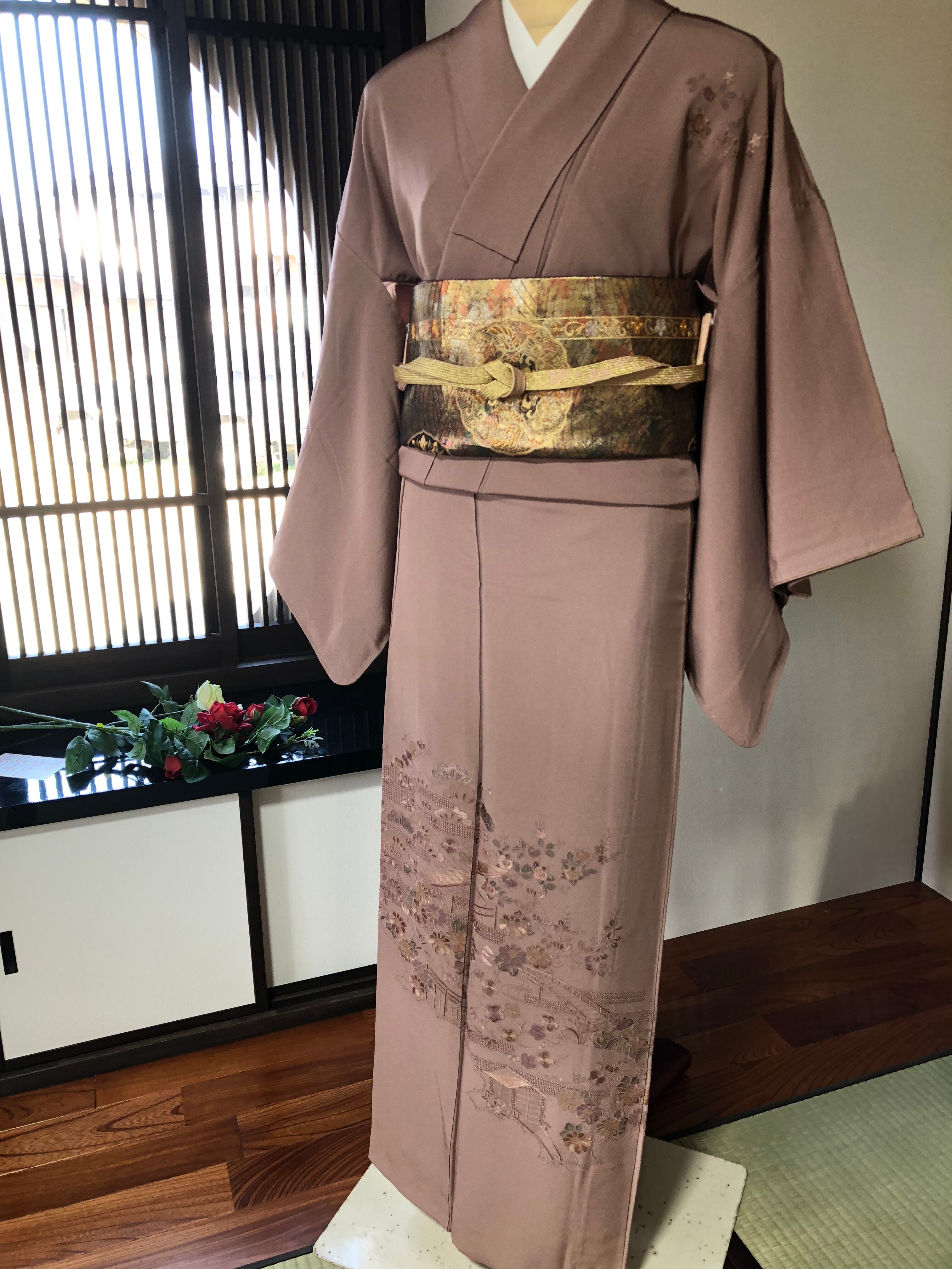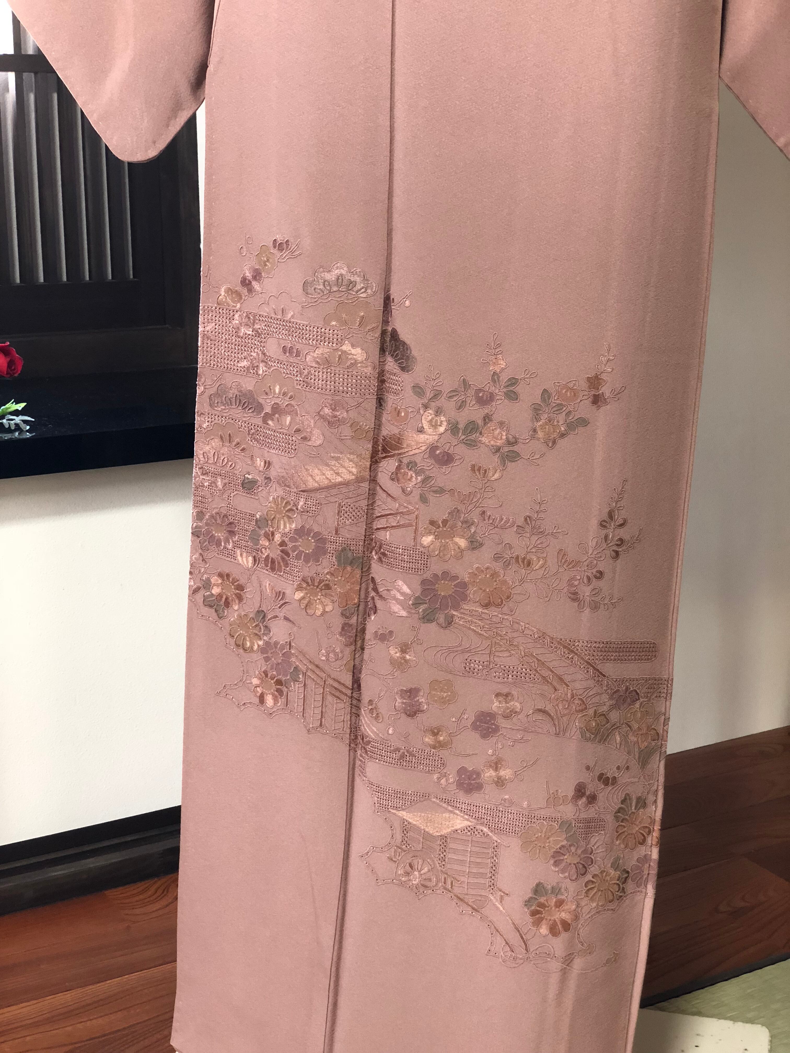 ブラウンがかったピンク地にスワトー刺繍が美しい訪問着。