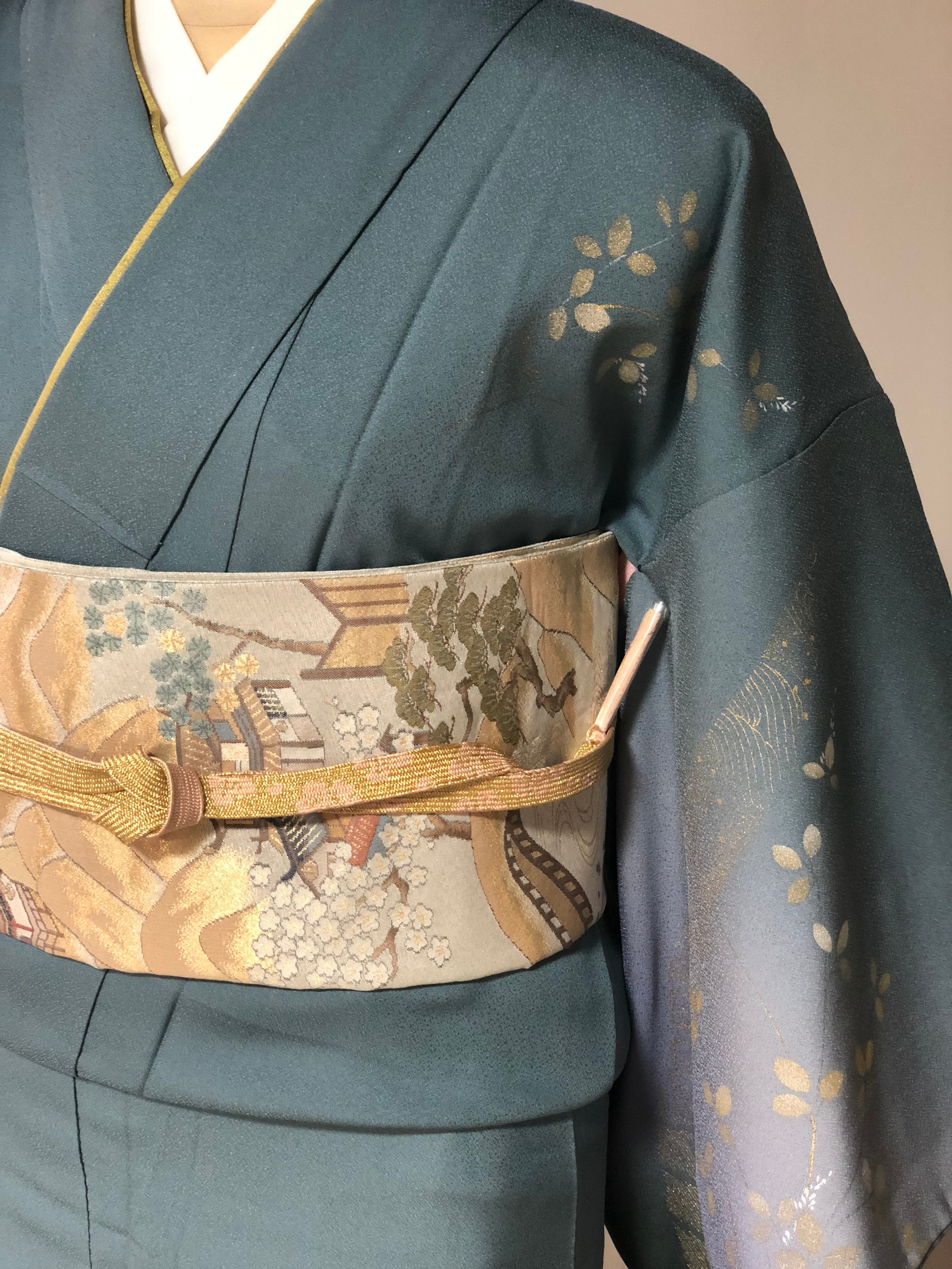 青緑から紫のグラデーション地に金色で描かれた萩や梅が美しい訪問着。