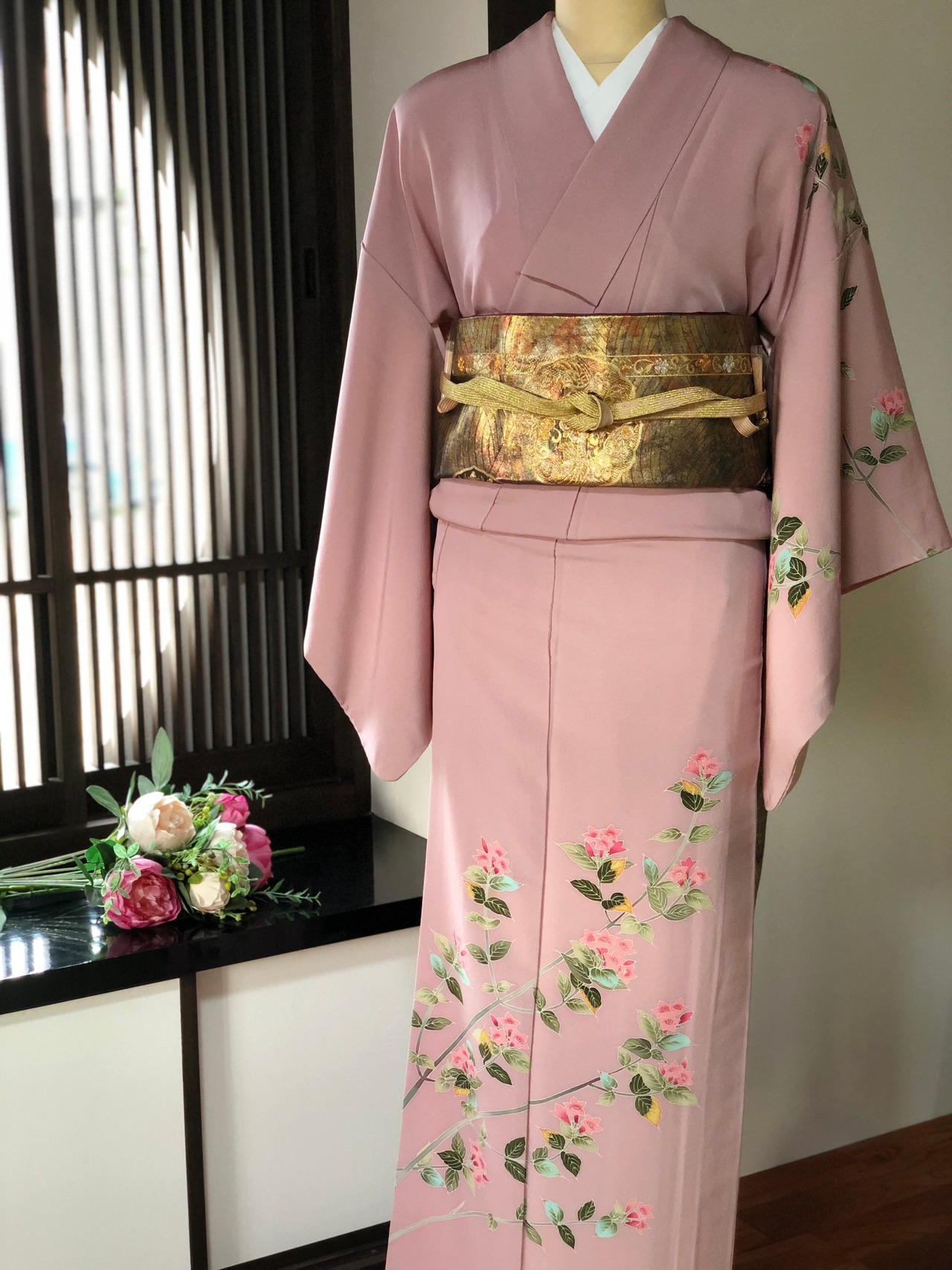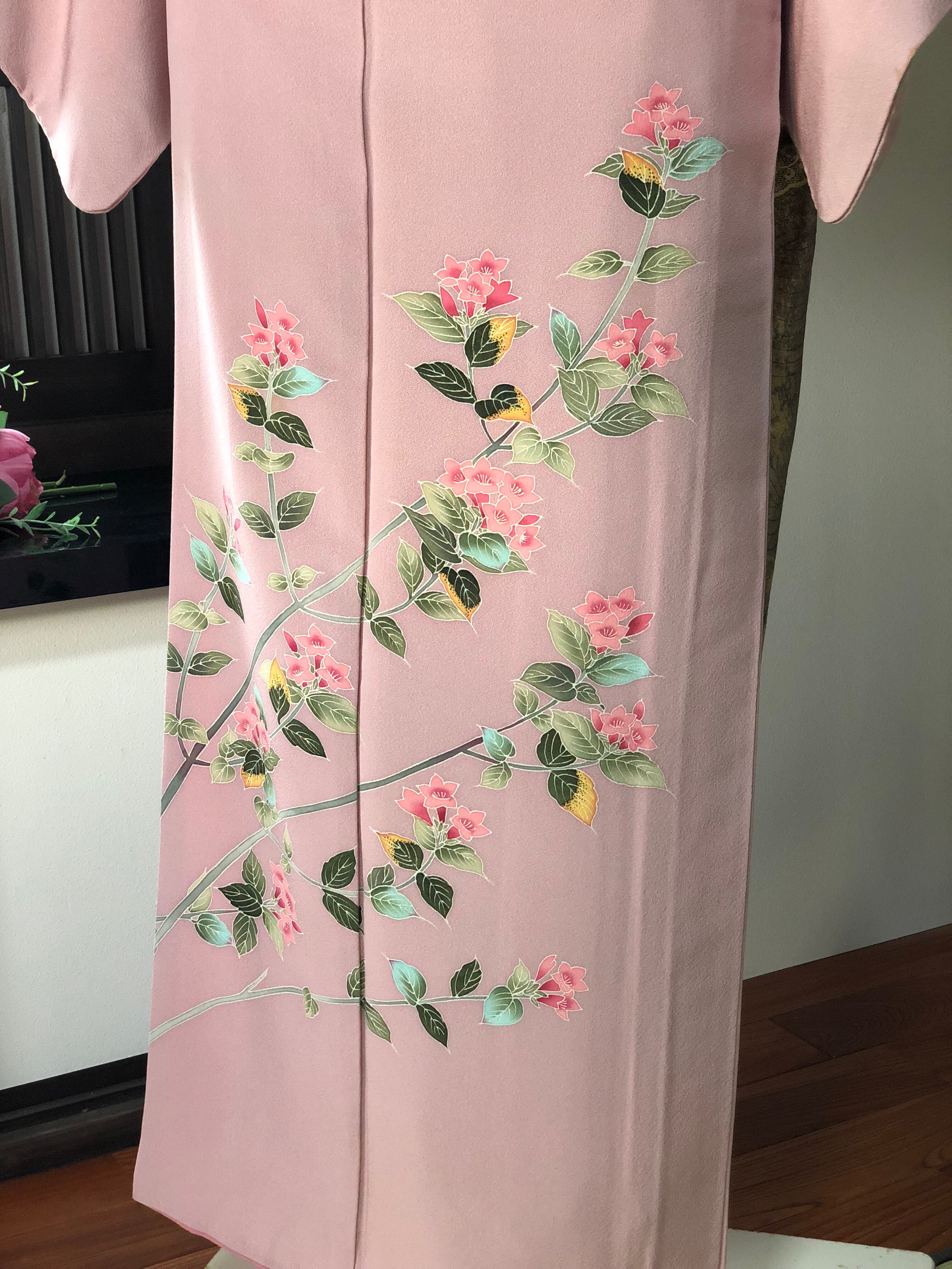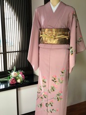 灰色がかったピンク地にすっきりした草花柄の付け下げ訪問着。