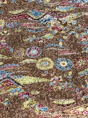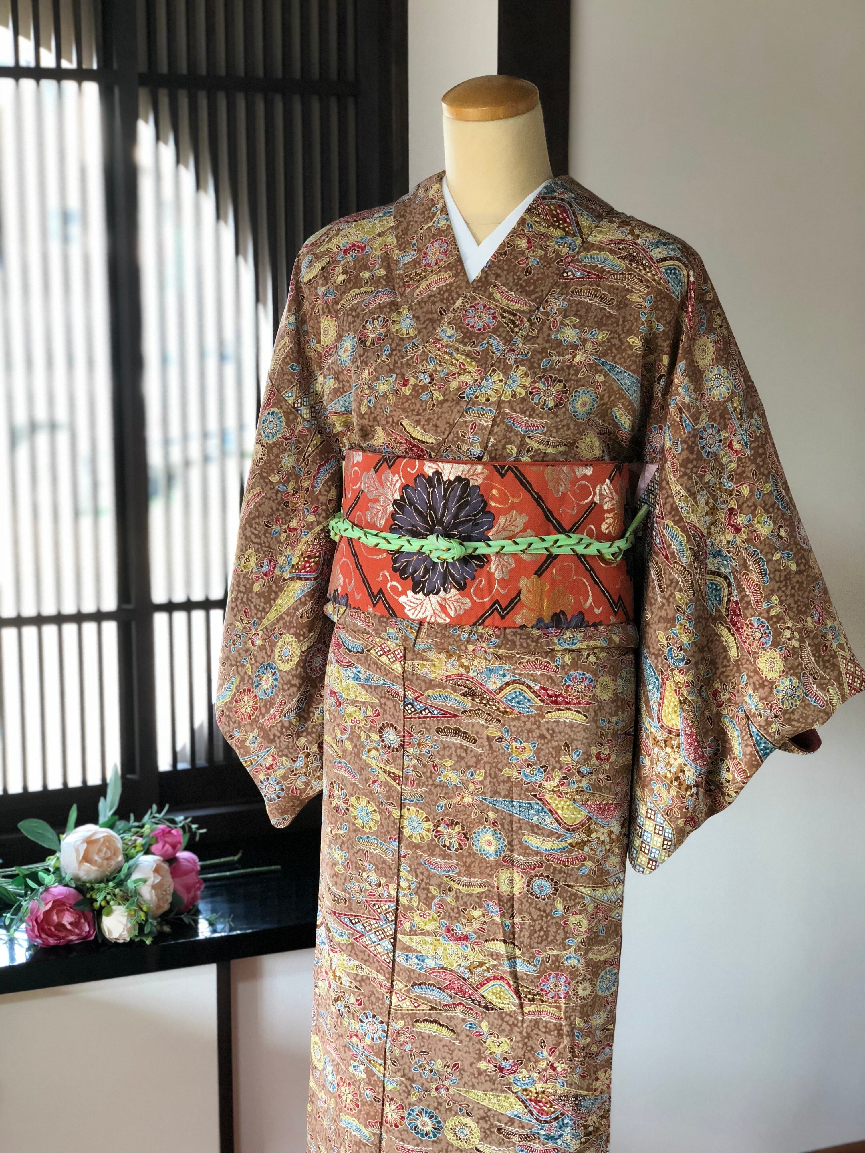 濃淡の茶色に染められた地模様に、カラフルな花たちが描かれた賑やかな小紋。 松、橘や可愛らしい小花、そして曼荼羅のような大きめのお花も見てるだけで楽しくなります♪