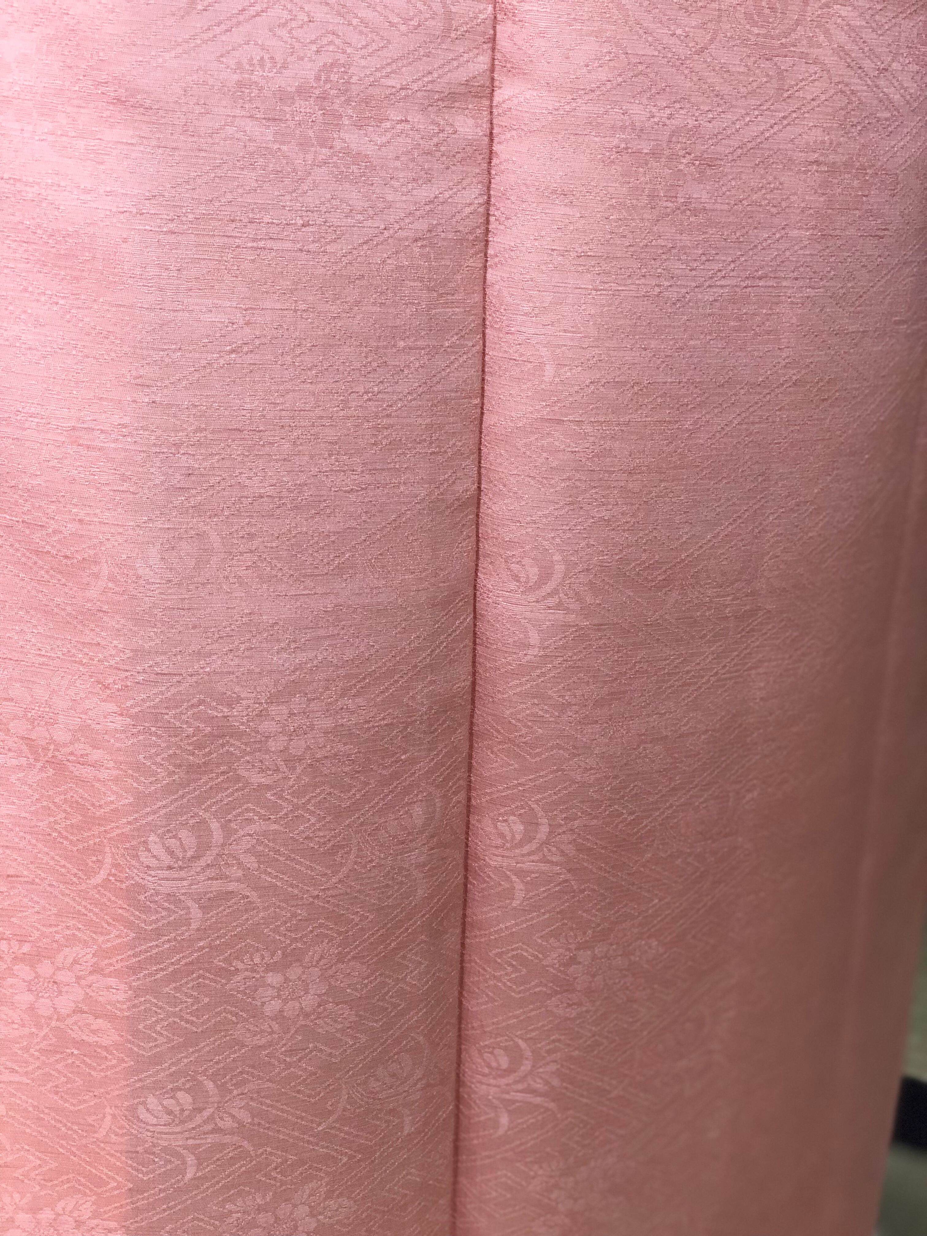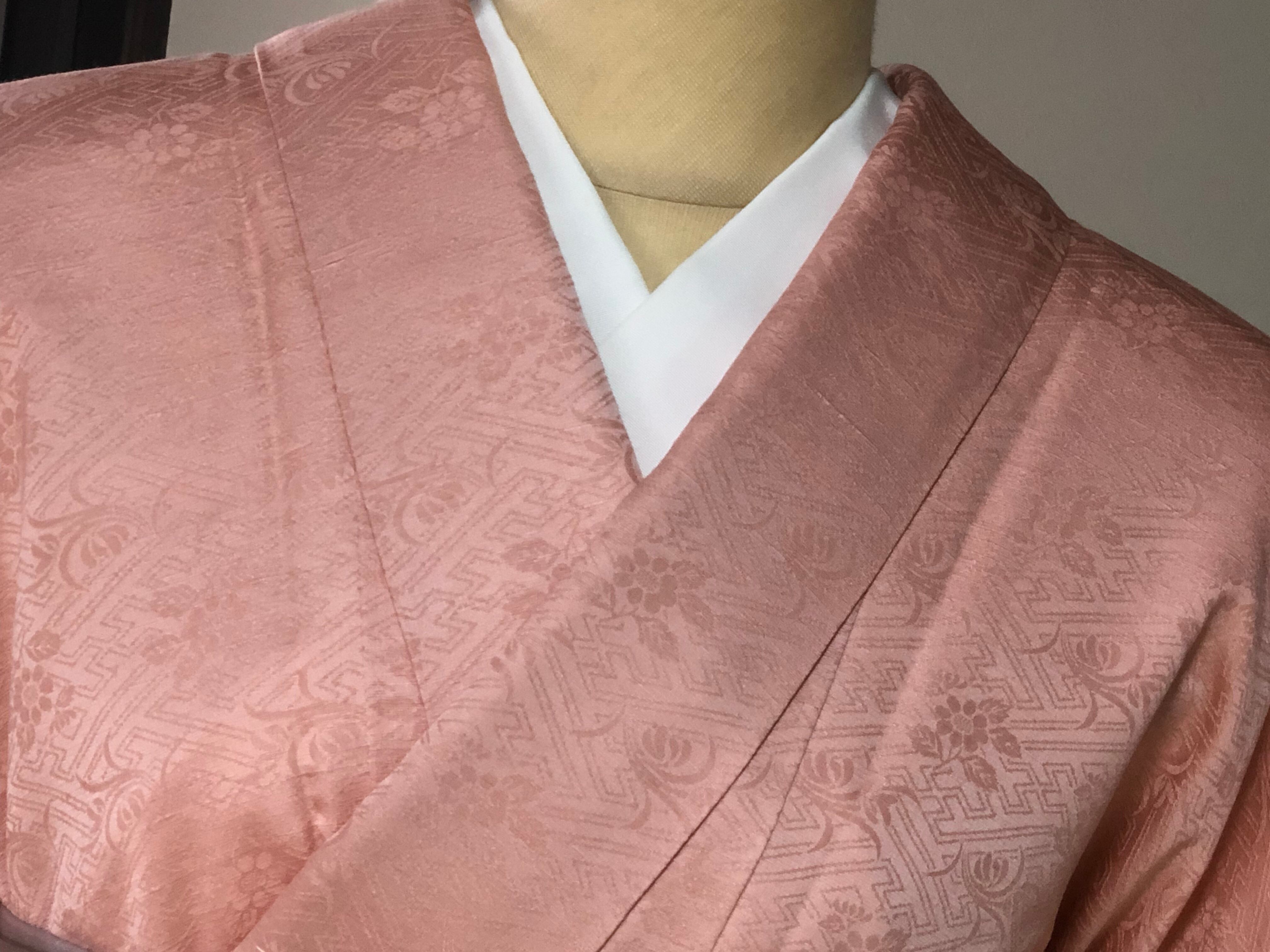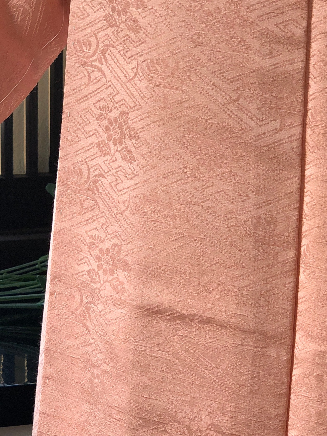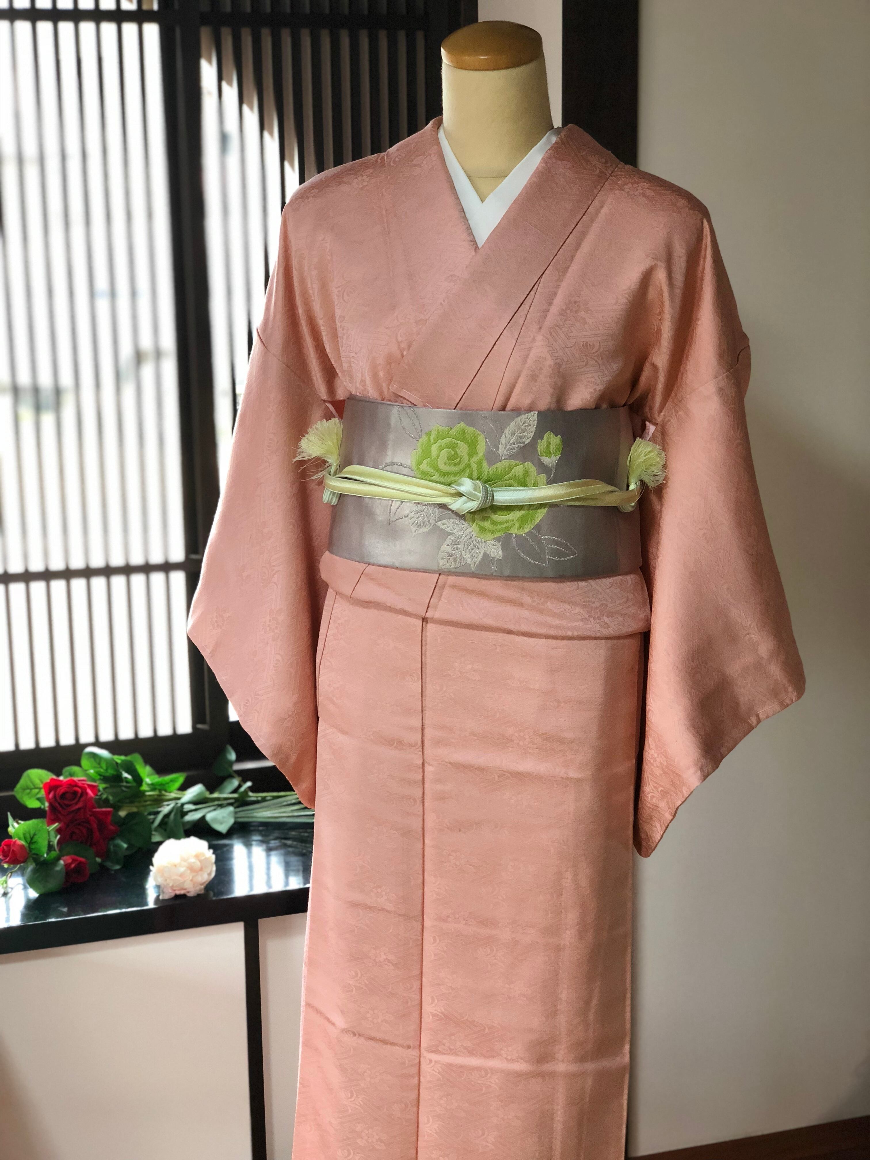 優しい色合いのピンク色無地です。 軽くて着やすそうです♪ 帯と帯揚げも優しい雰囲気でまとめました。 しつけ糸付き 裄 65㎝