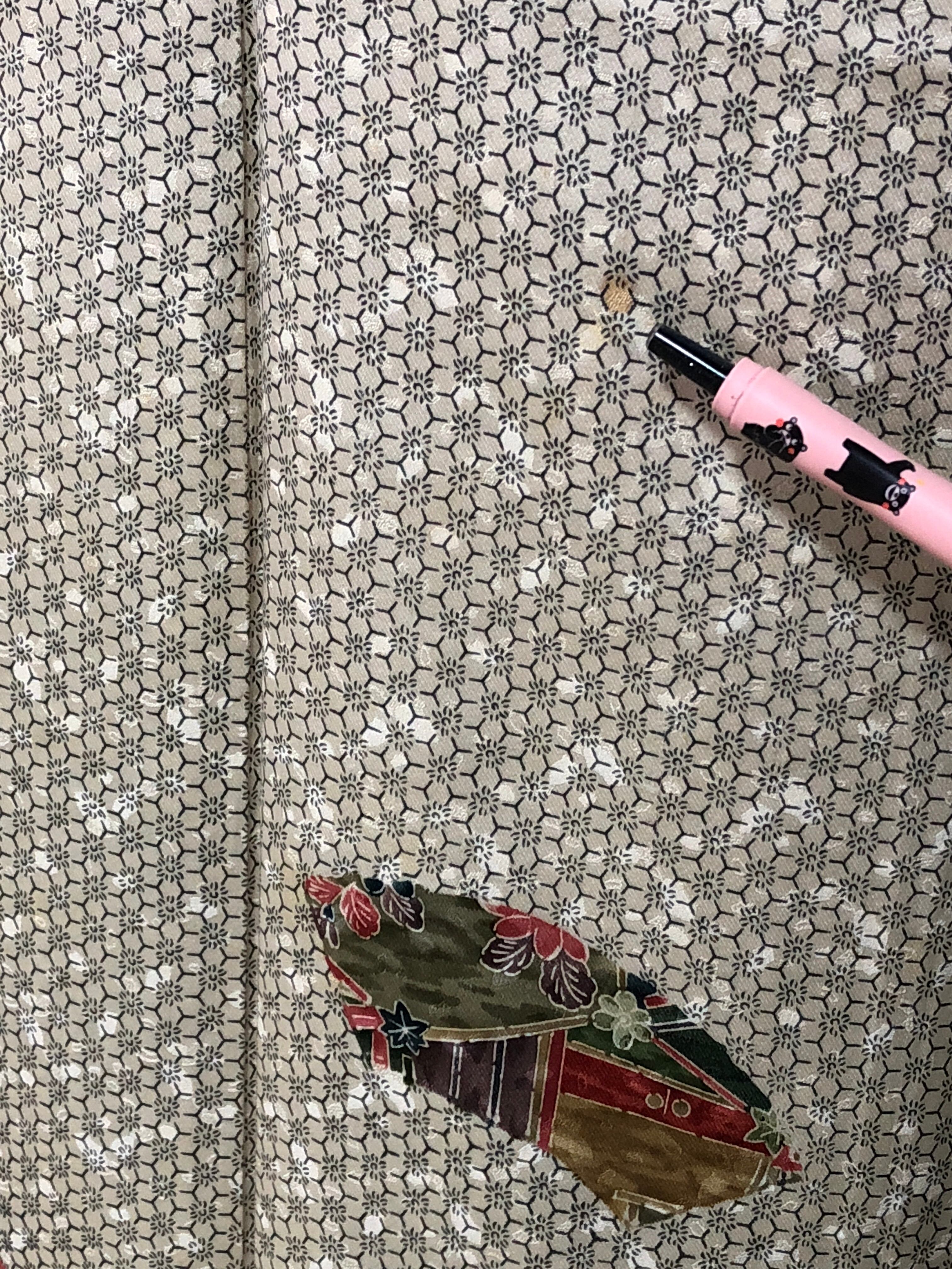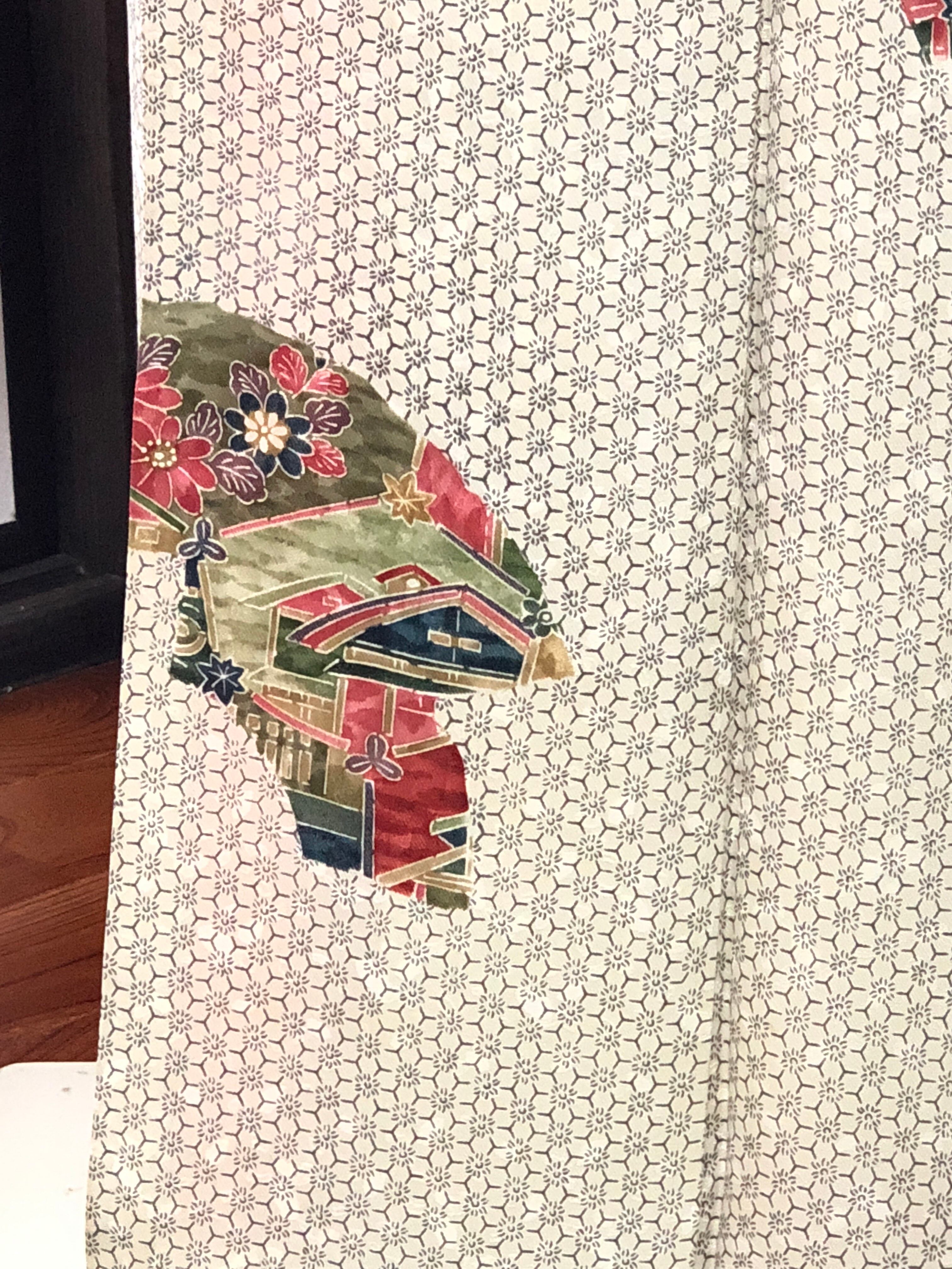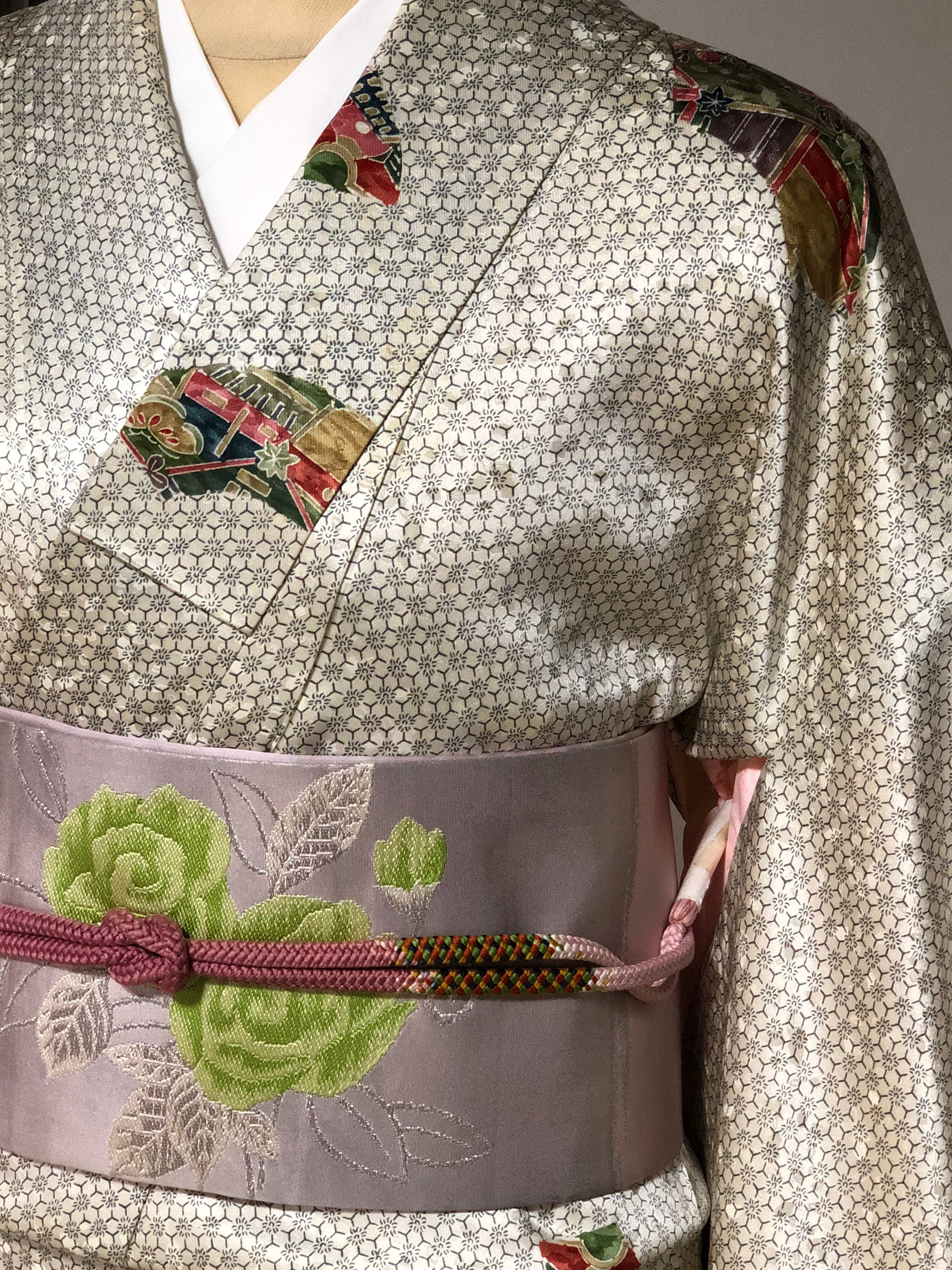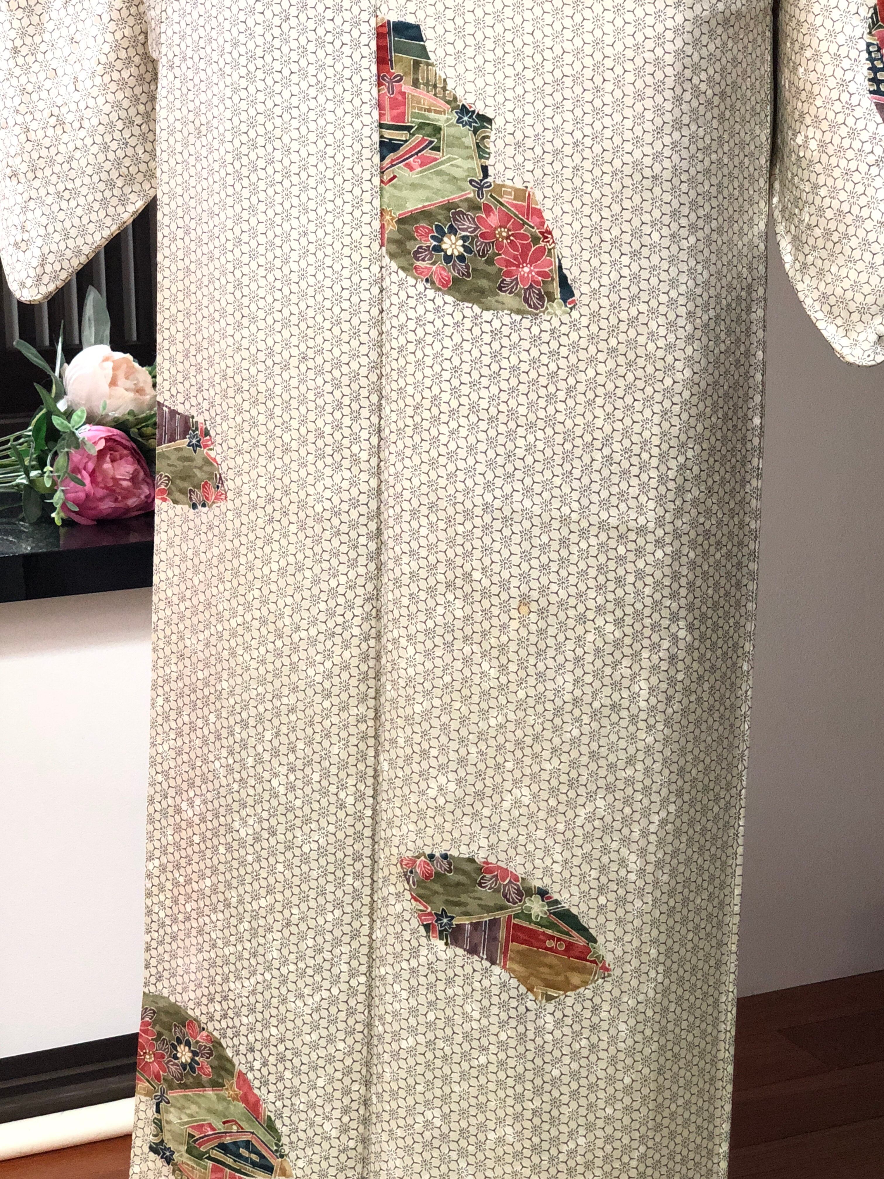 灰白色の綸子地。扇形の中にお花や建物などが飛び柄で施された小紋です。近づいてよく見ると、桜のような模様が描かれています♪