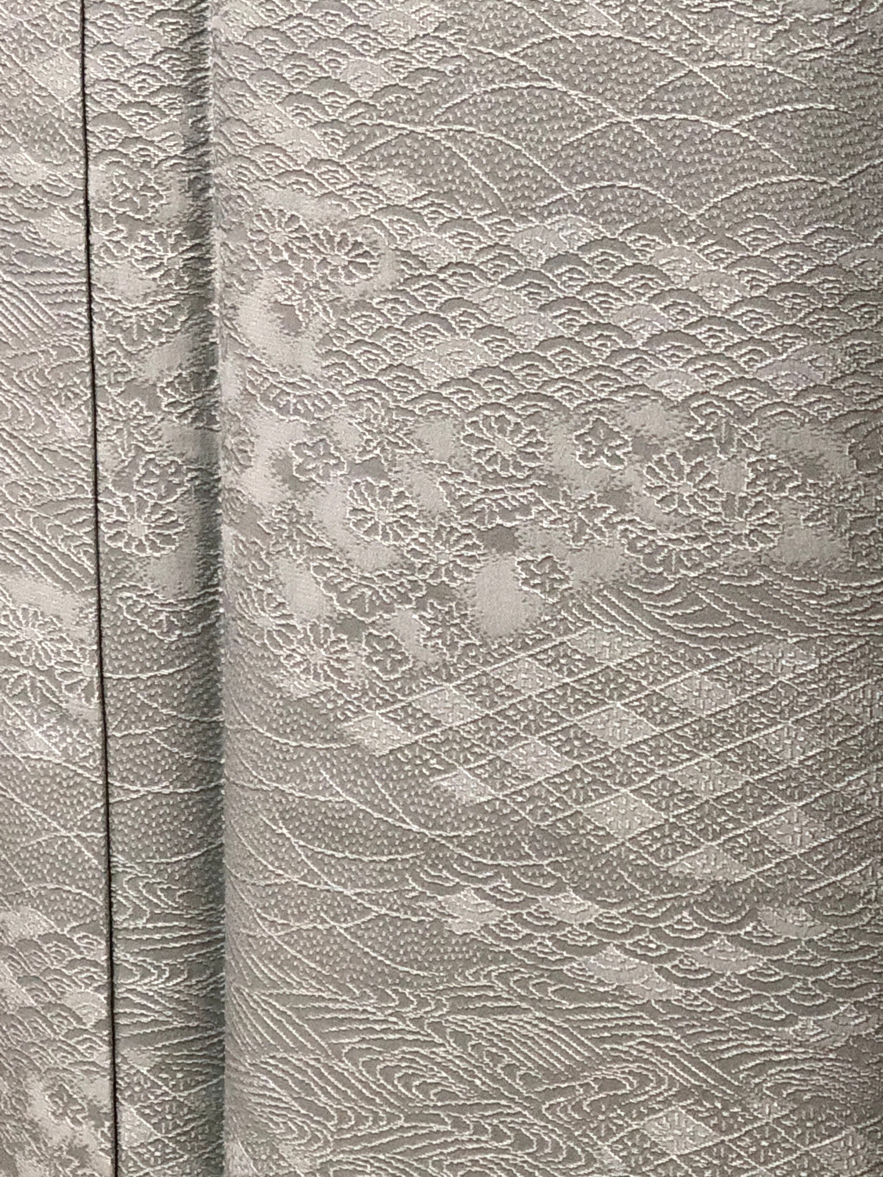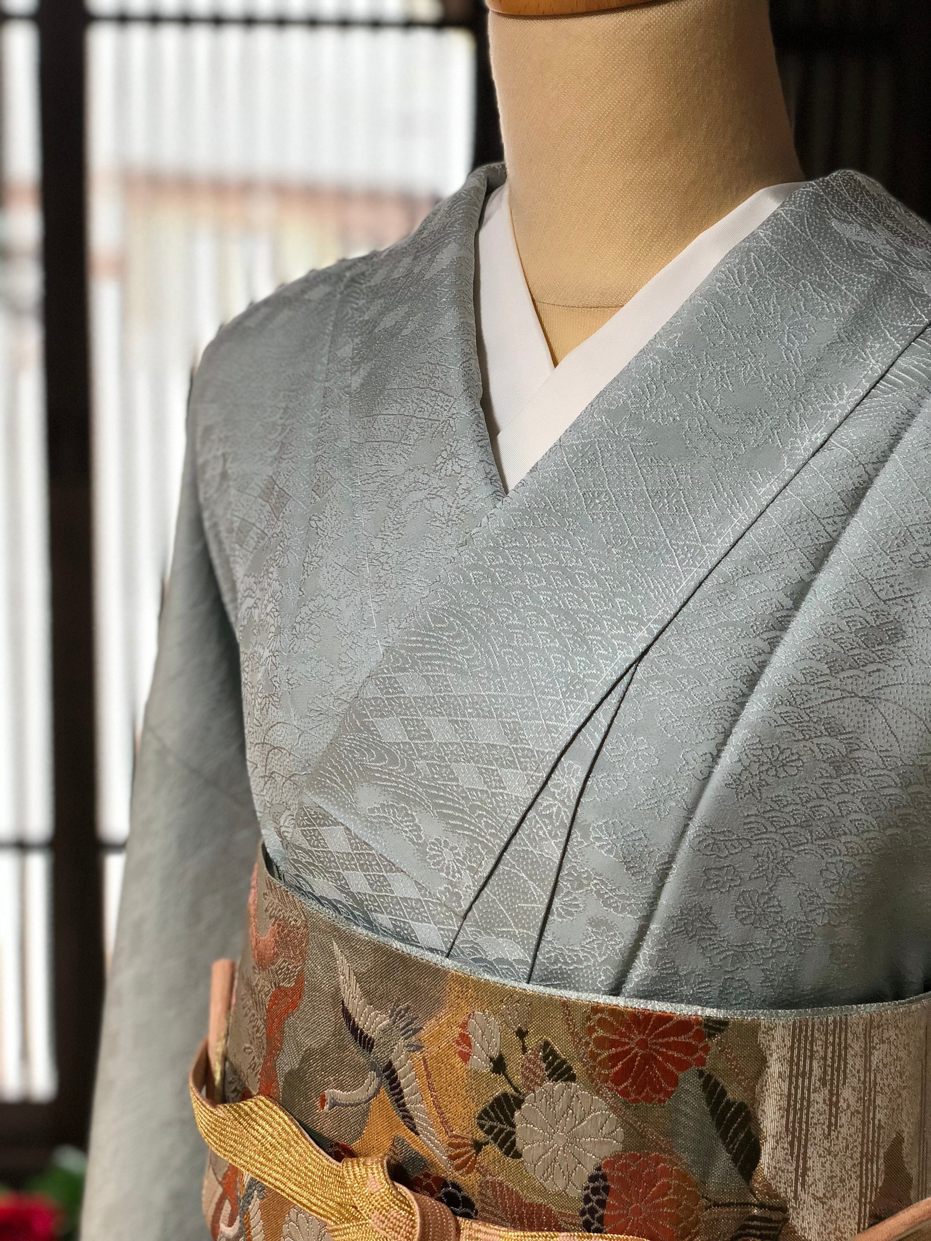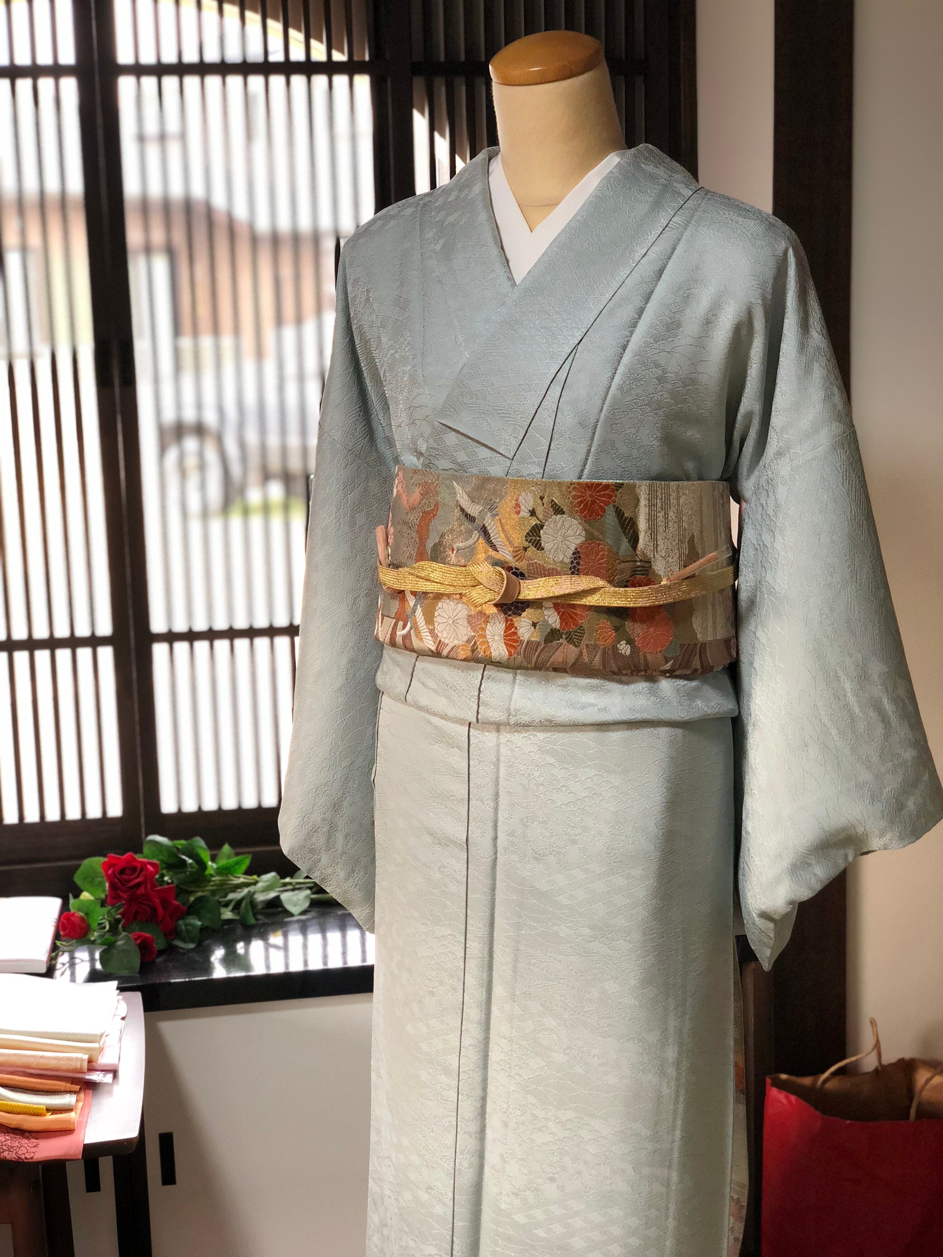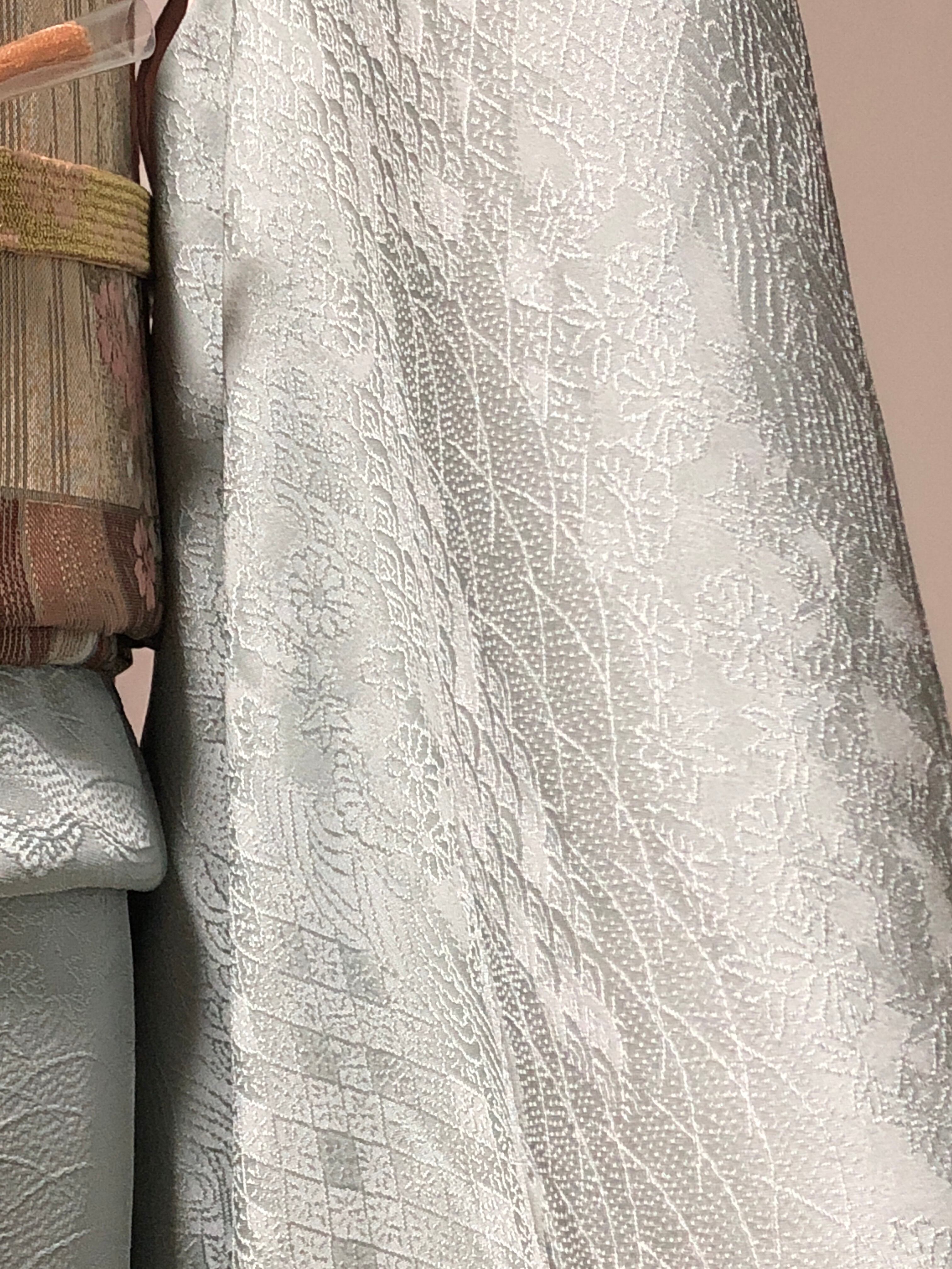 灰色がかった水色の色無地です。織り柄がとても鮮明に出てますので小紋のような雰囲気を楽しめます。