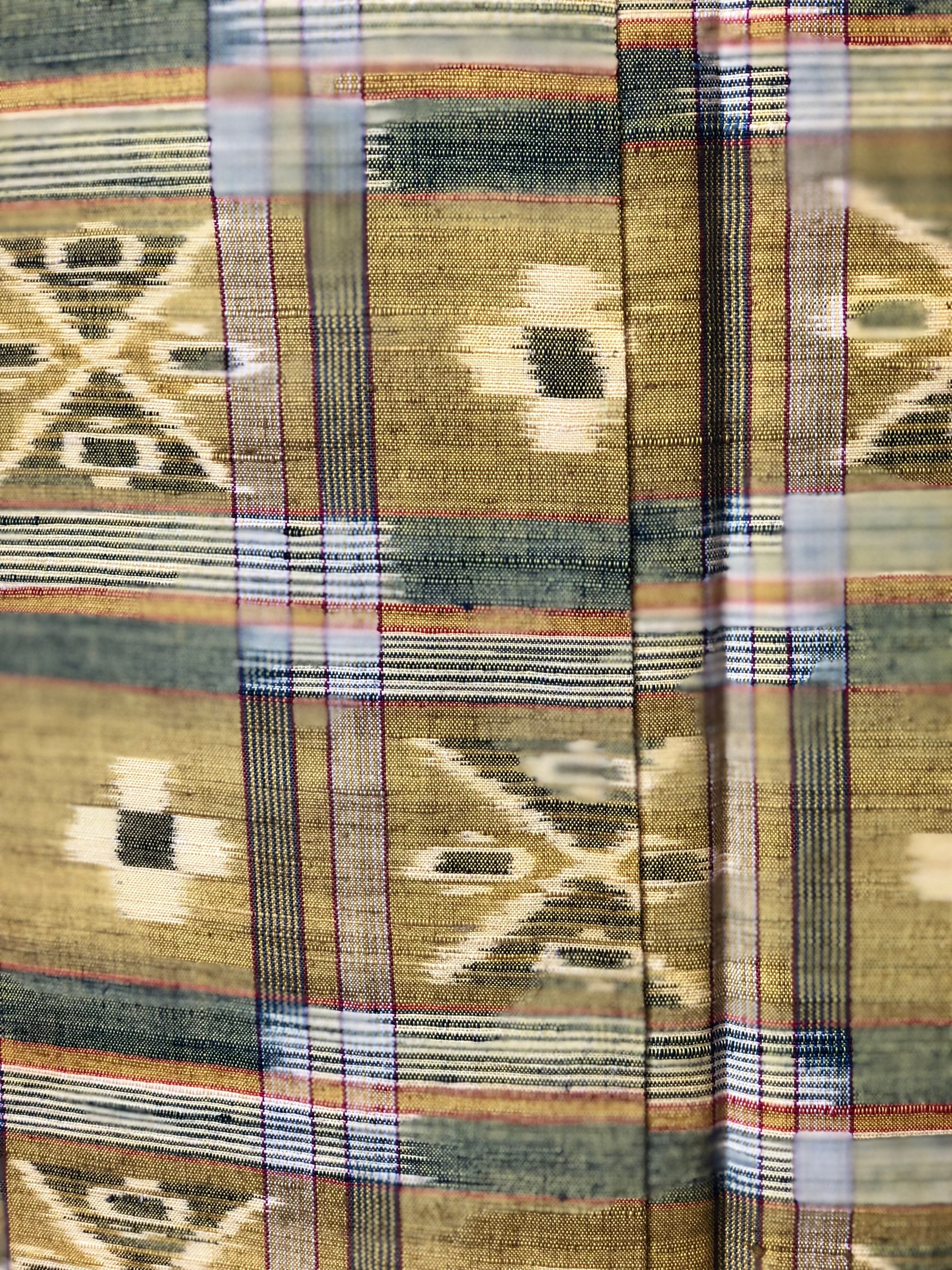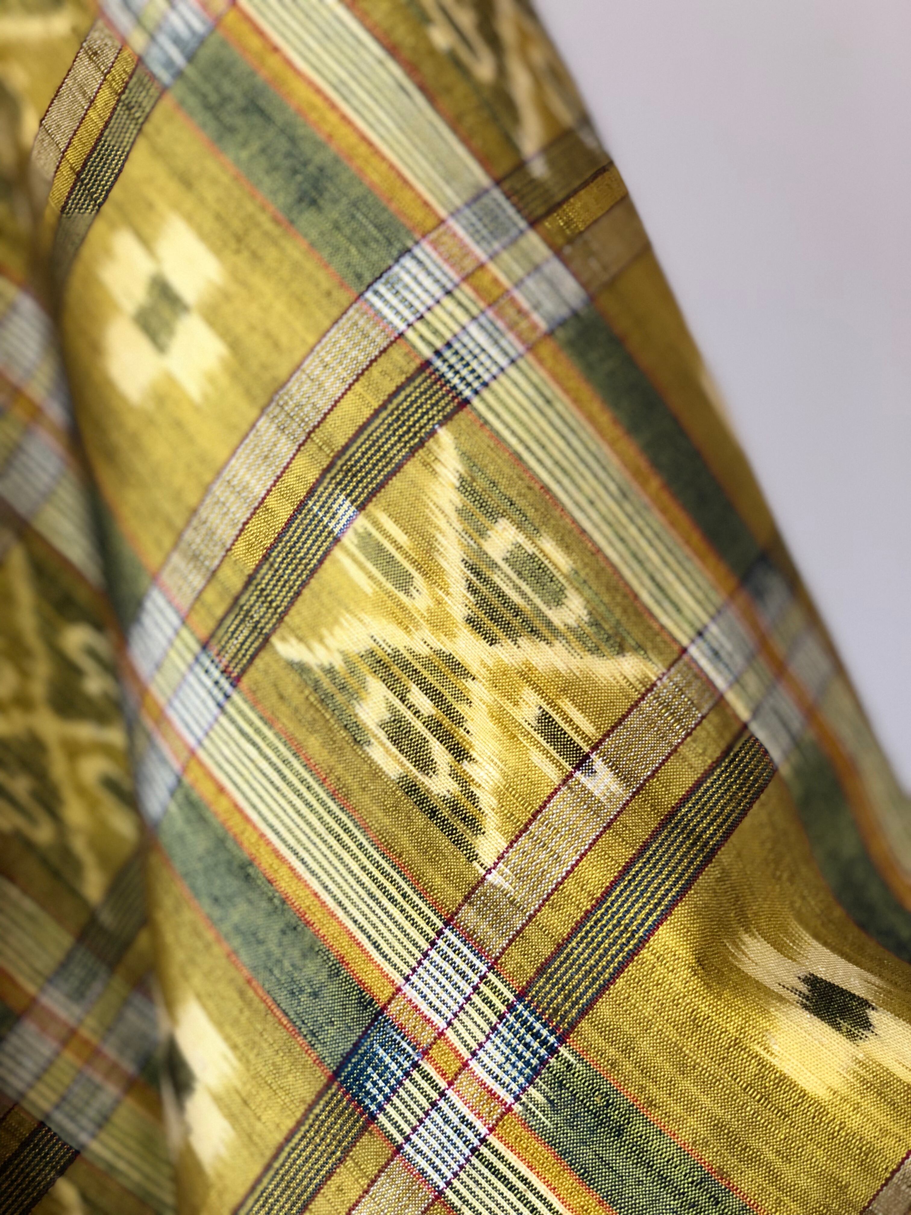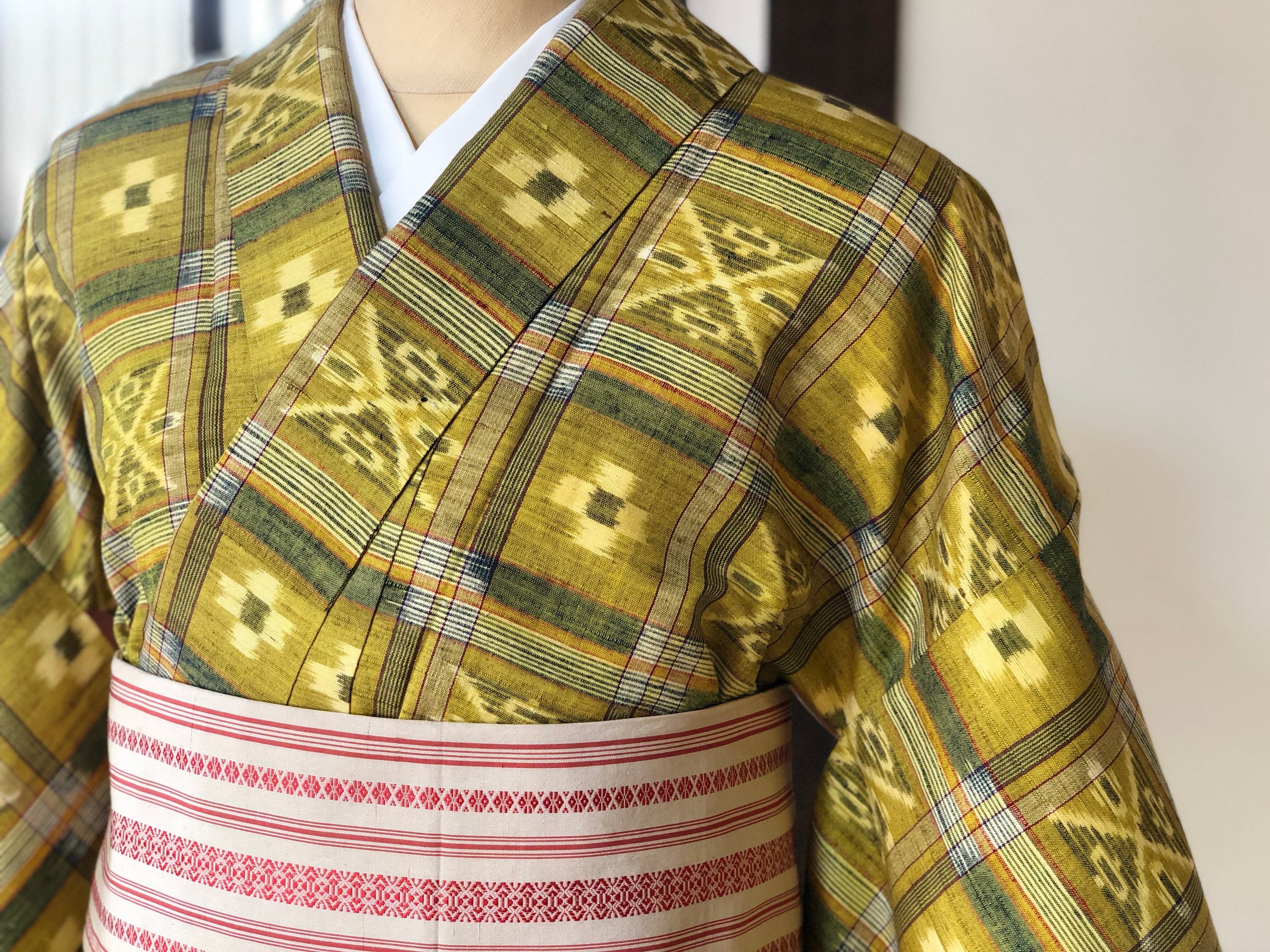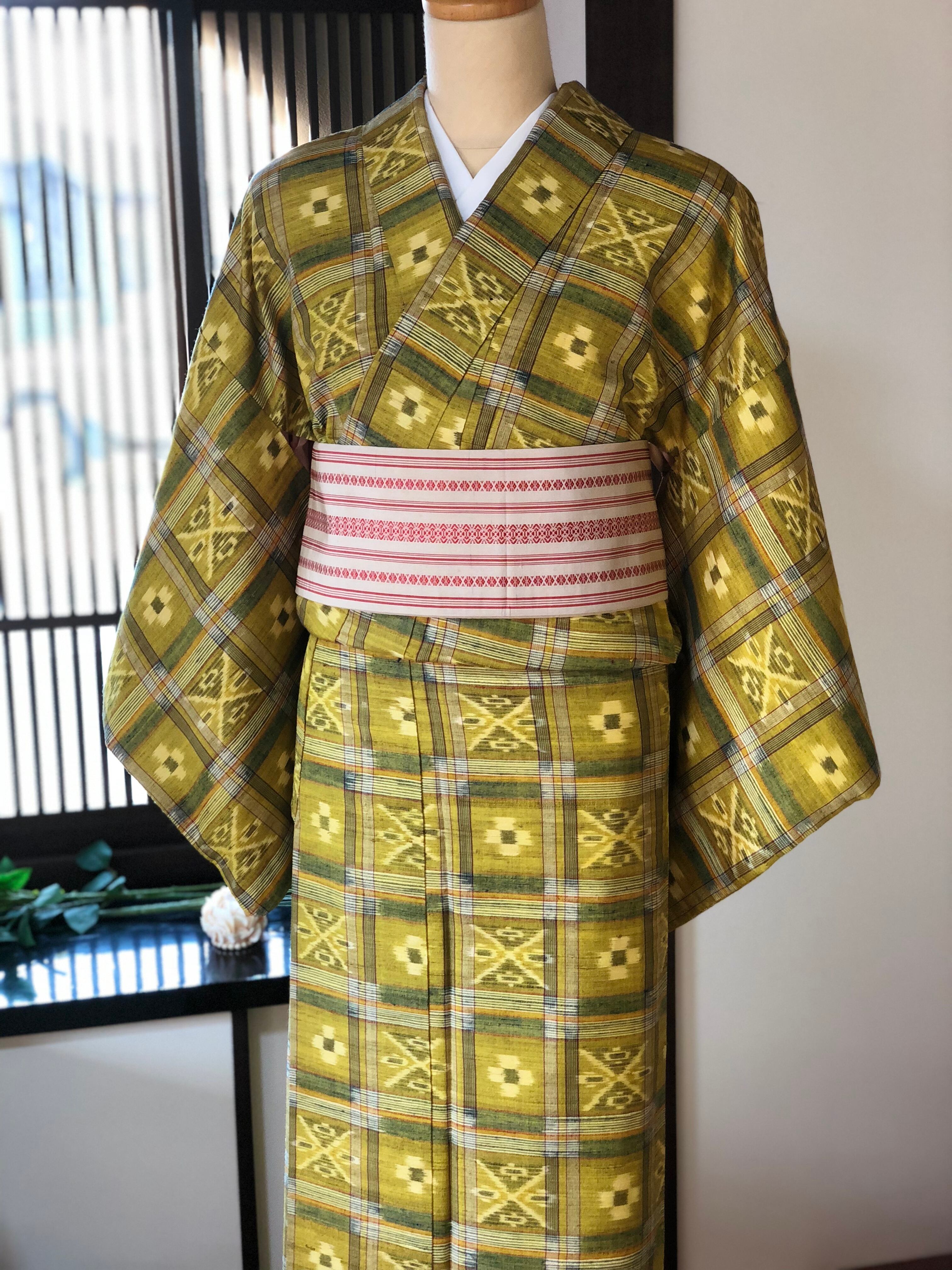黄緑格子柄紬