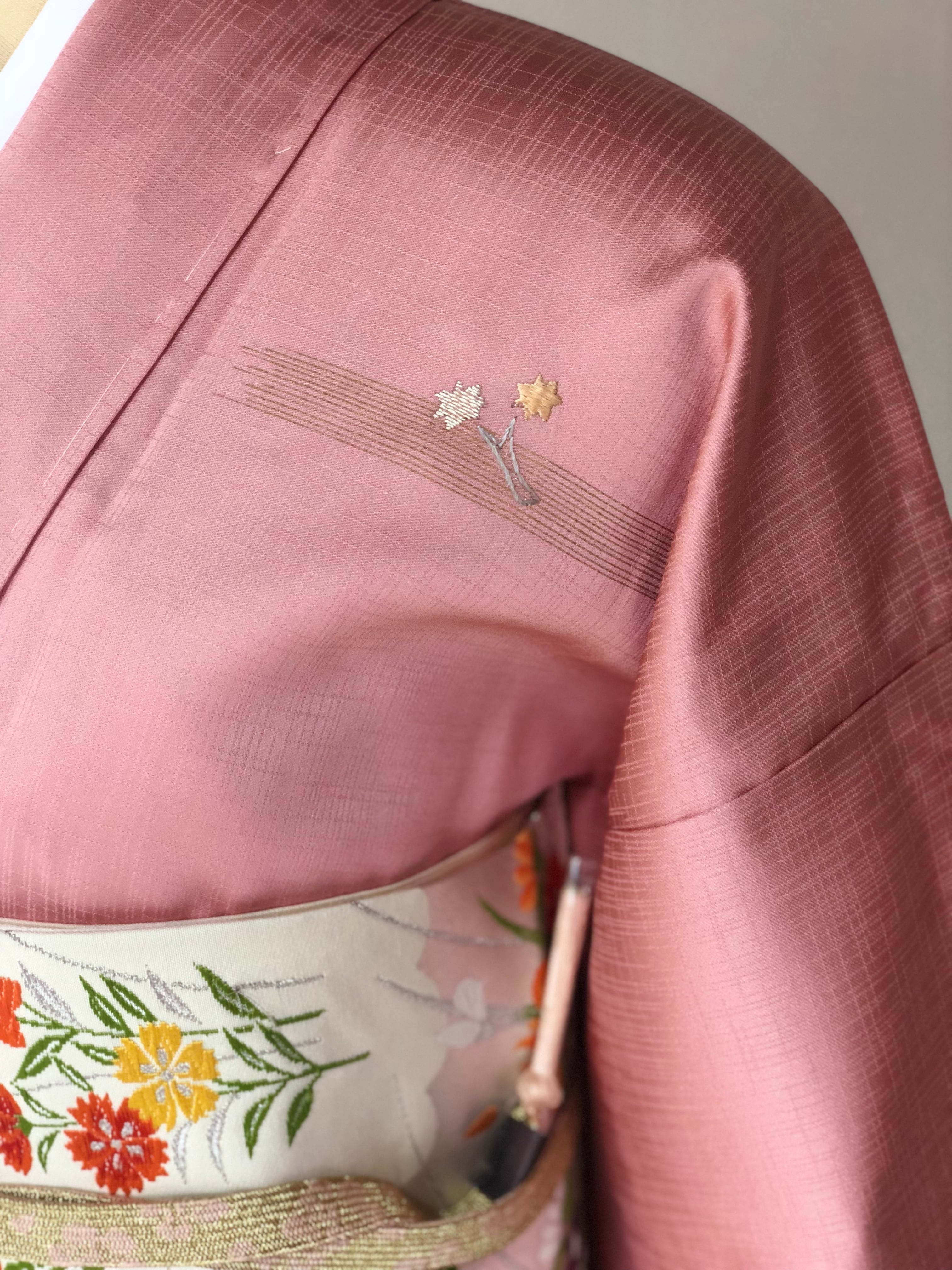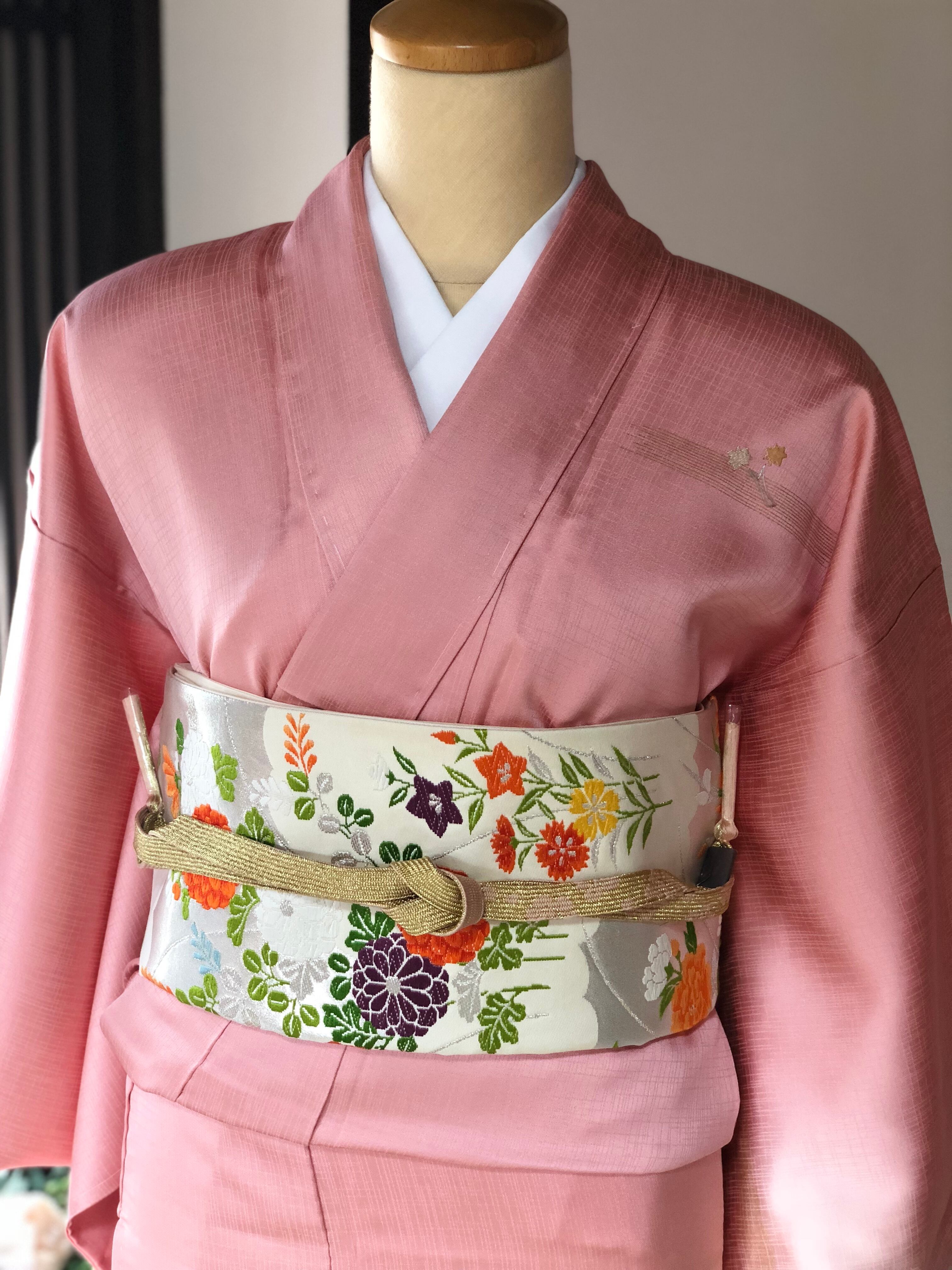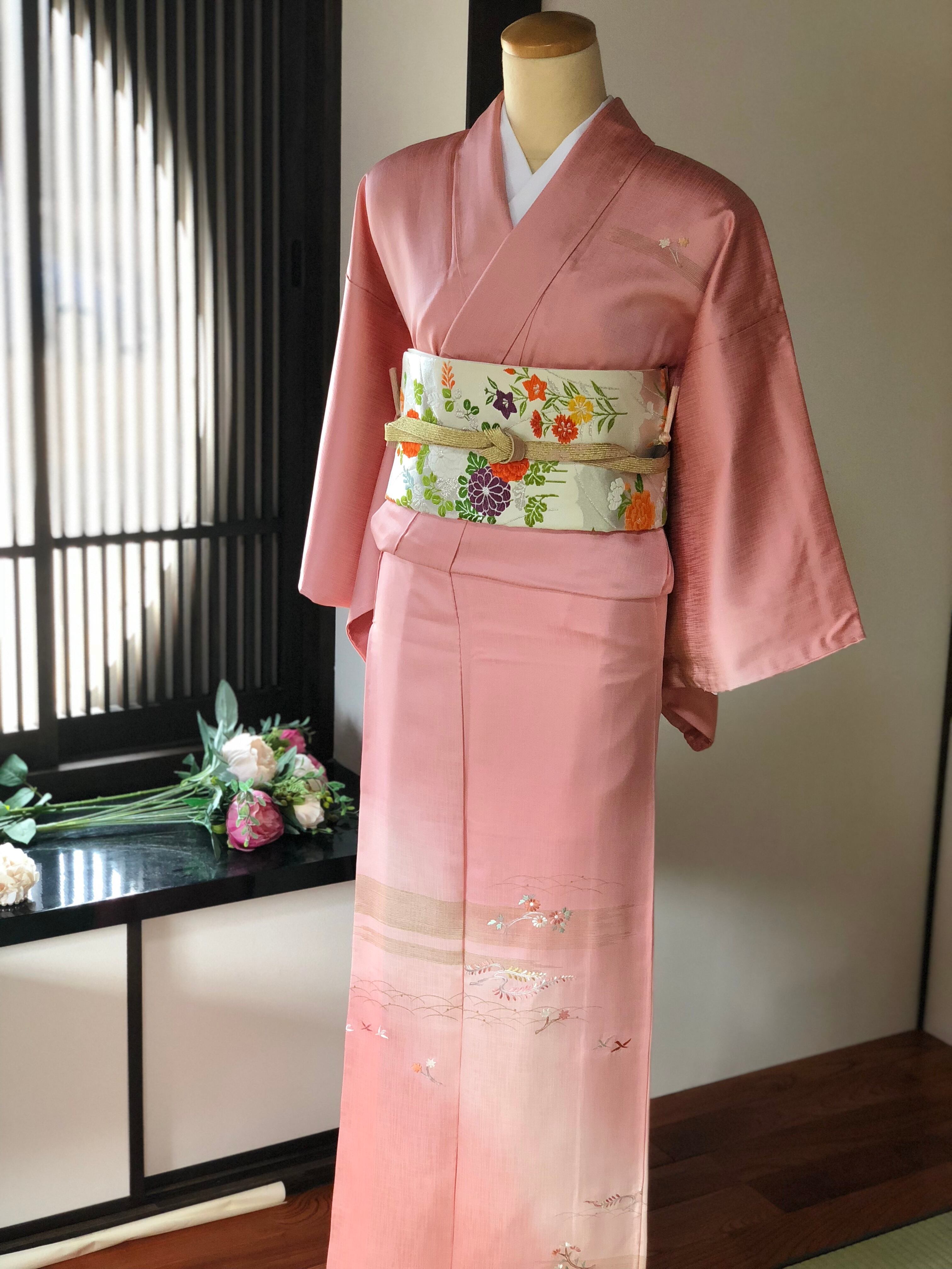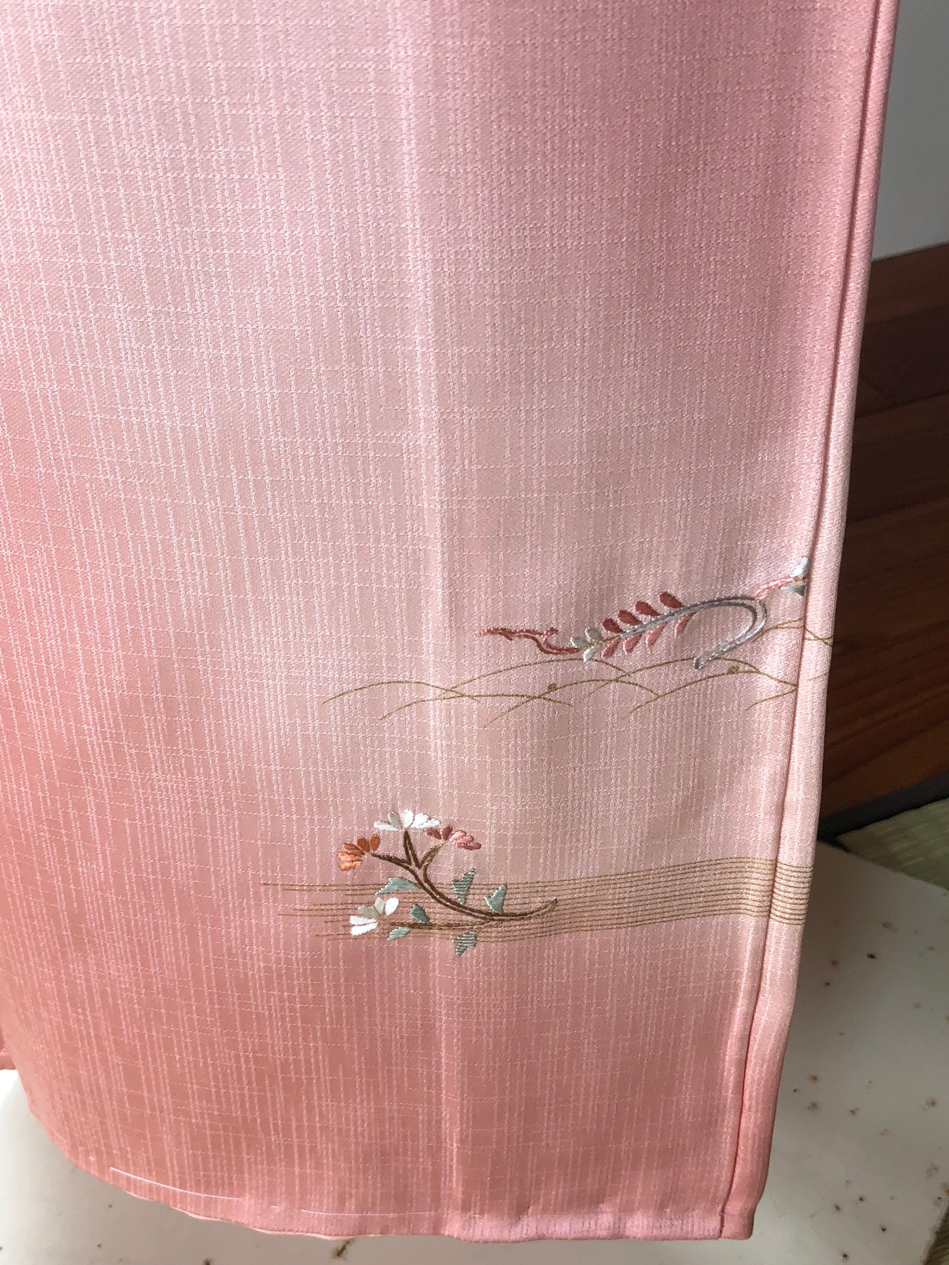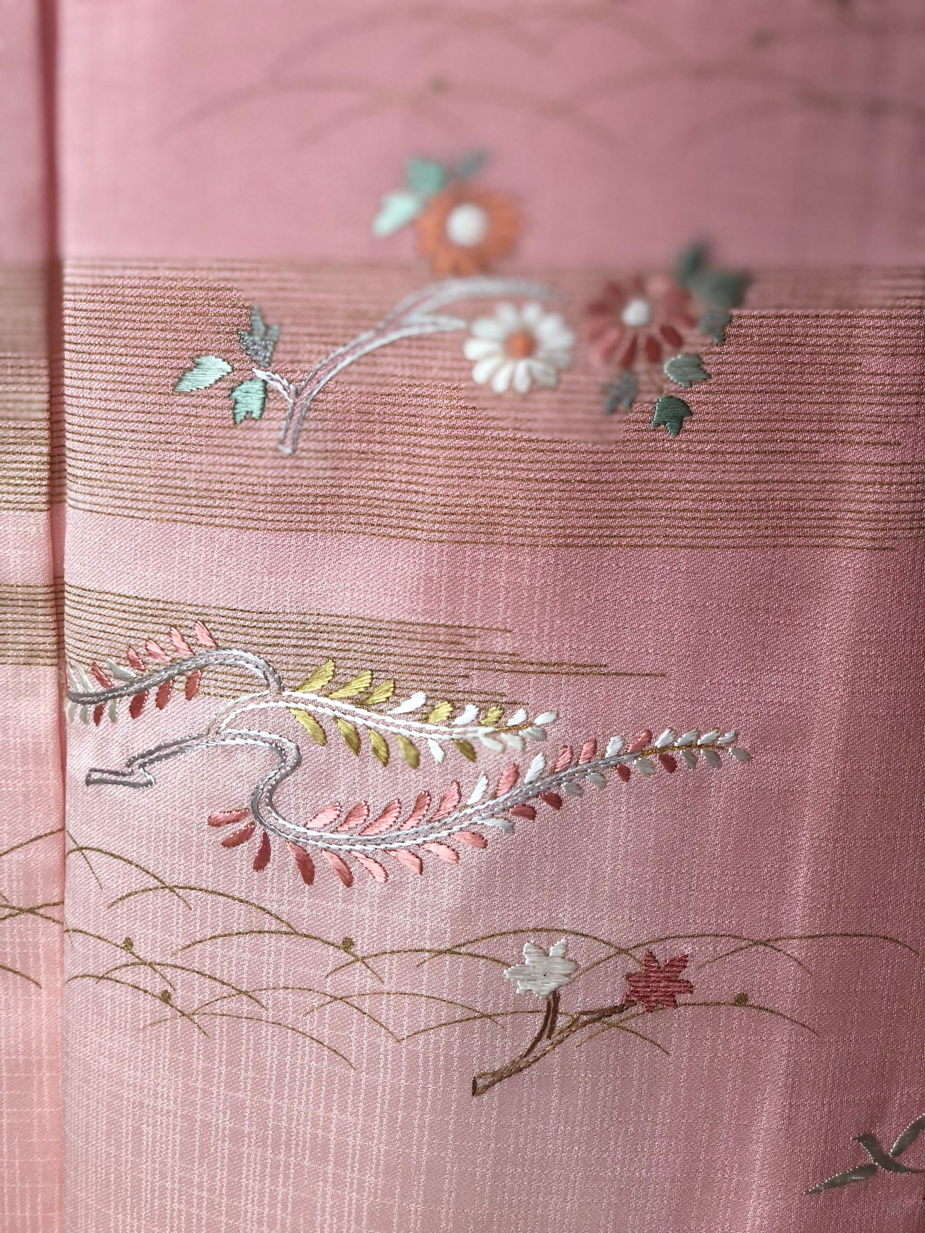 上品な光沢のあるピンク地に季節の花々や優雅に飛ぶ鳥の刺繍が施されています。