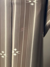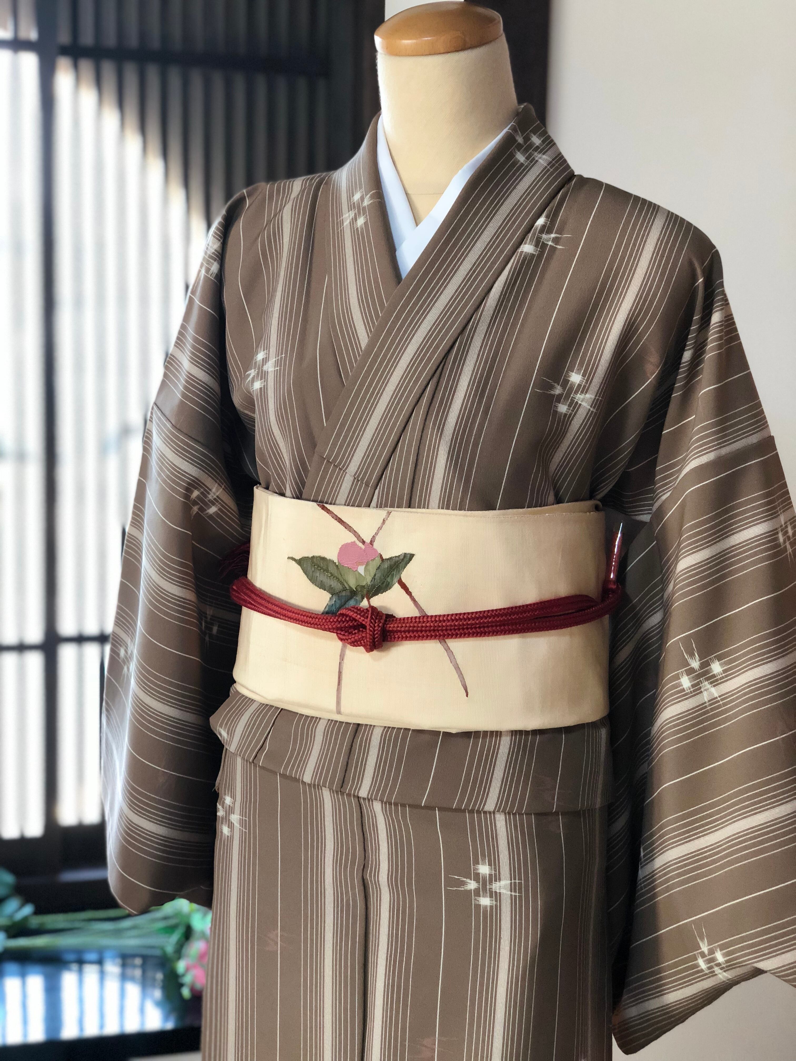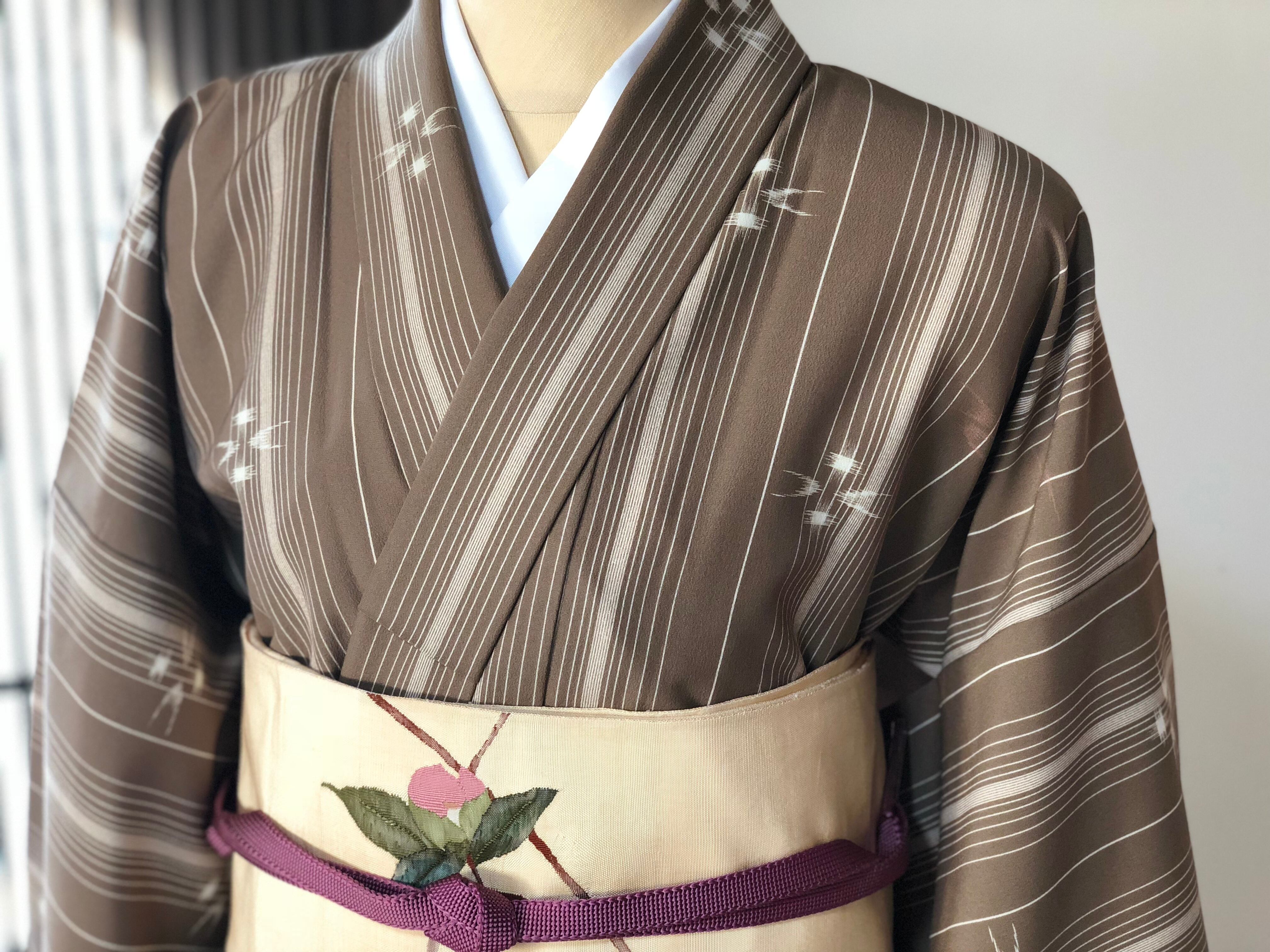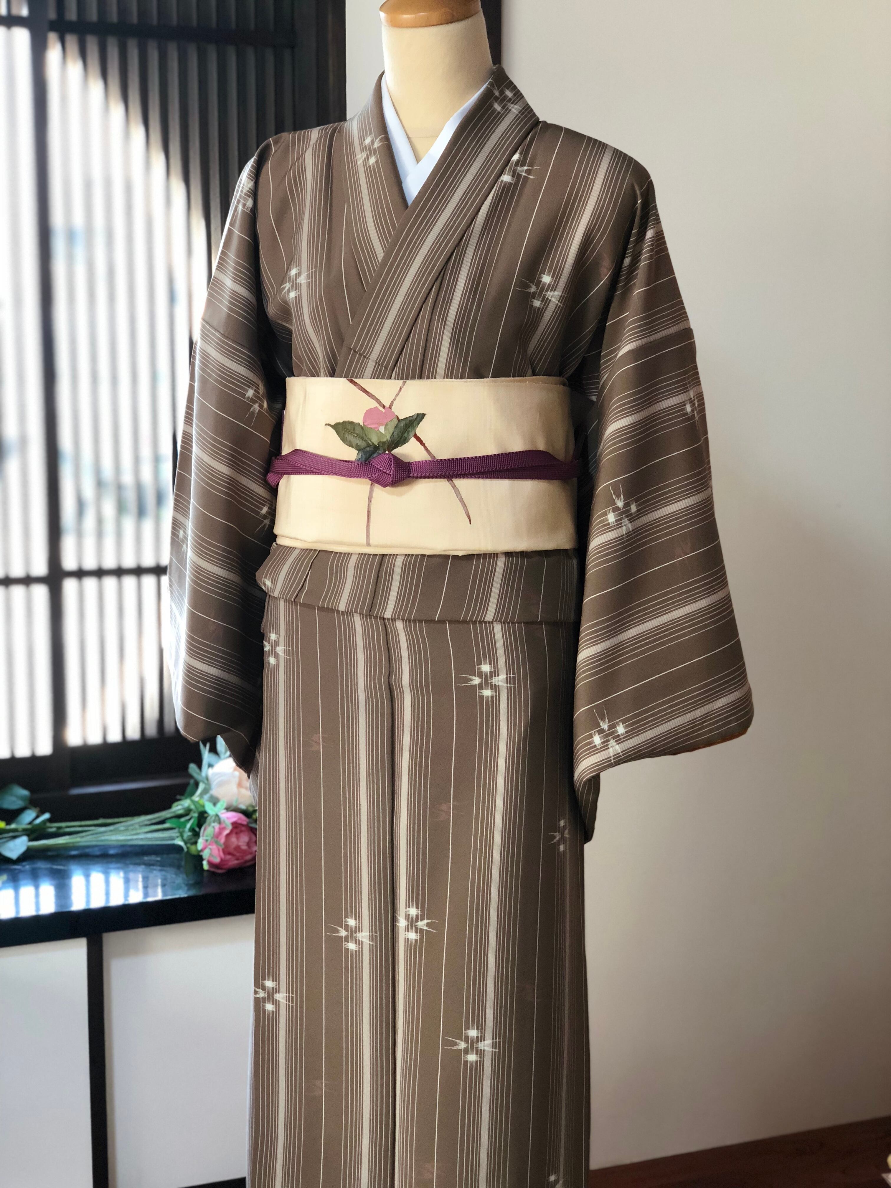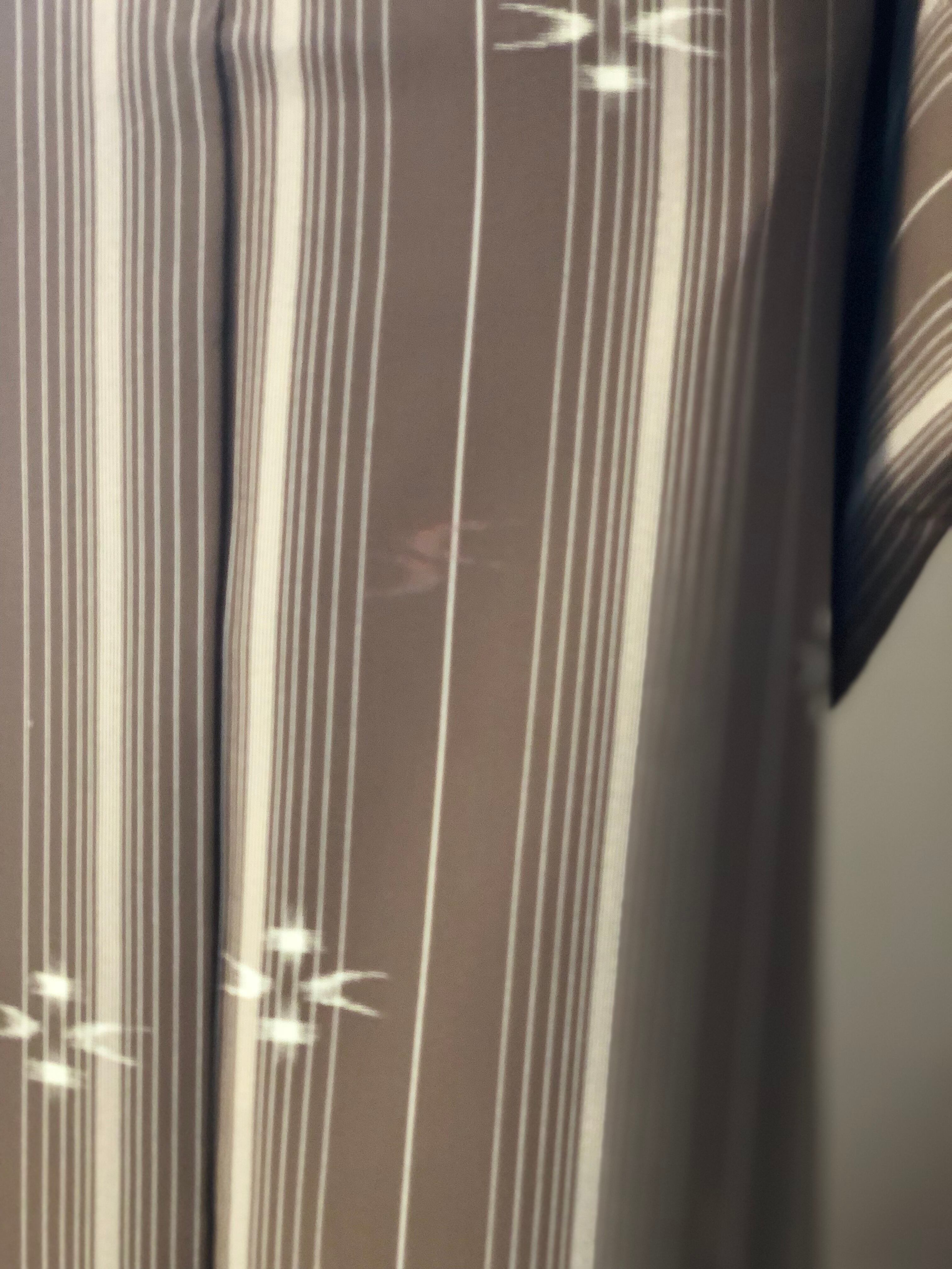 茶色にランダムな縦縞が入った紬風洗える小紋。 サイズ大きめで、安心の裄丈です♪ 裄 71㎝ 身丈 170㎝