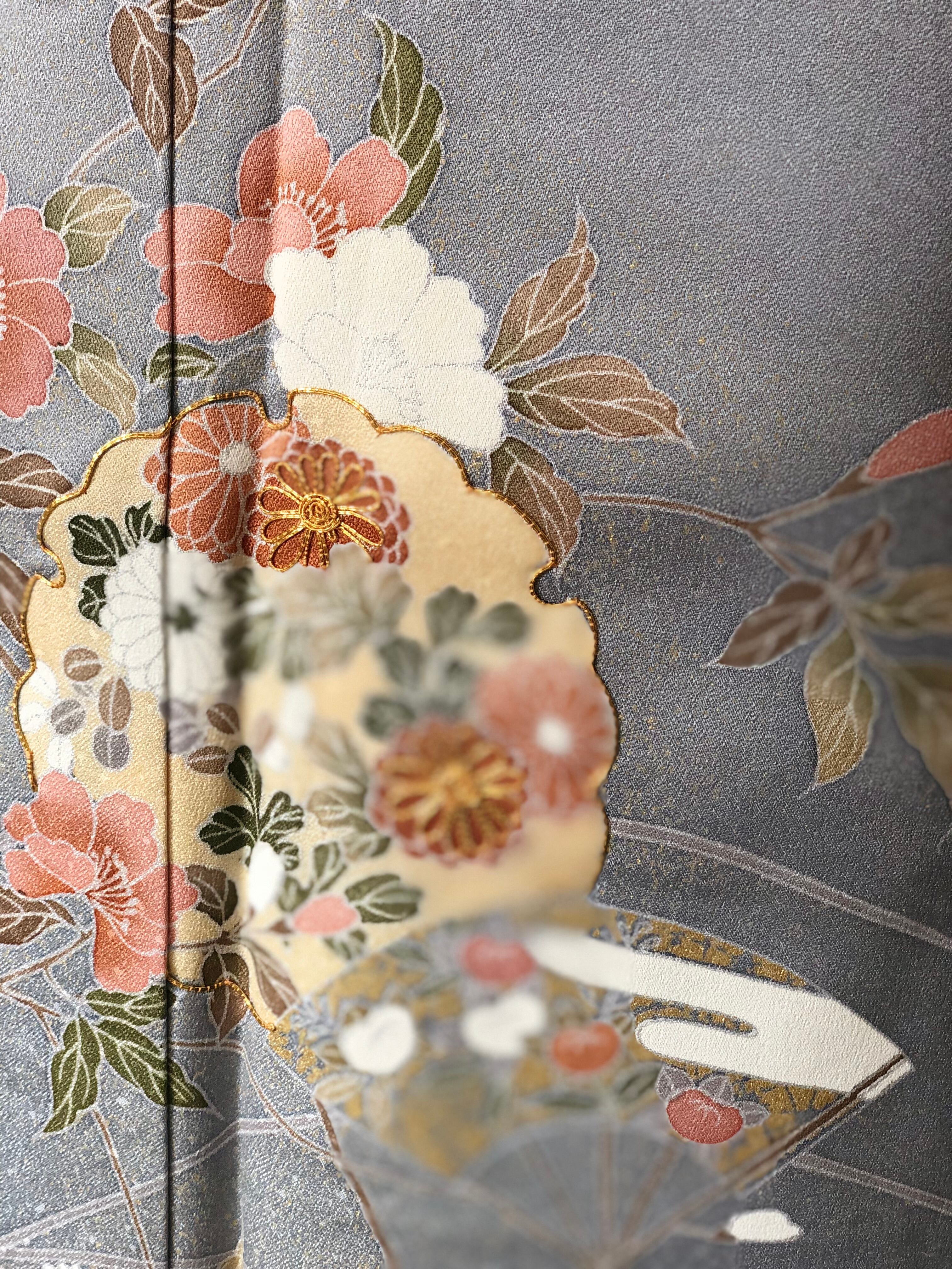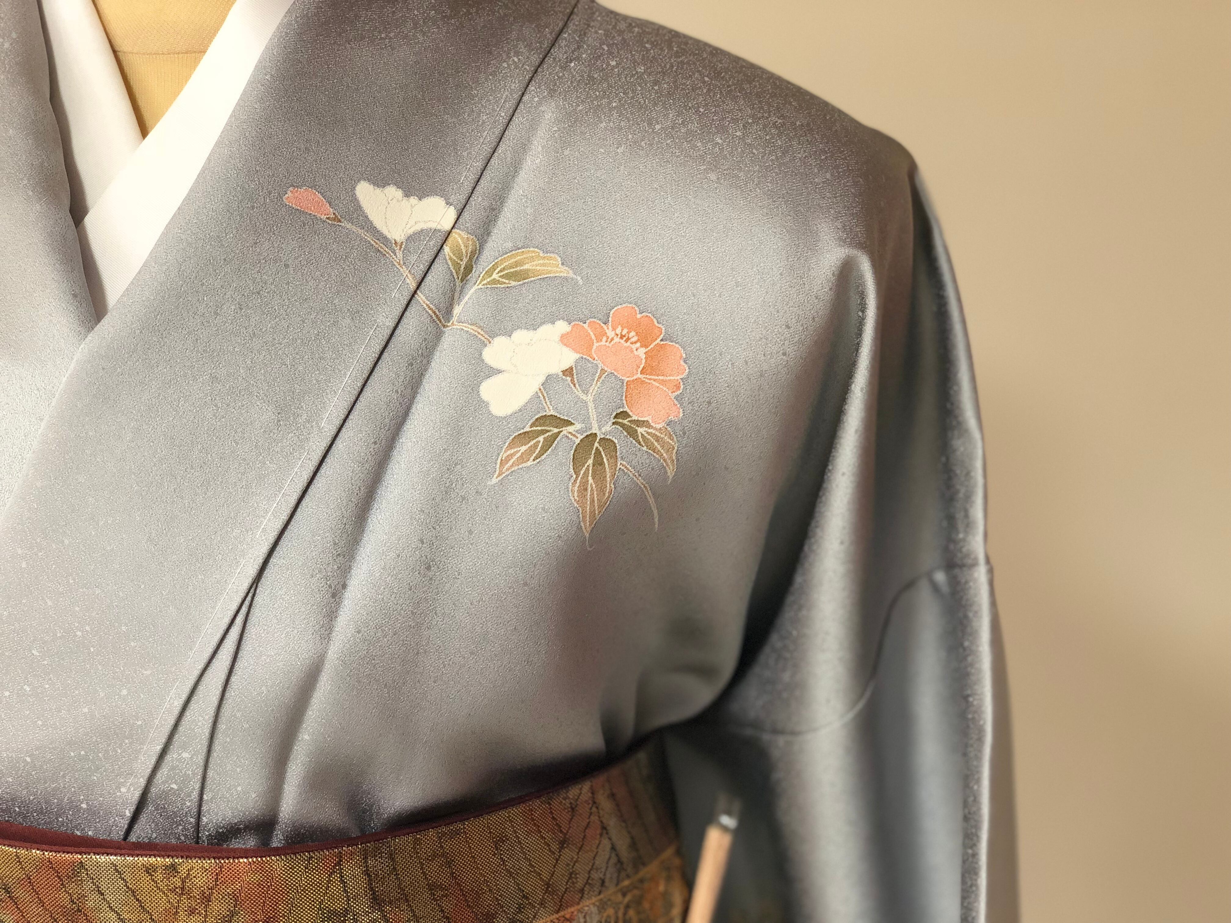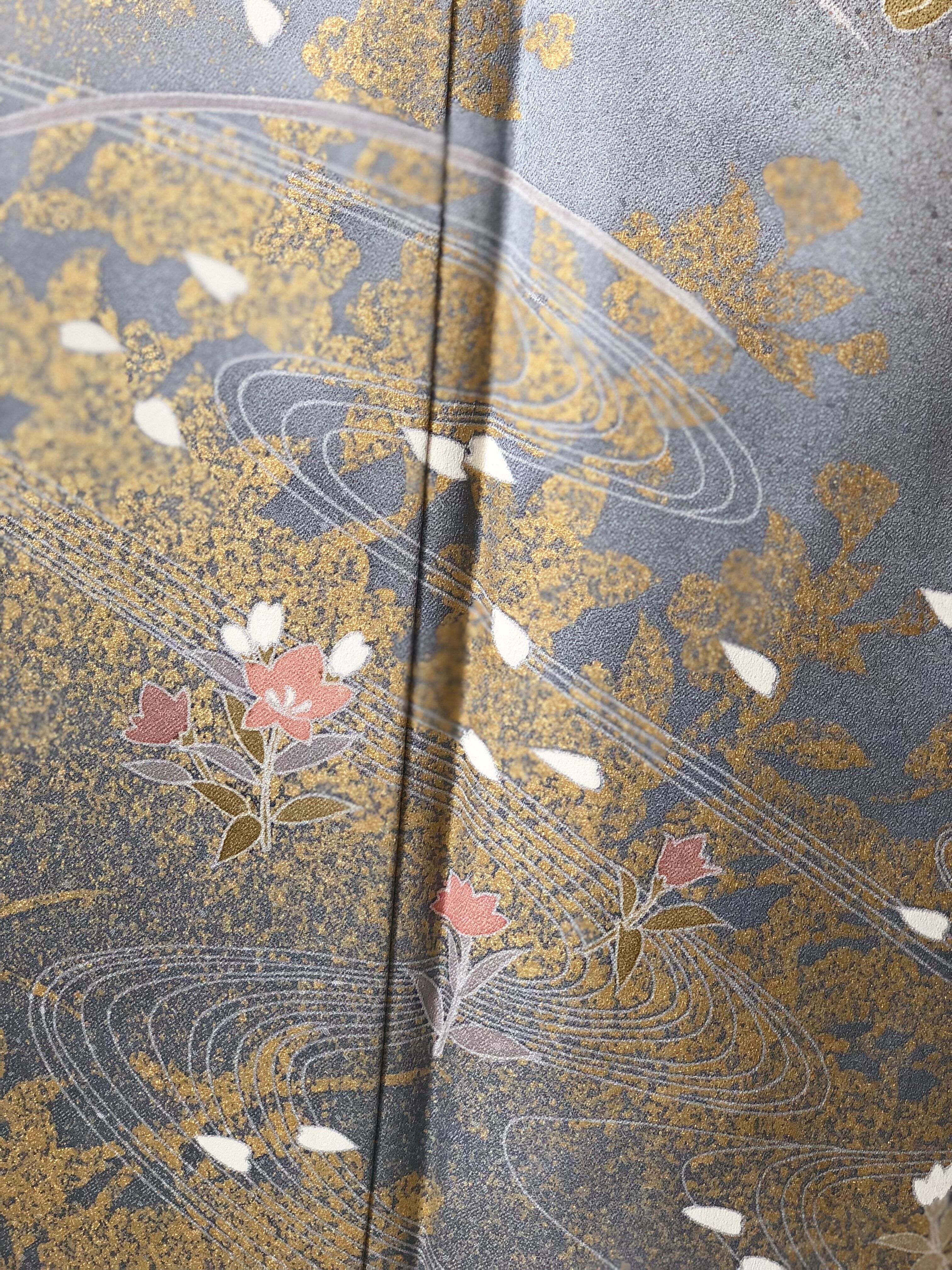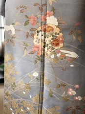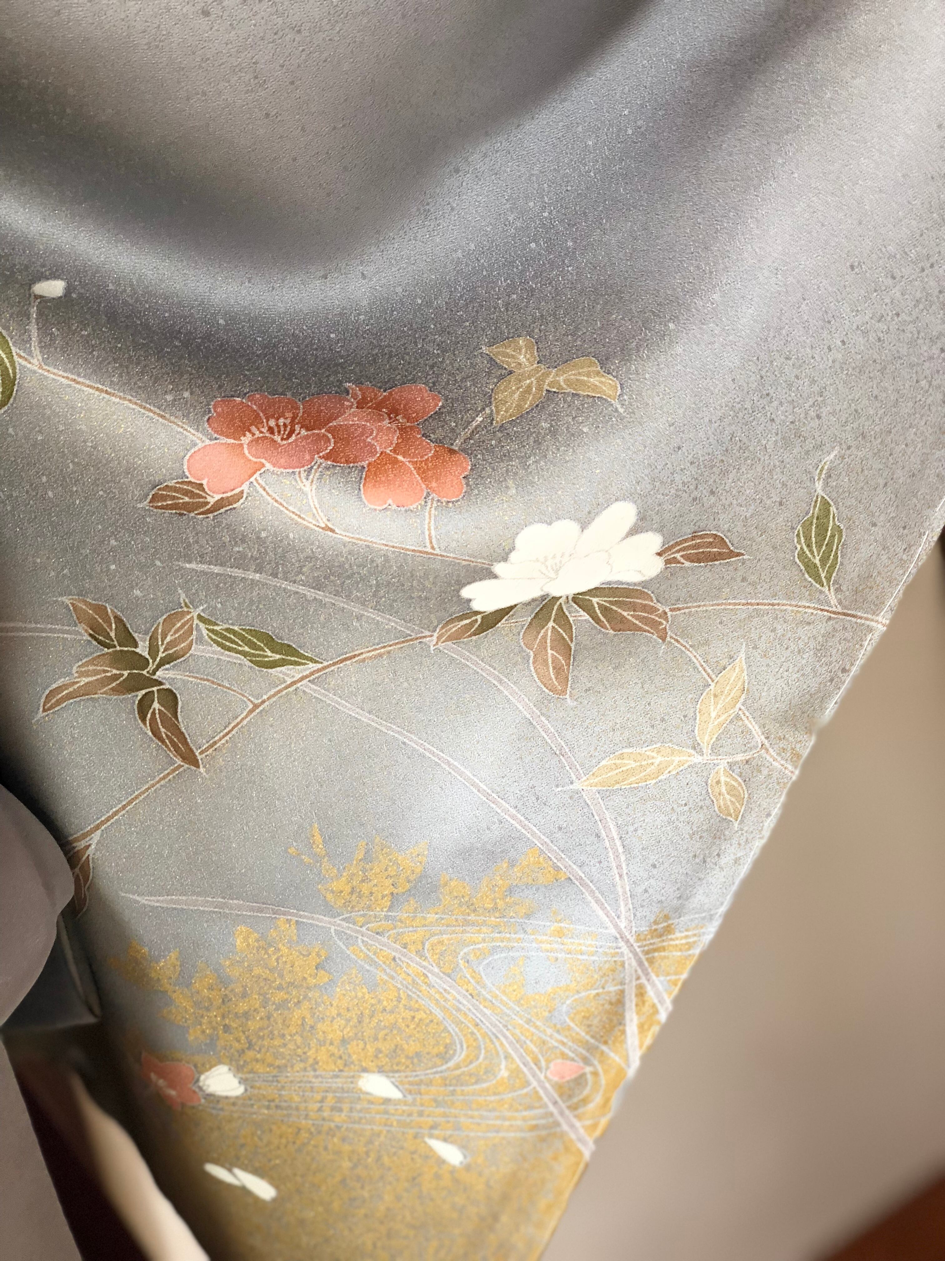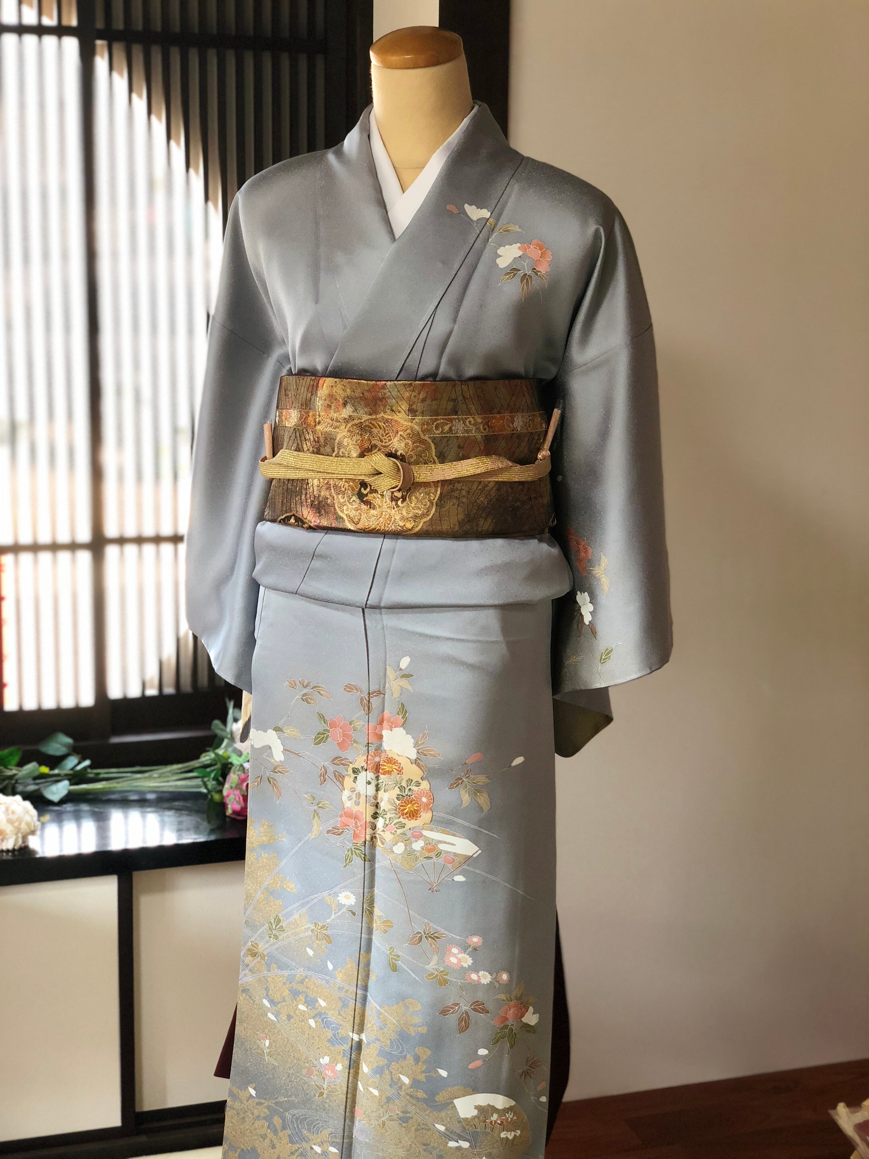 美しい光沢のブルーグレー地に、金彩、金駒刺繍で華やかに彩られた訪問着。