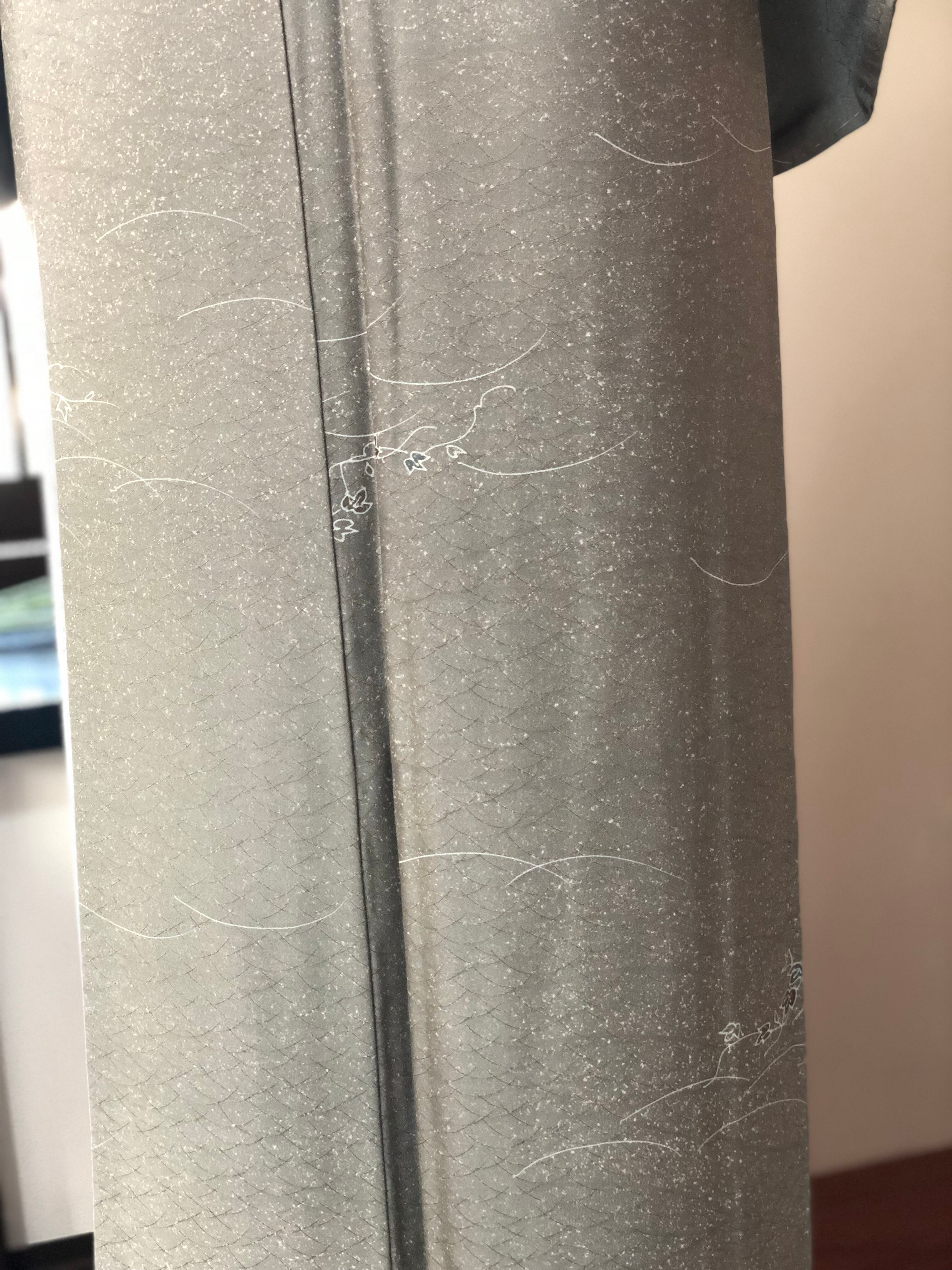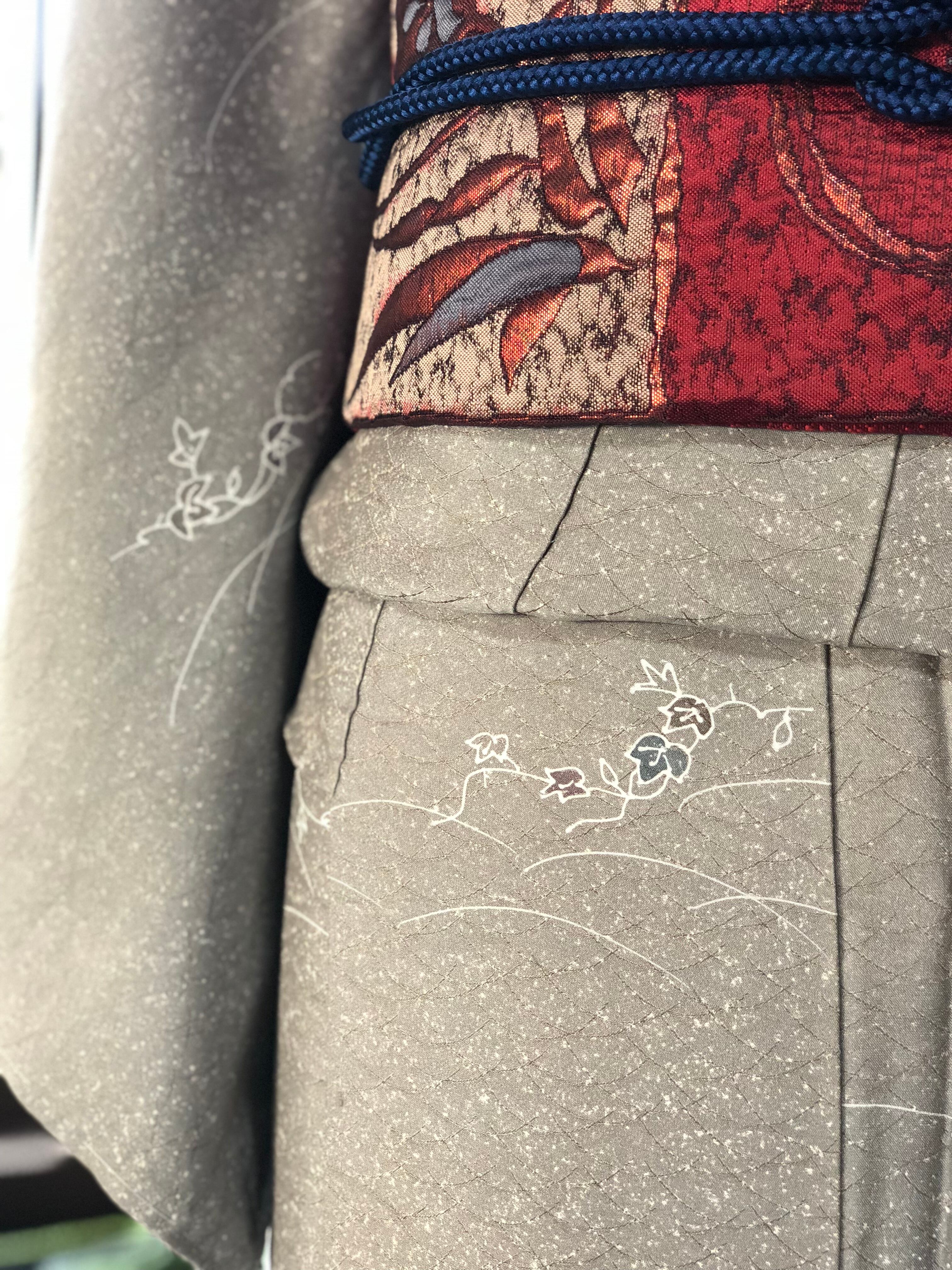 そして全体的に茶金の糸で波のような松葉のような柄があり、さらにあられのような白い模様も施されているというなんとも複雑な一枚だと思います。