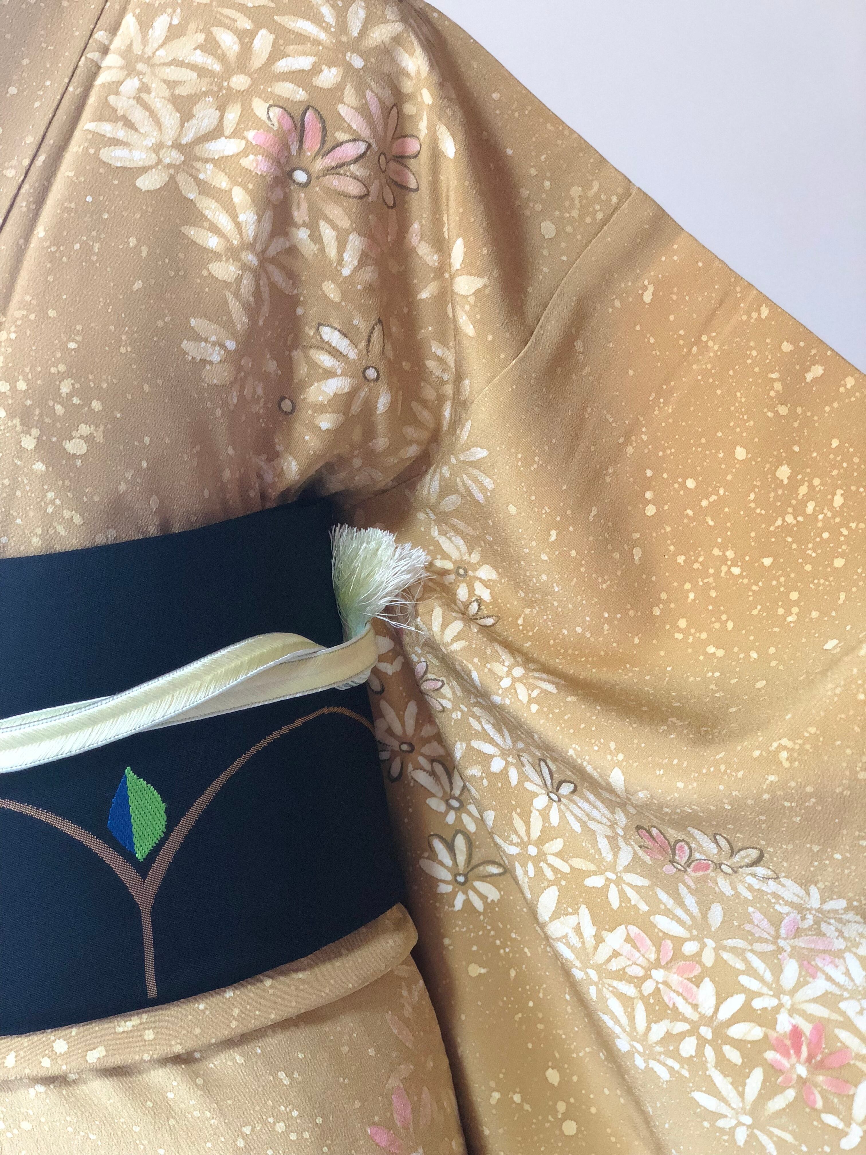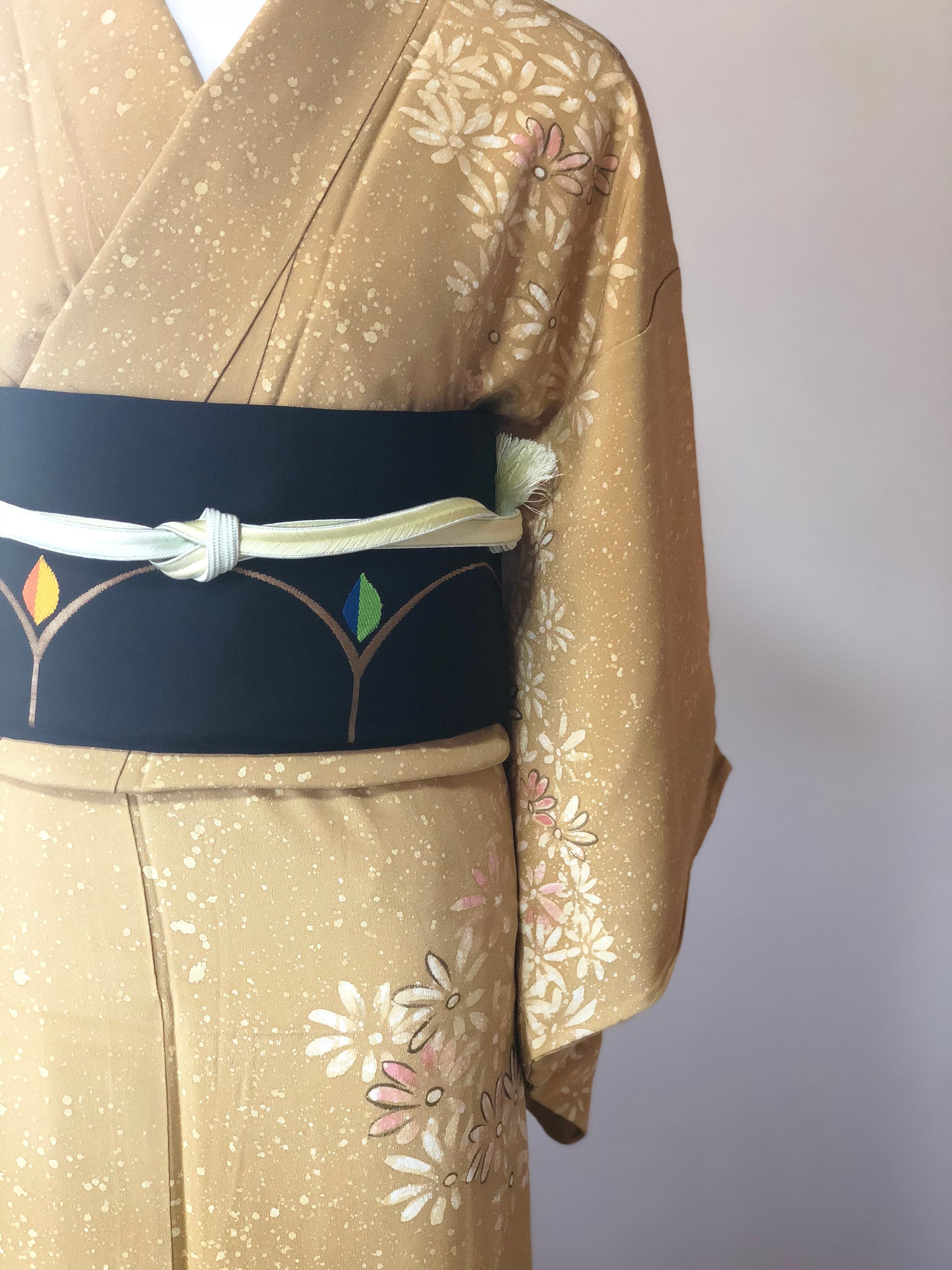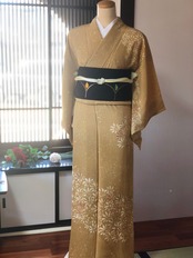 黄身寄りの薄茶地に白花が豪華に咲き誇る訪問着。