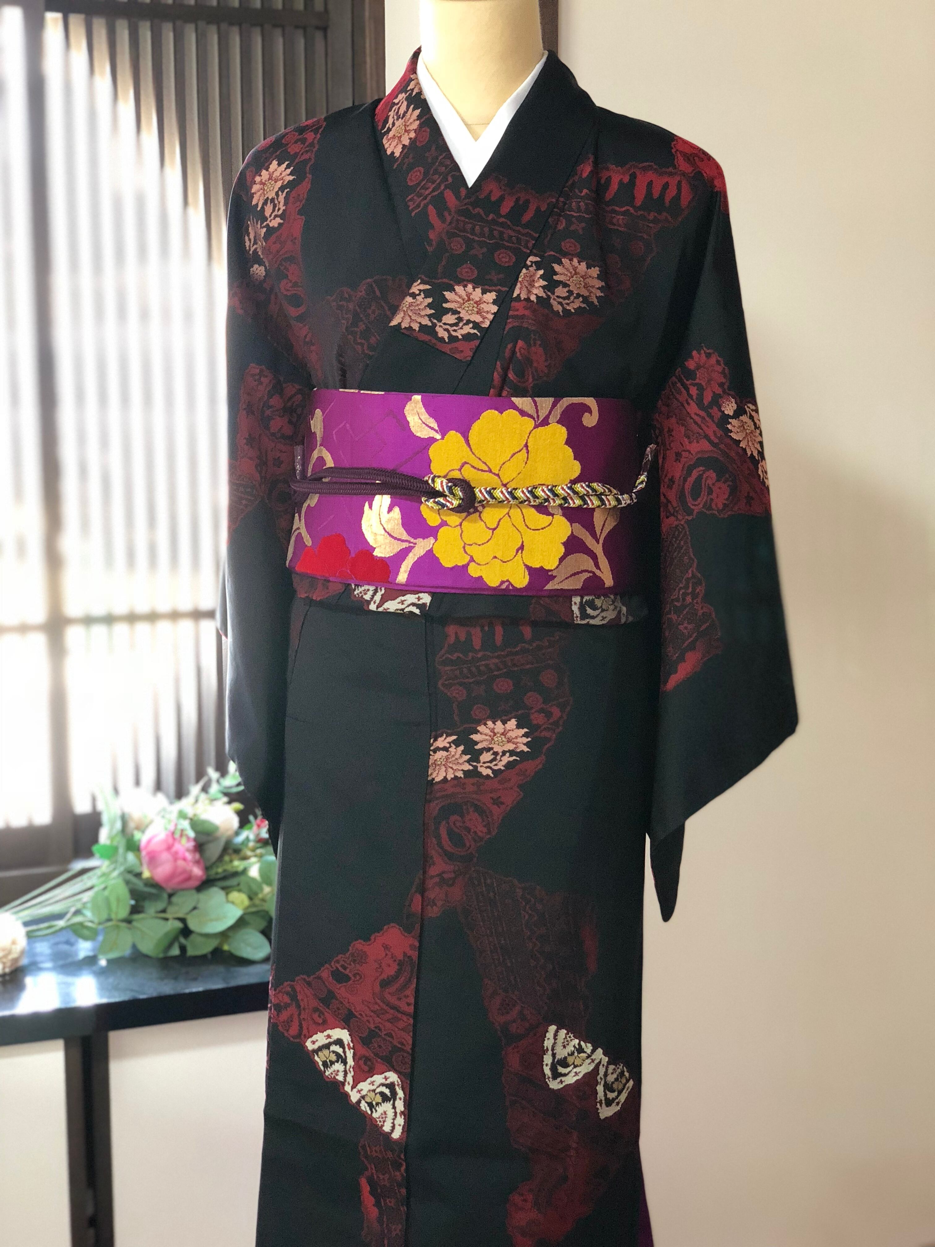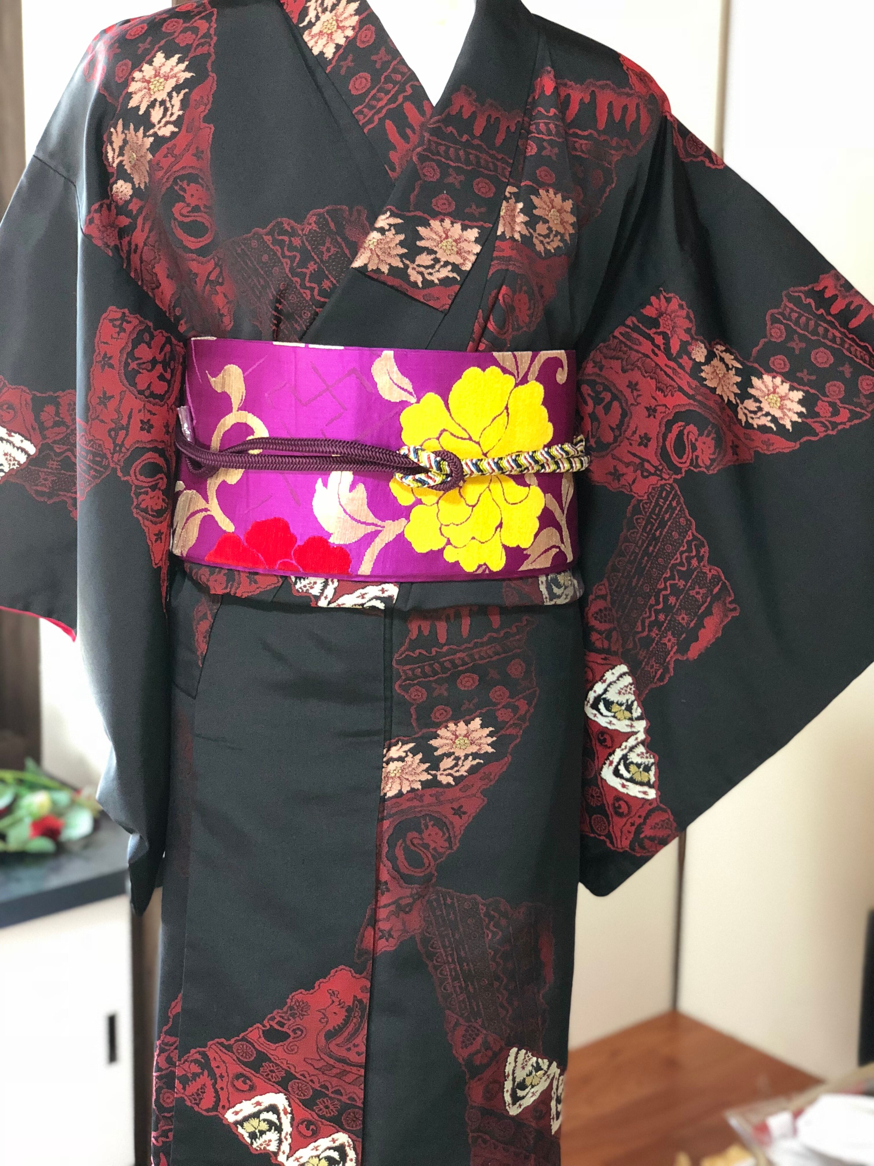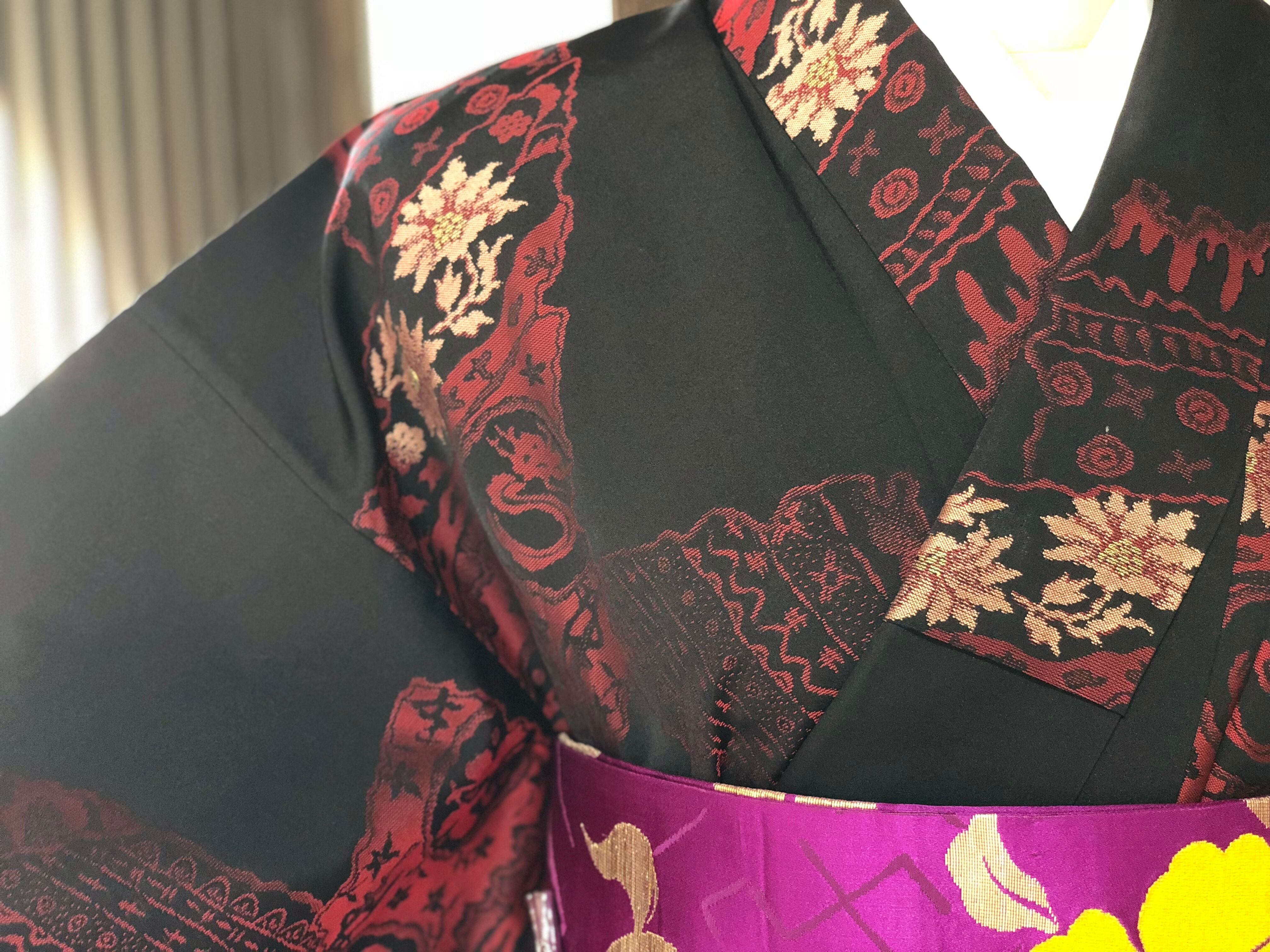 光沢のある黒地に赤やピンク、ゴールドでいろいろな柄が織り出されているお召しです。