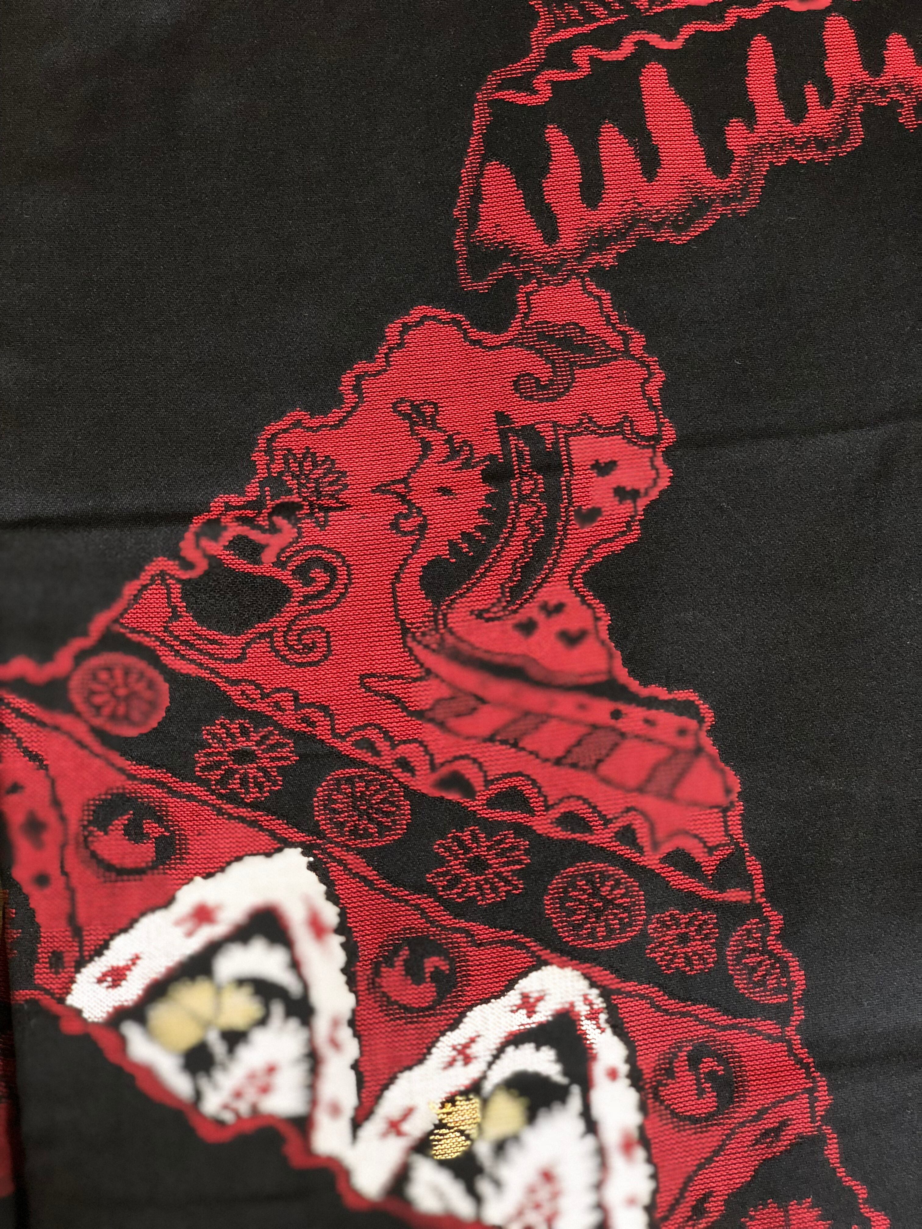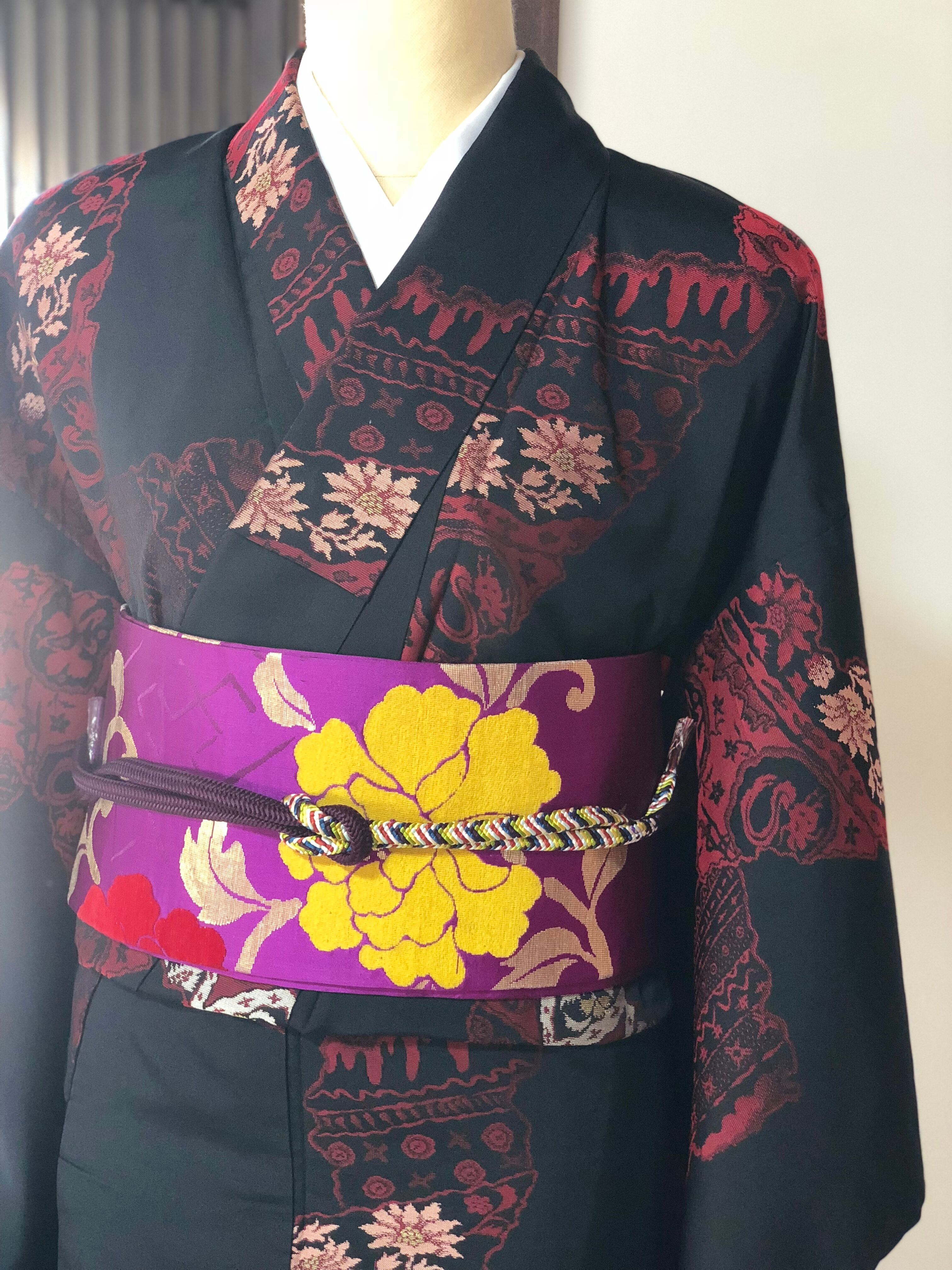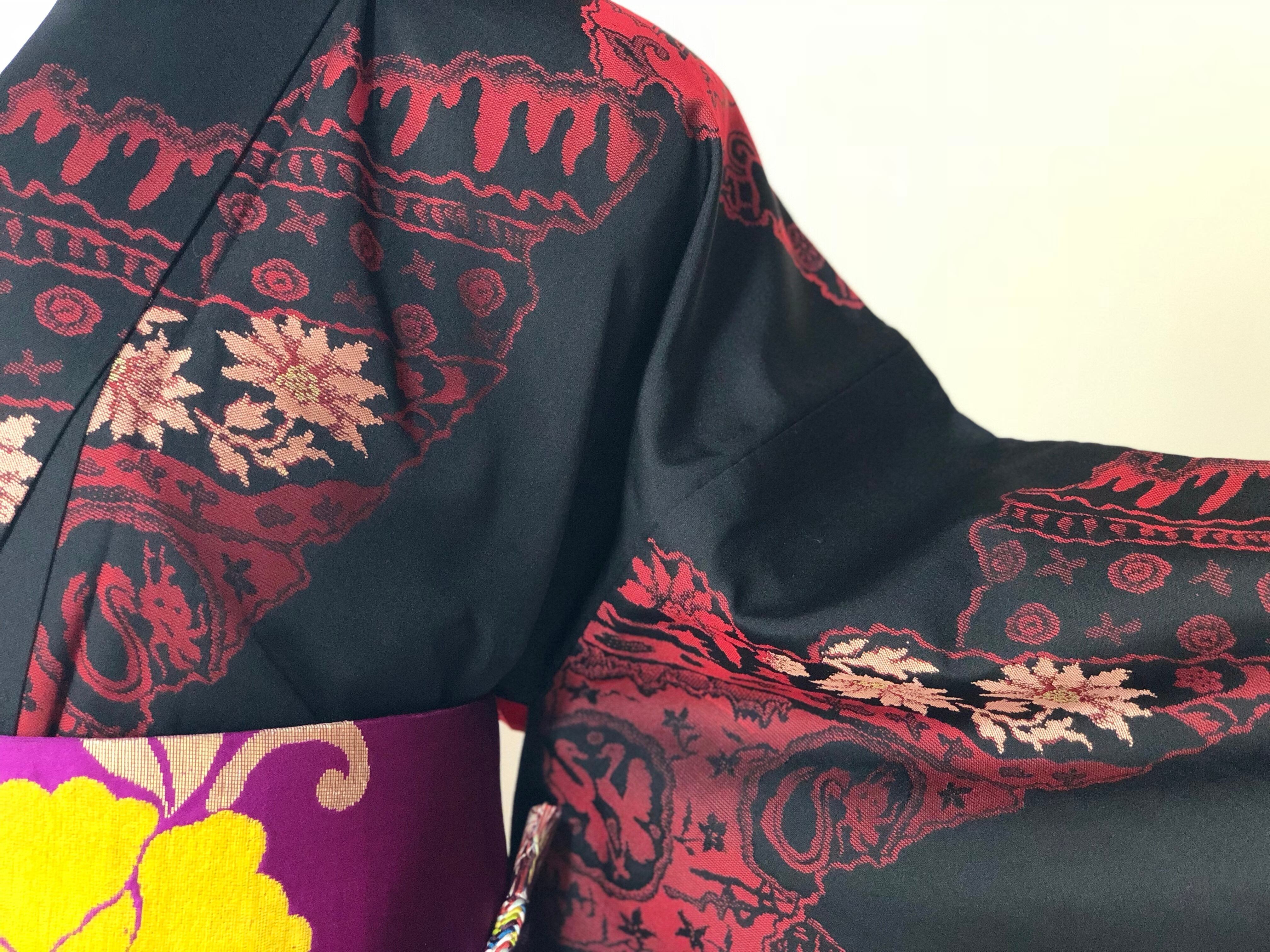 光沢のある黒地に赤やピンク、ゴールドでいろいろな柄が織り出されているお召しです。