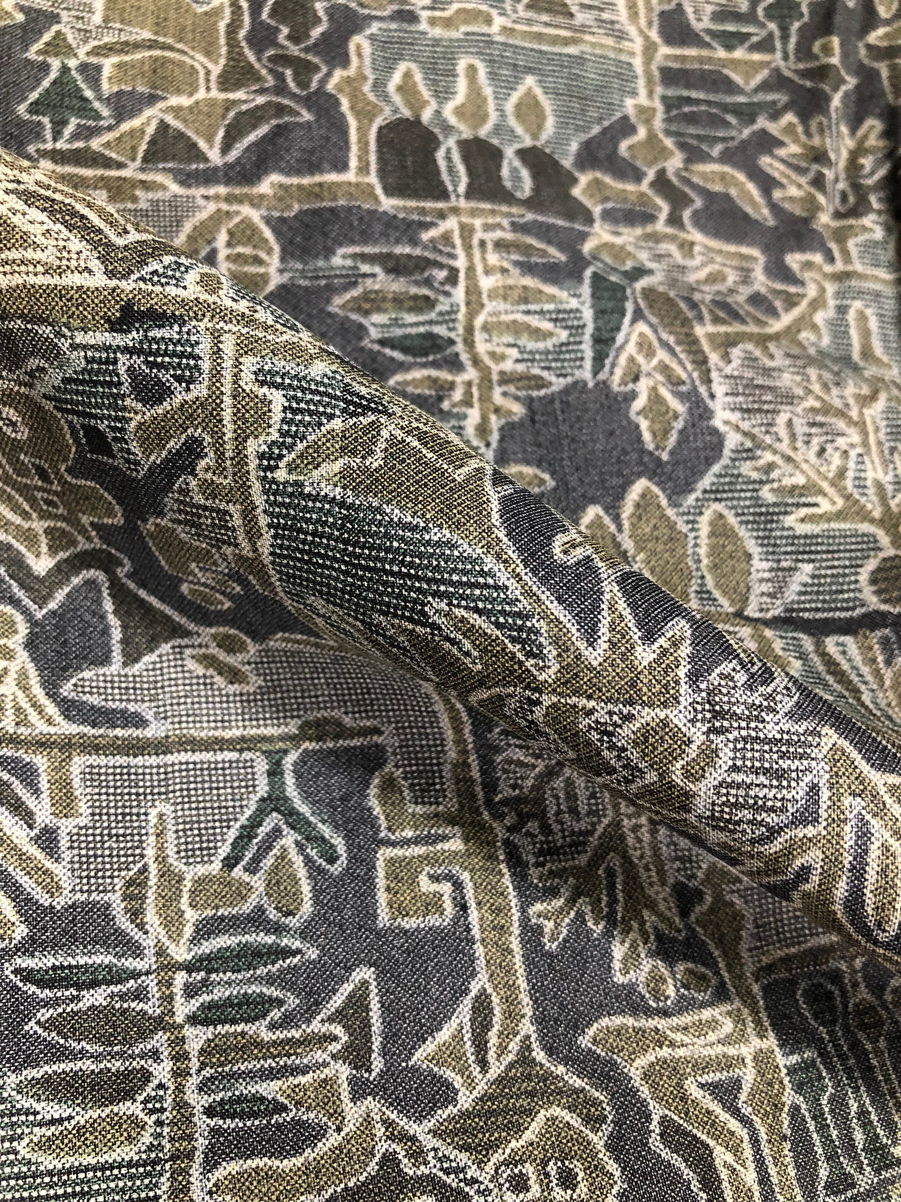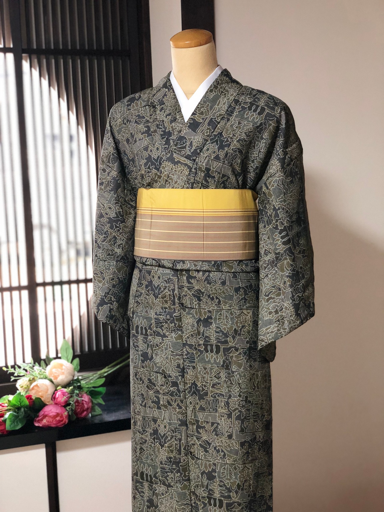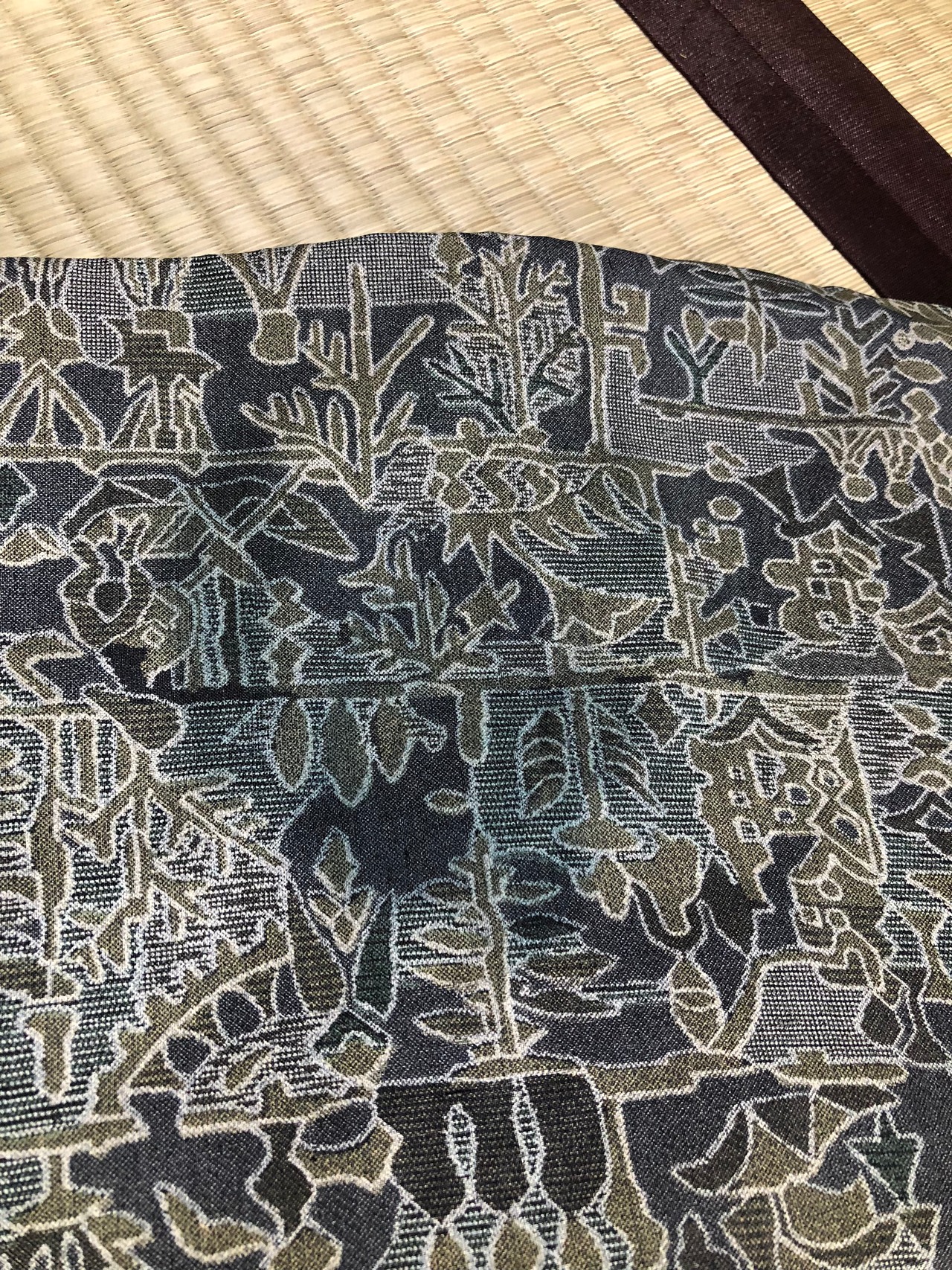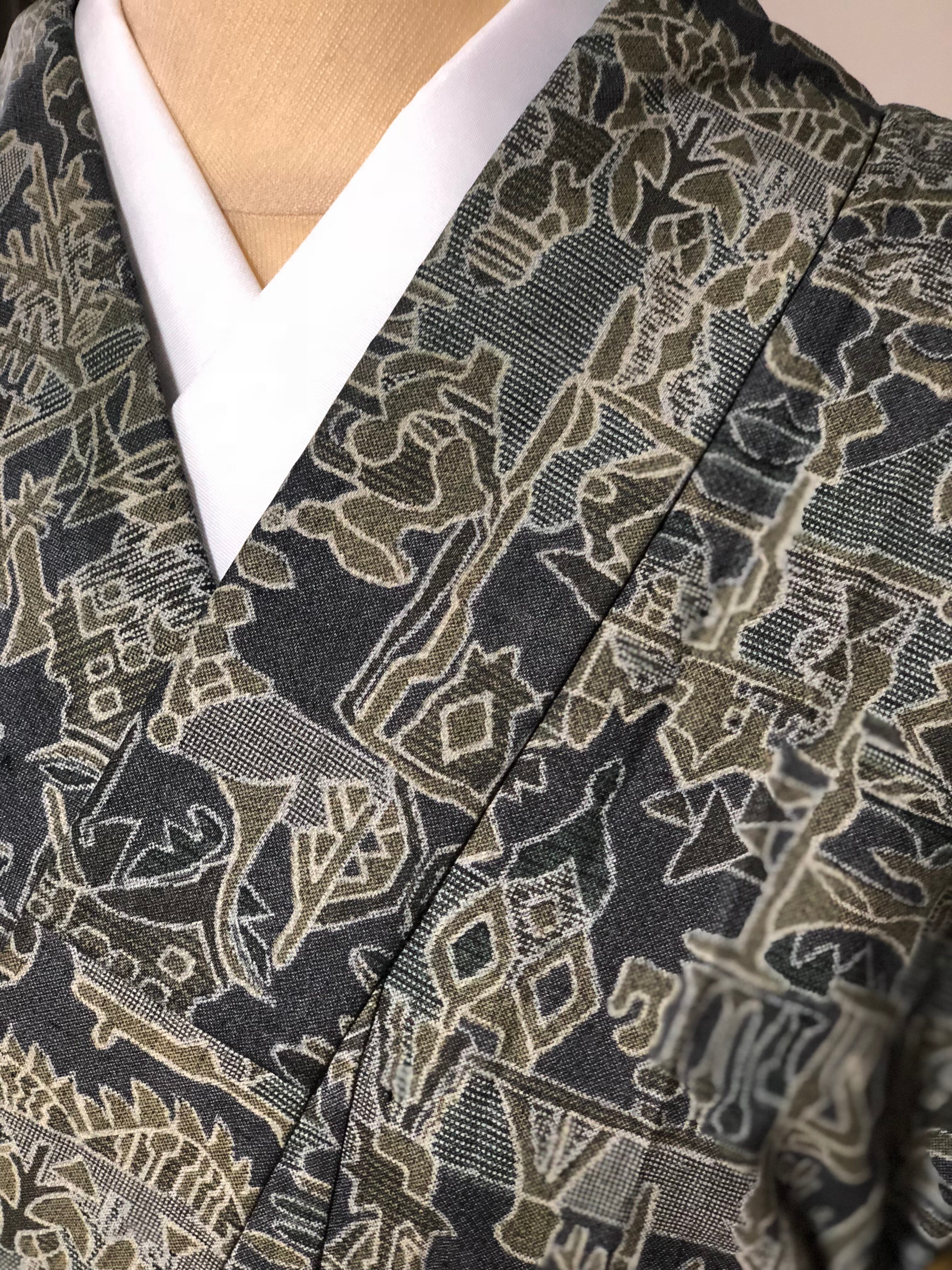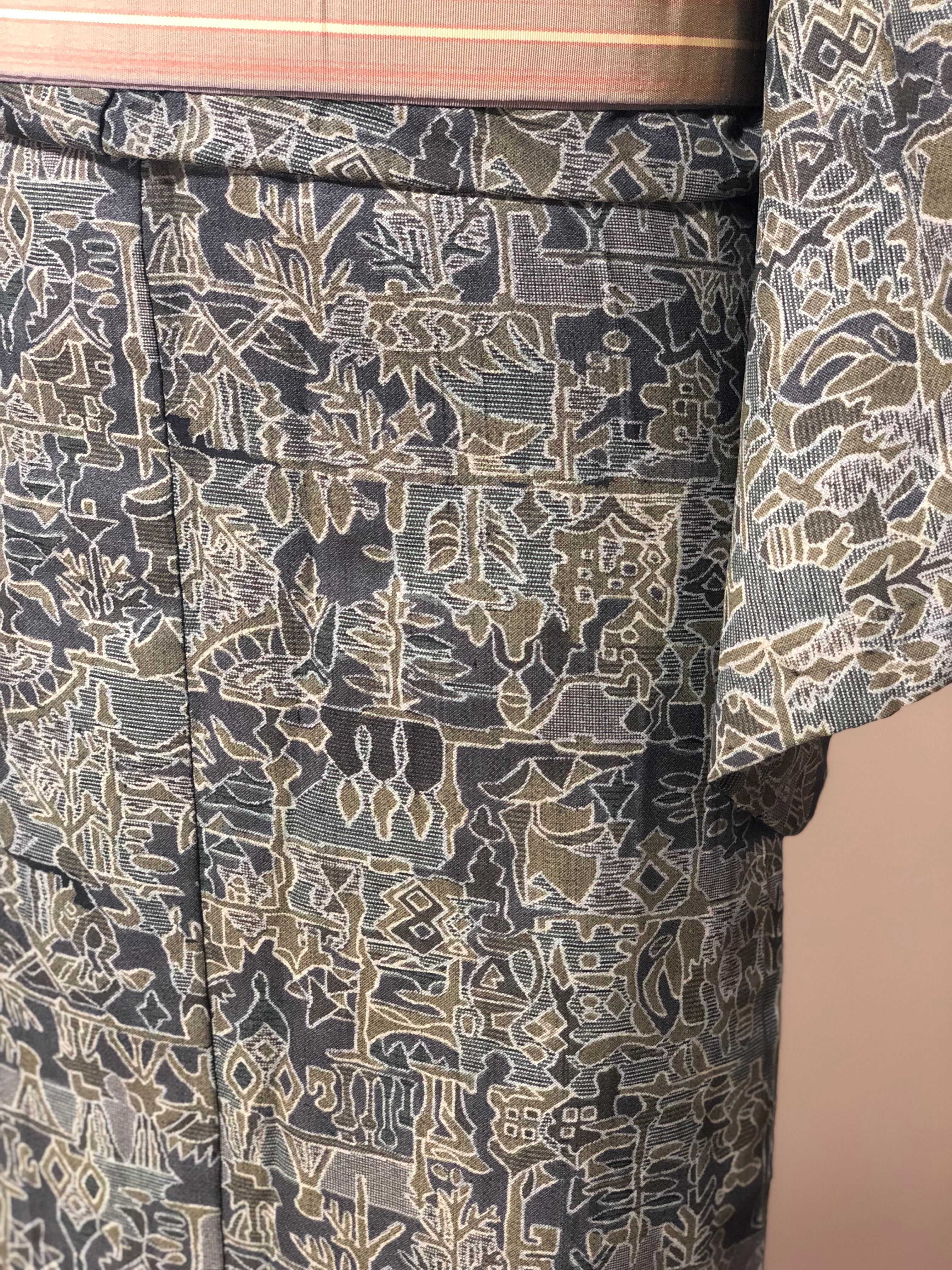 グレー地に同系色の不思議な柄が織り出されている紬です。