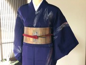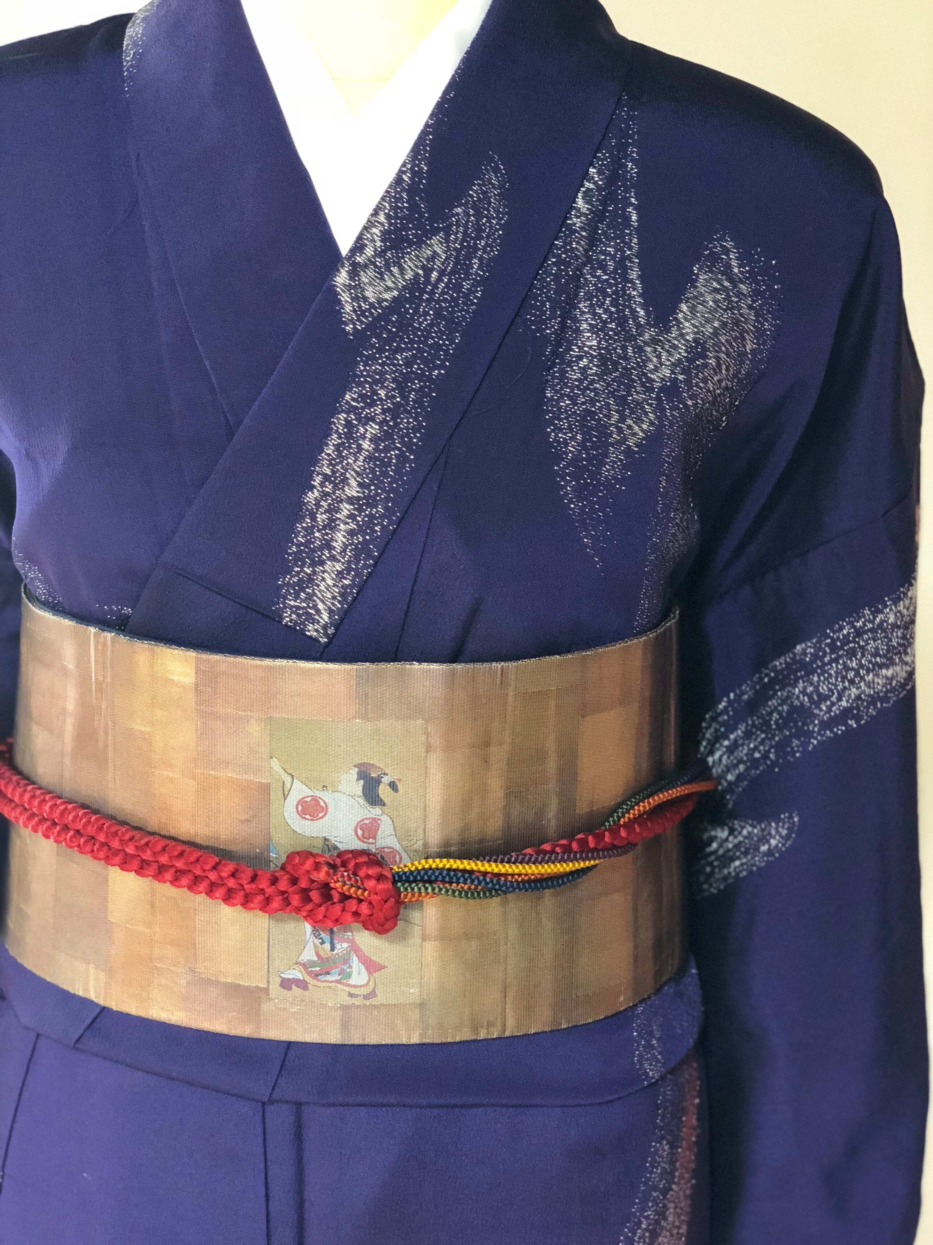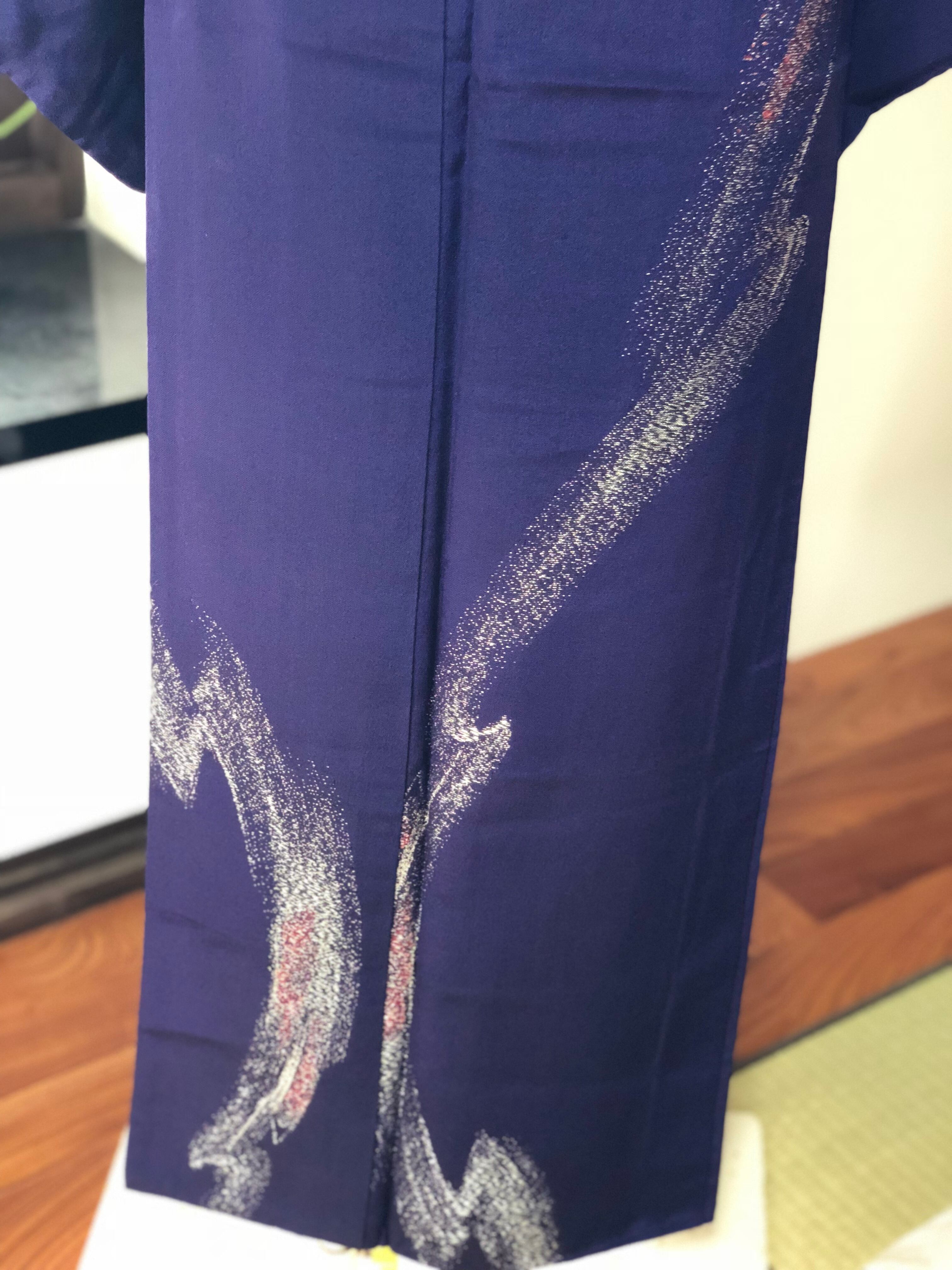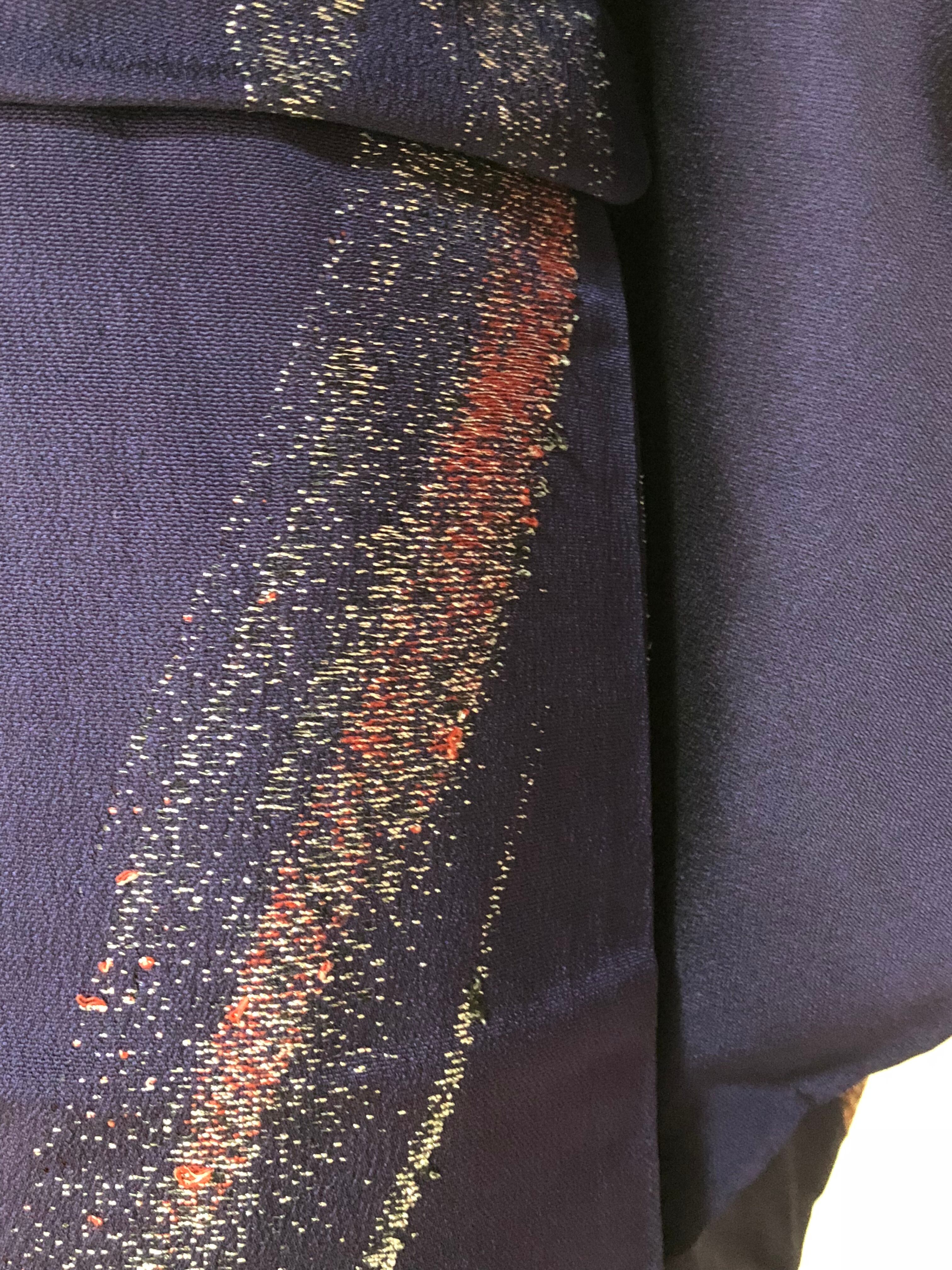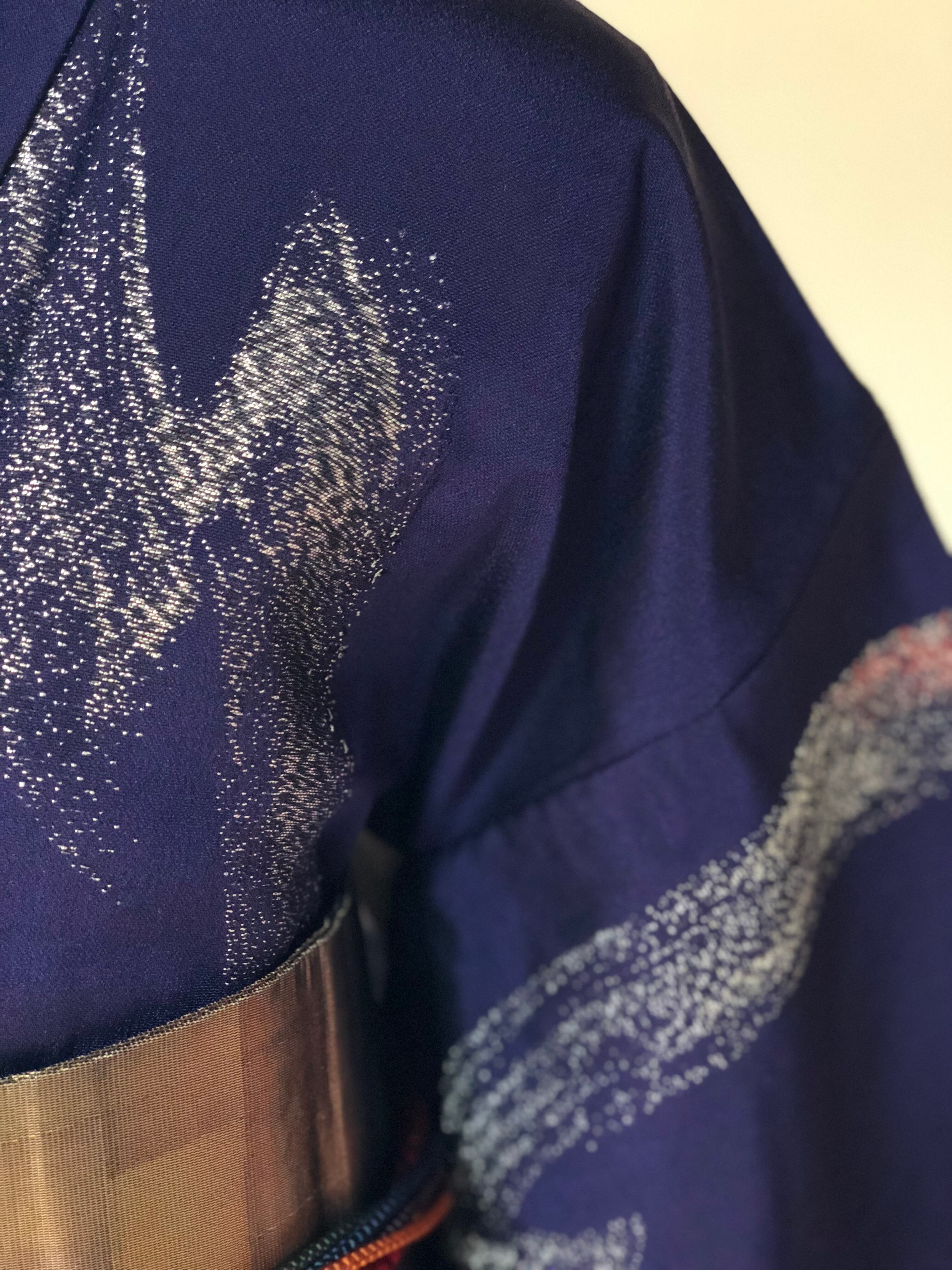 紺と紫の間くらいの地色に昔のお召し特有の銀糸が織り込まれ、銀河のような雰囲気になっております。