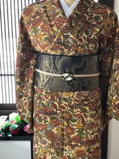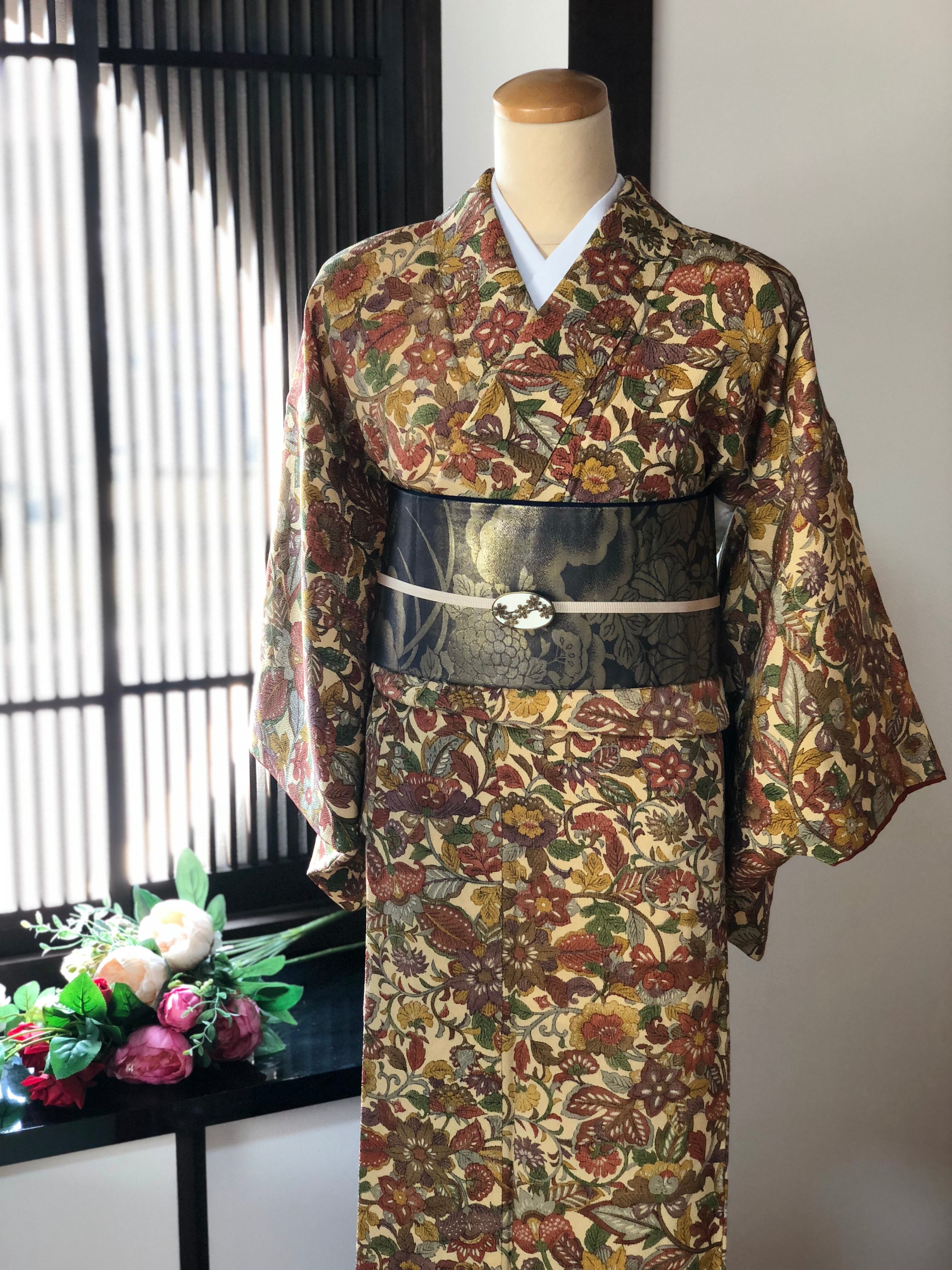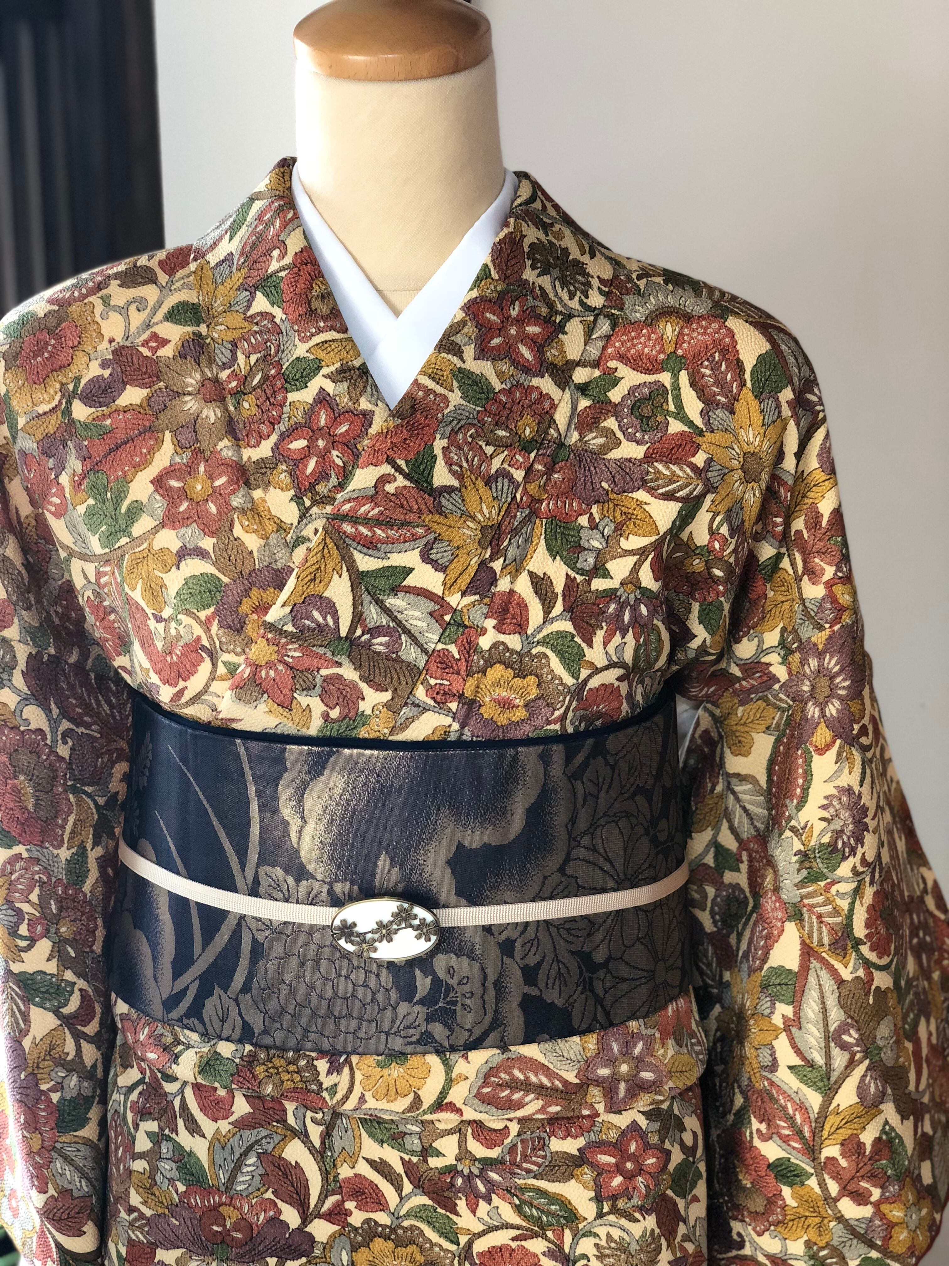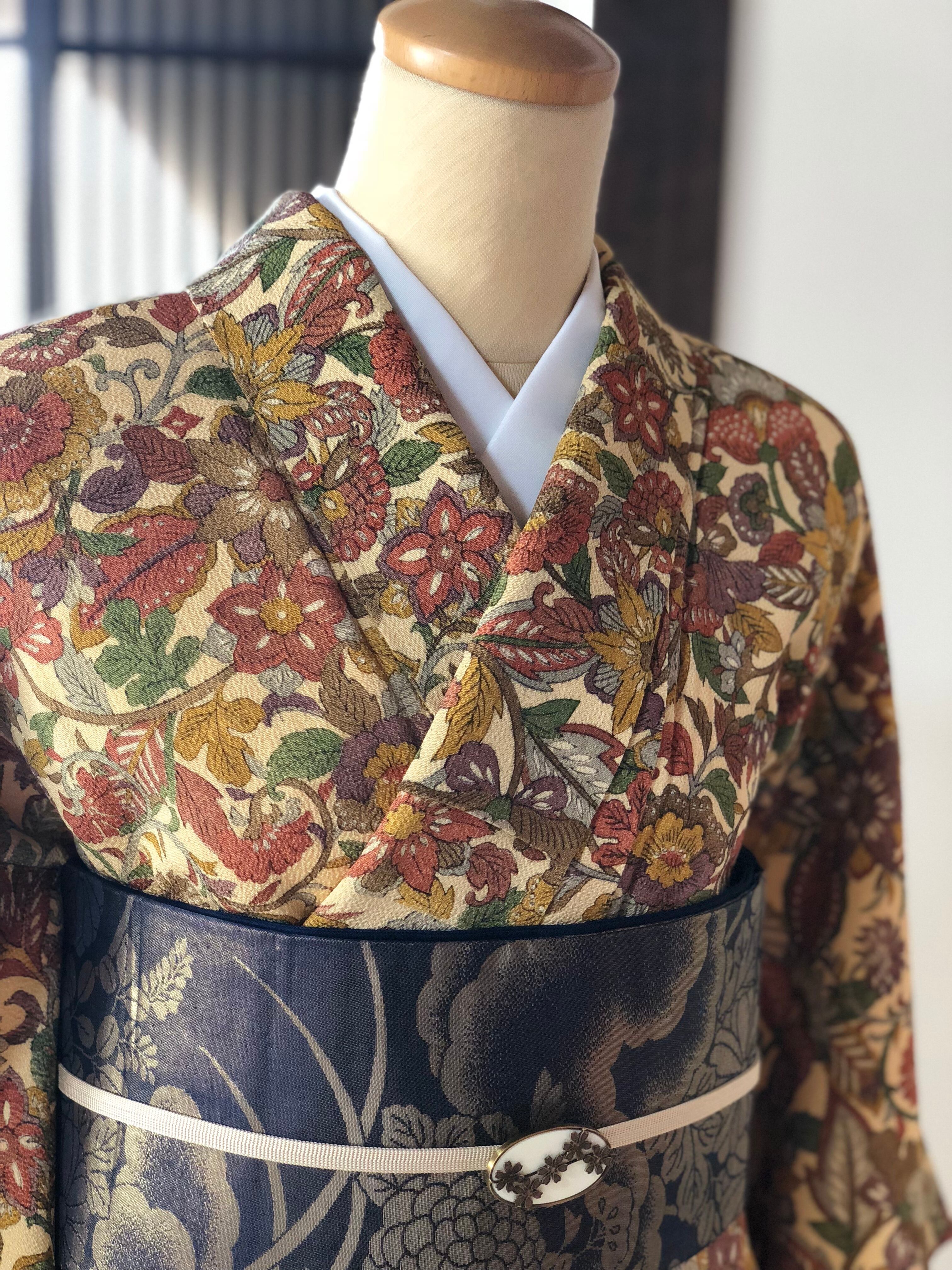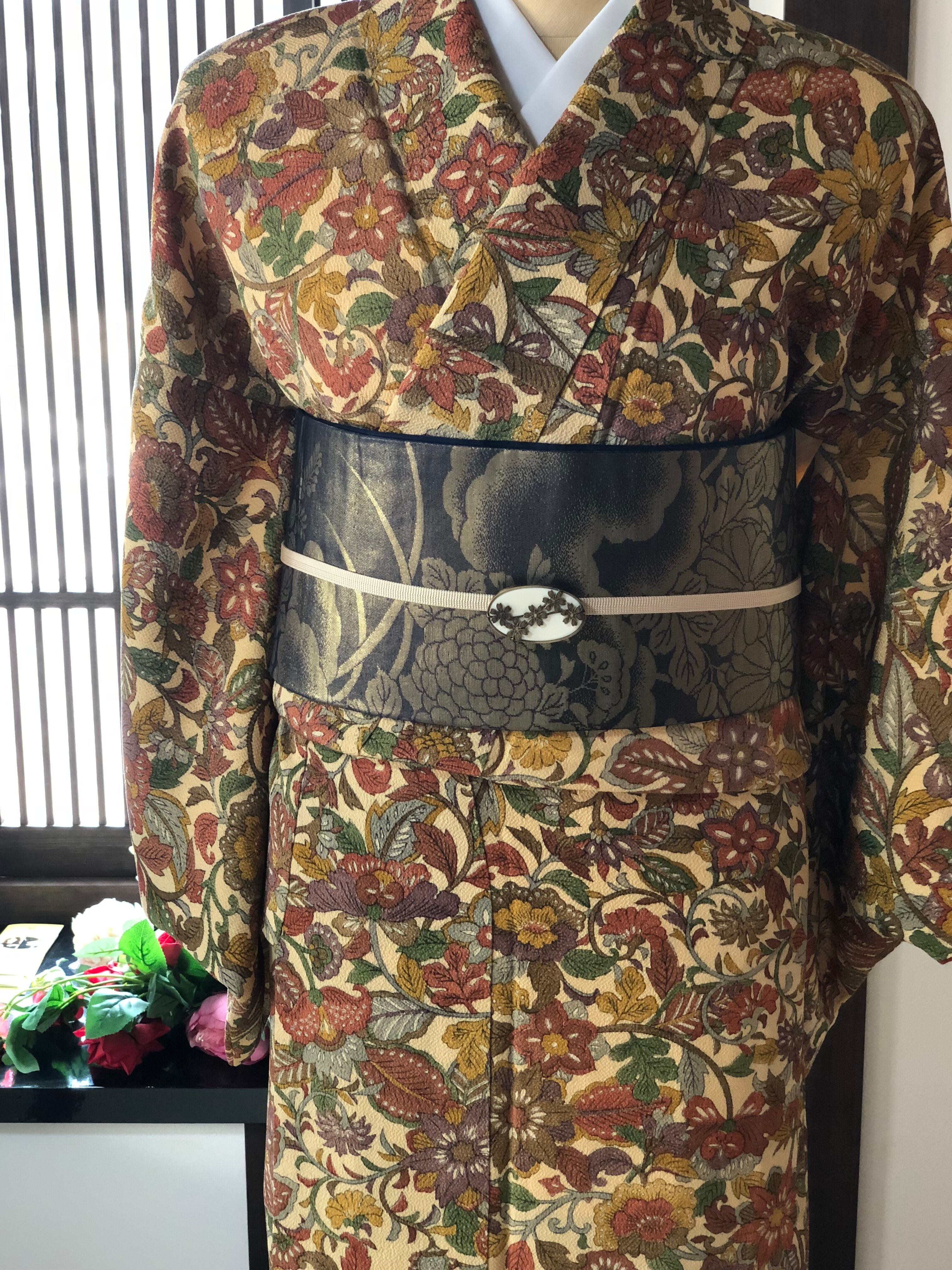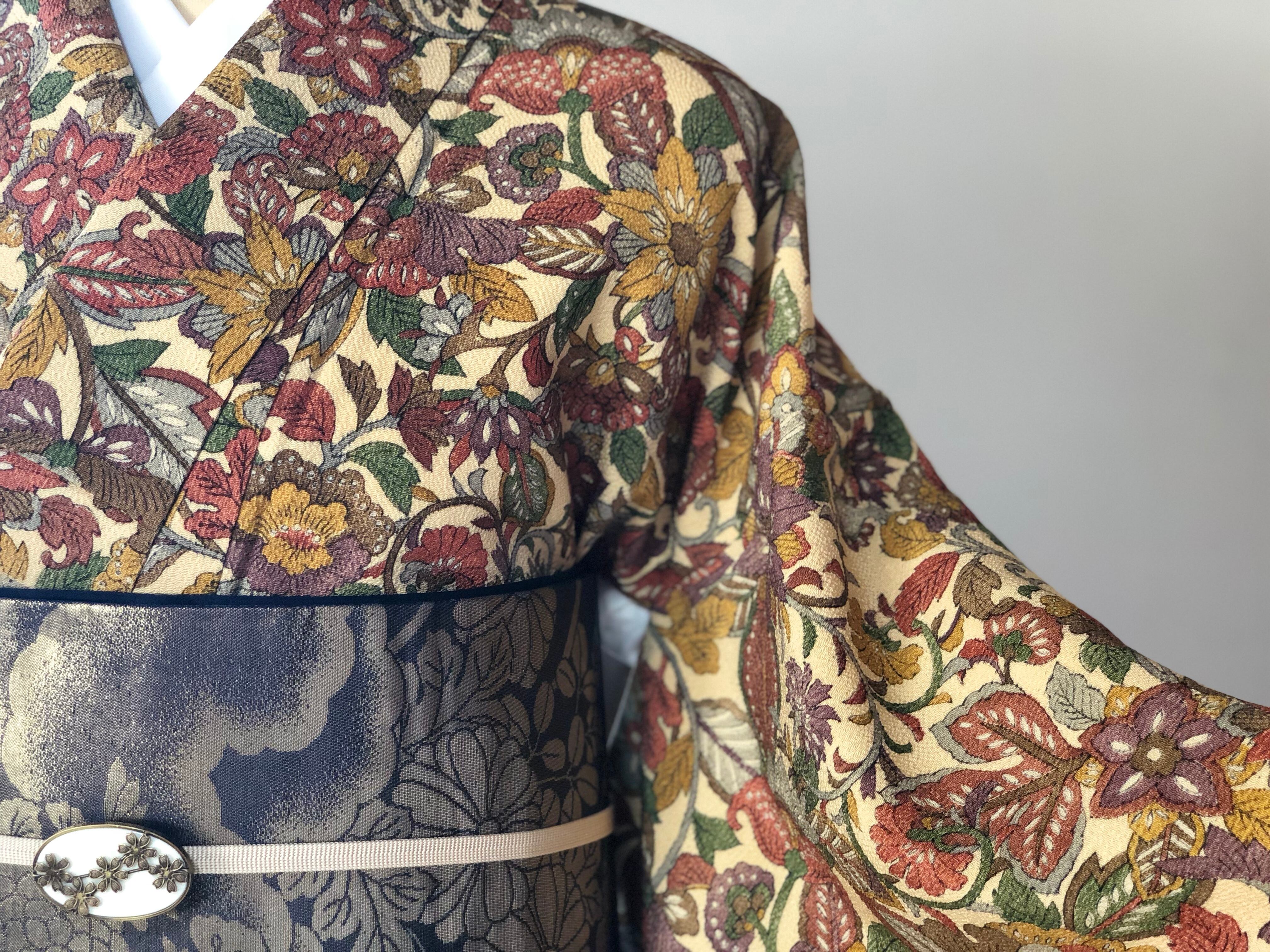少しくすんだクリーム色の地に大きめ柄の更紗小紋です。