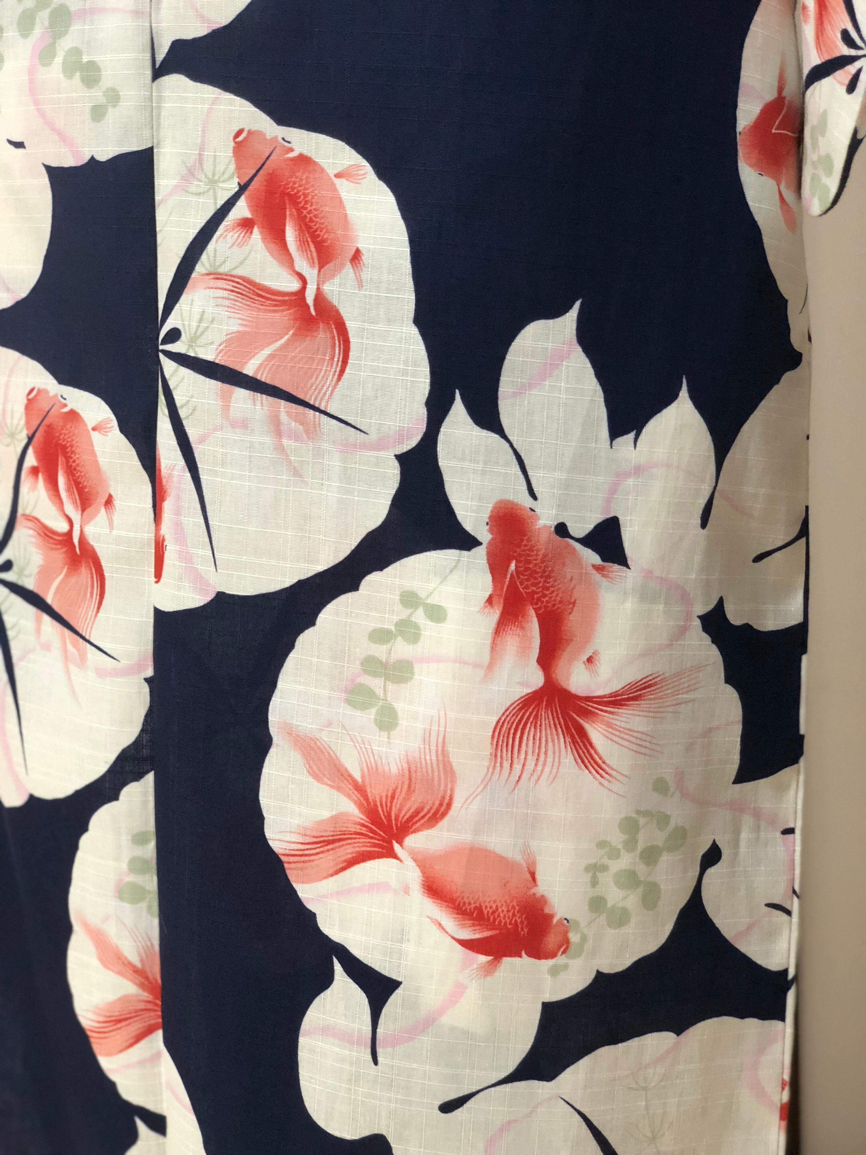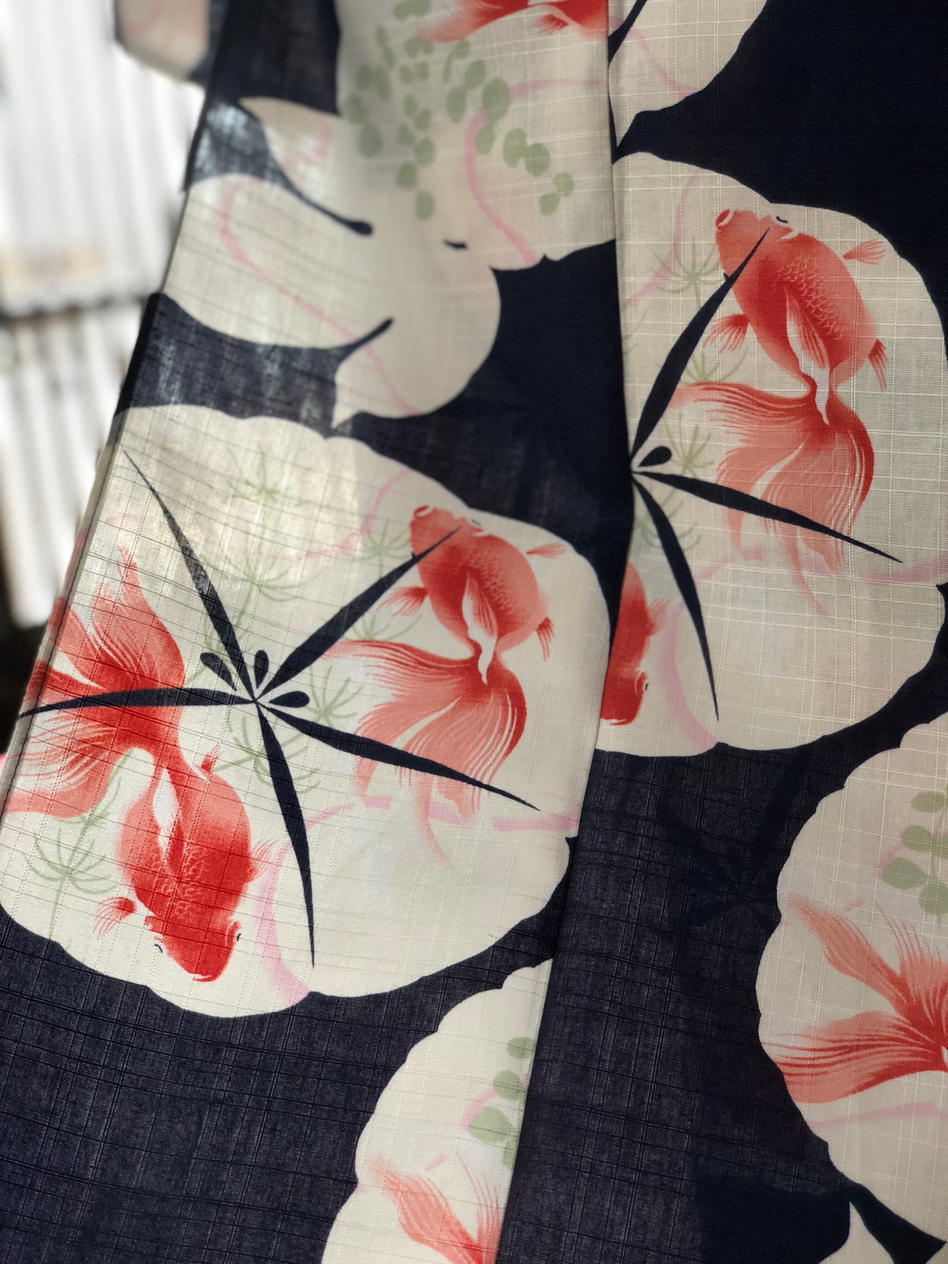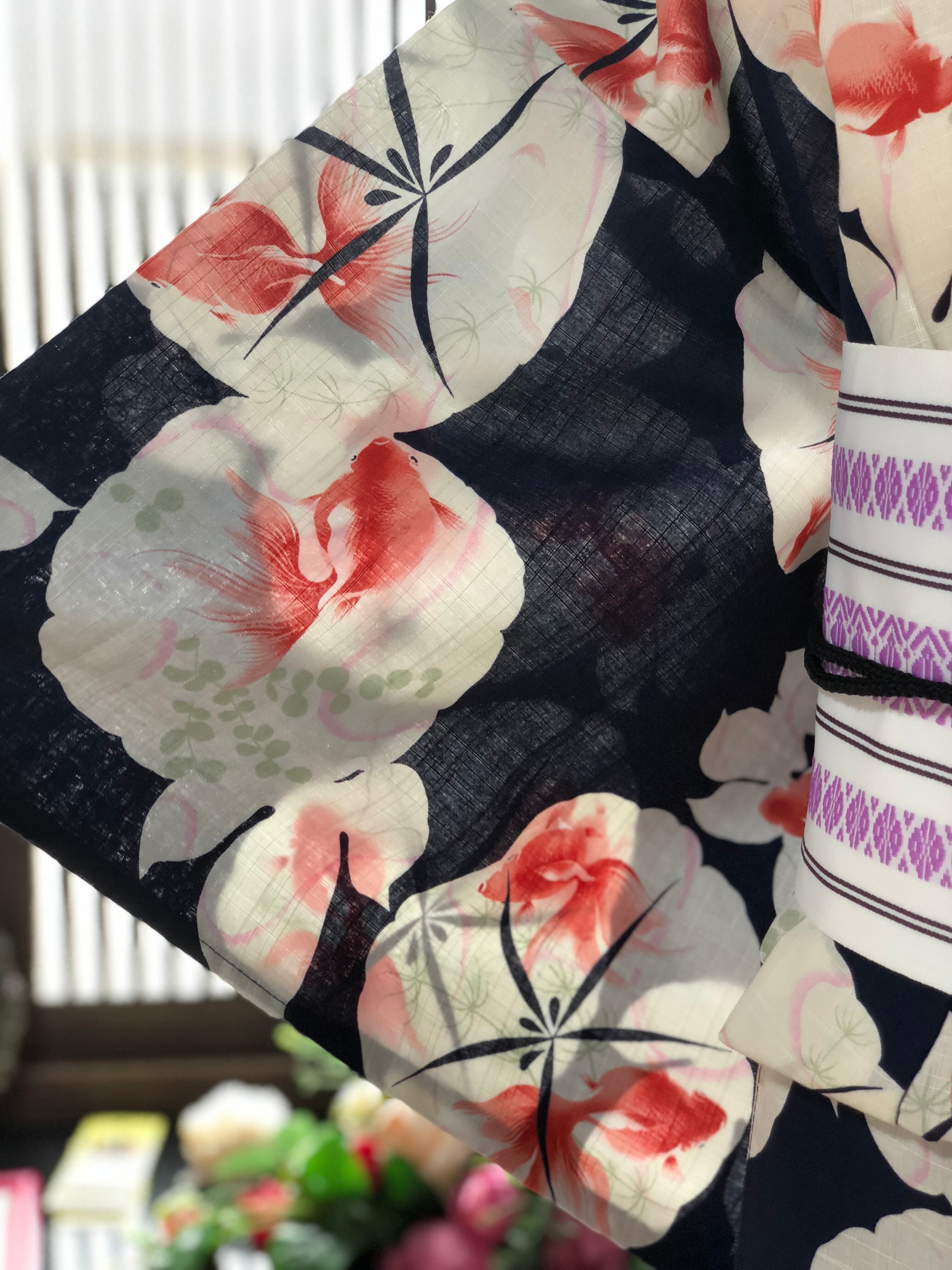 紺色の地に白い朝顔、その中を優雅に泳ぐ金魚の浴衣。