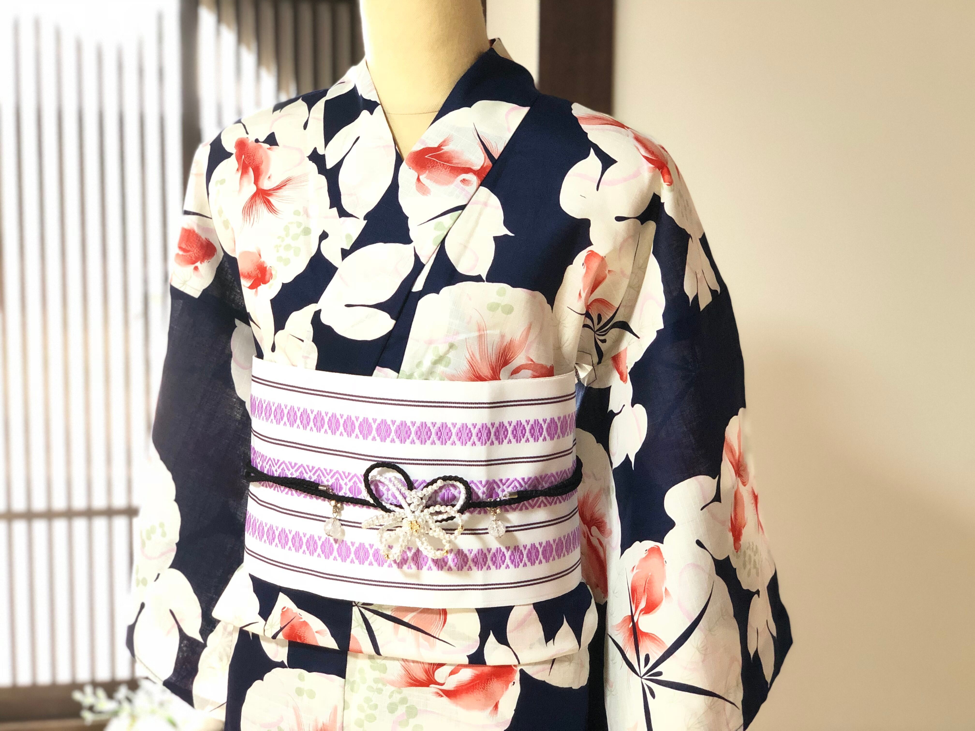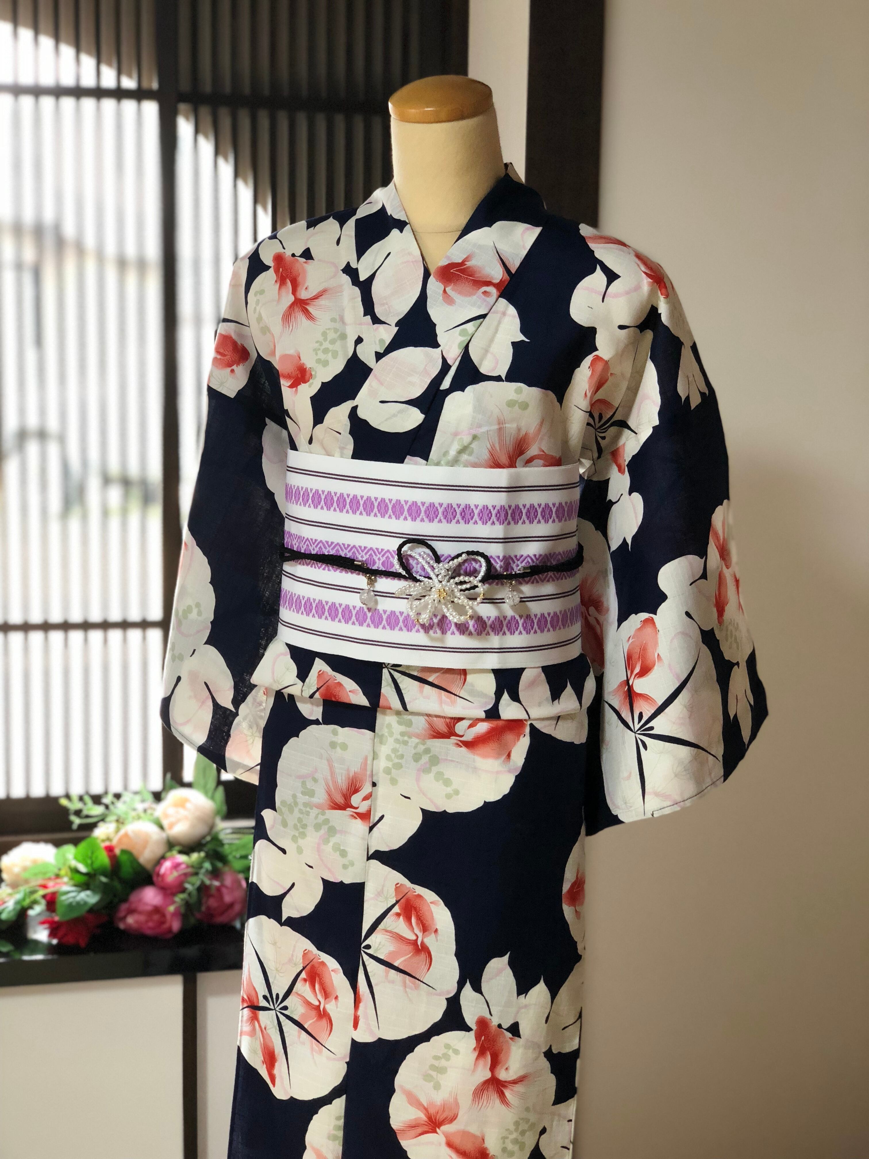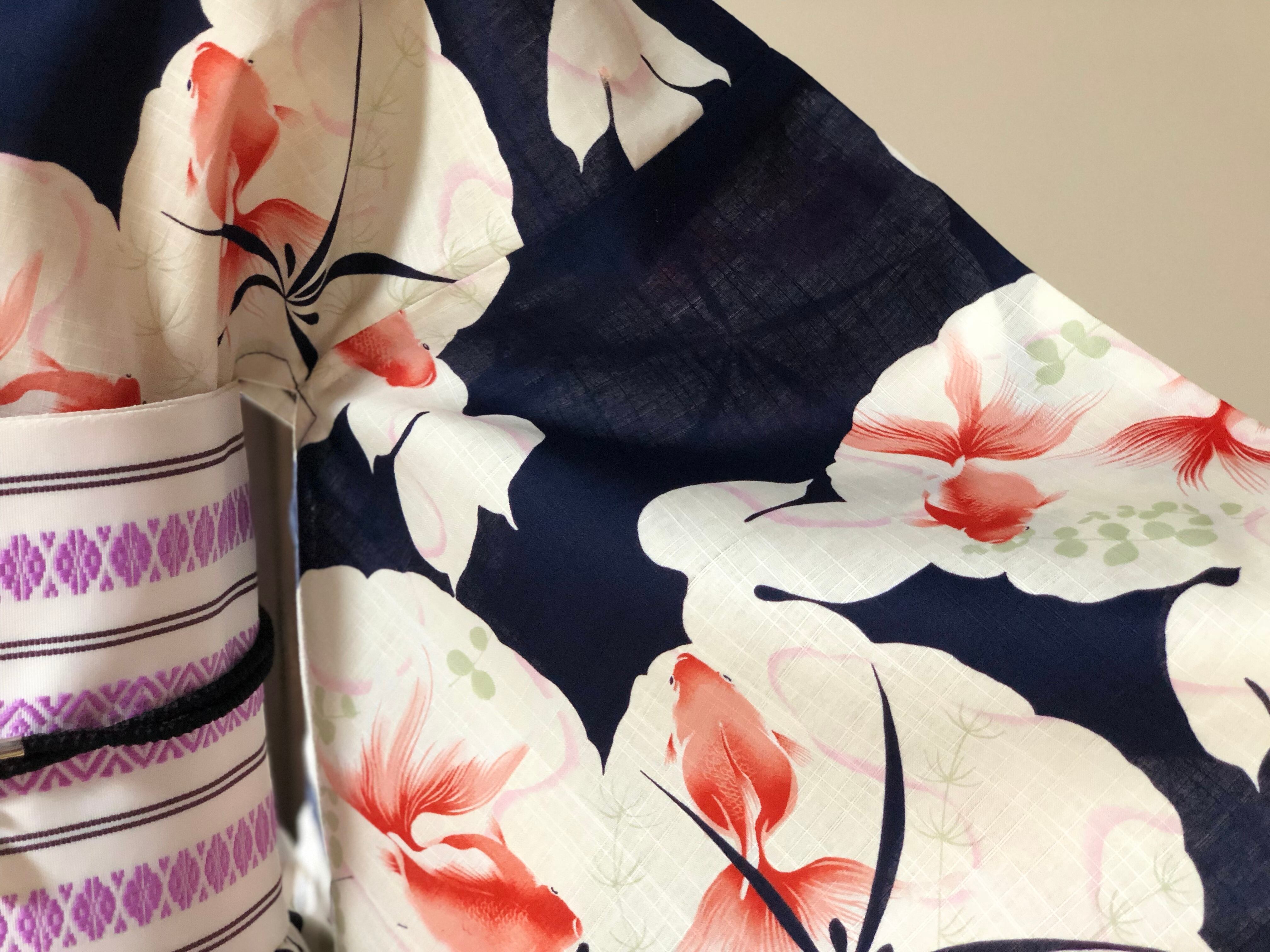 紺色の地に白い朝顔、その中を優雅に泳ぐ金魚の浴衣。