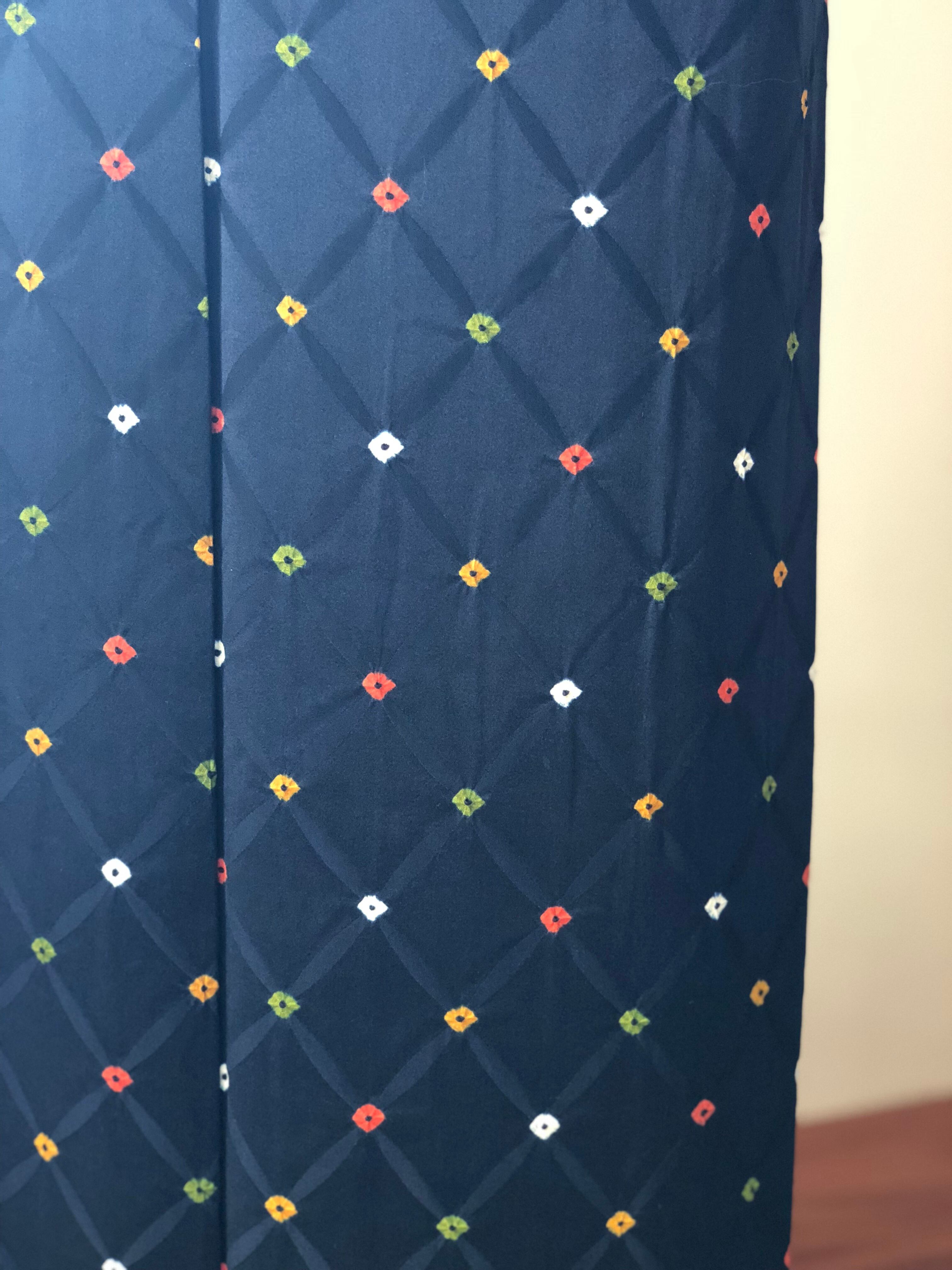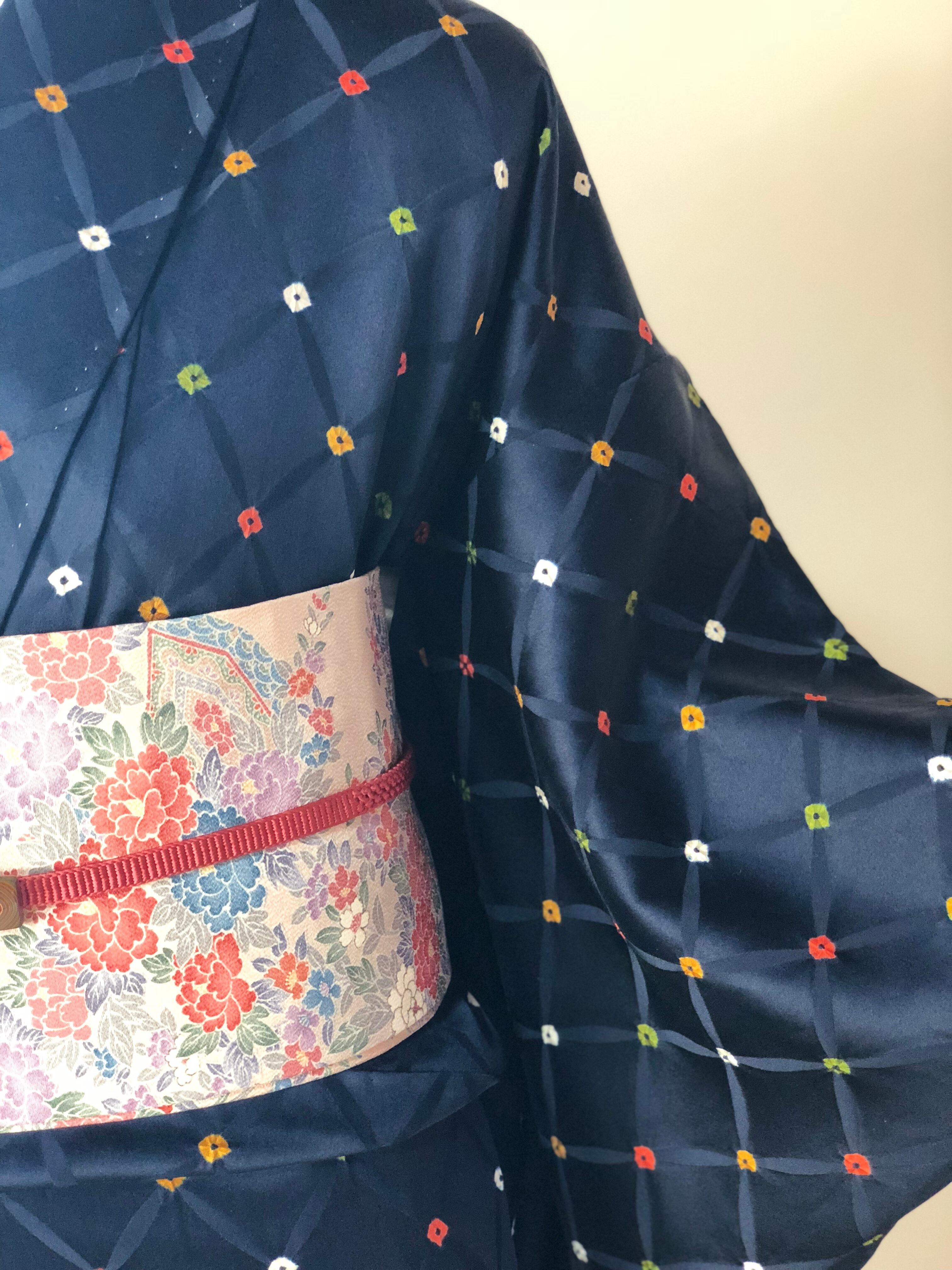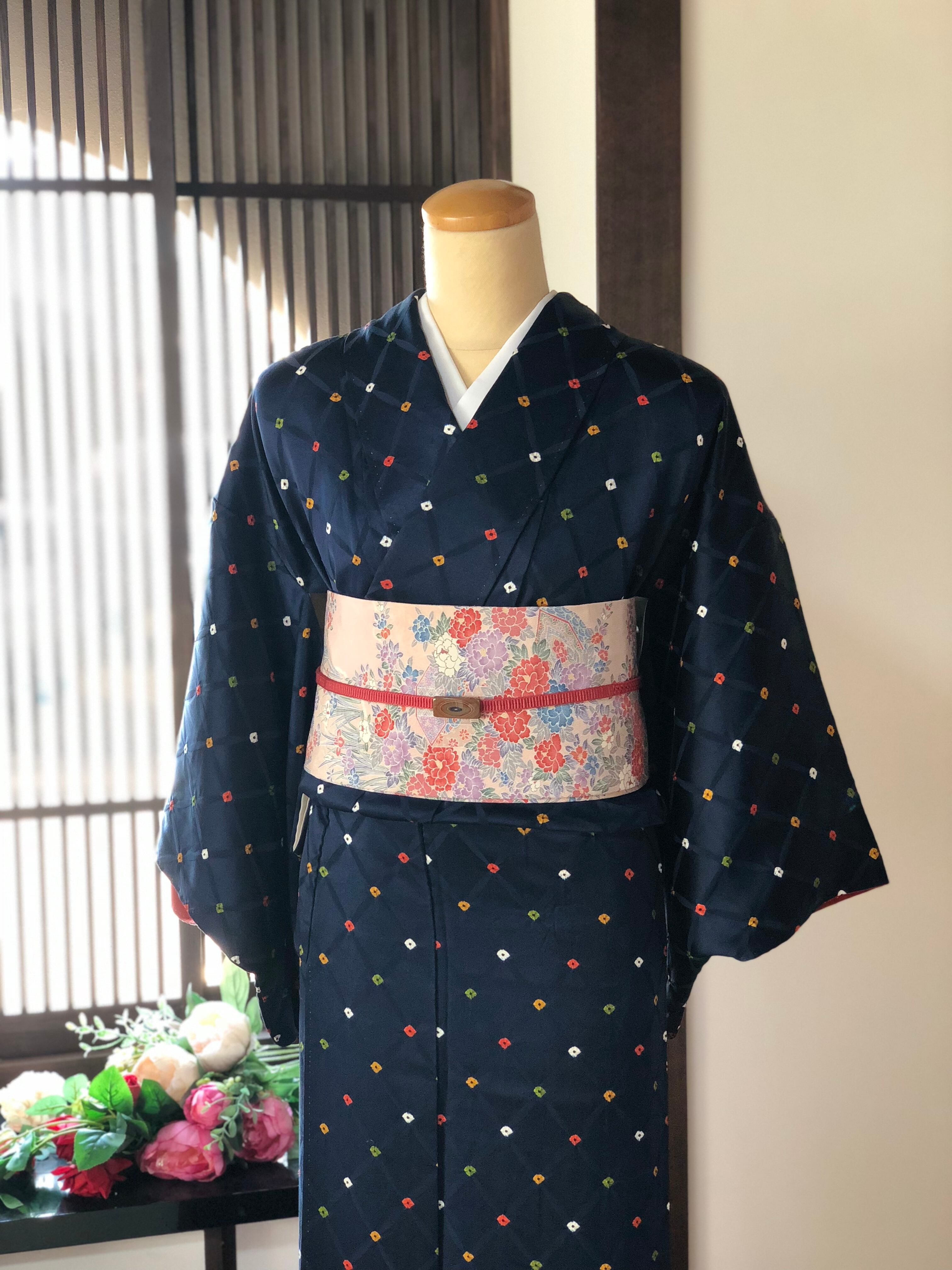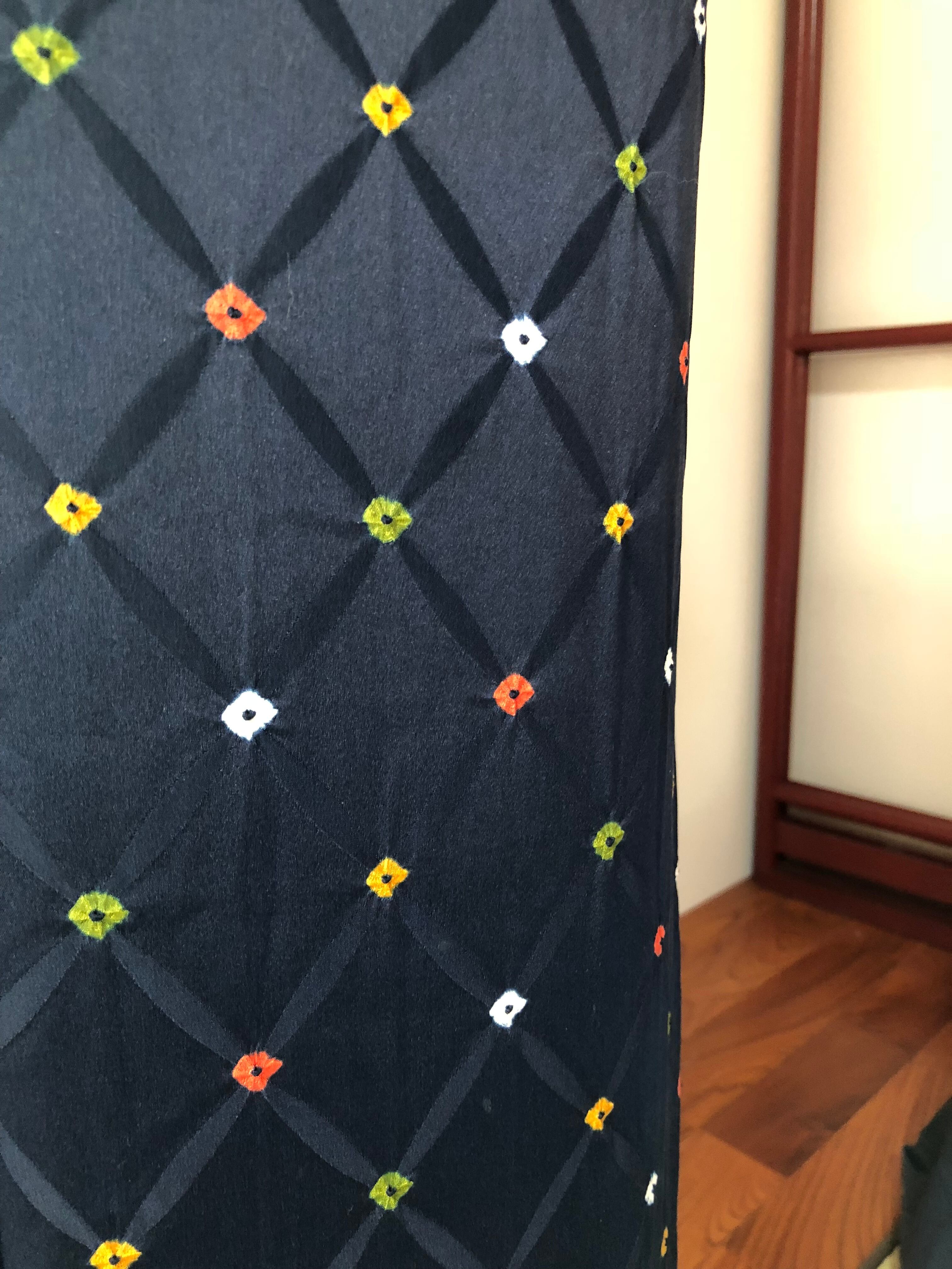 優しい光沢のある濃紺地にカラフルな絞りと格子の柄です♪