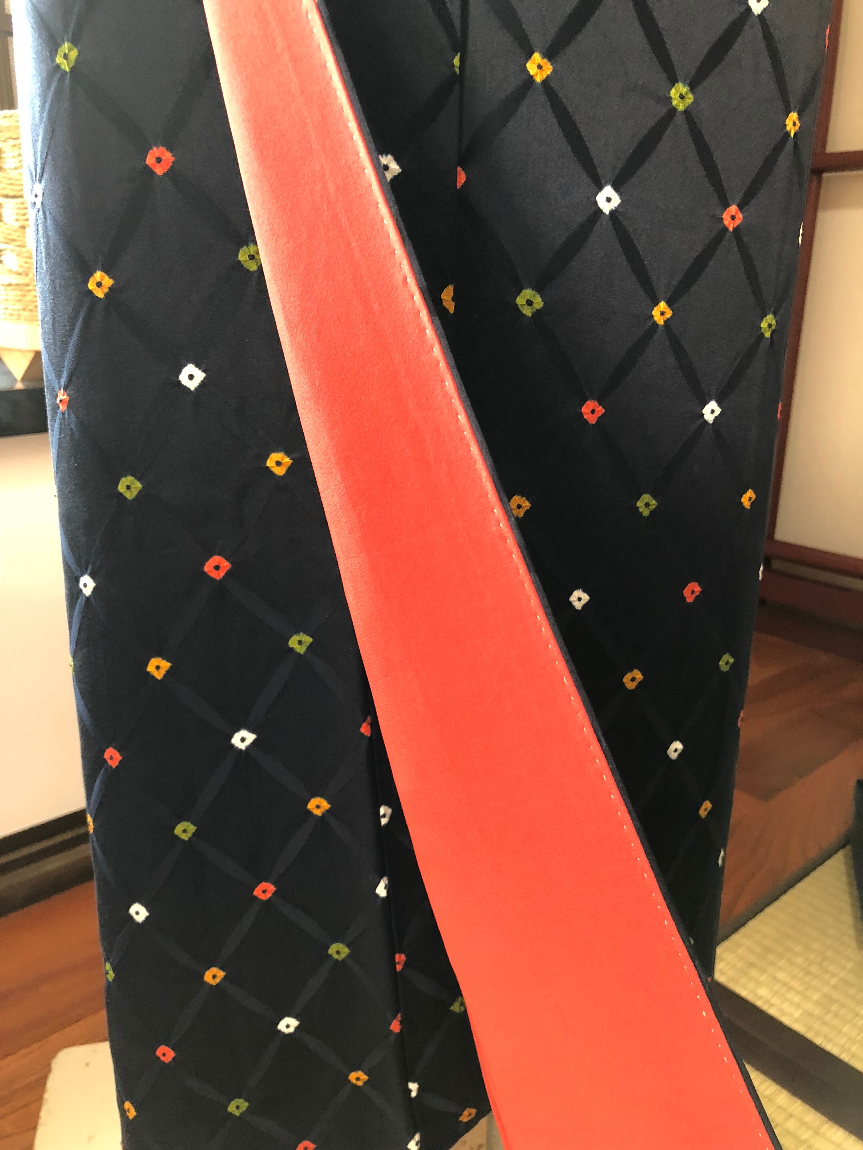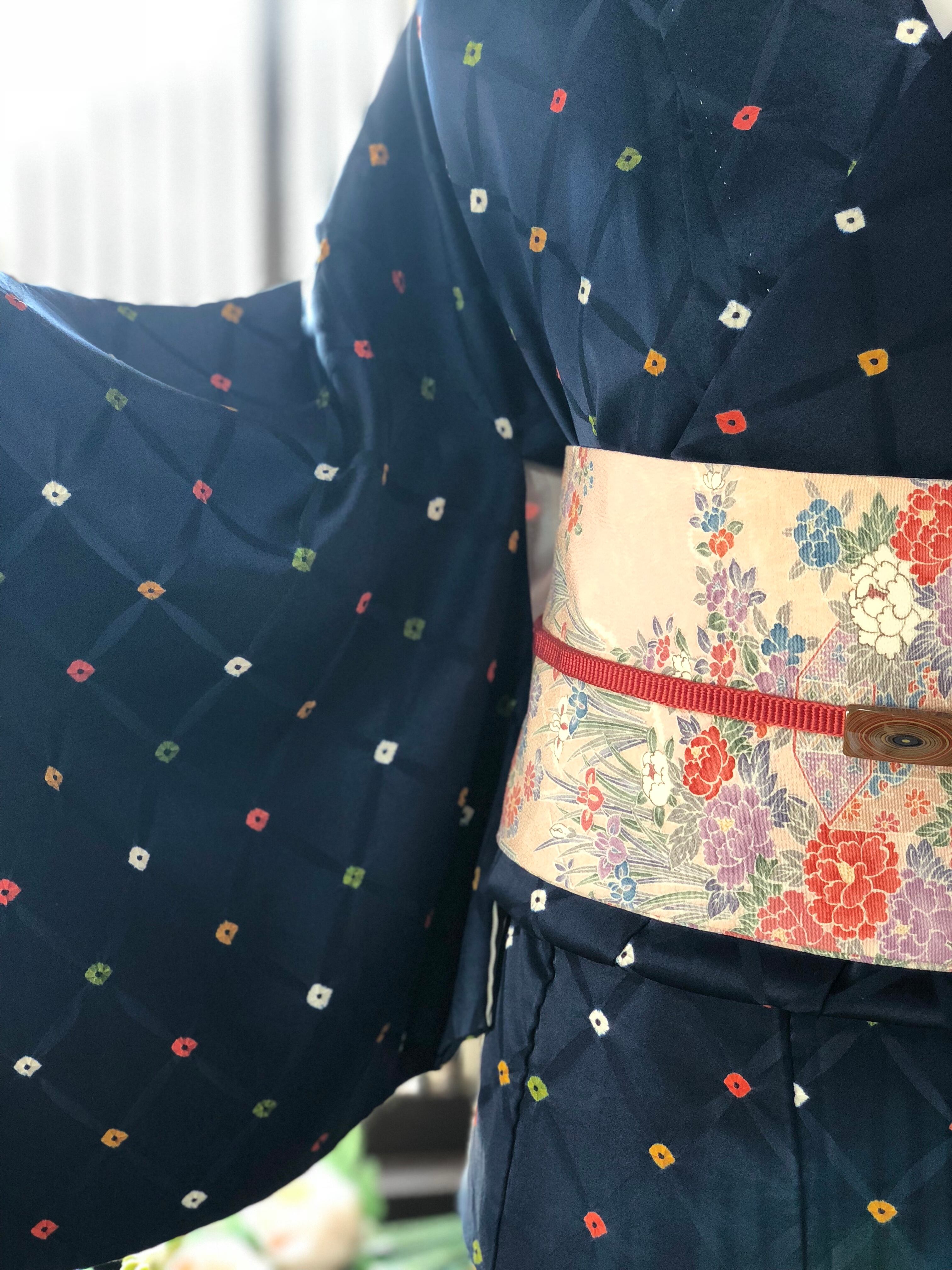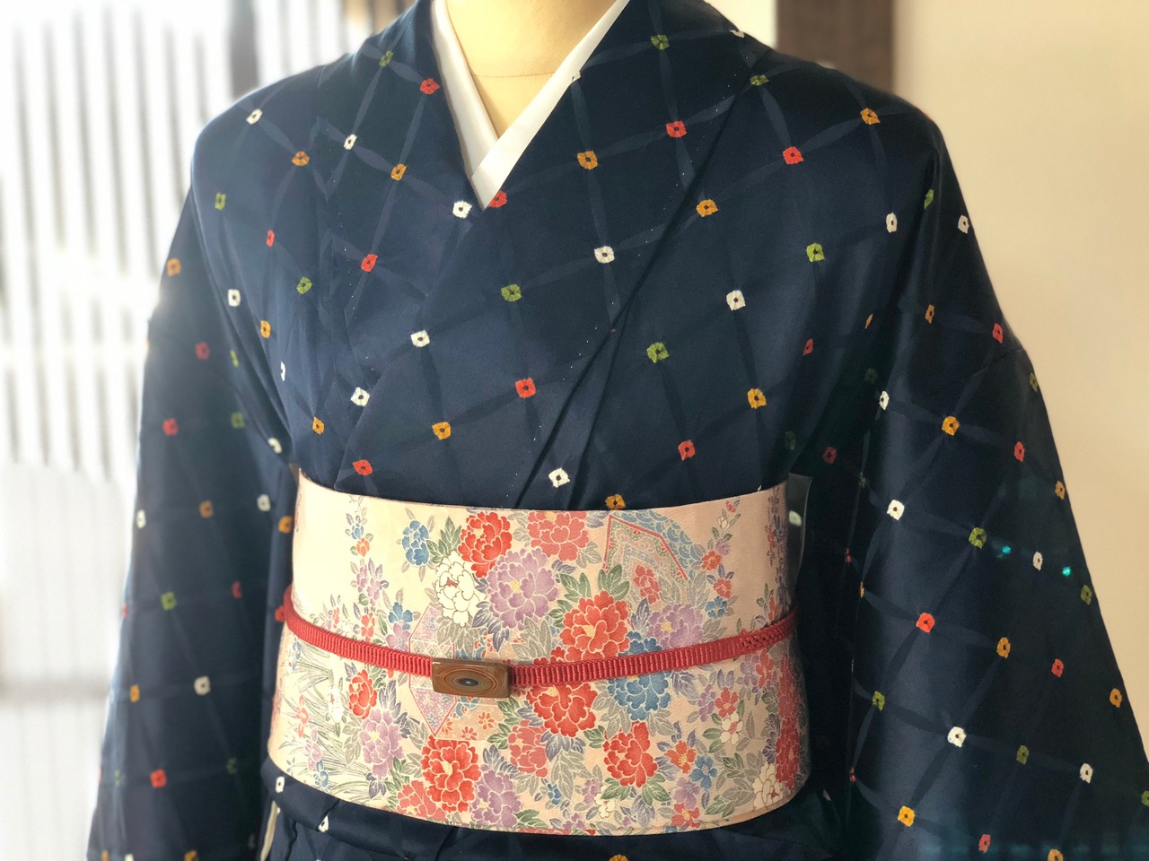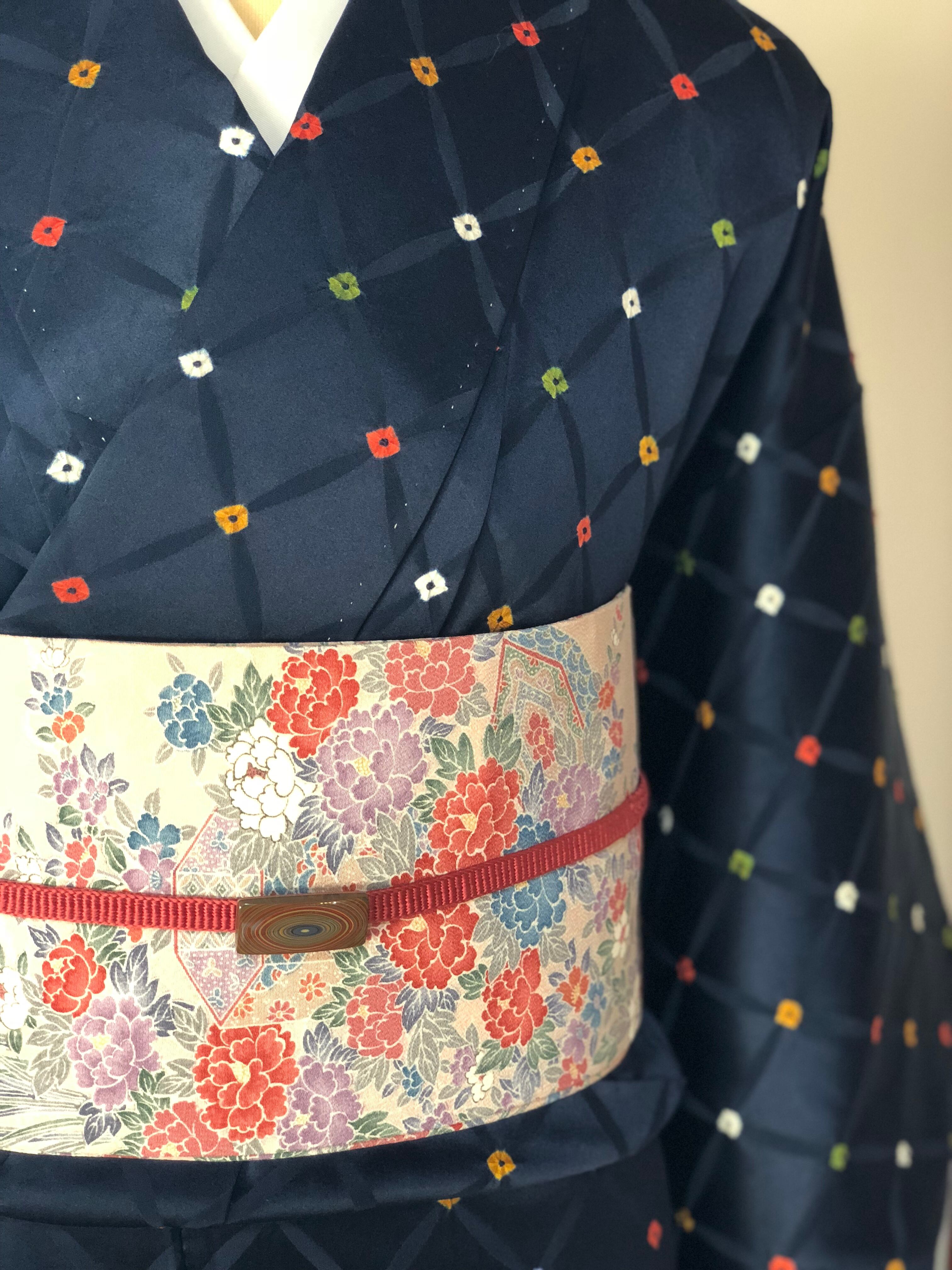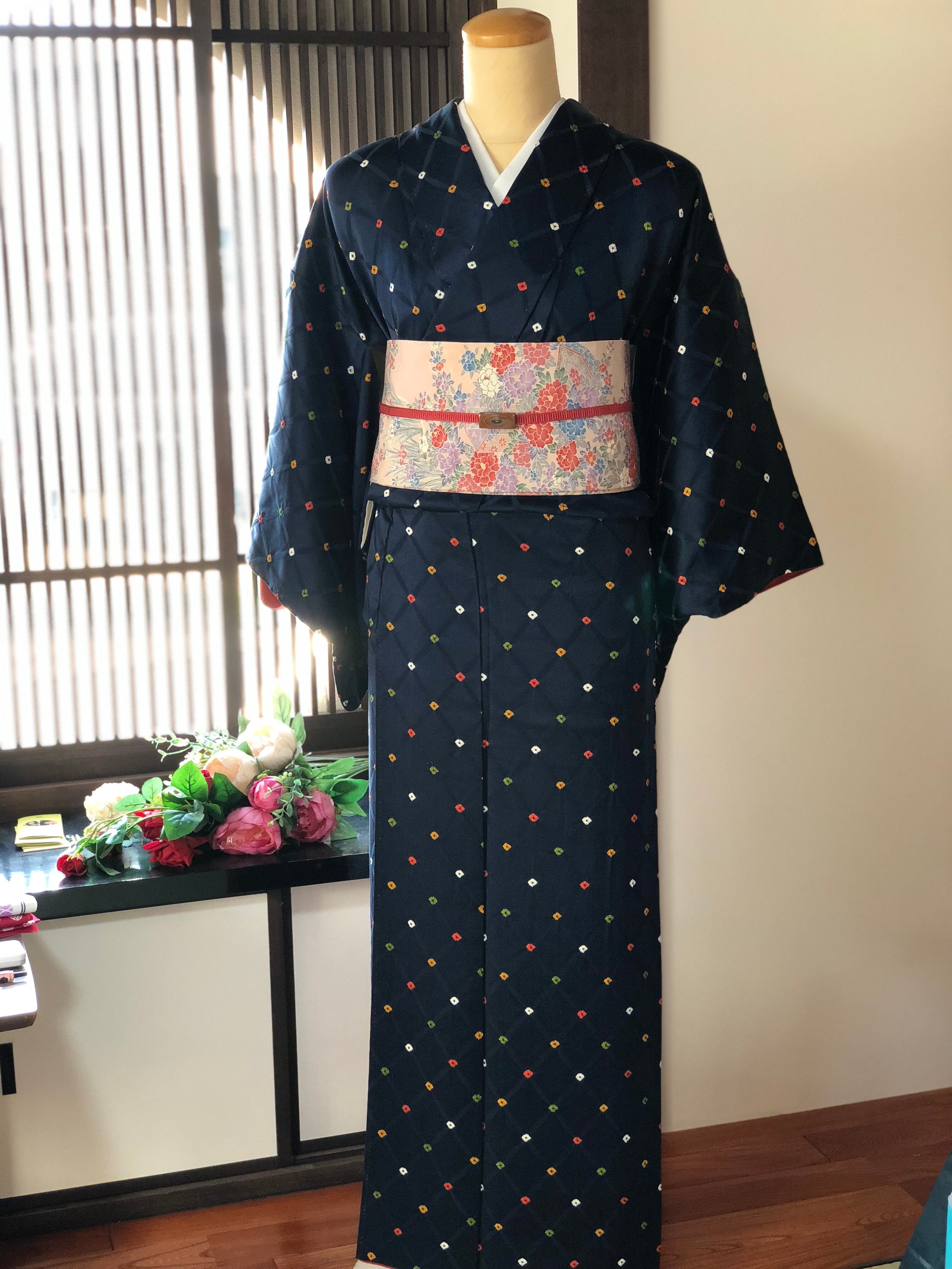 優しい光沢のある濃紺地にカラフルな絞りと格子の柄です♪