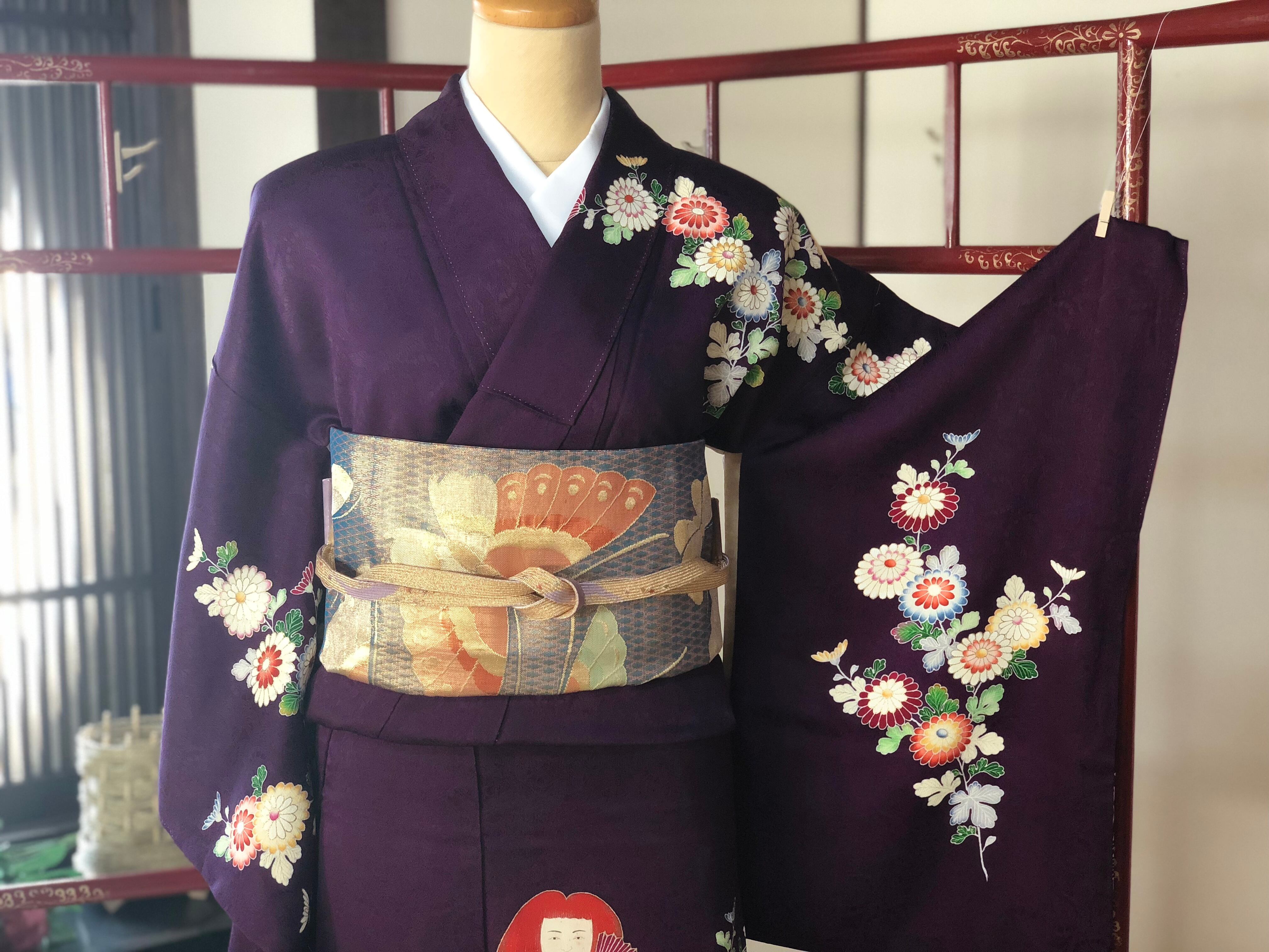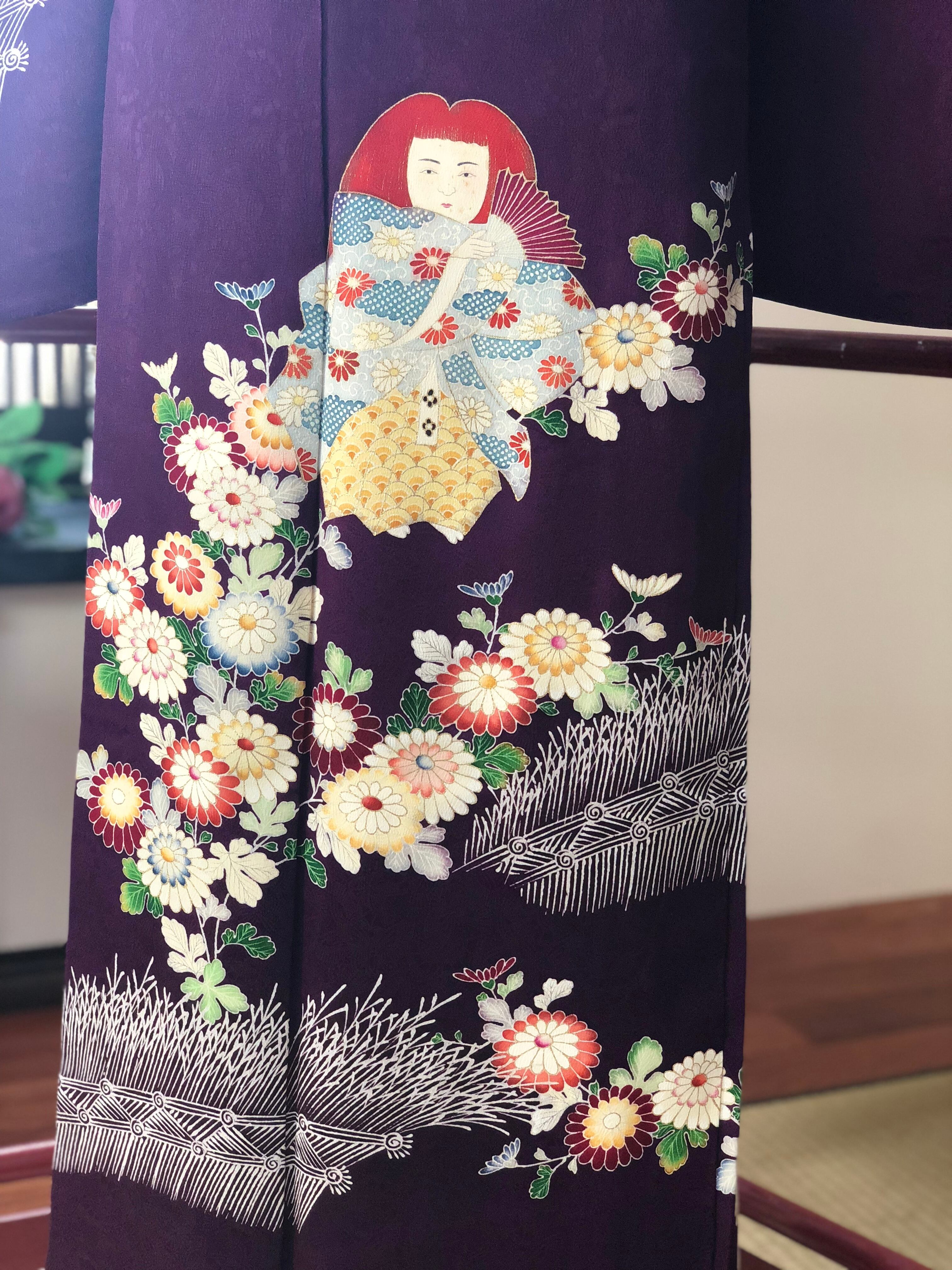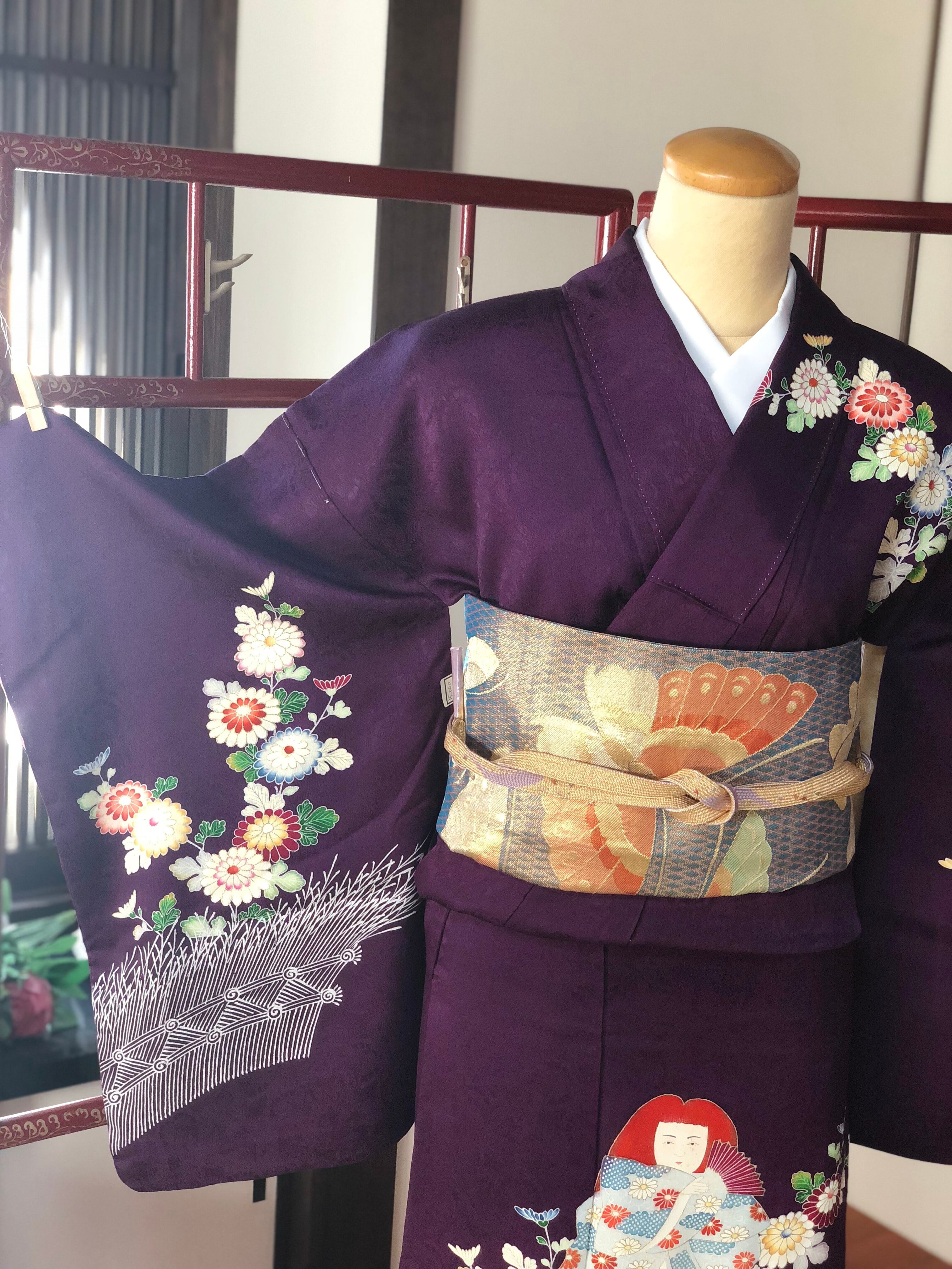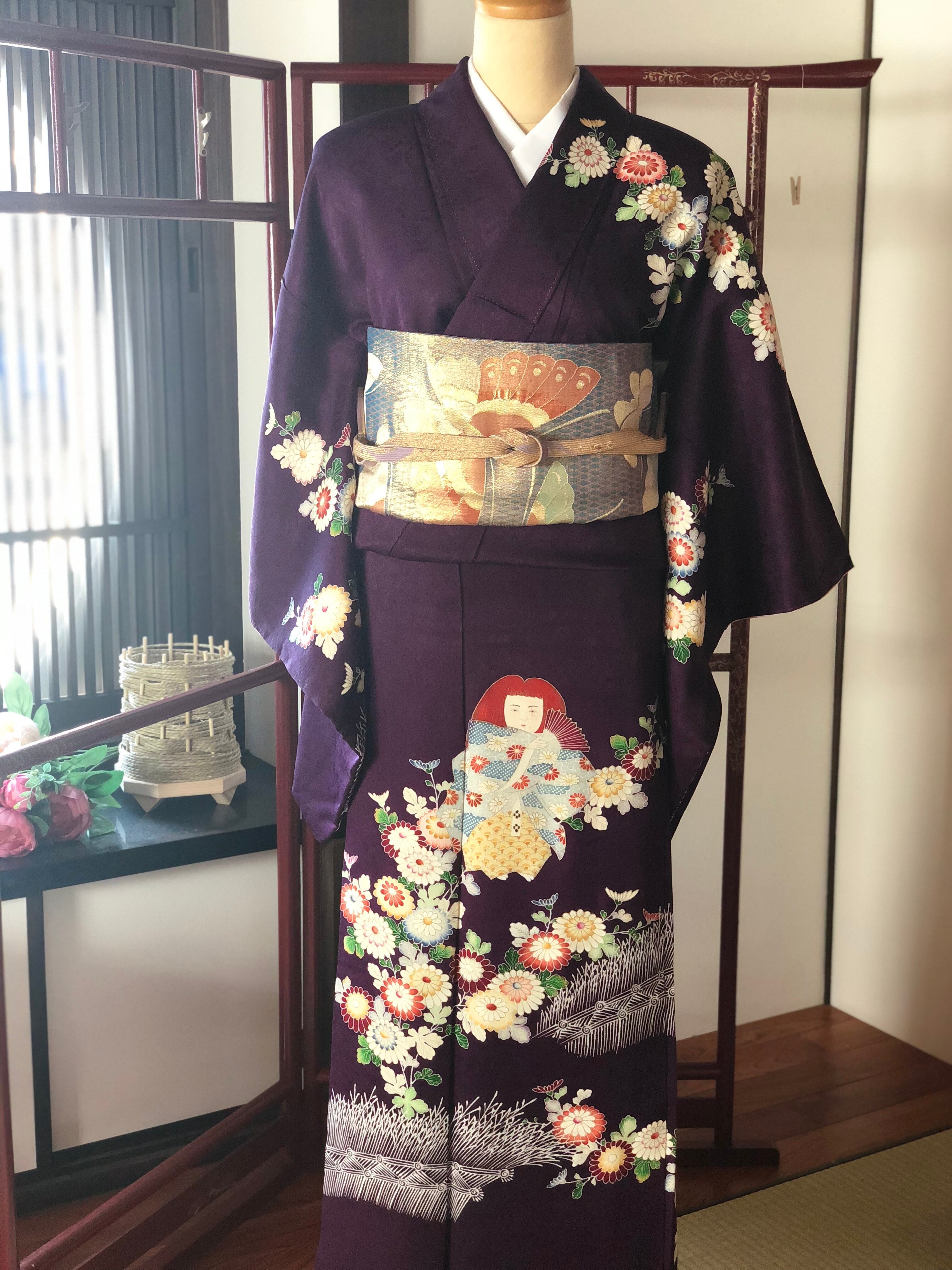 紫地に菊と人形が鮮やかに描かれたセミアンティークの訪問着。