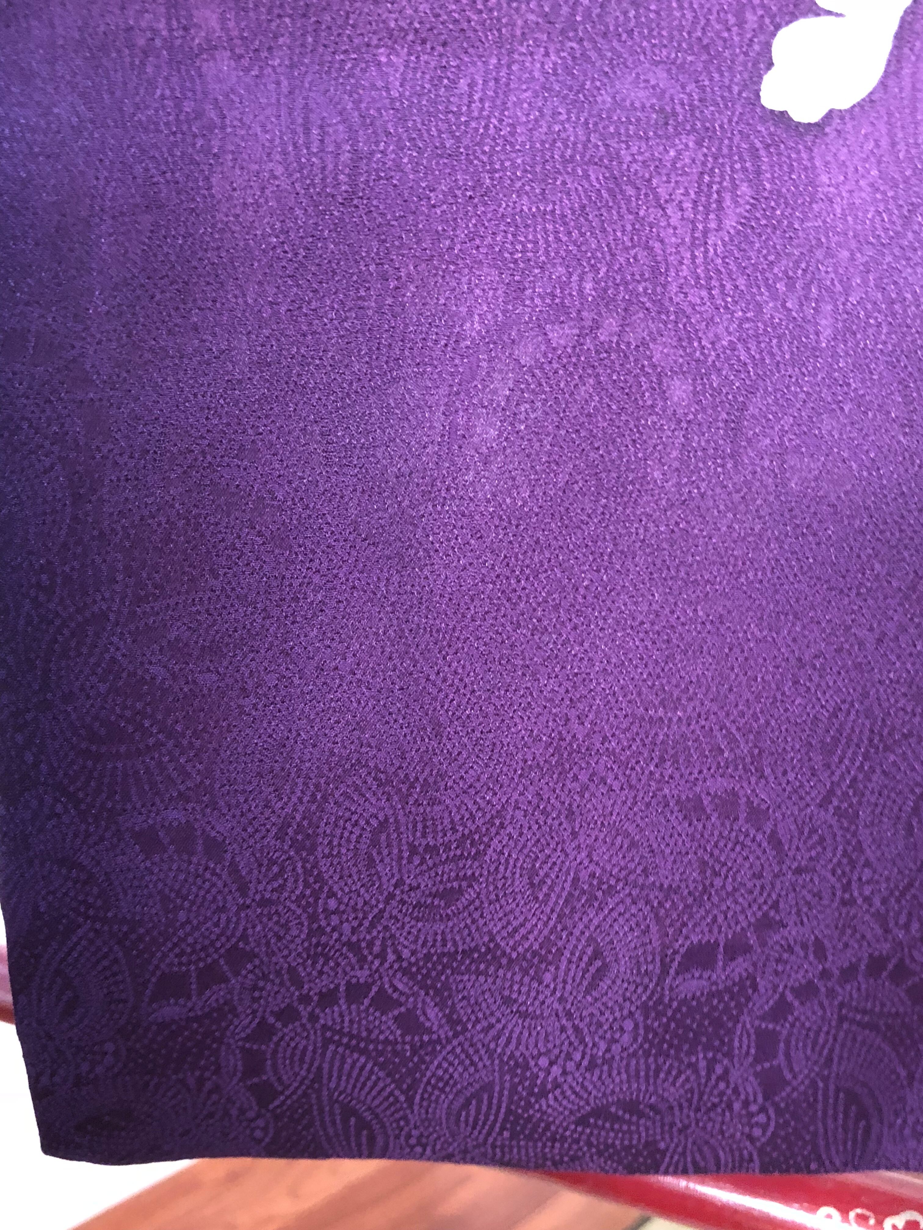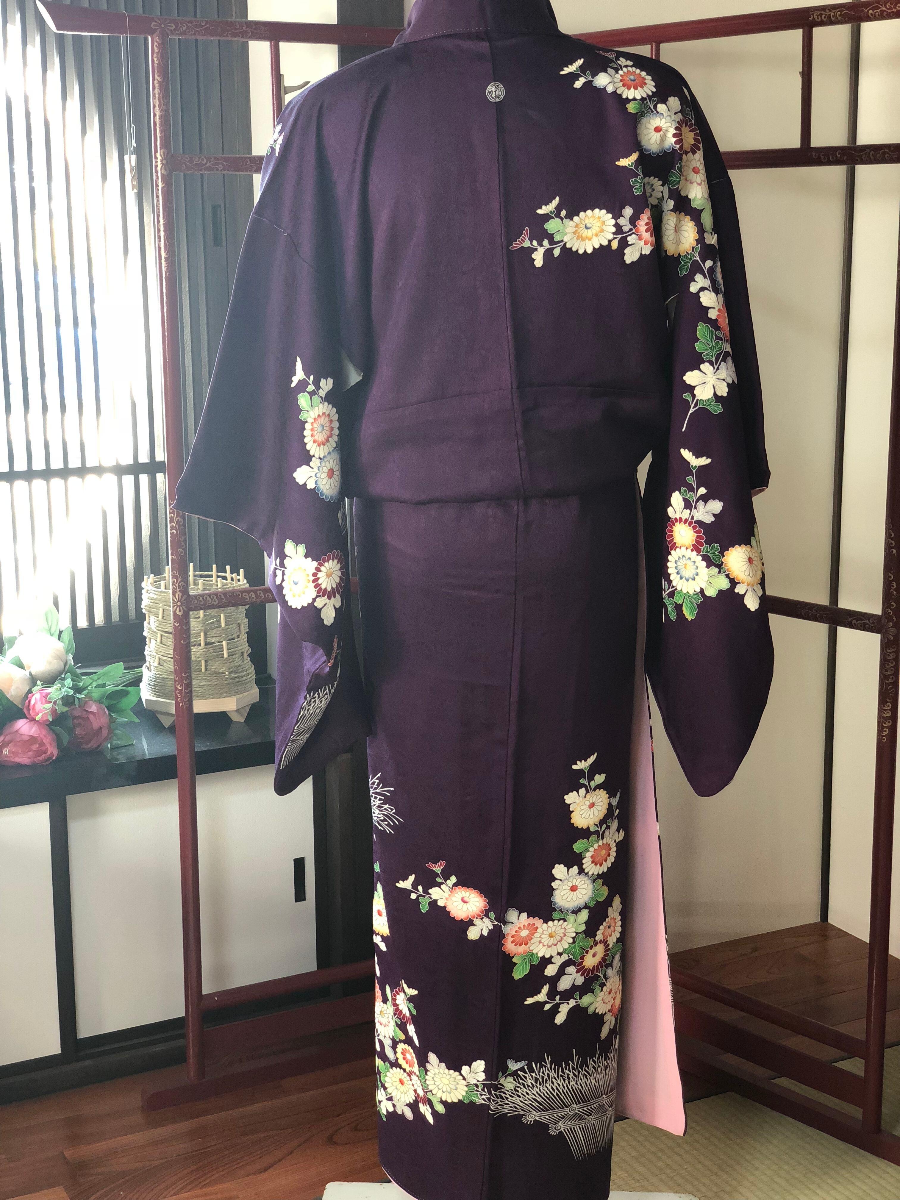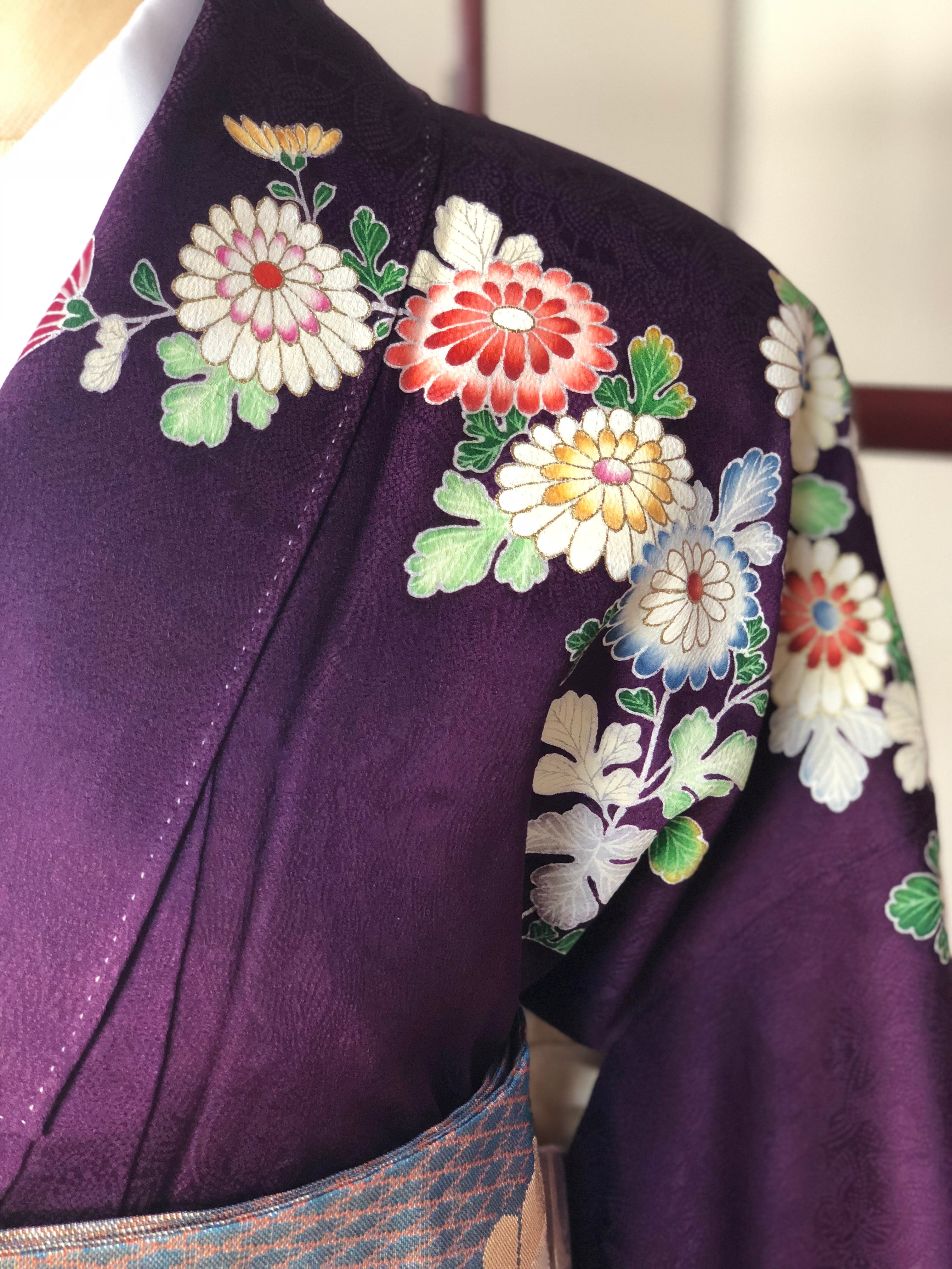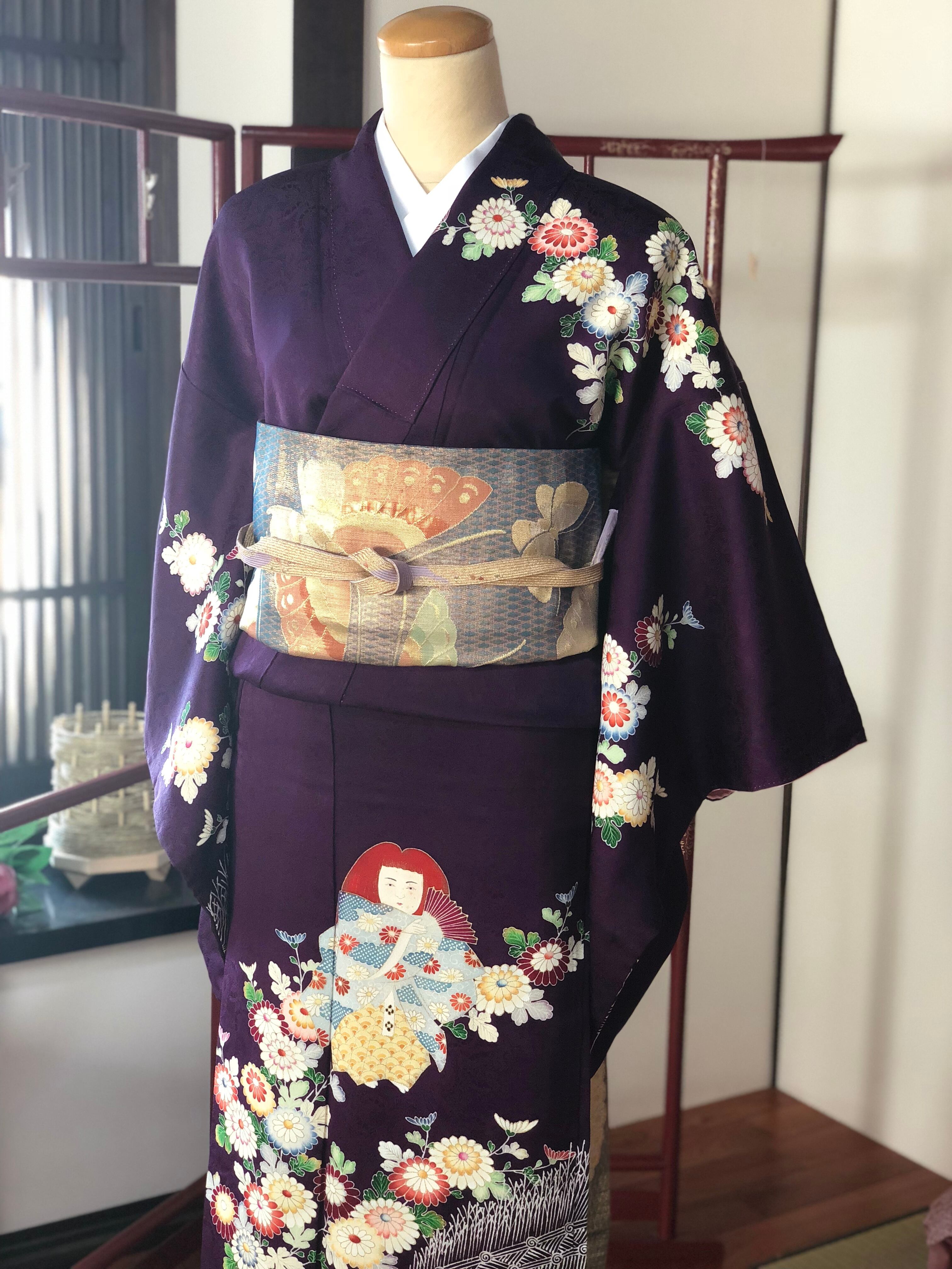 紫地に菊と人形が鮮やかに描かれたセミアンティークの訪問着。