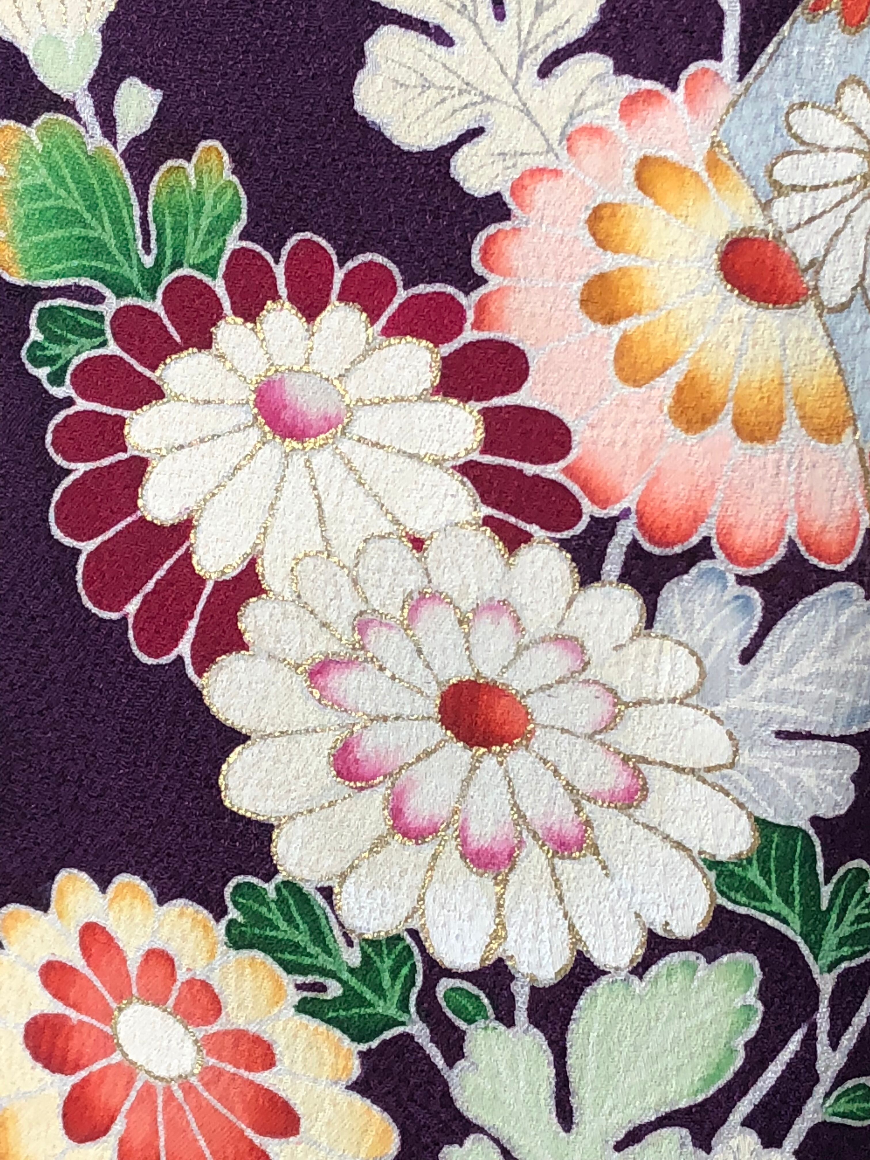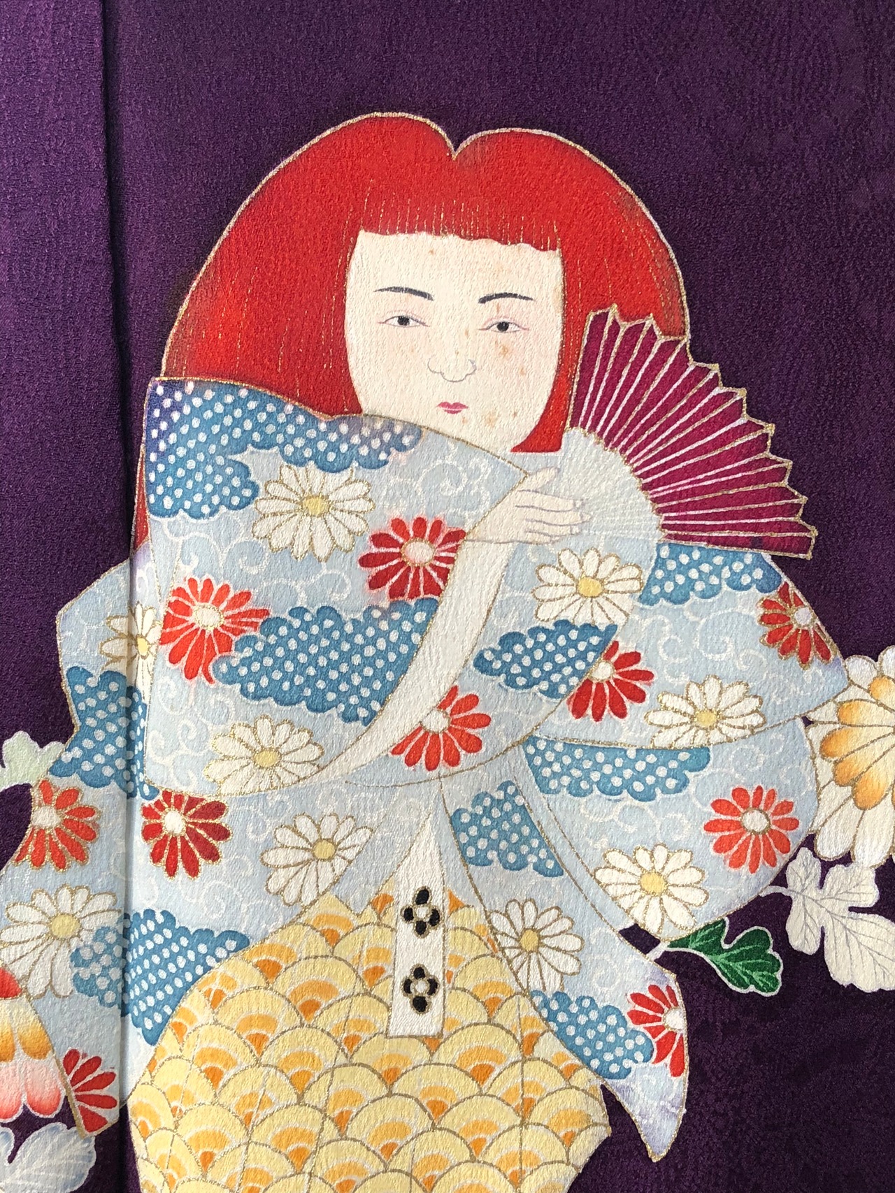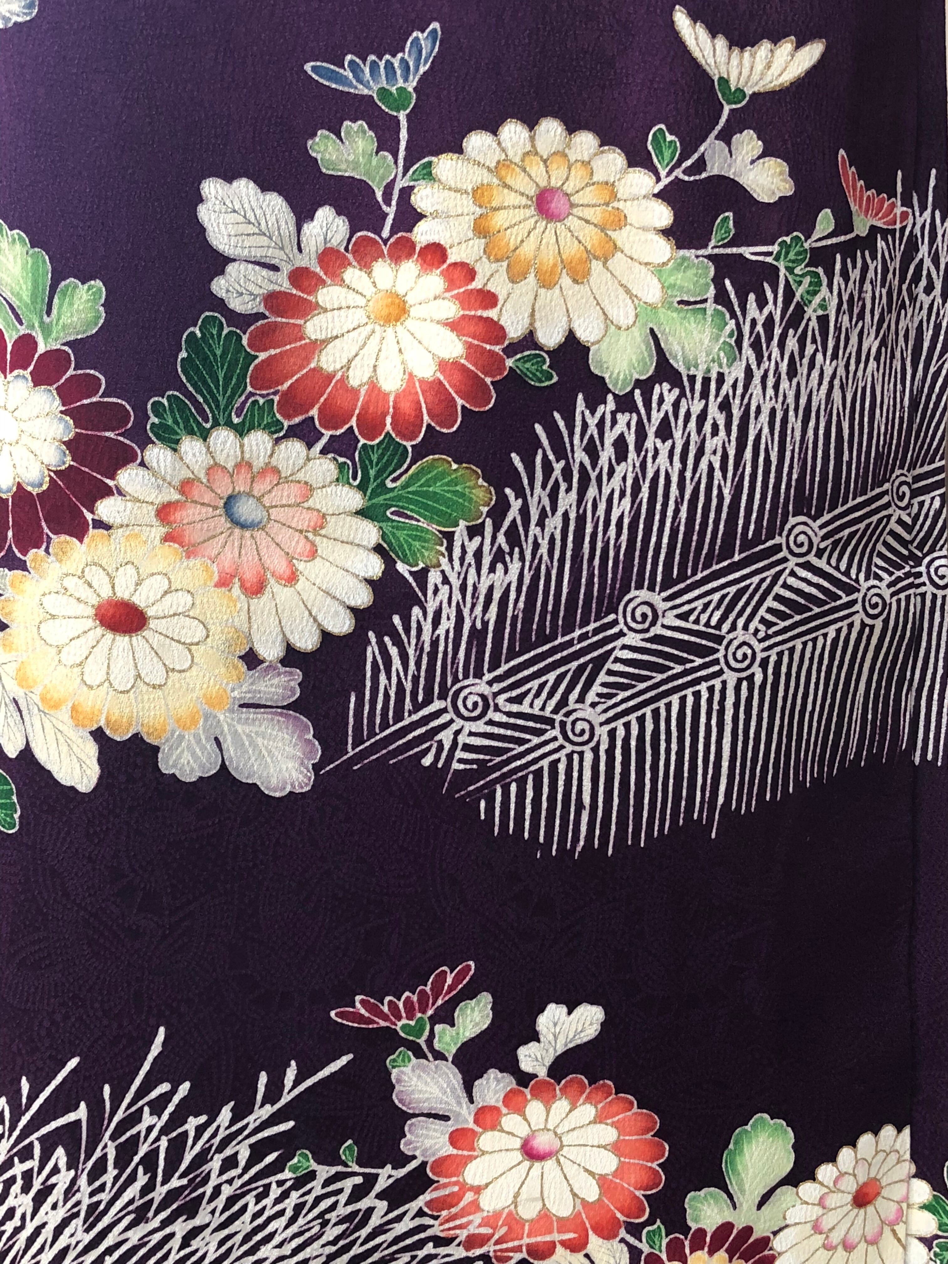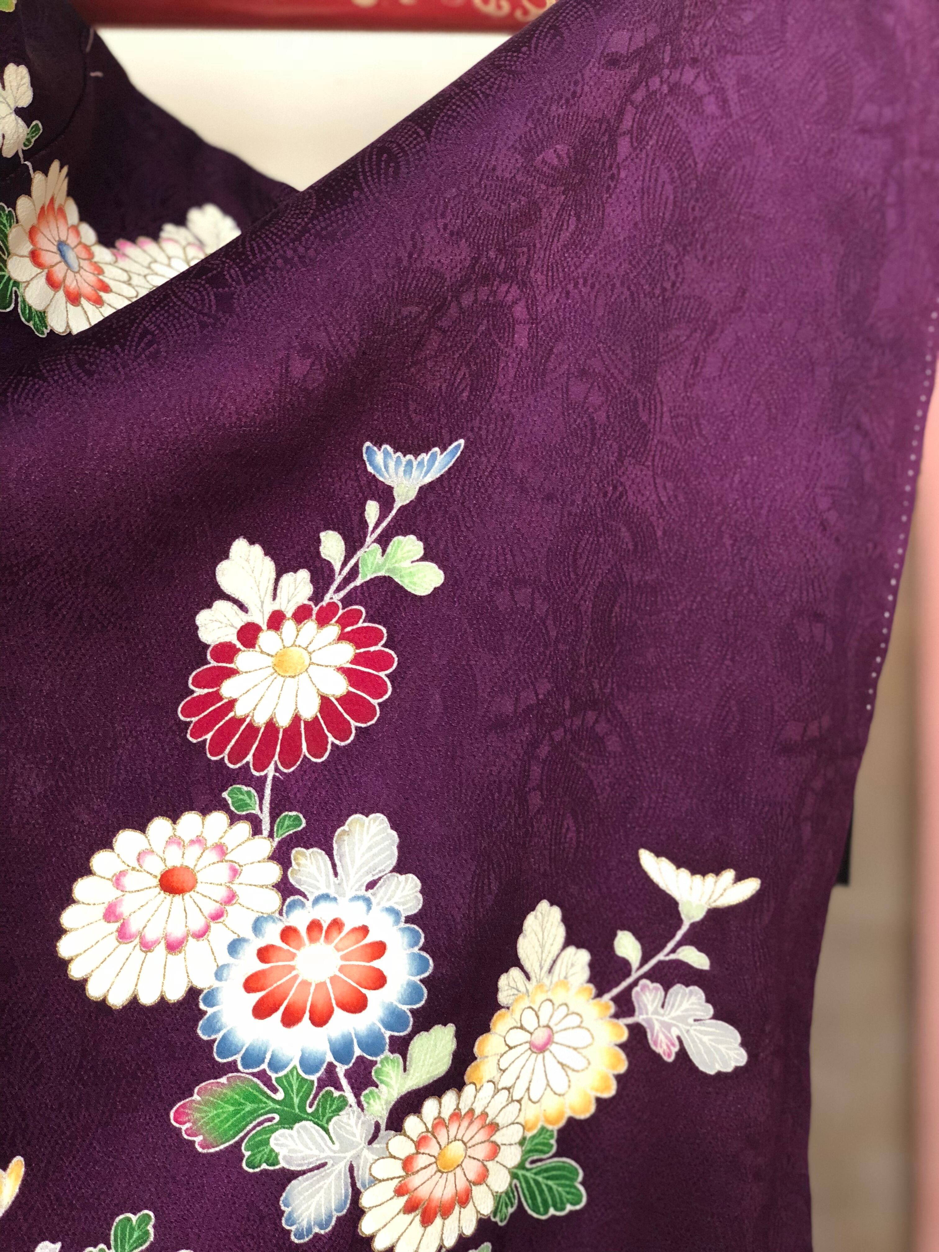 紫地に菊と人形が鮮やかに描かれたセミアンティークの訪問着。