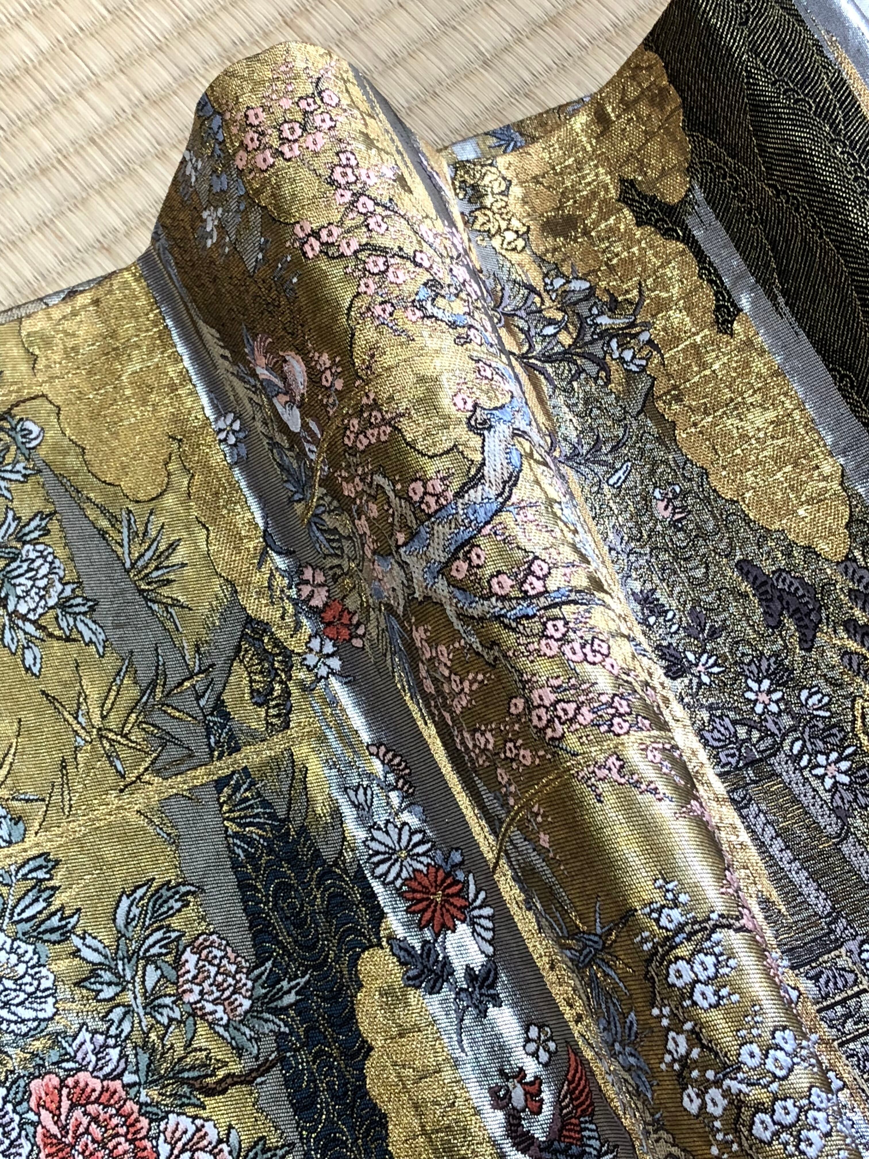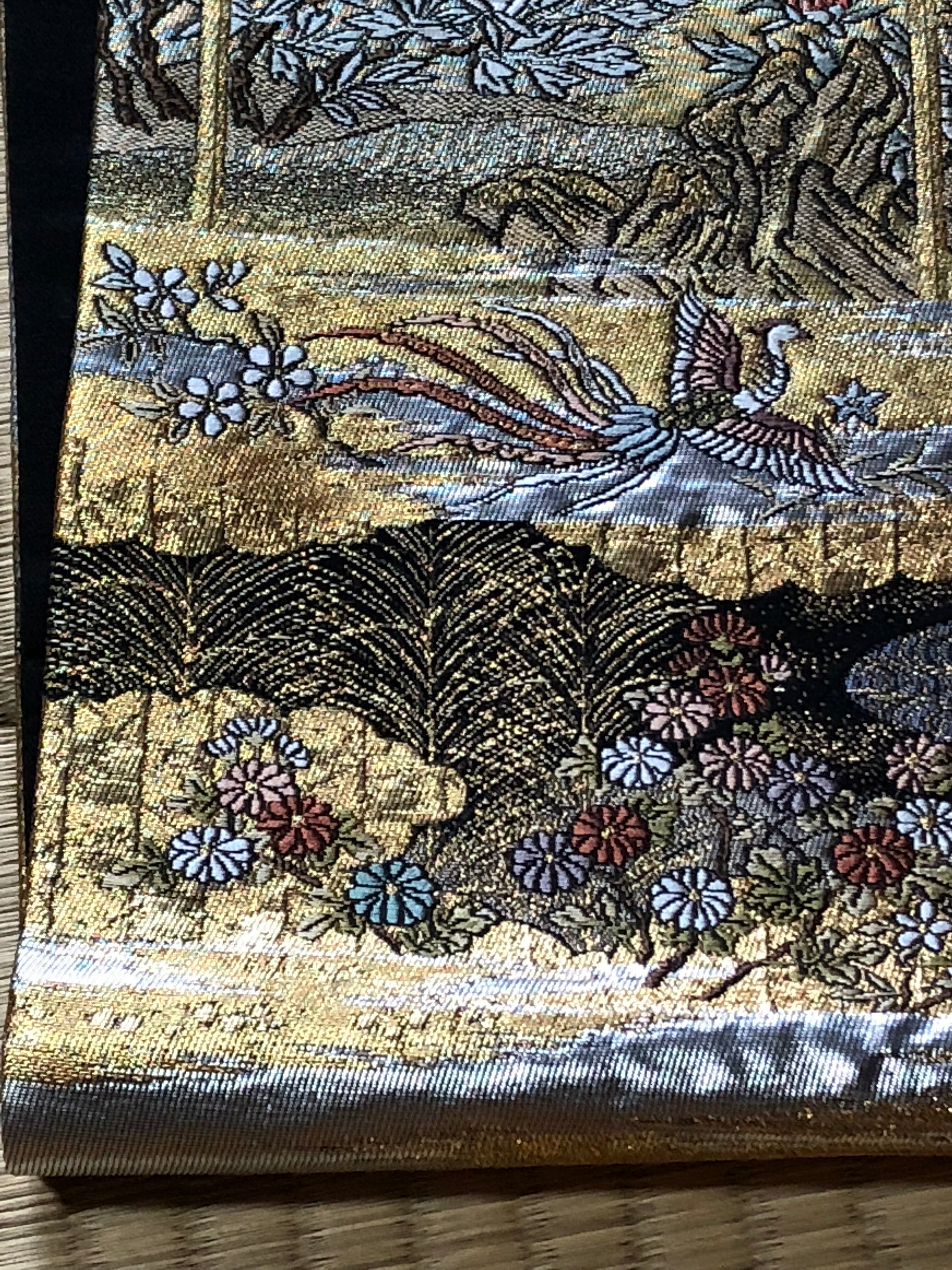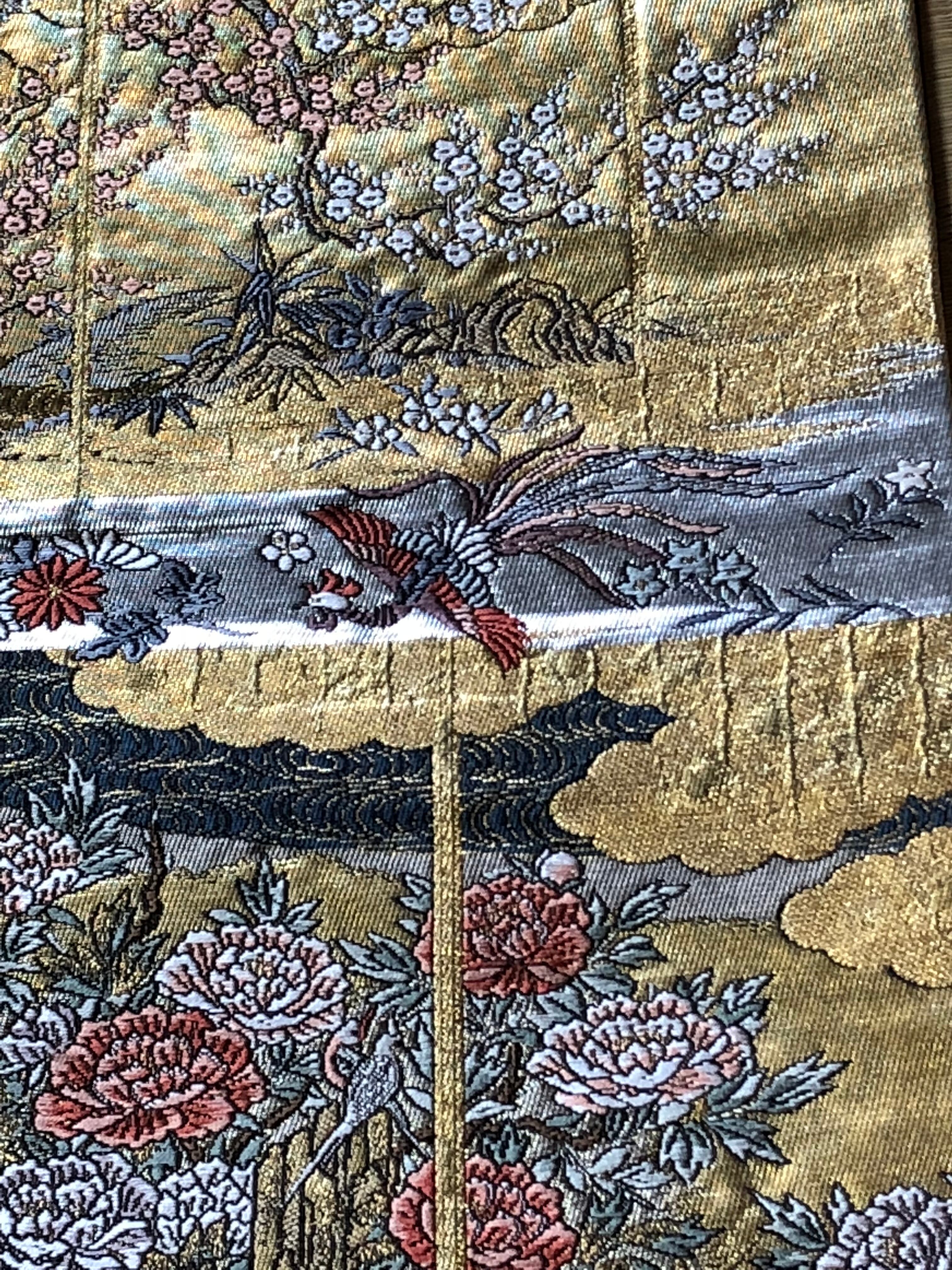 金色をベースにして、牡丹、桜、撫子、百合、菊などの他にも季節の花々が織り出され、鳳凰、鴛鴦、松のような吉祥文様も風景の中に溶け込んでいます。