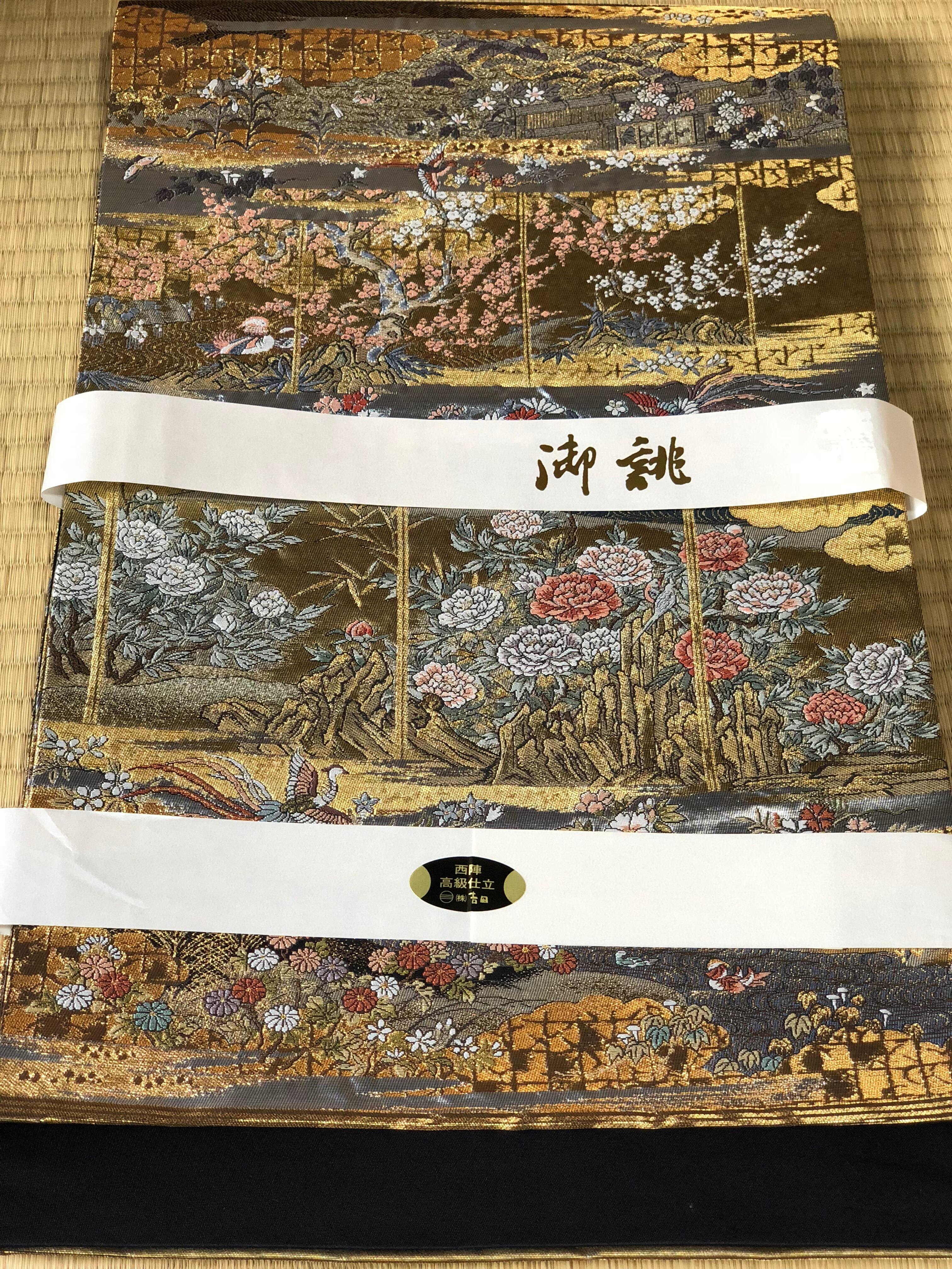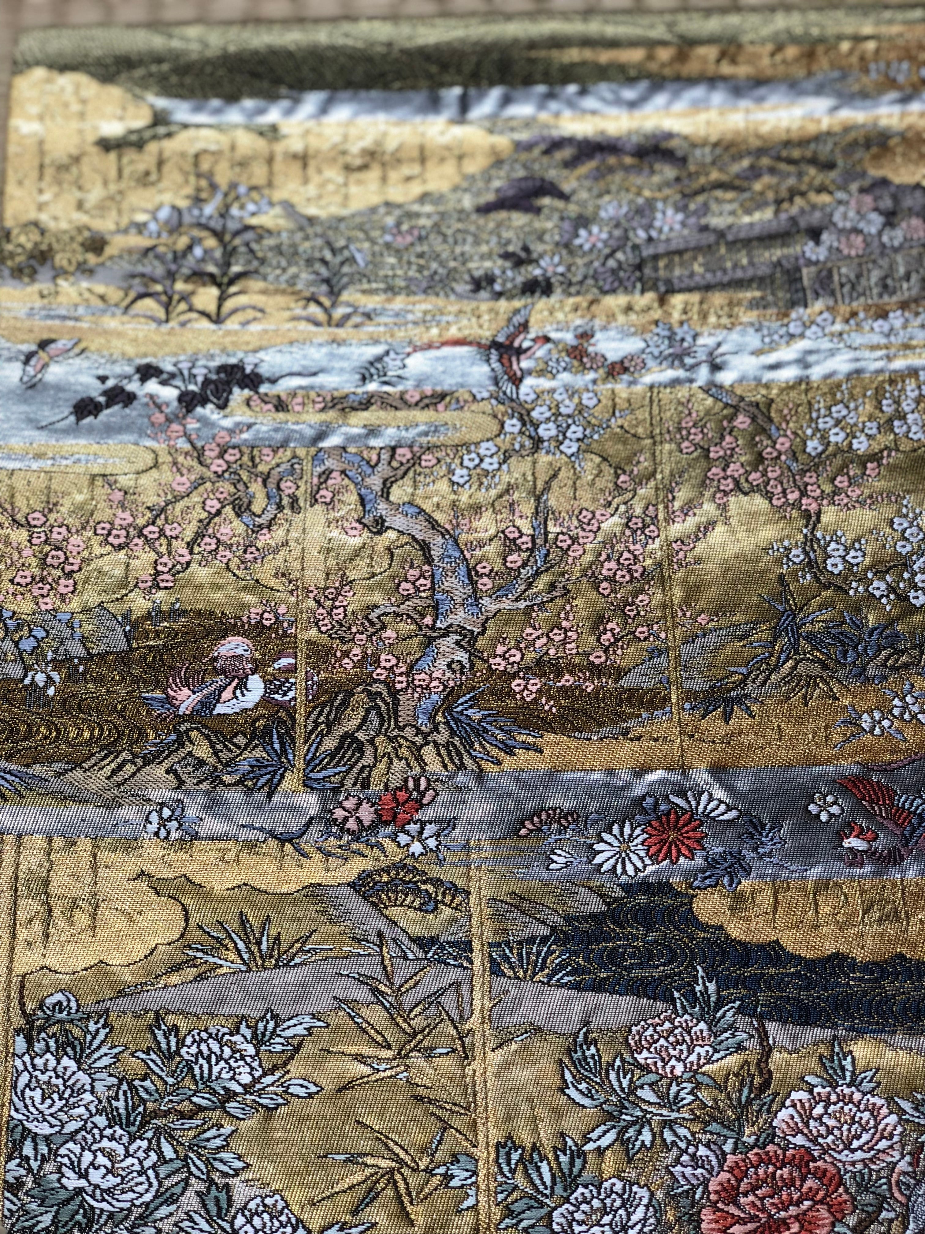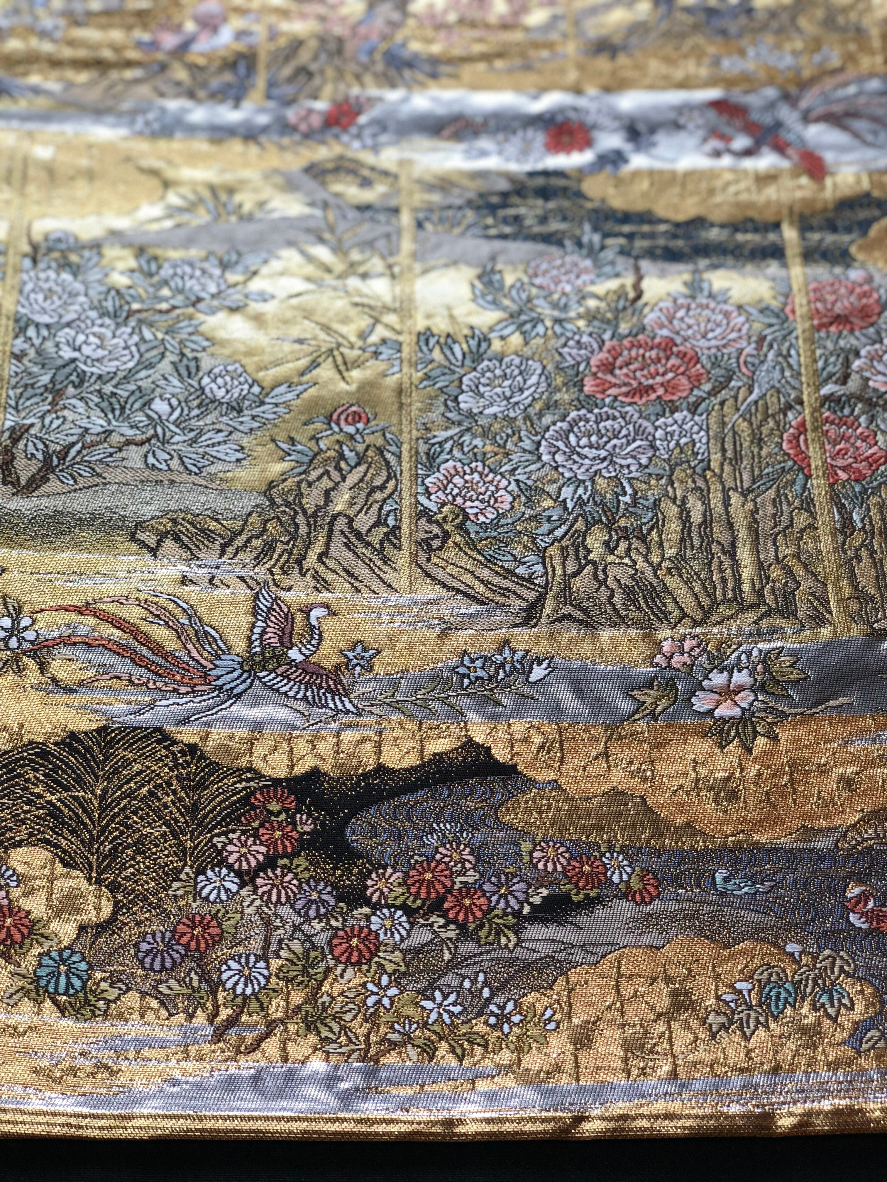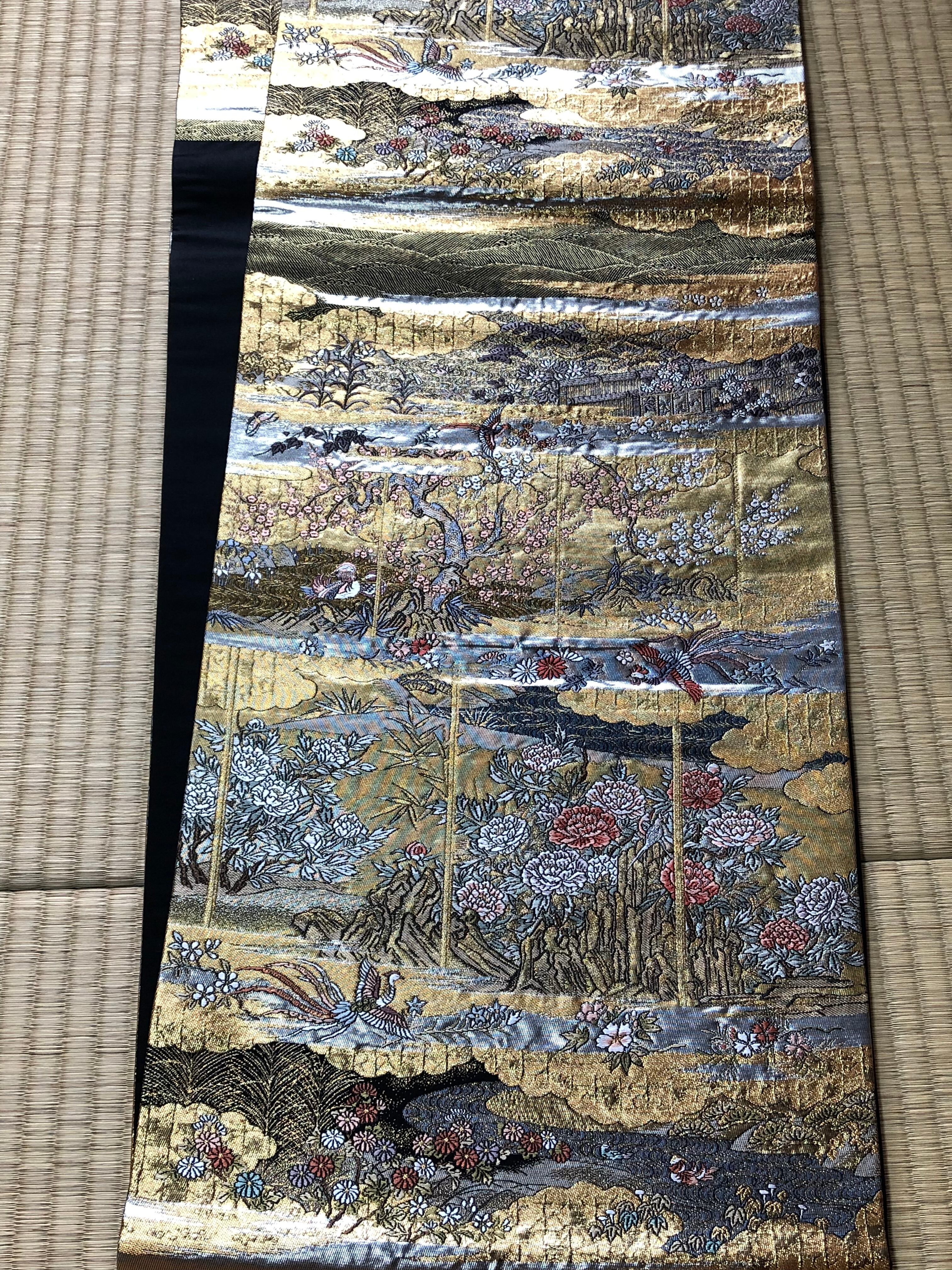 金色をベースにして、牡丹、桜、撫子、百合、菊などの他にも季節の花々が織り出され、鳳凰、鴛鴦、松のような吉祥文様も風景の中に溶け込んでいます。