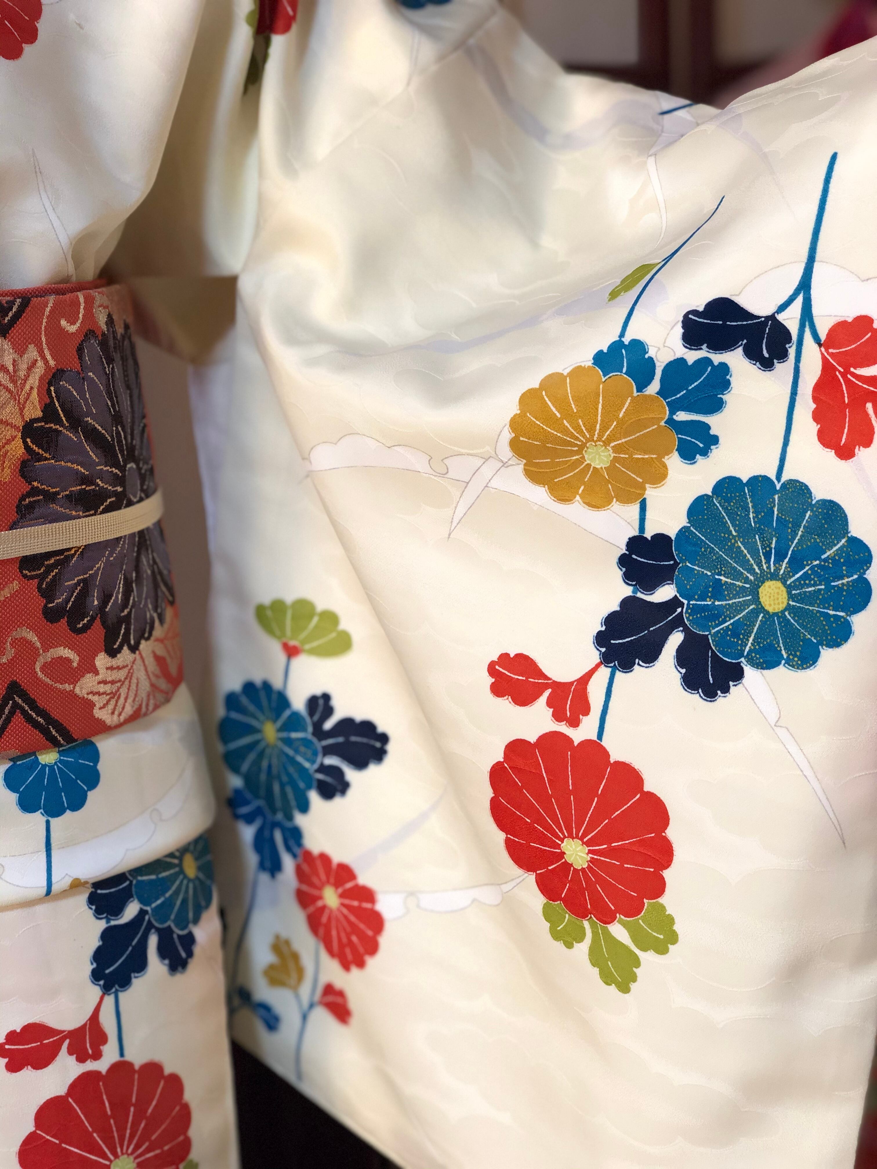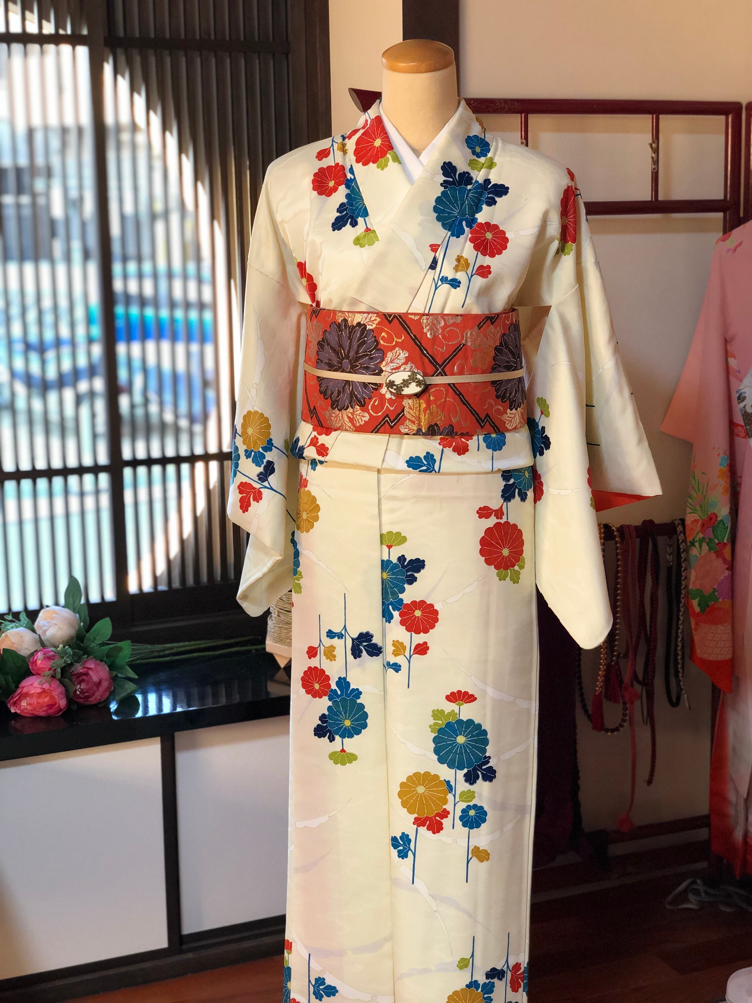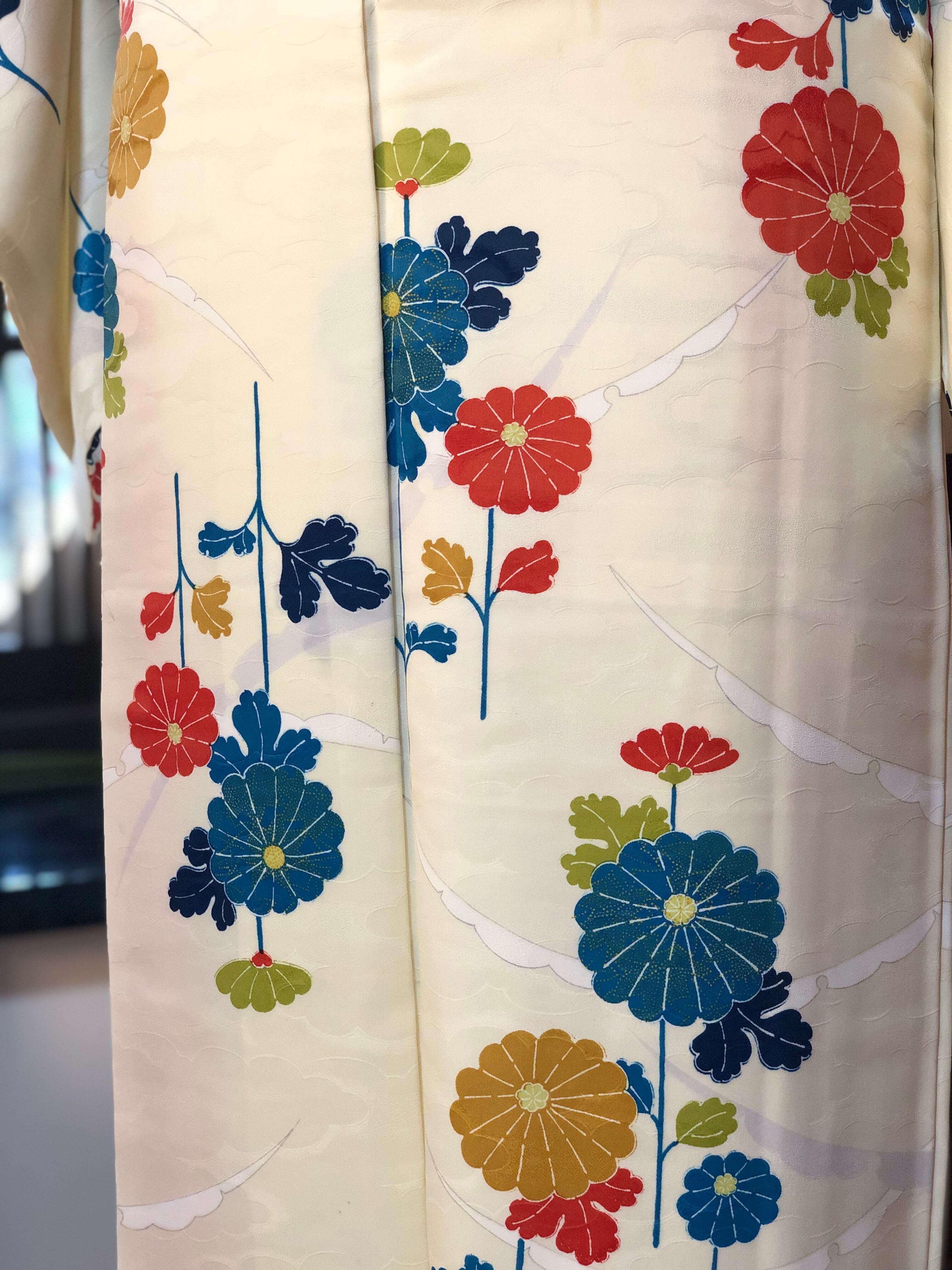 白に近いクリーム色の地に雪輪とカラフルな菊が描かれた小紋。