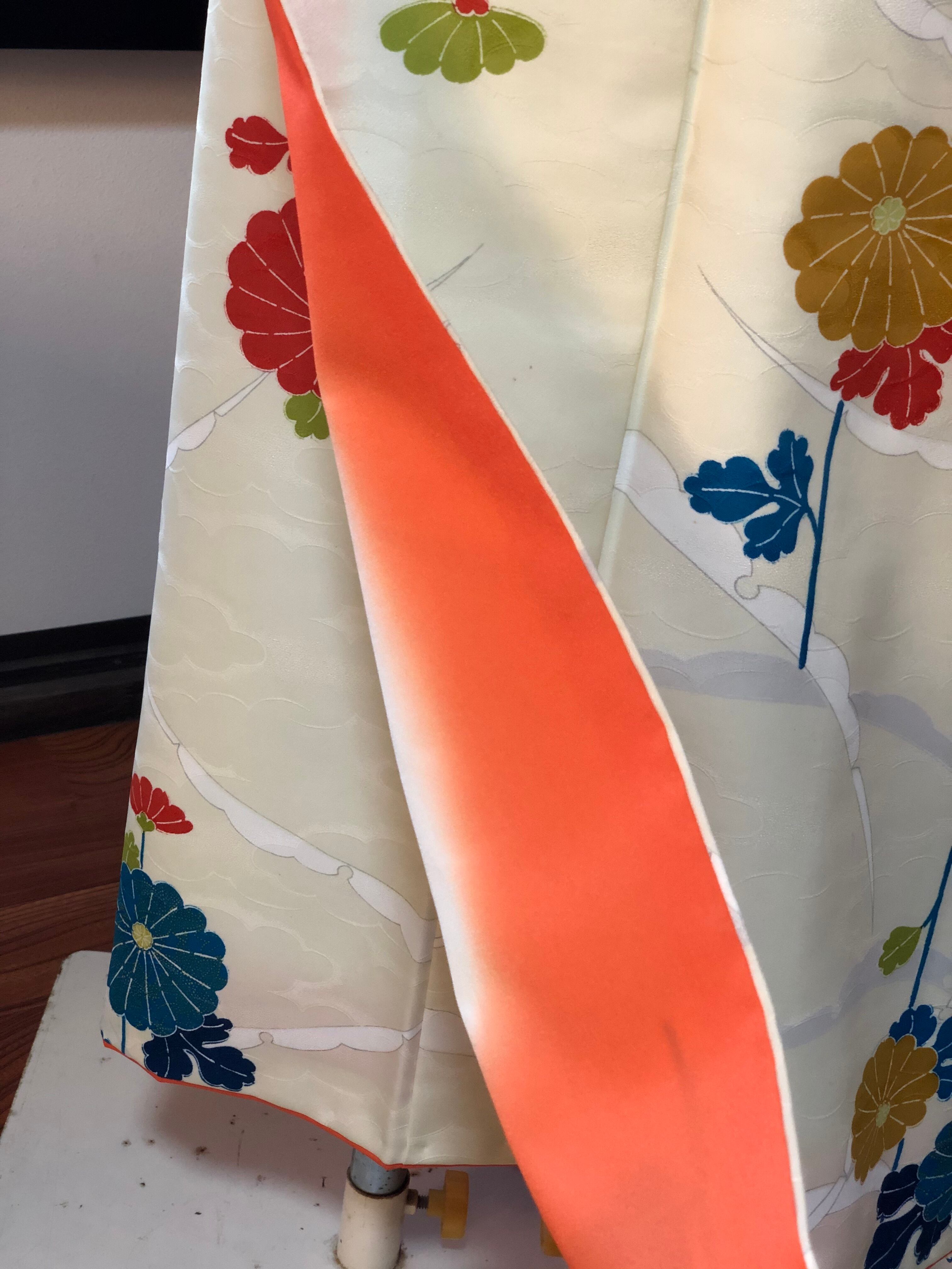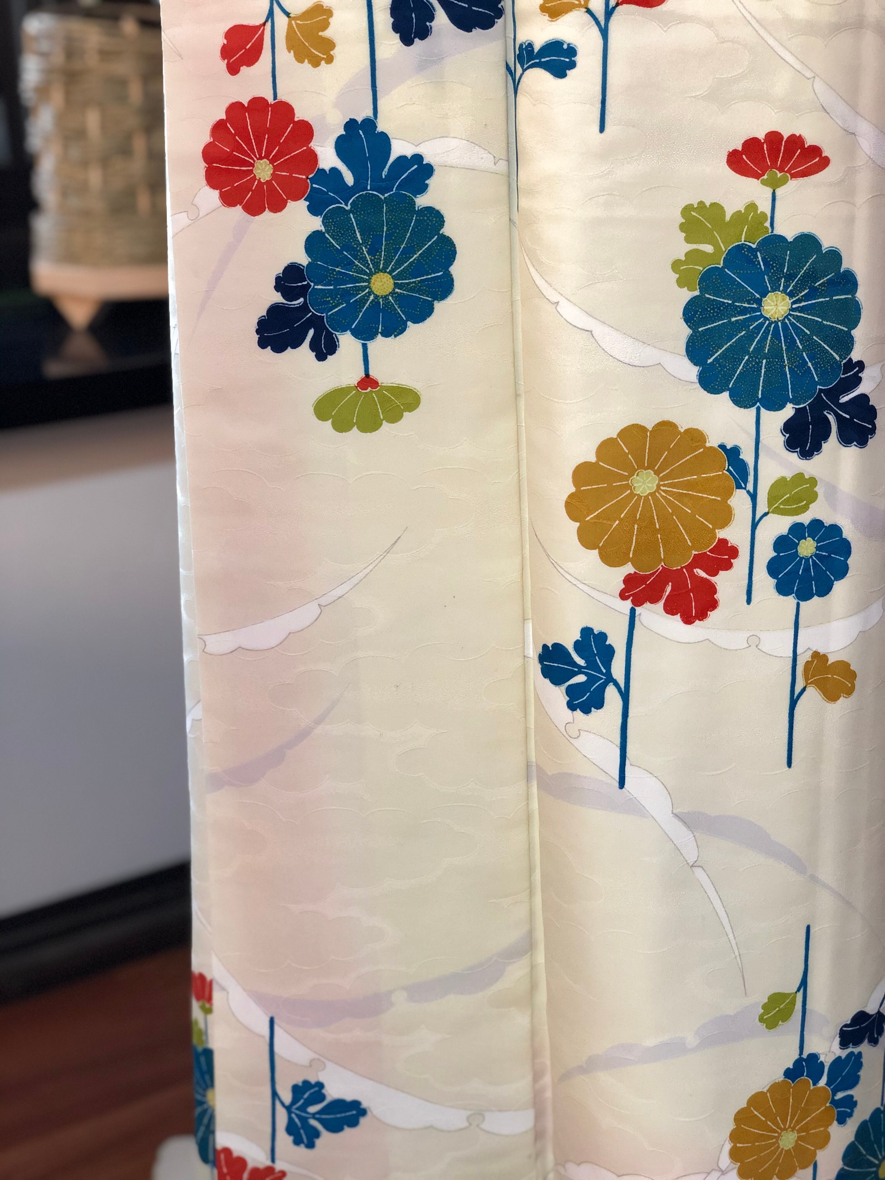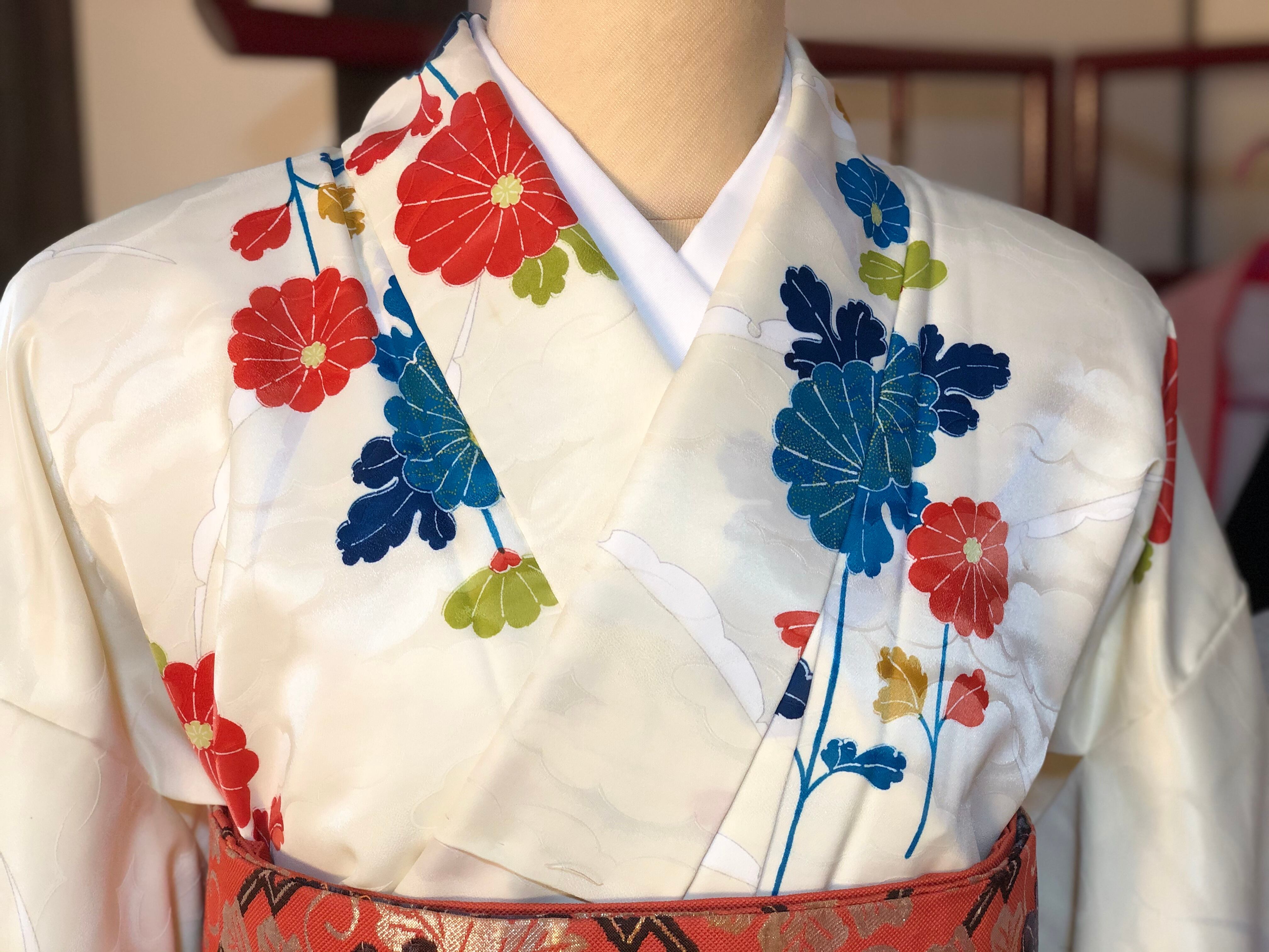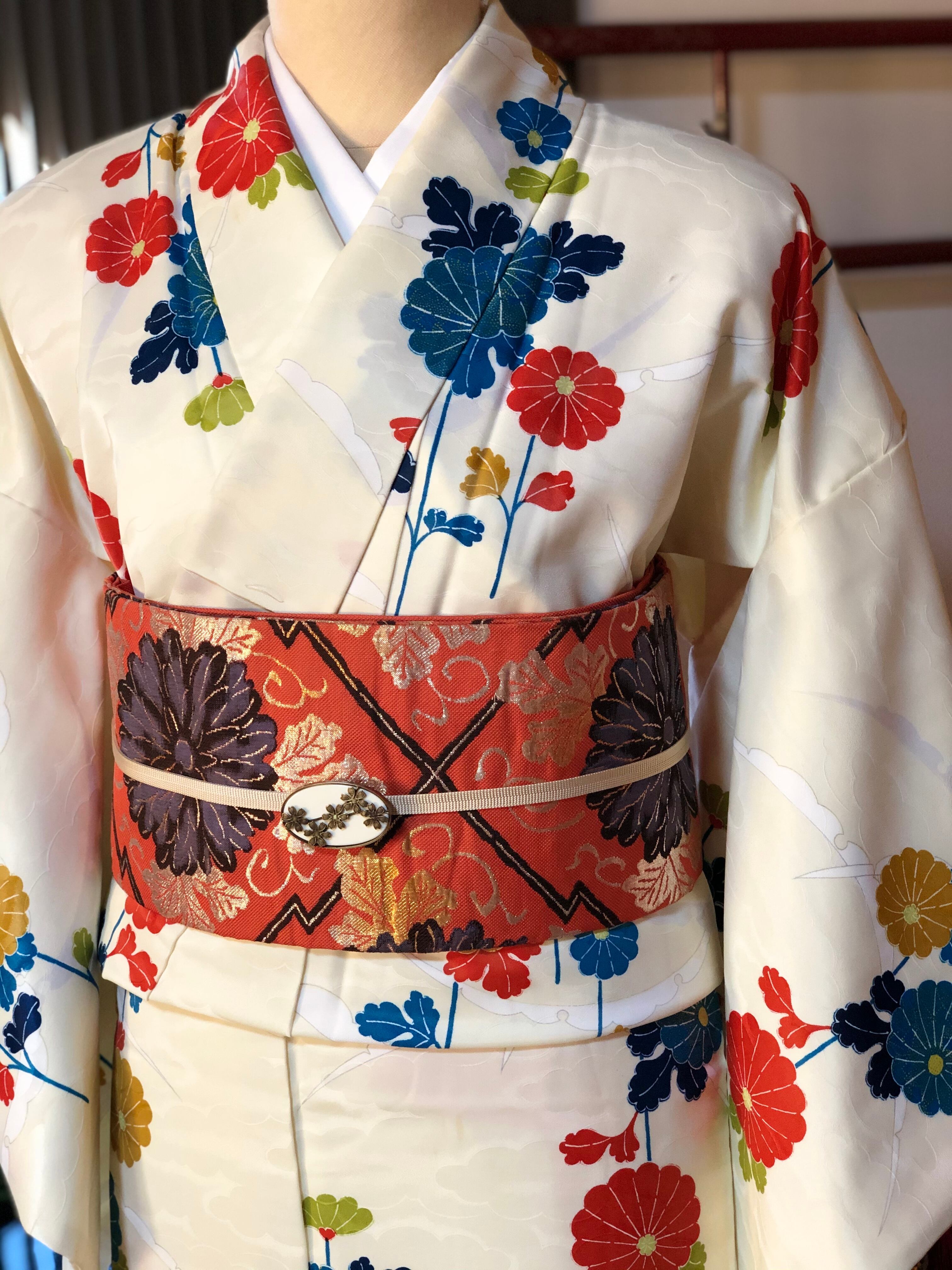 白に近いクリーム色の地に雪輪とカラフルな菊が描かれた小紋。