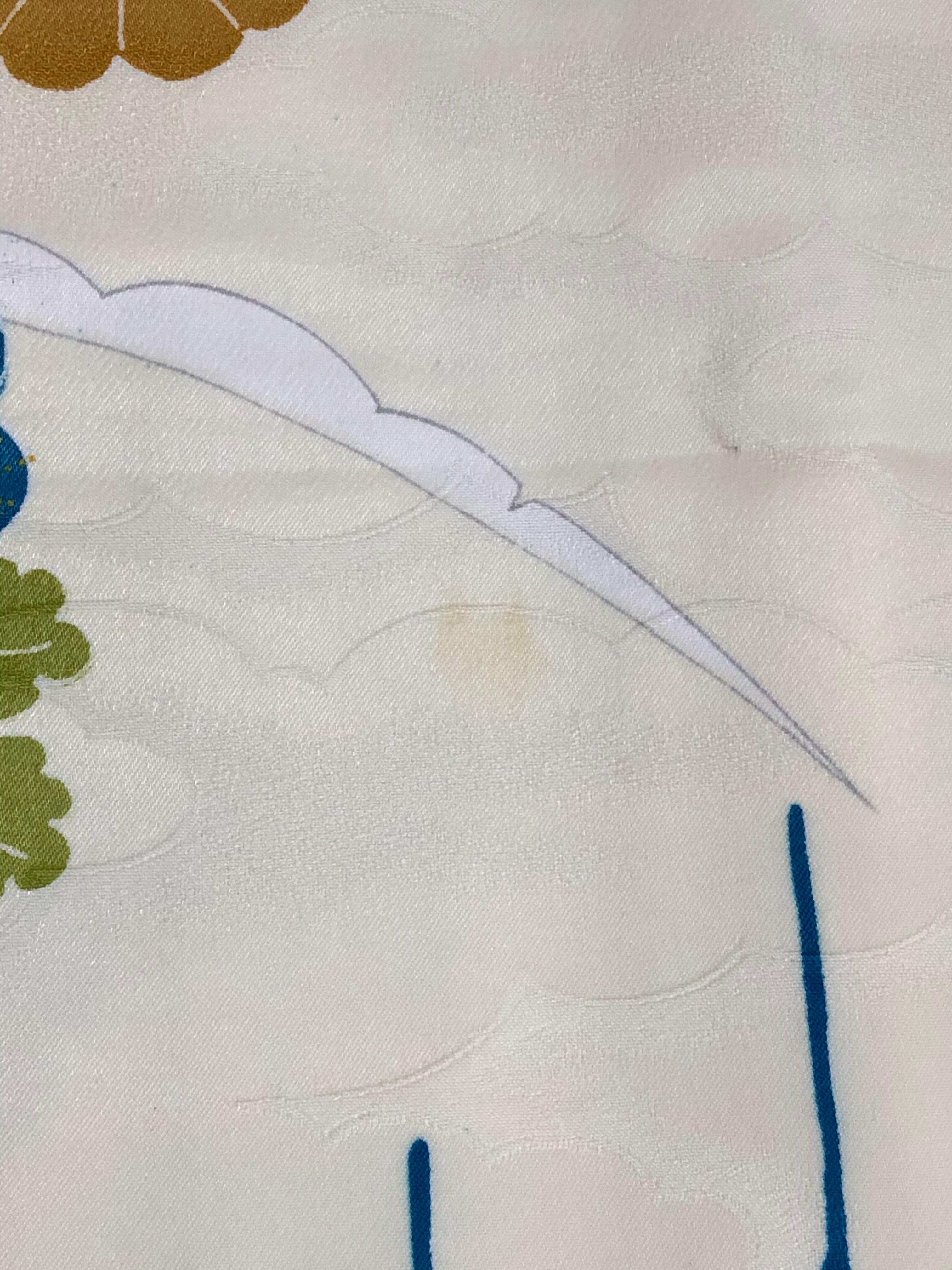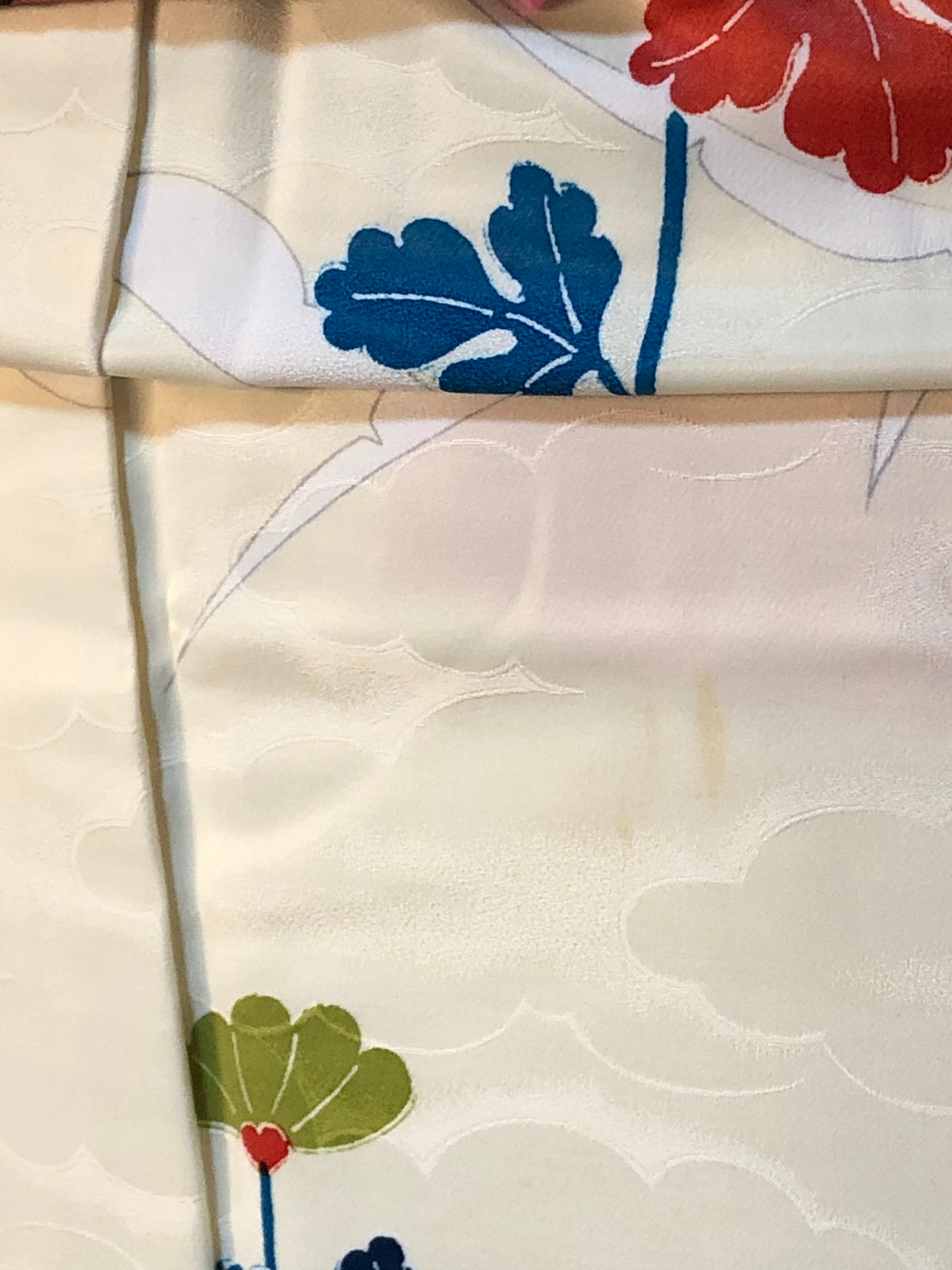 前見頃の正面裾から76㎝、後ろ身頃の両側裾から42〜45糎の辺りにうっすら汚れあります。