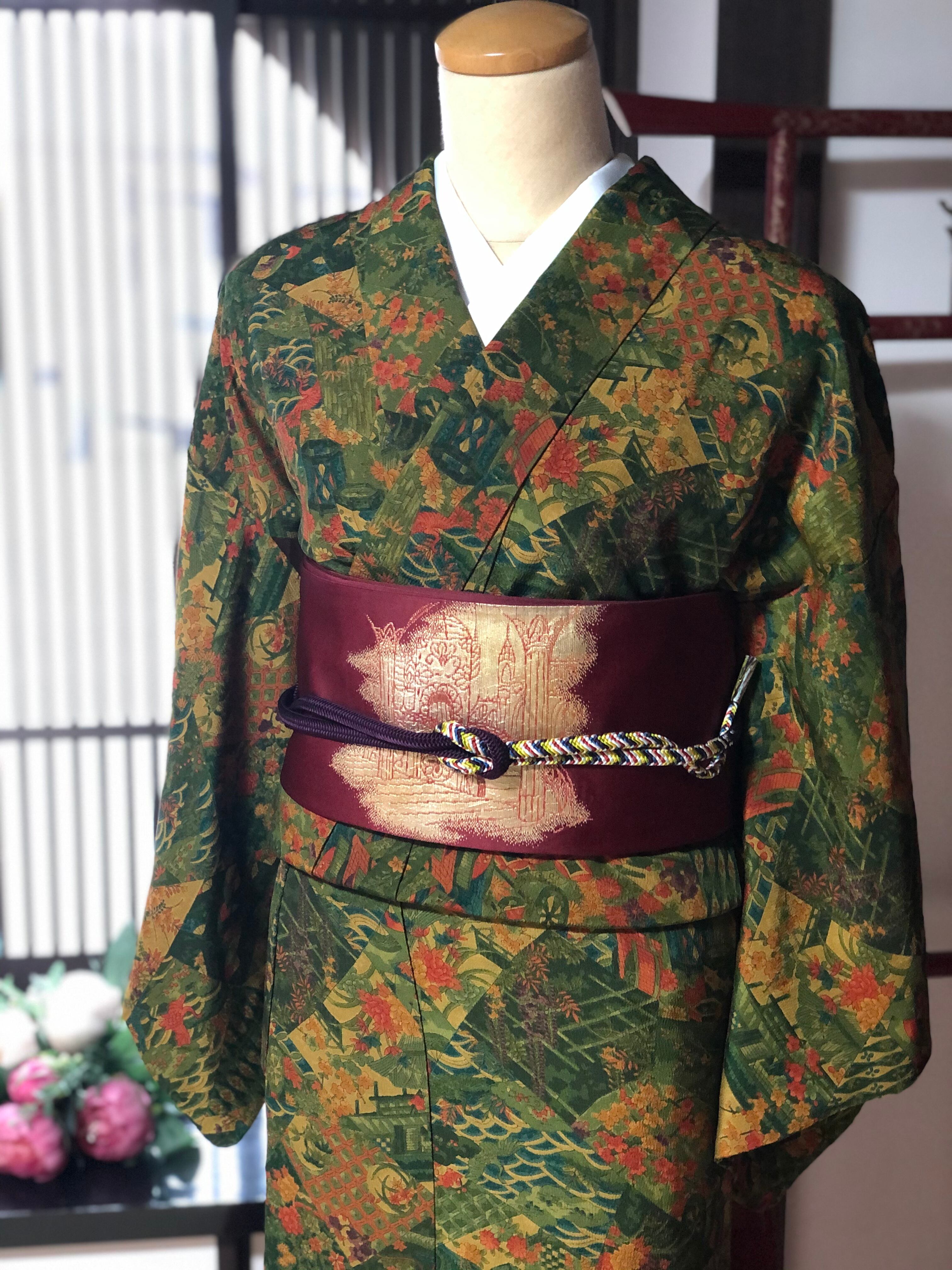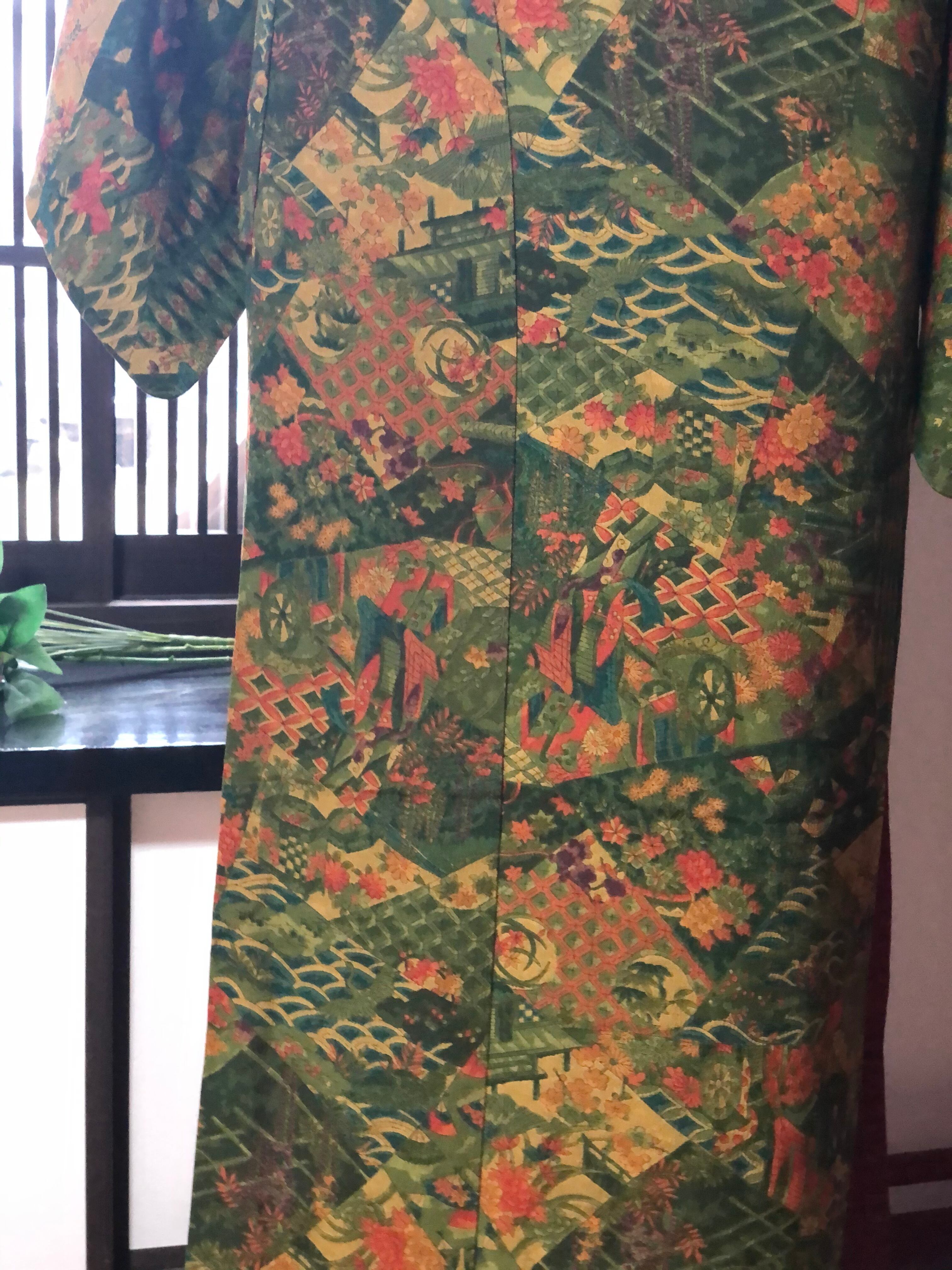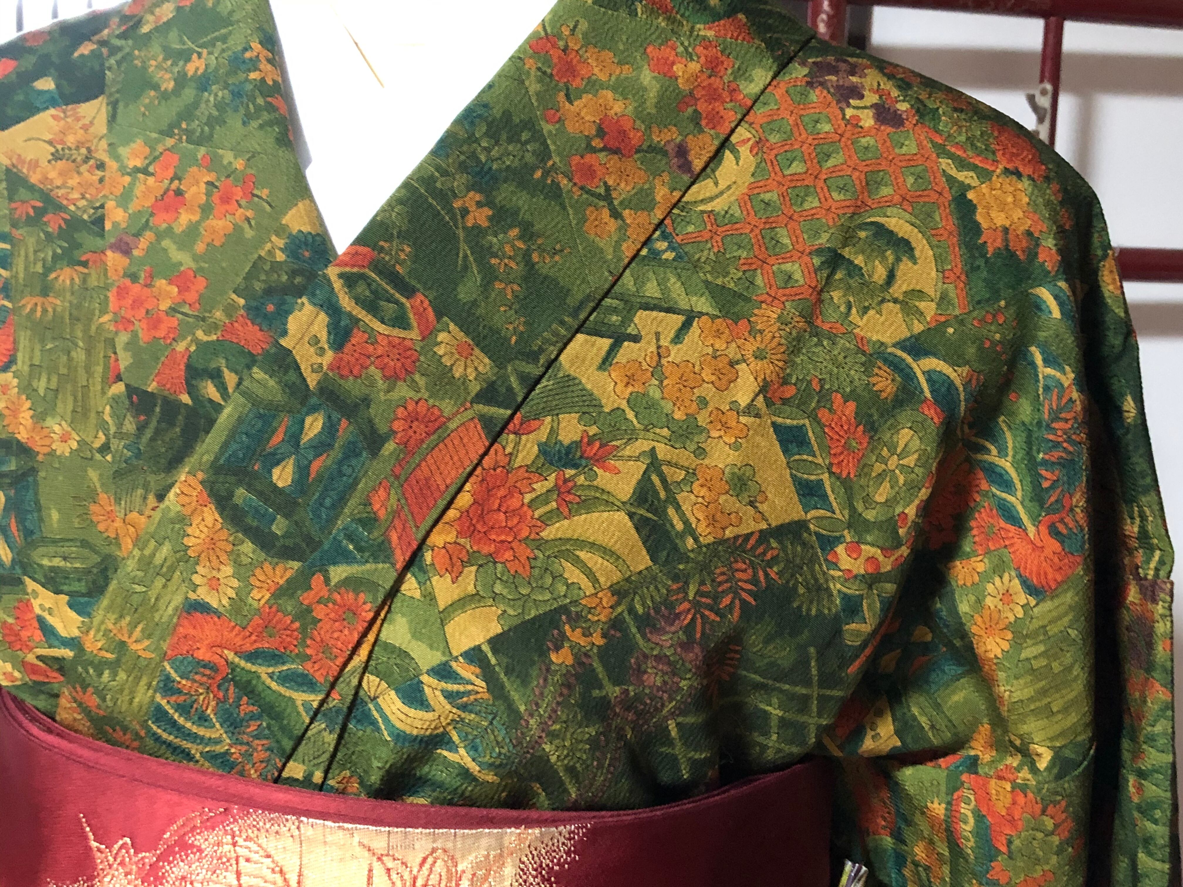 緑色の地に賑やかな柄が様々描かれている小紋です。