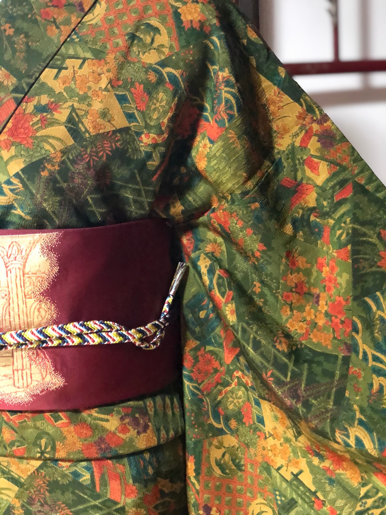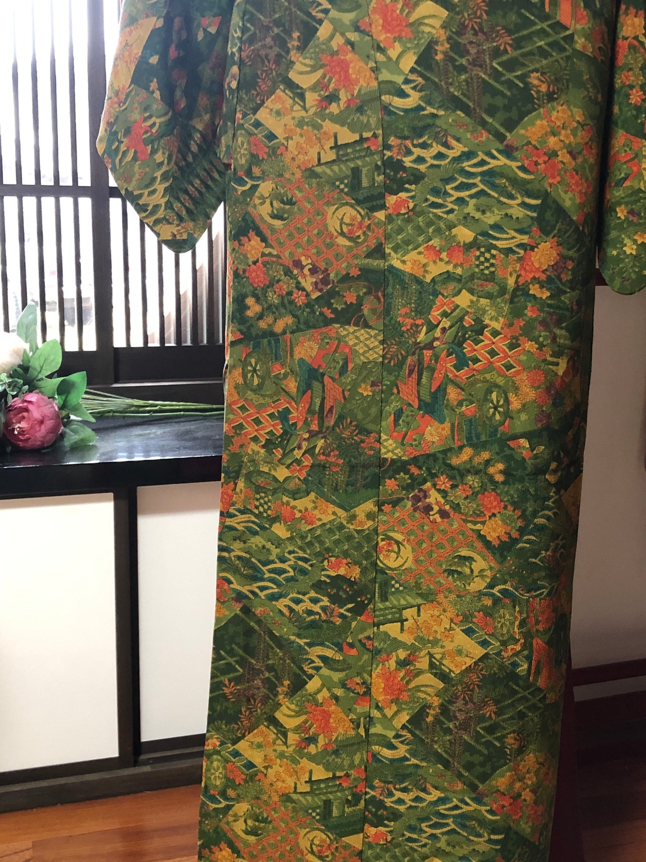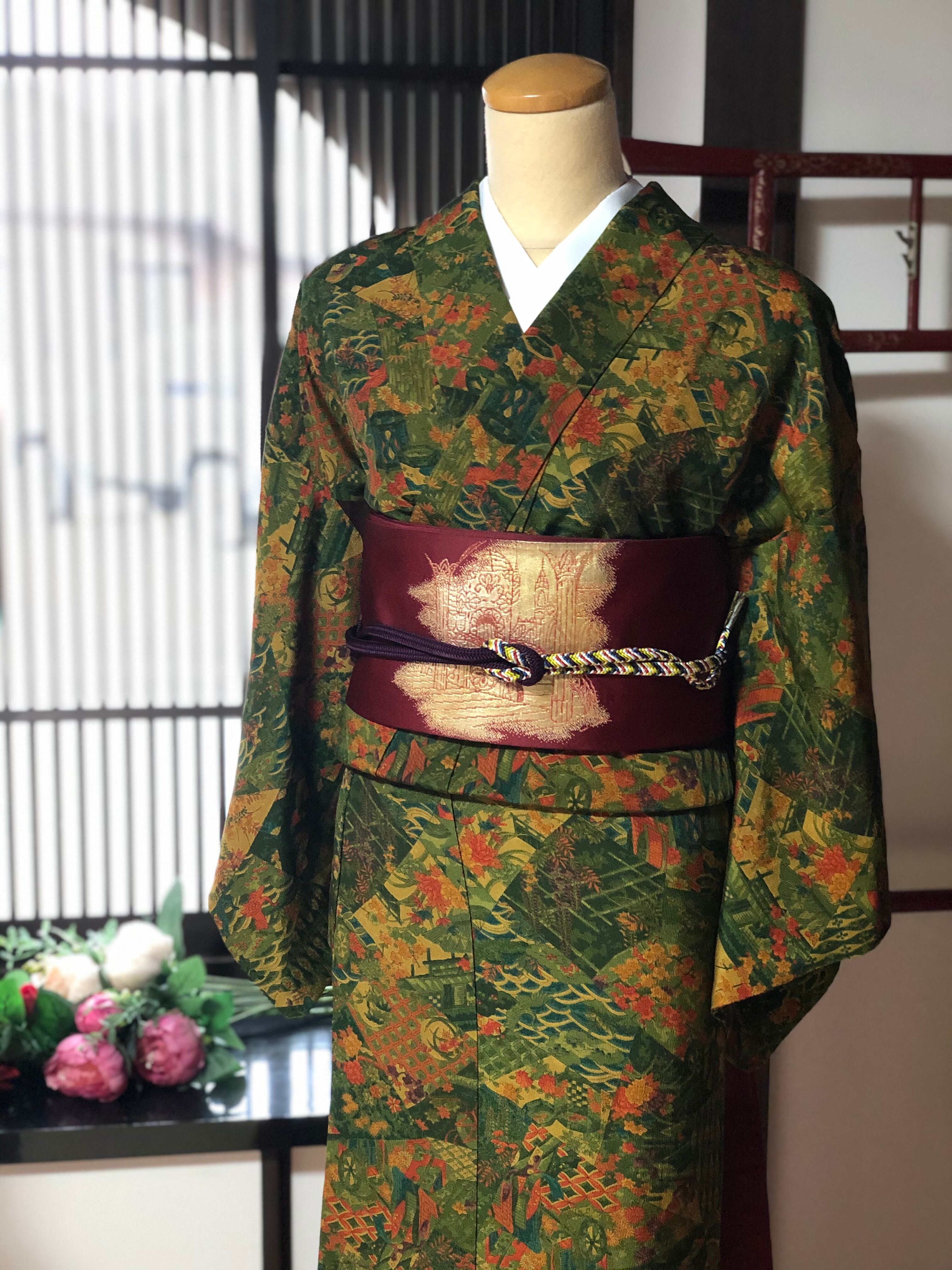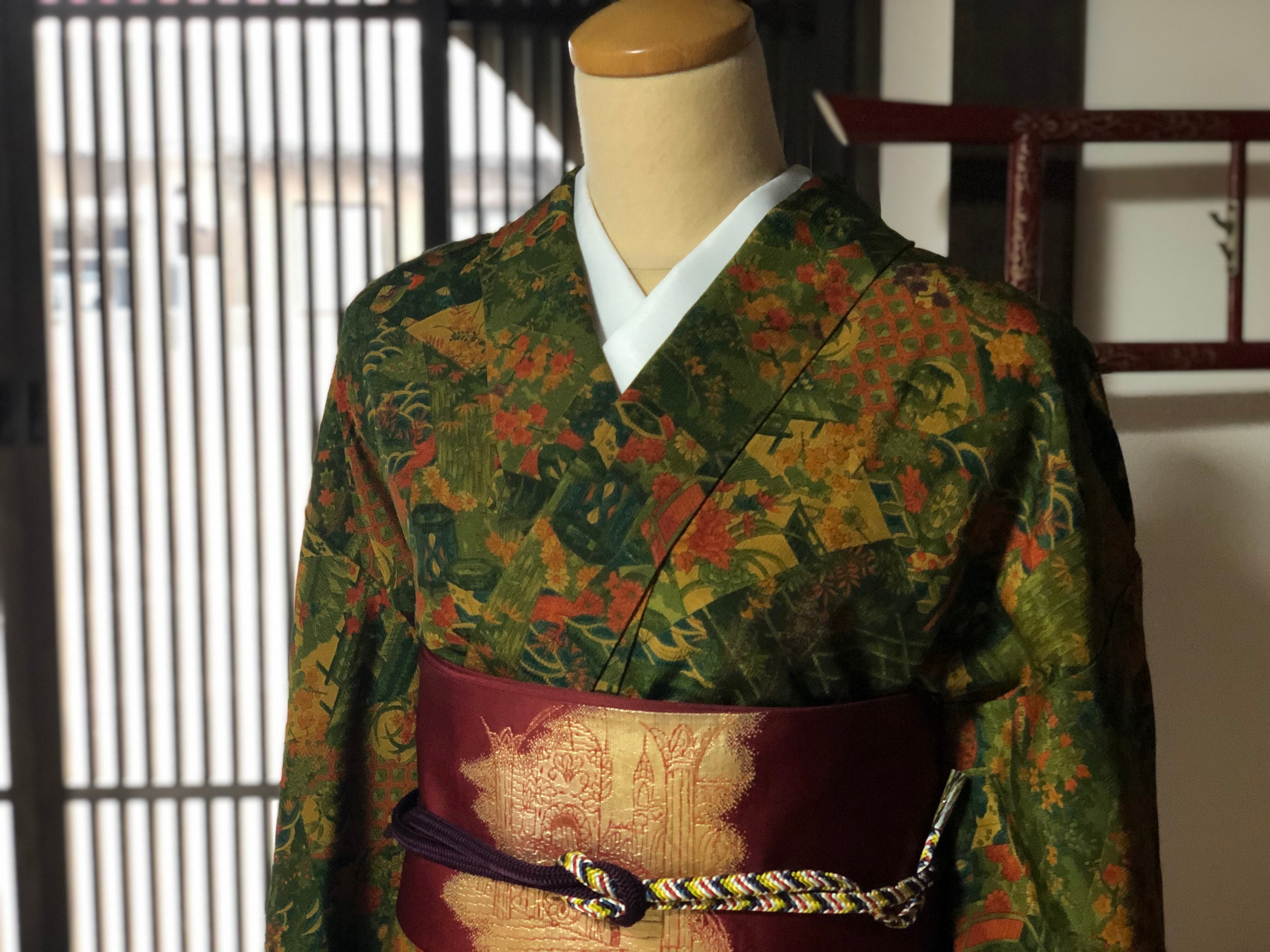 緑色の地に賑やかな柄が様々描かれている小紋です。