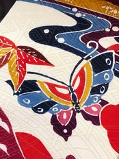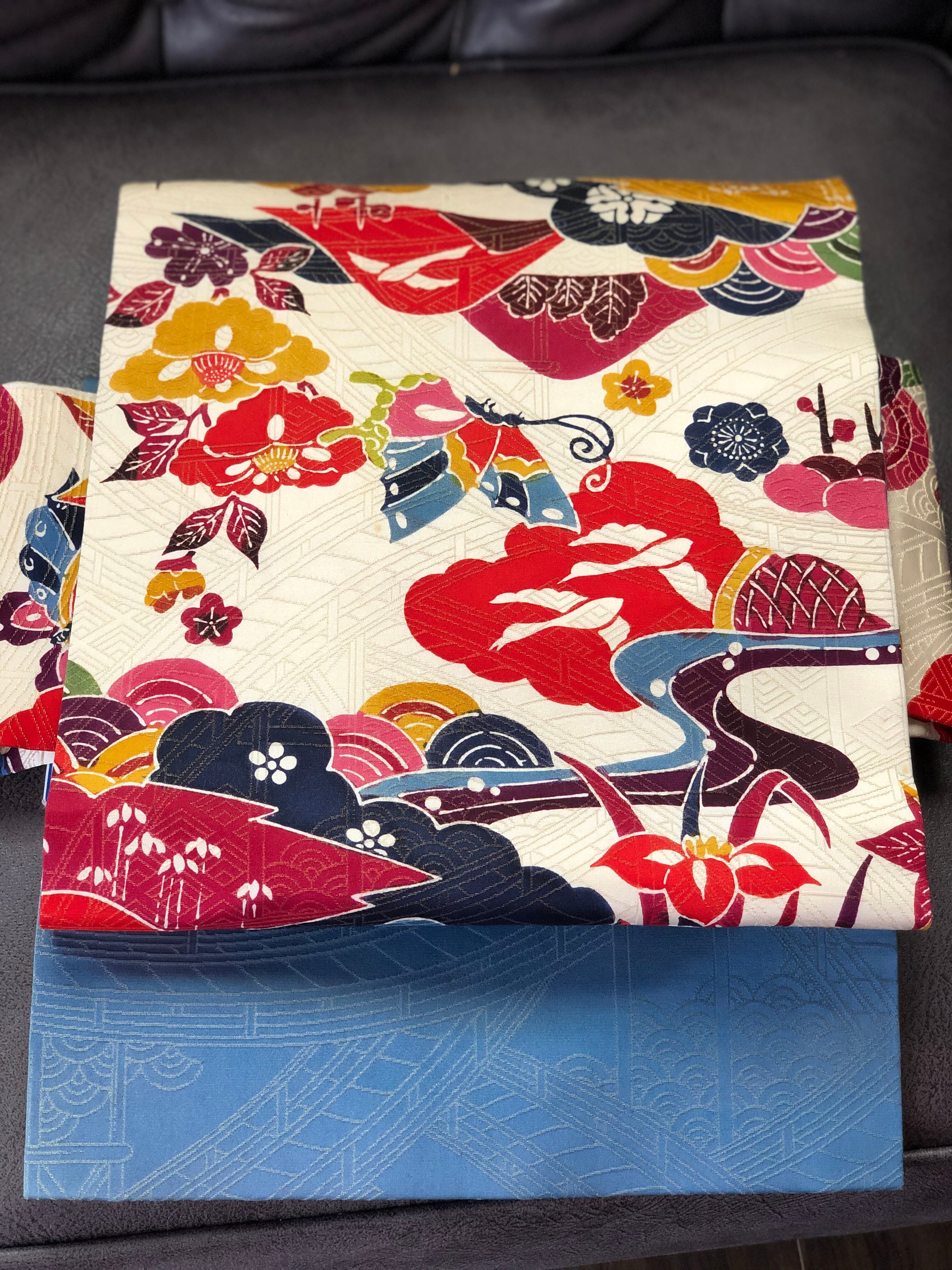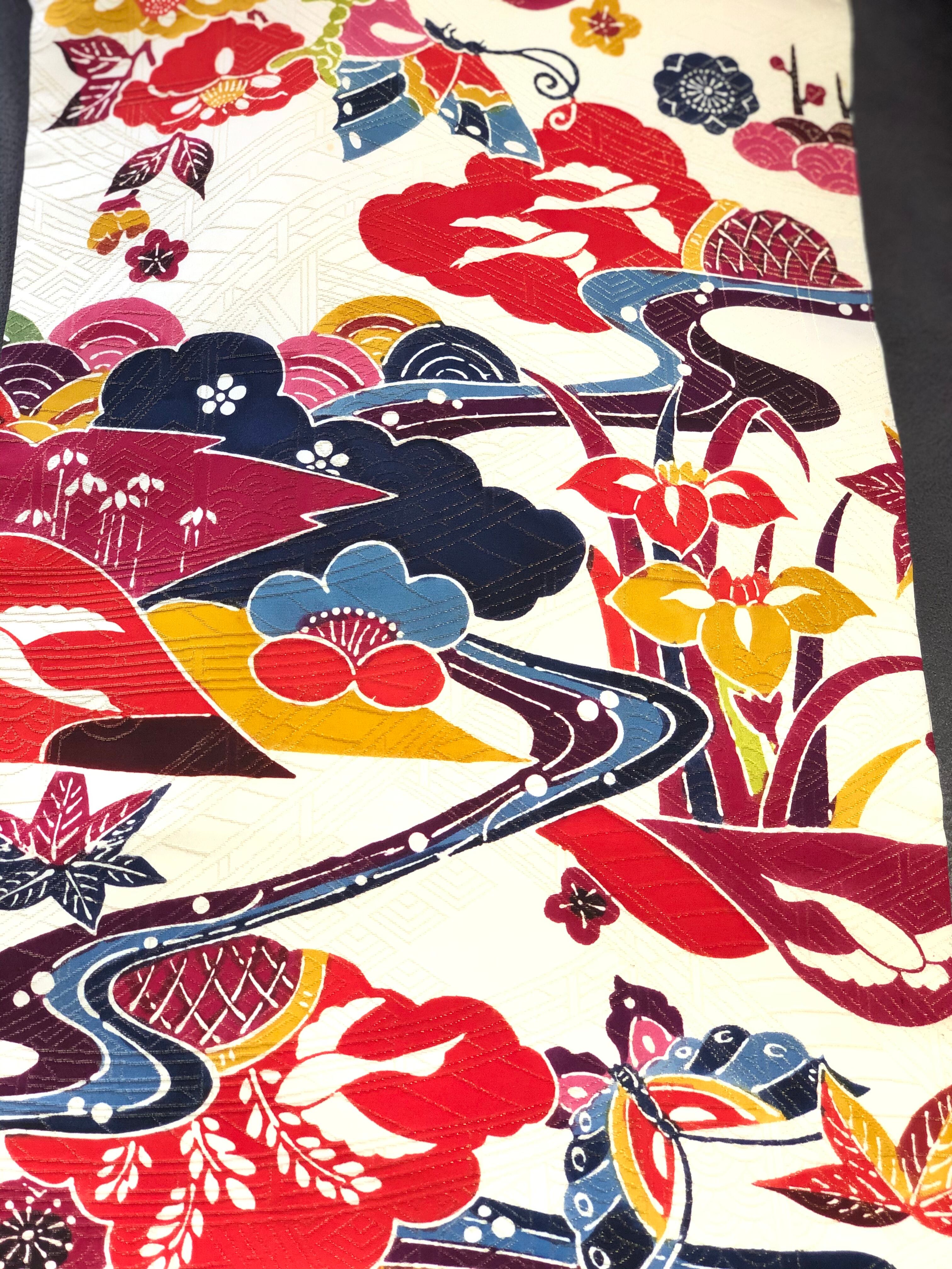 菖、梅、椿、桜、蝶などくっきりとした花々の柄に金糸が織り込んでありとても華やかです。