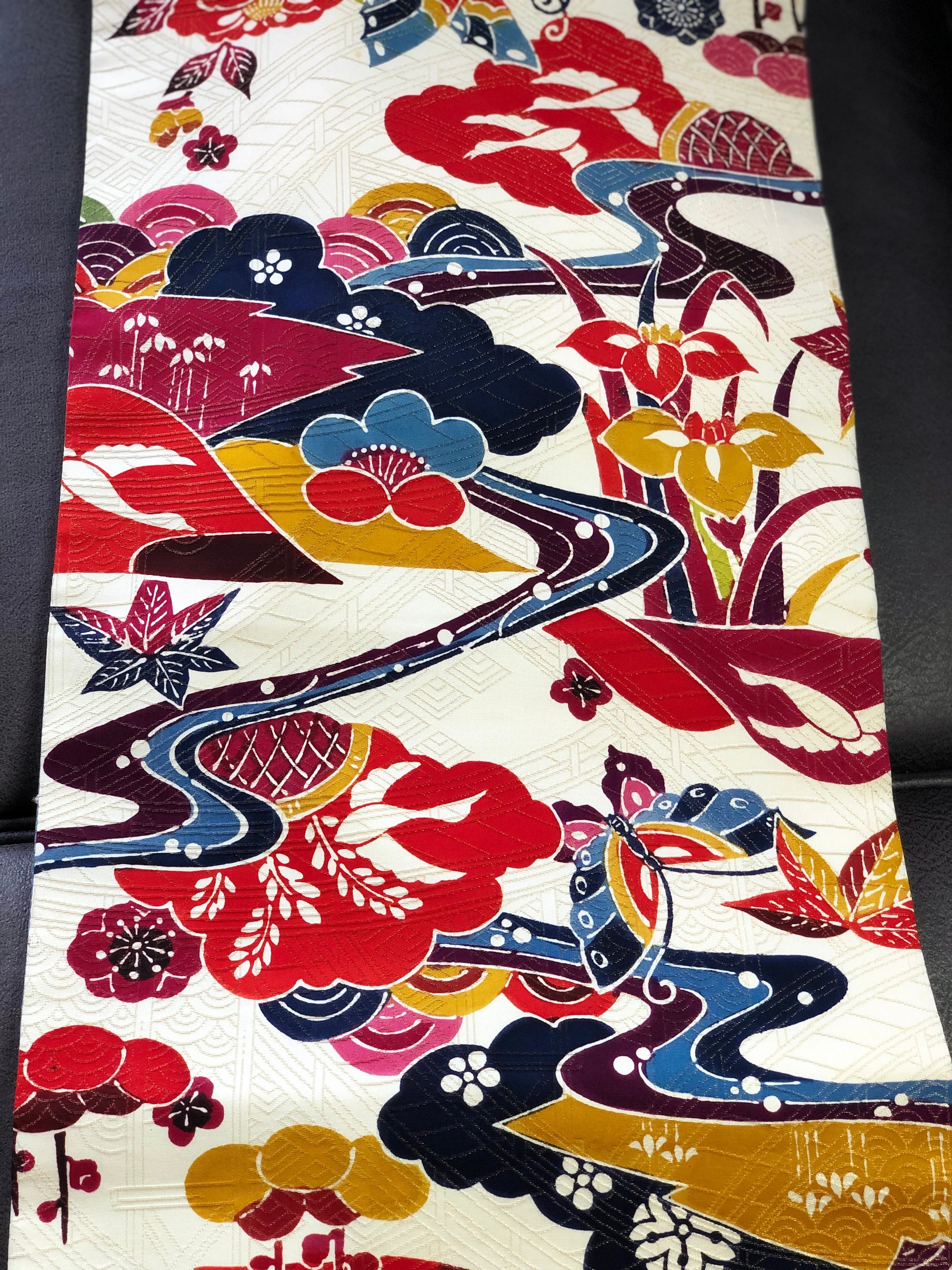 アイボリーの地にカラフルな紅型風柄の名古屋帯です。