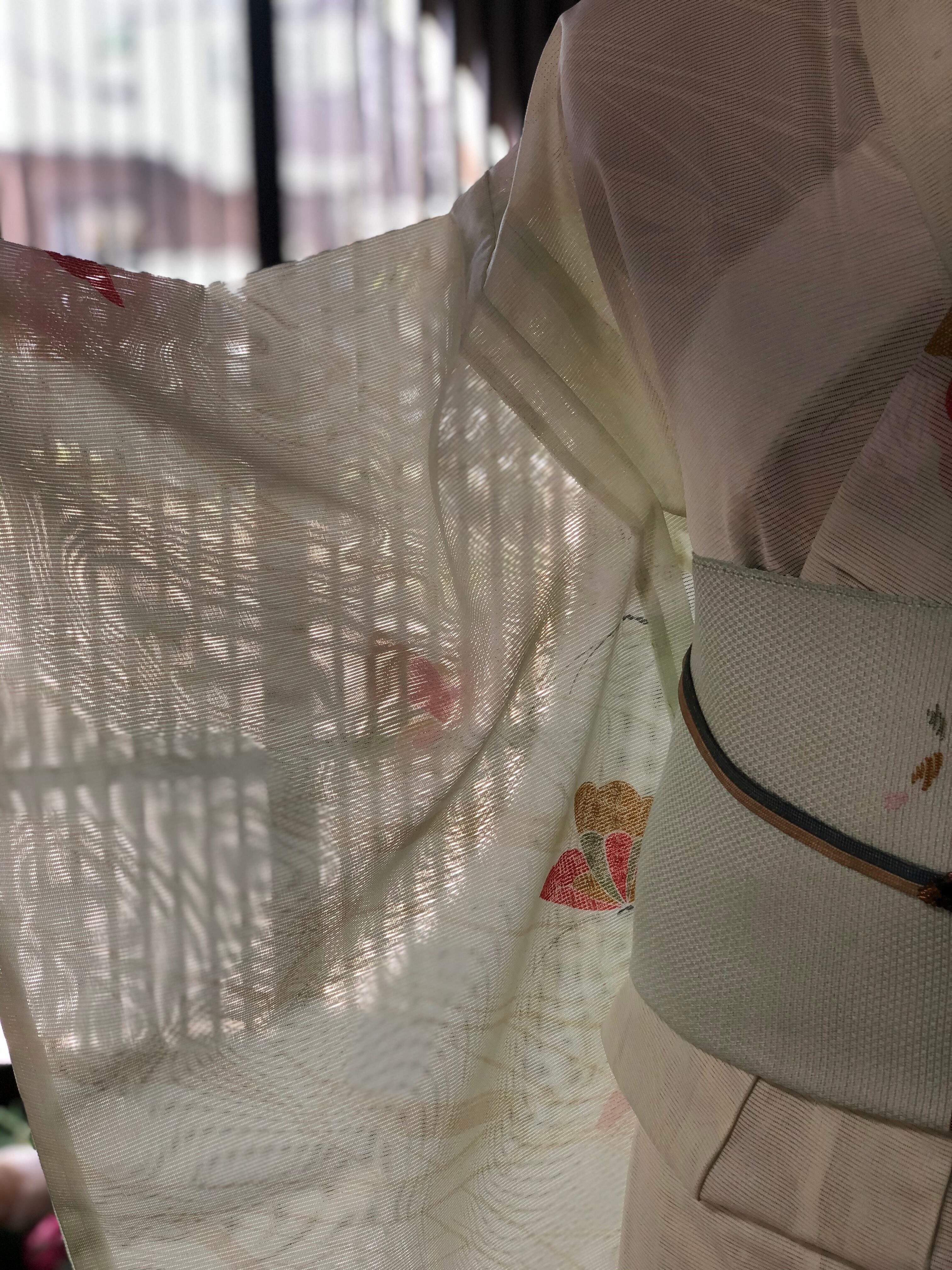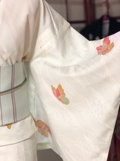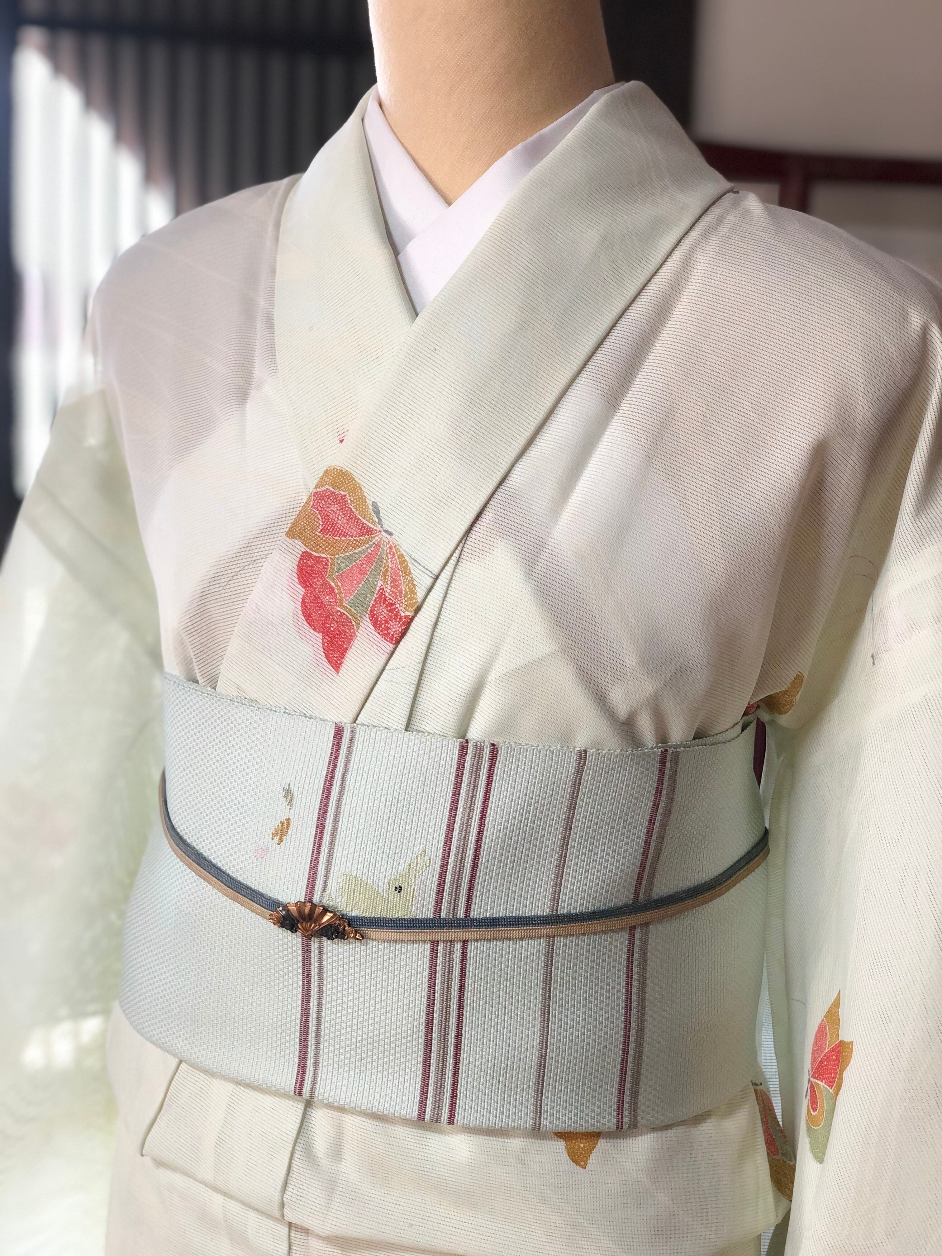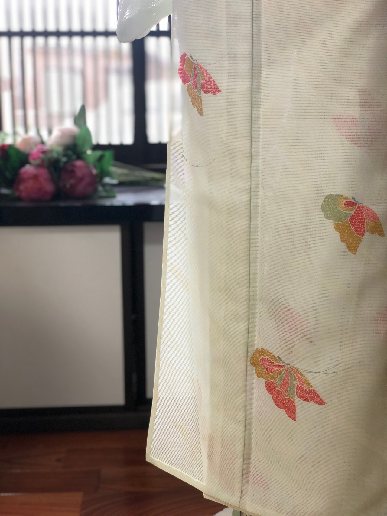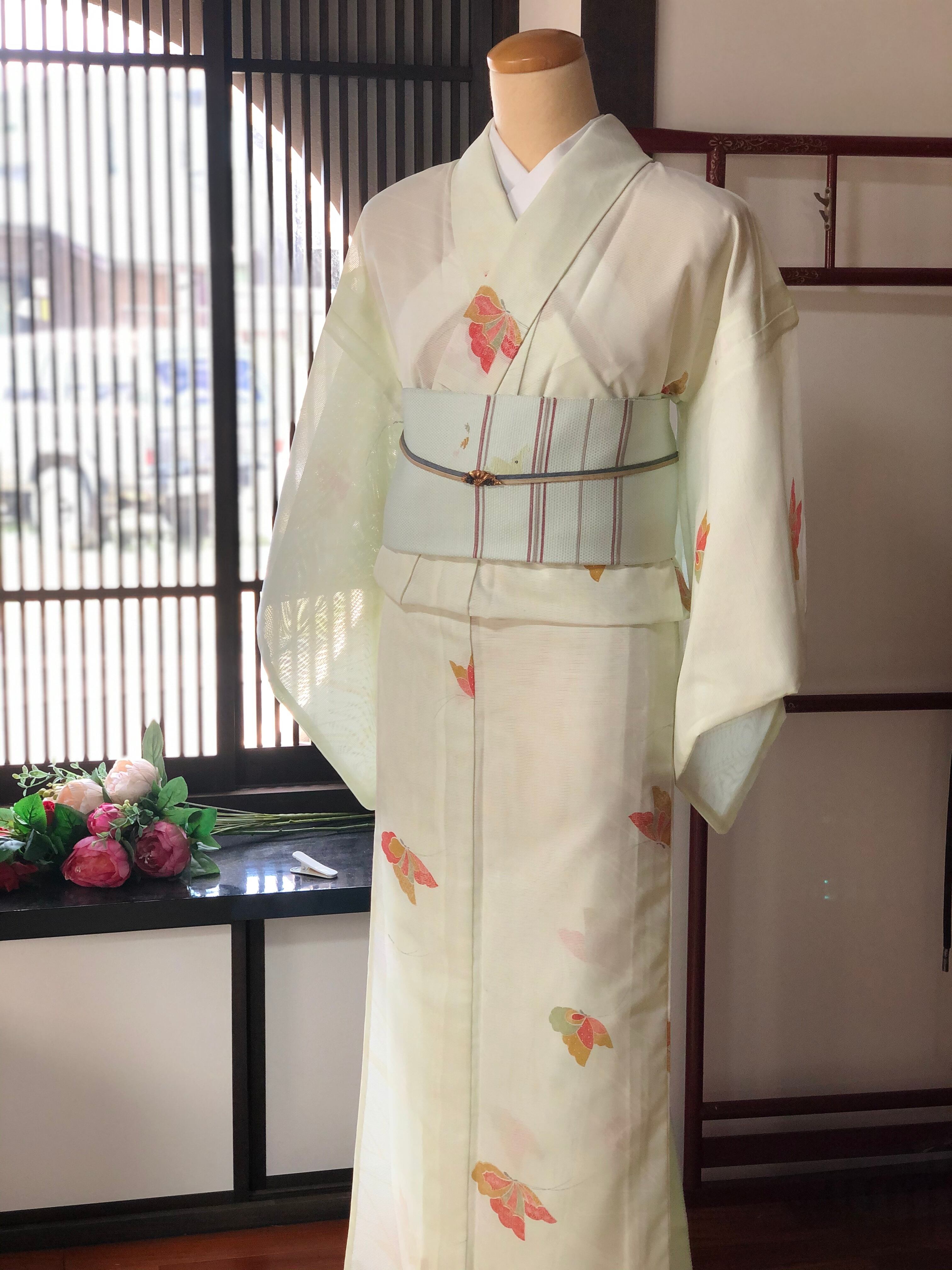 ごく淡い薄緑の絽に爽やかな蝶柄の夏着物です。