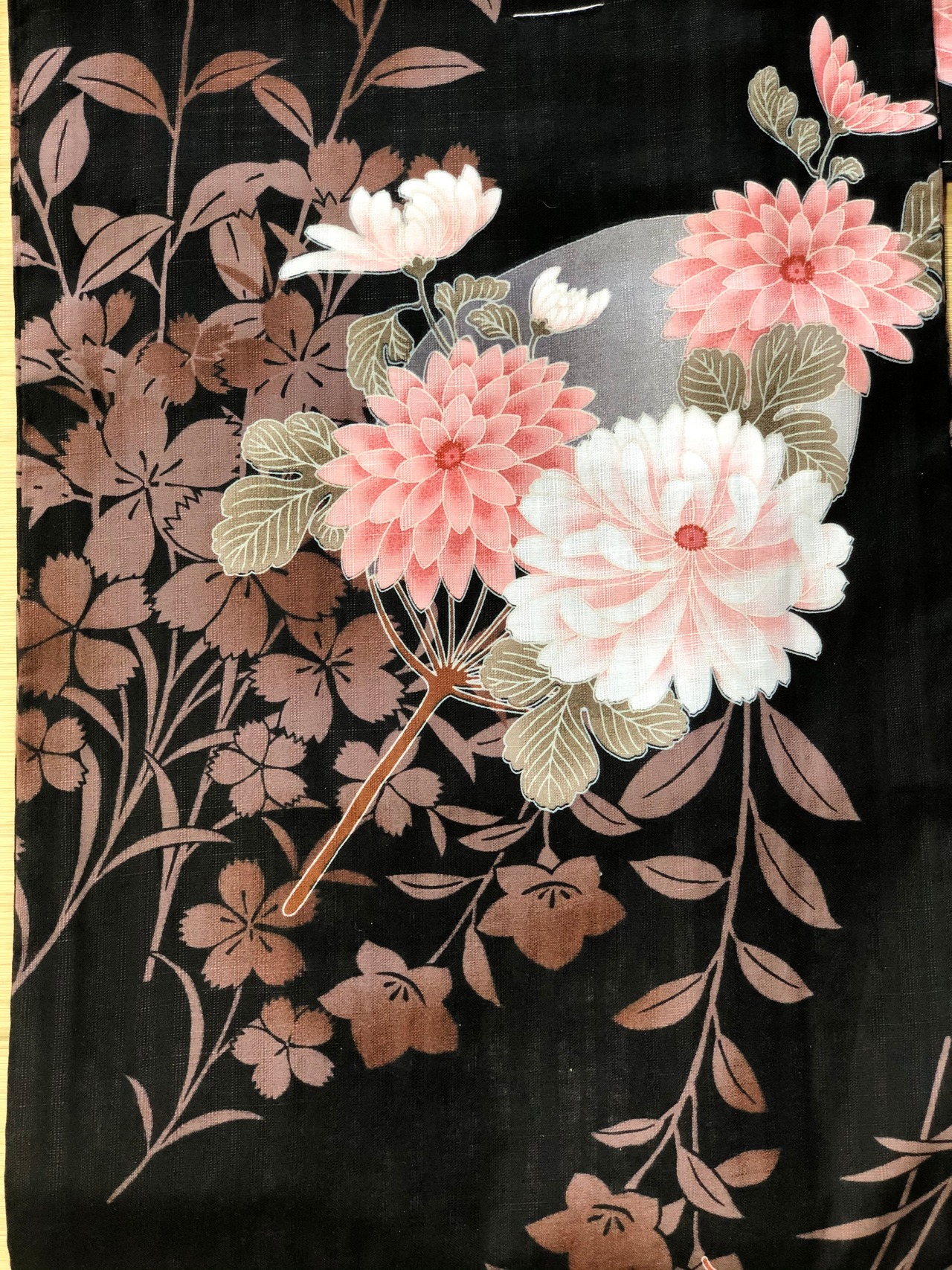 黒地に明るい花柄は薄暗い所でもお花がふんわりと浮き上がって見えて、幻想的です(^^)
