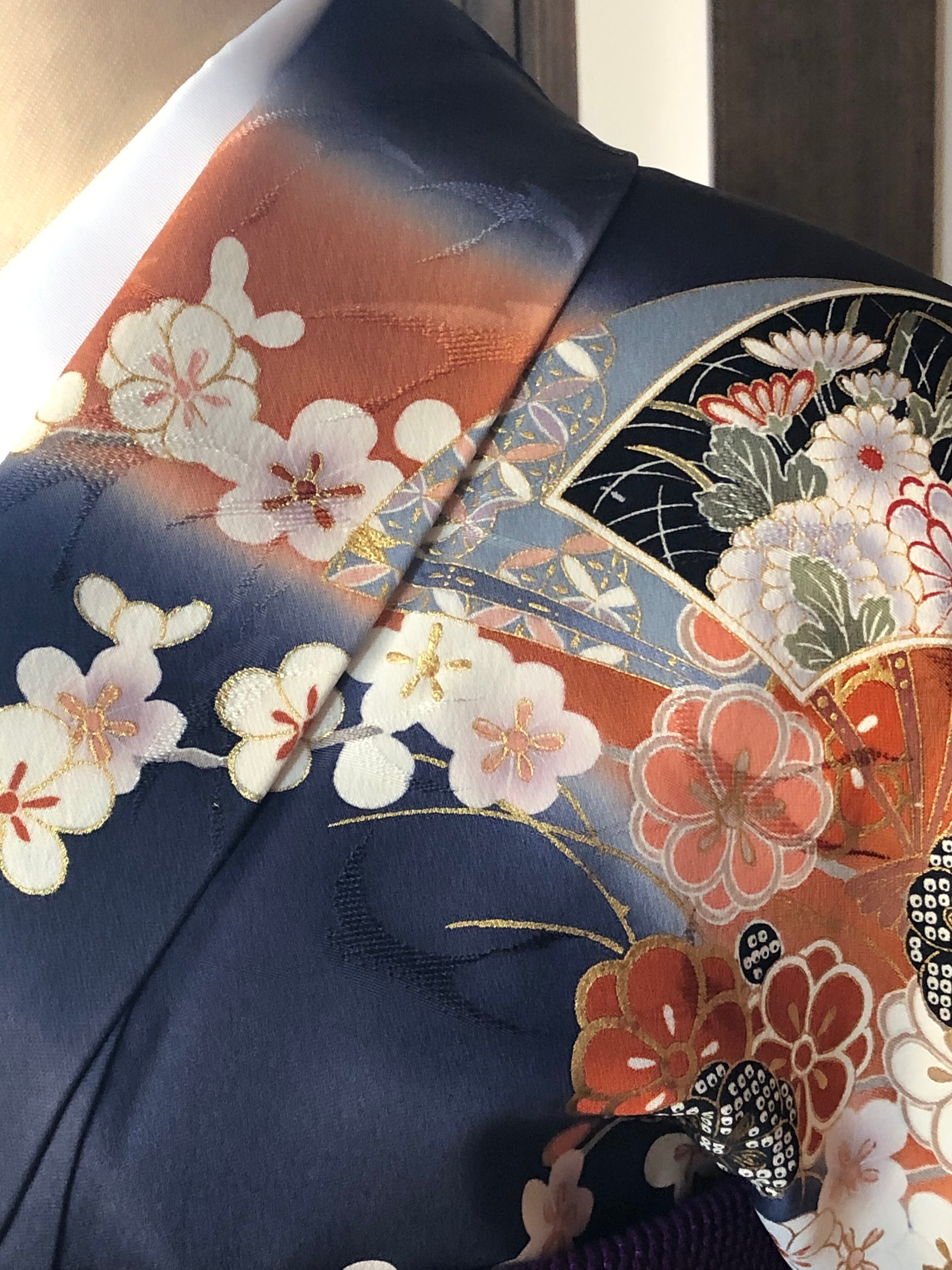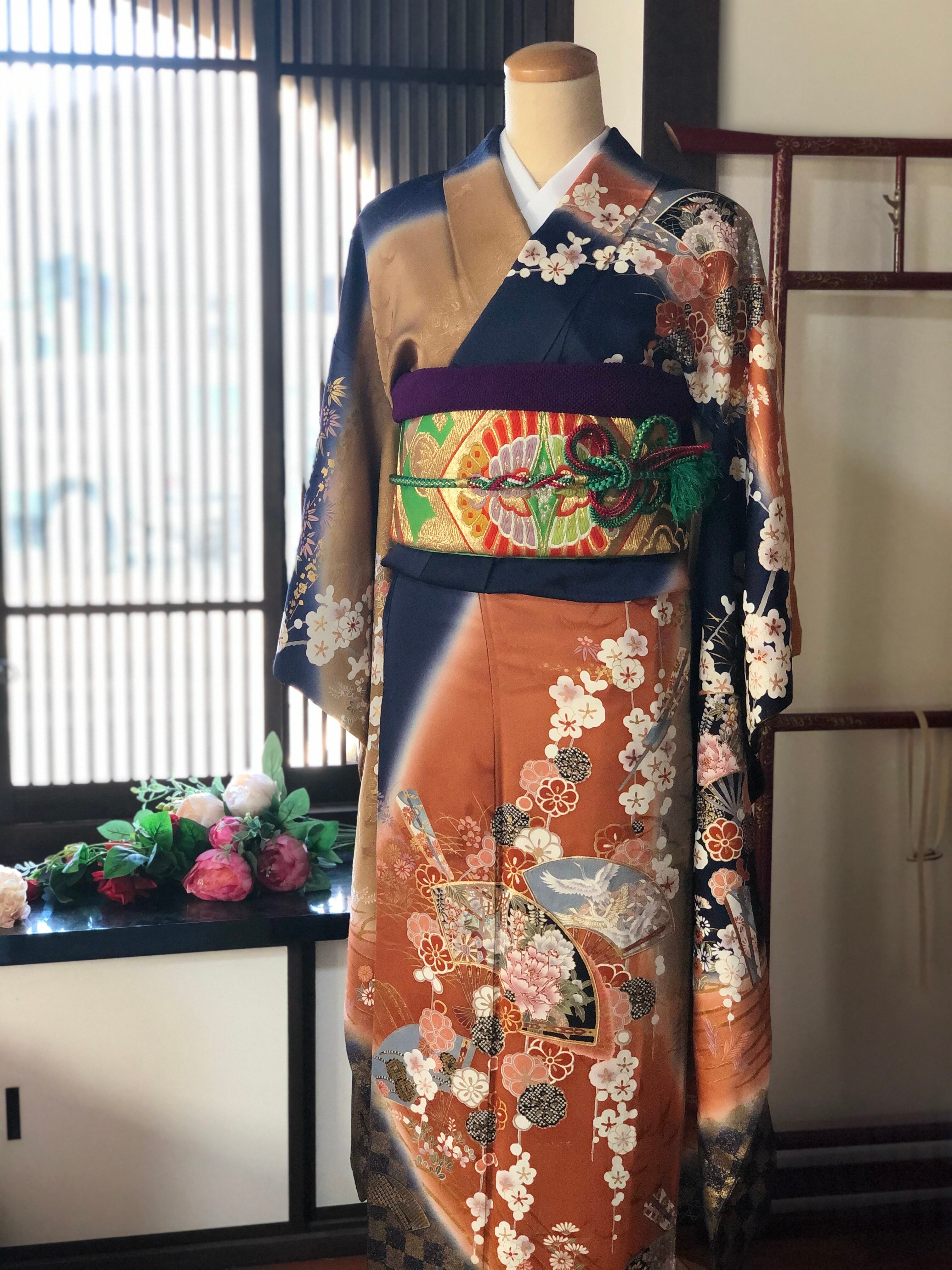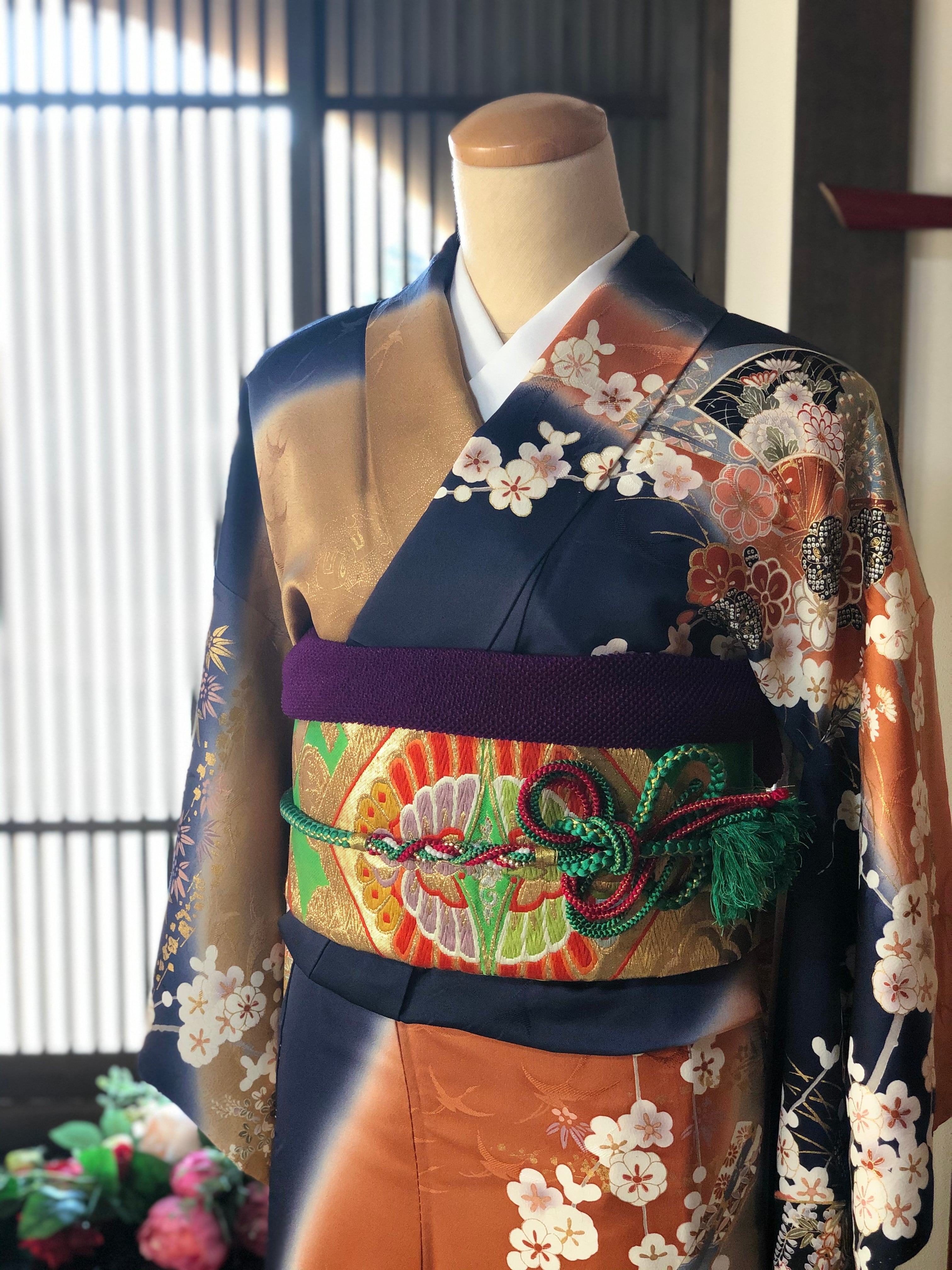 紺と落ち着いた朱色のグラデーション地に古典柄の花々が咲き乱れる振袖です。