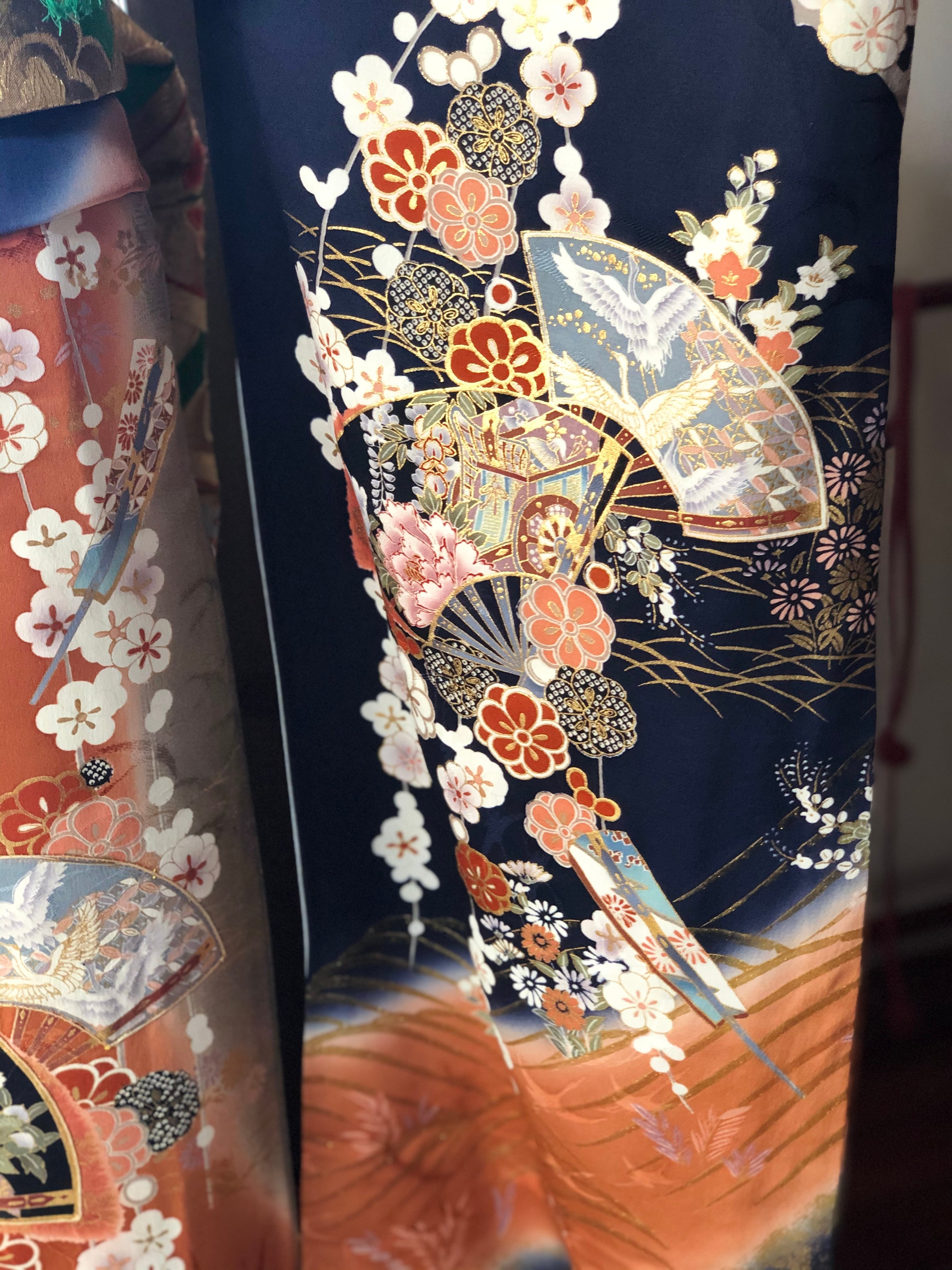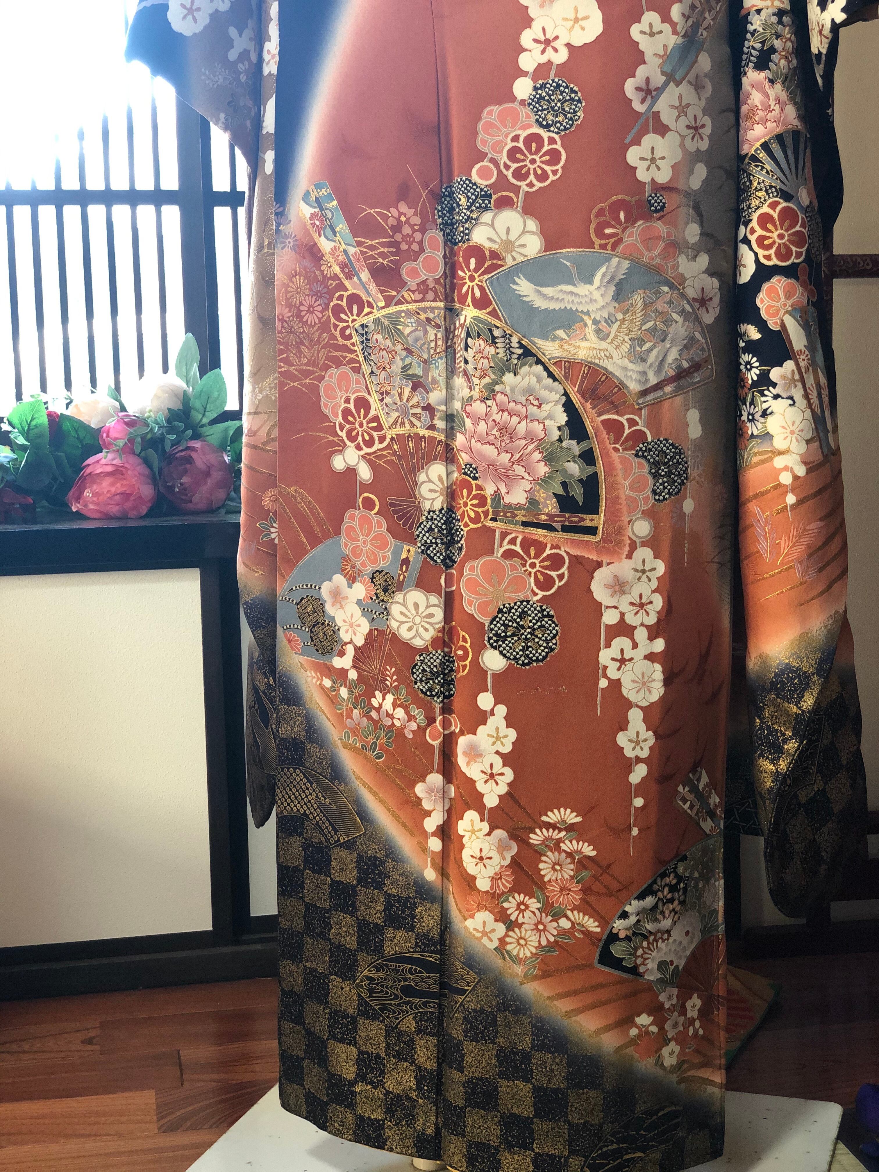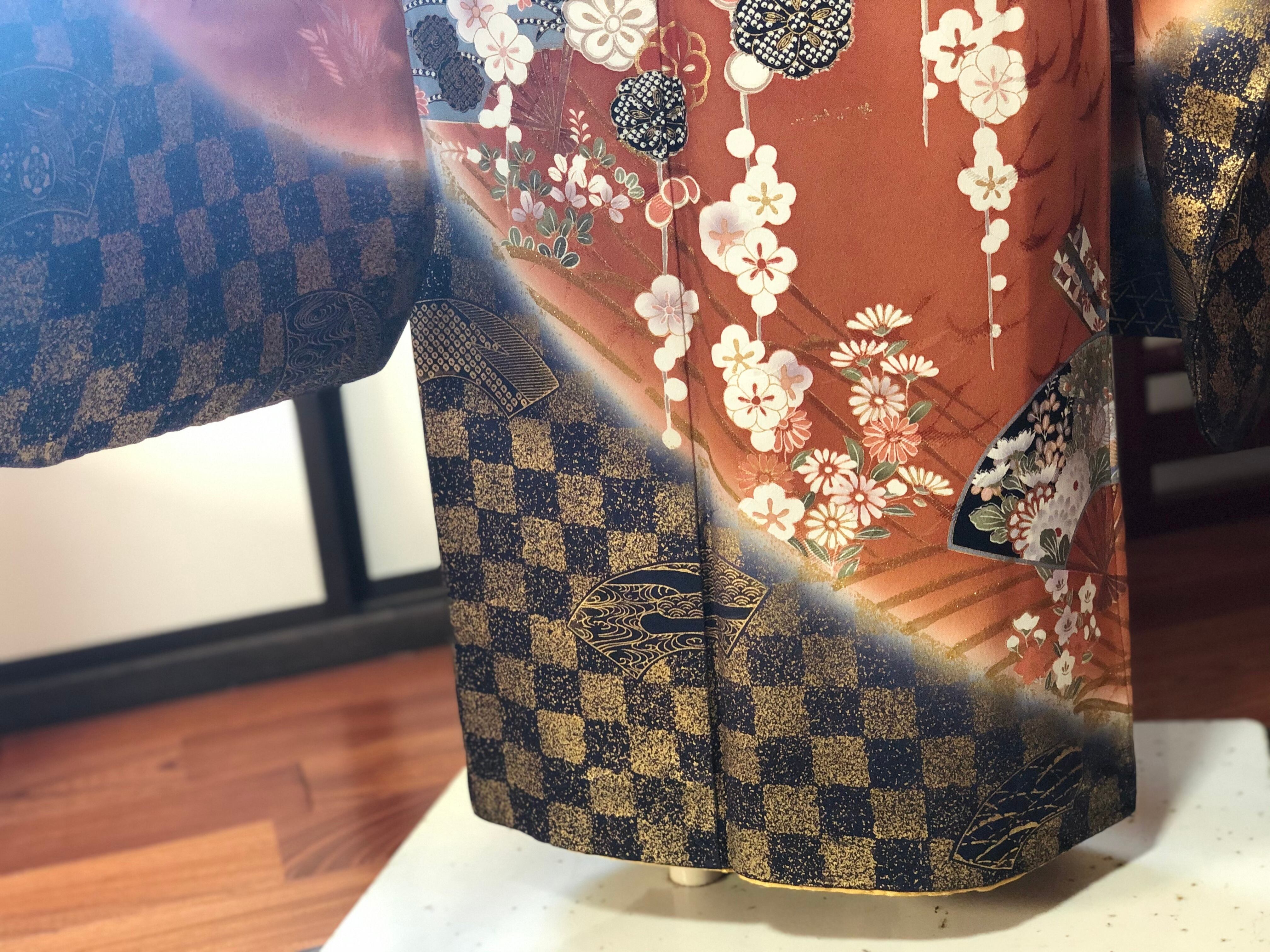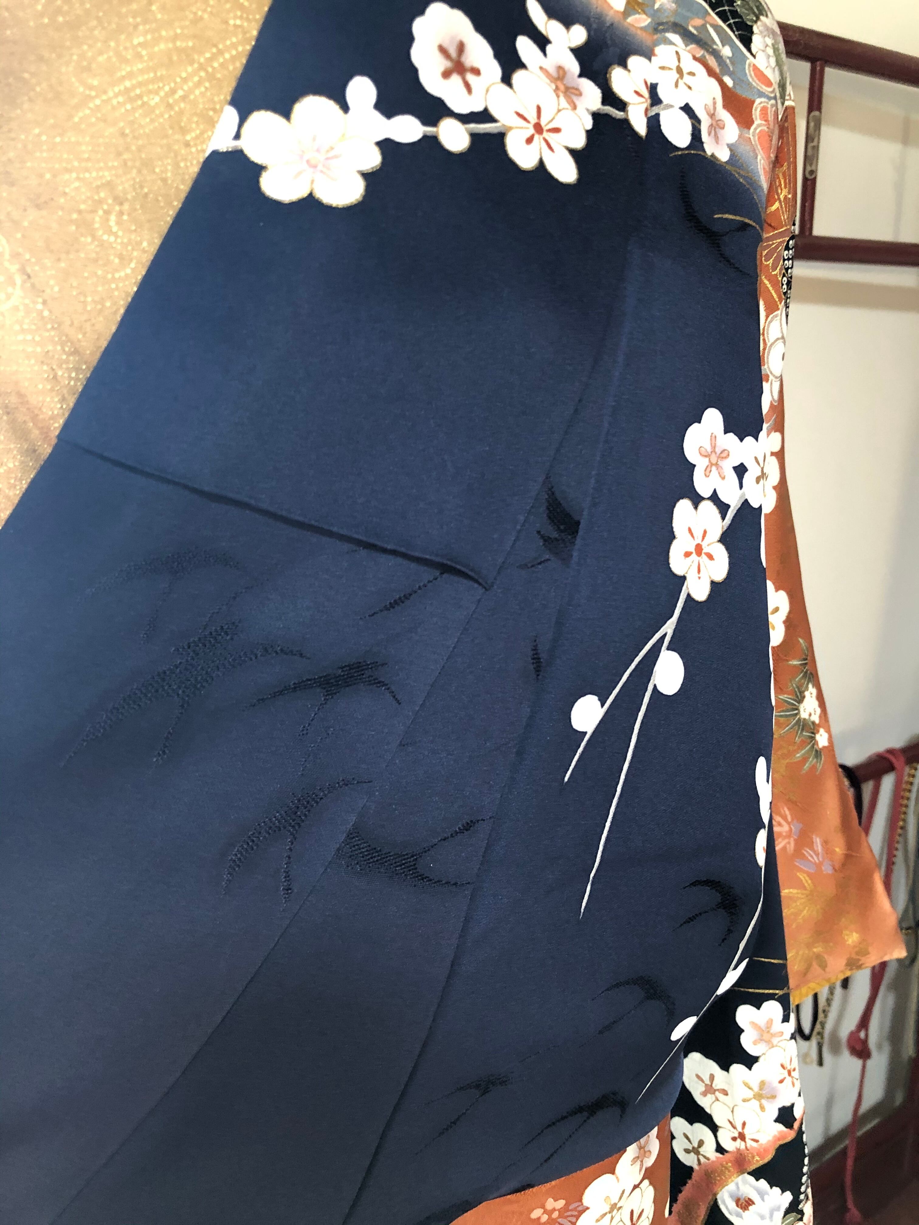 紺と落ち着いた朱色のグラデーション地に古典柄の花々が咲き乱れる振袖です。