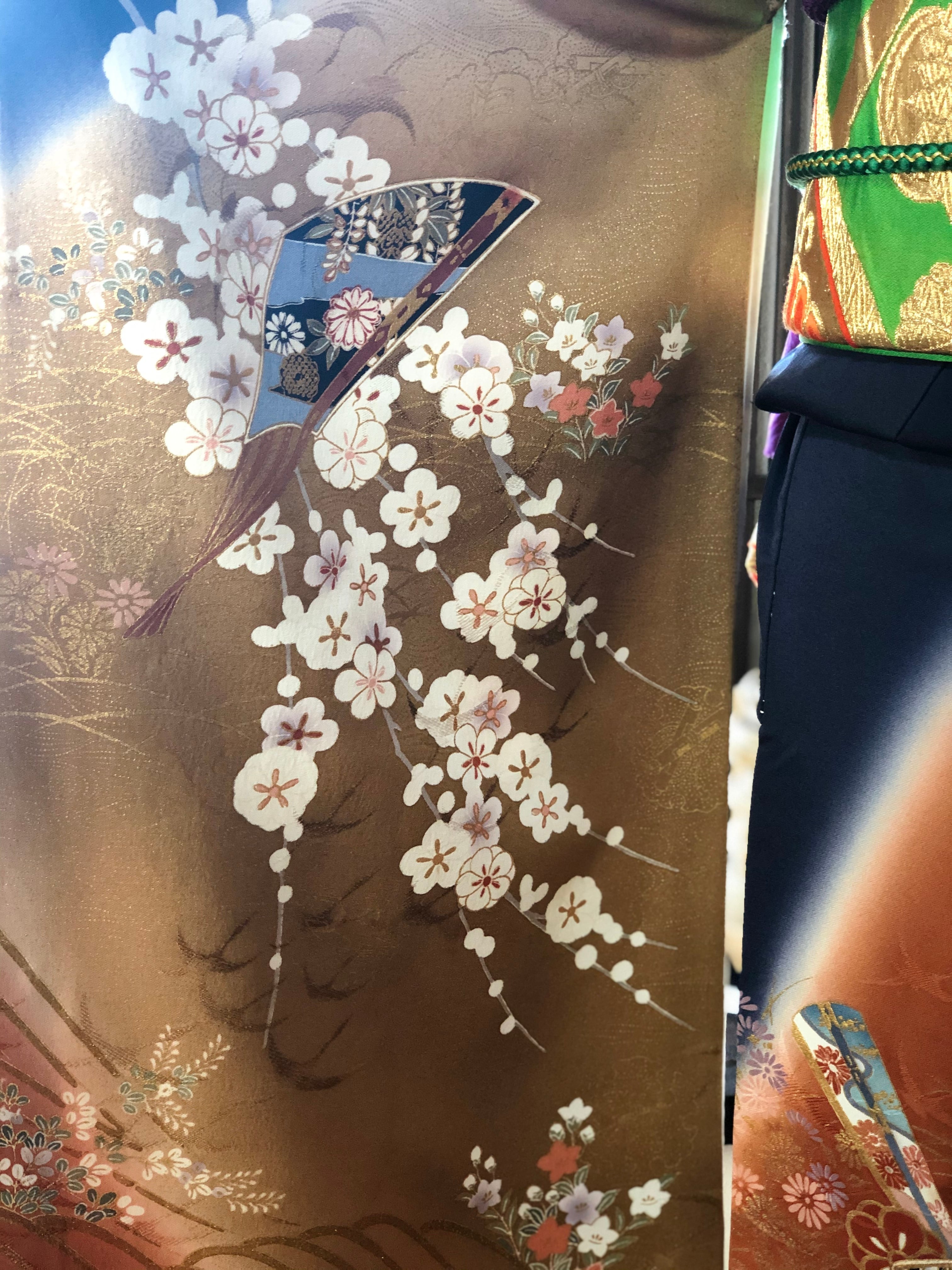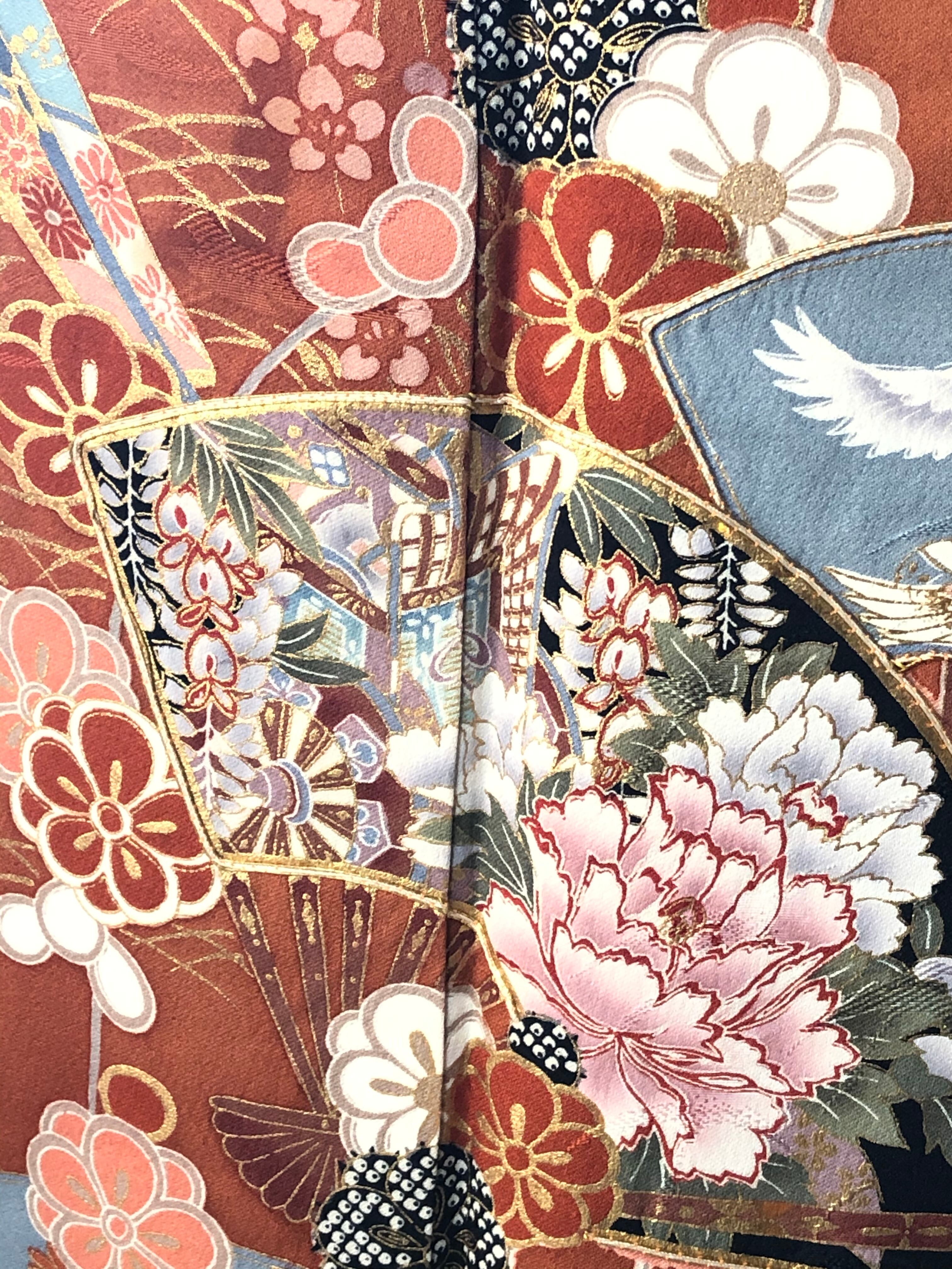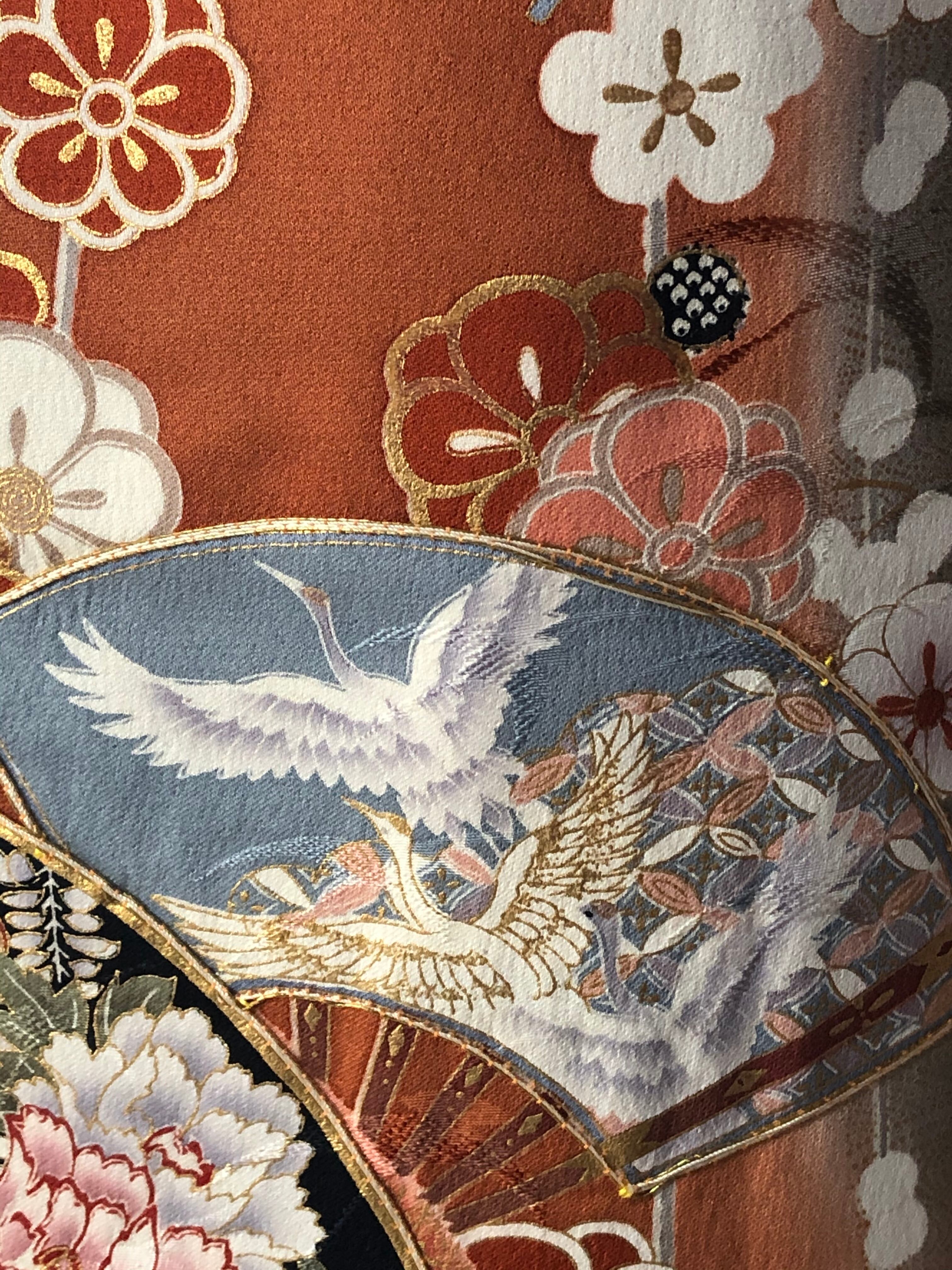 金駒刺繍で縁取られた扇型の中には、おめでたい鶴や牡丹の花が美しく描かれています。