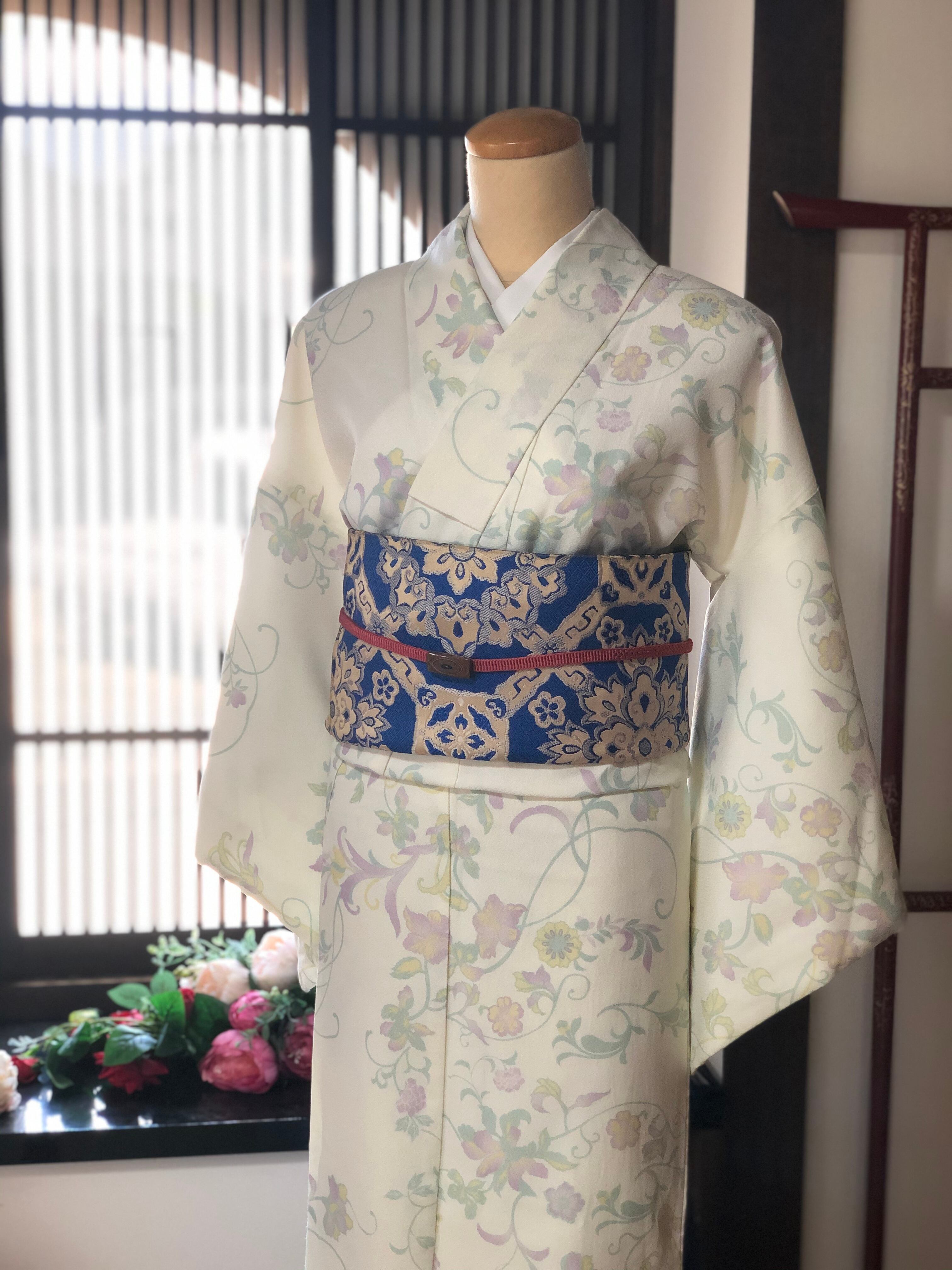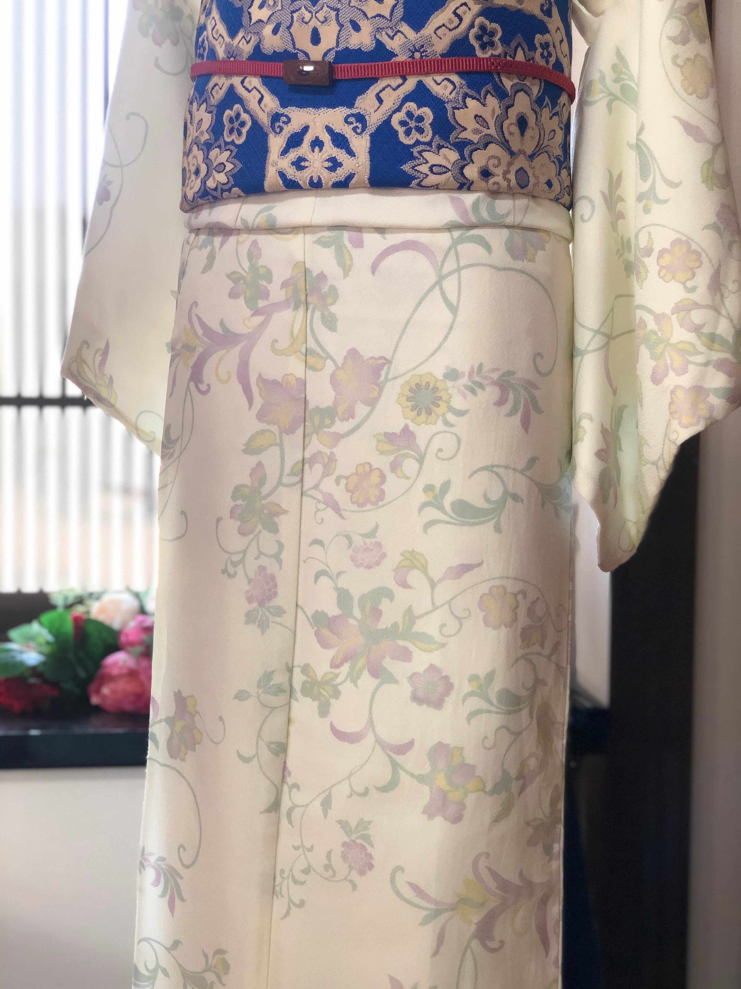 柔らかなアイボリー地に、幻想的なパステル調の草花を描き出した洗える小紋です。
