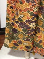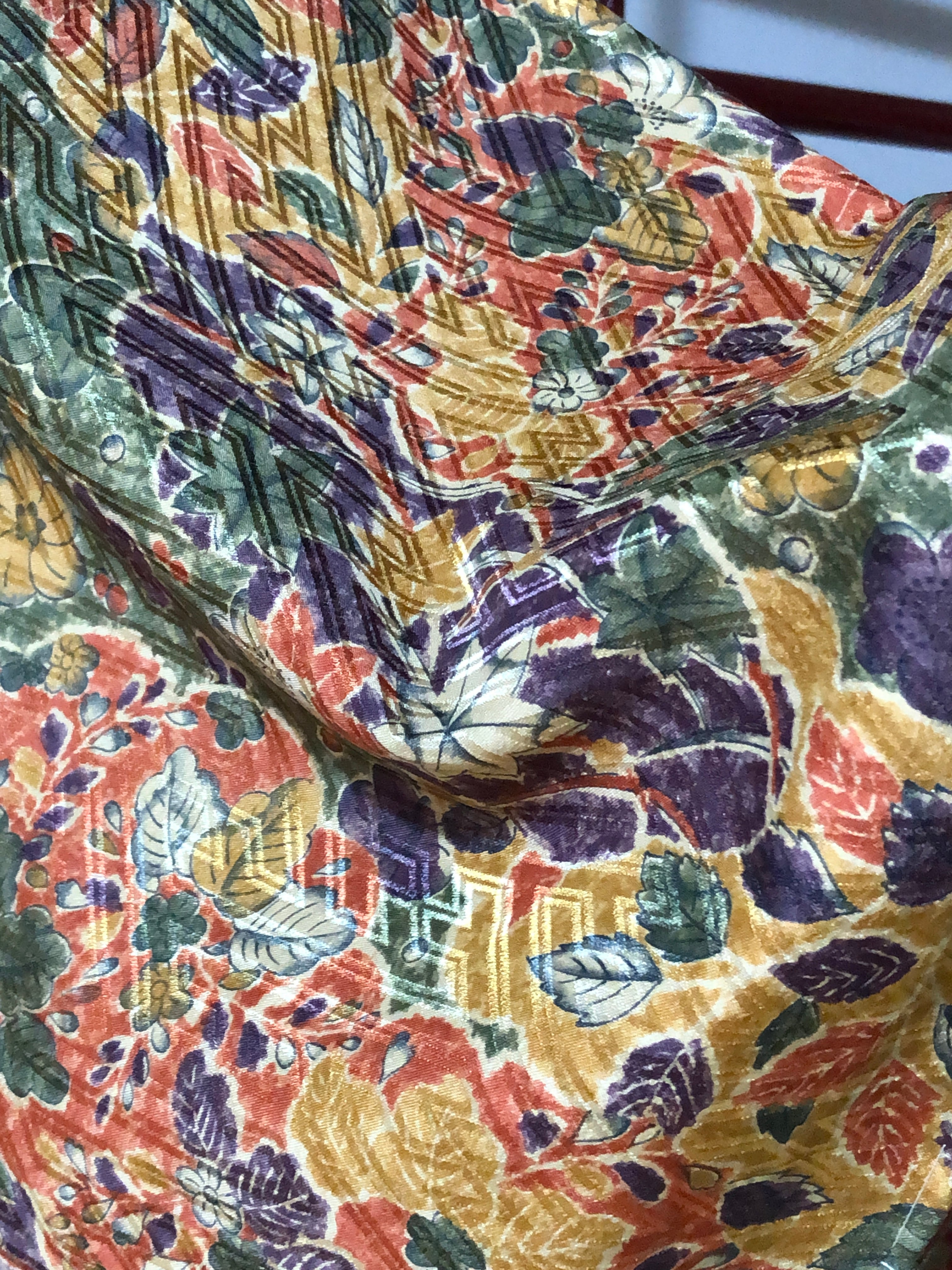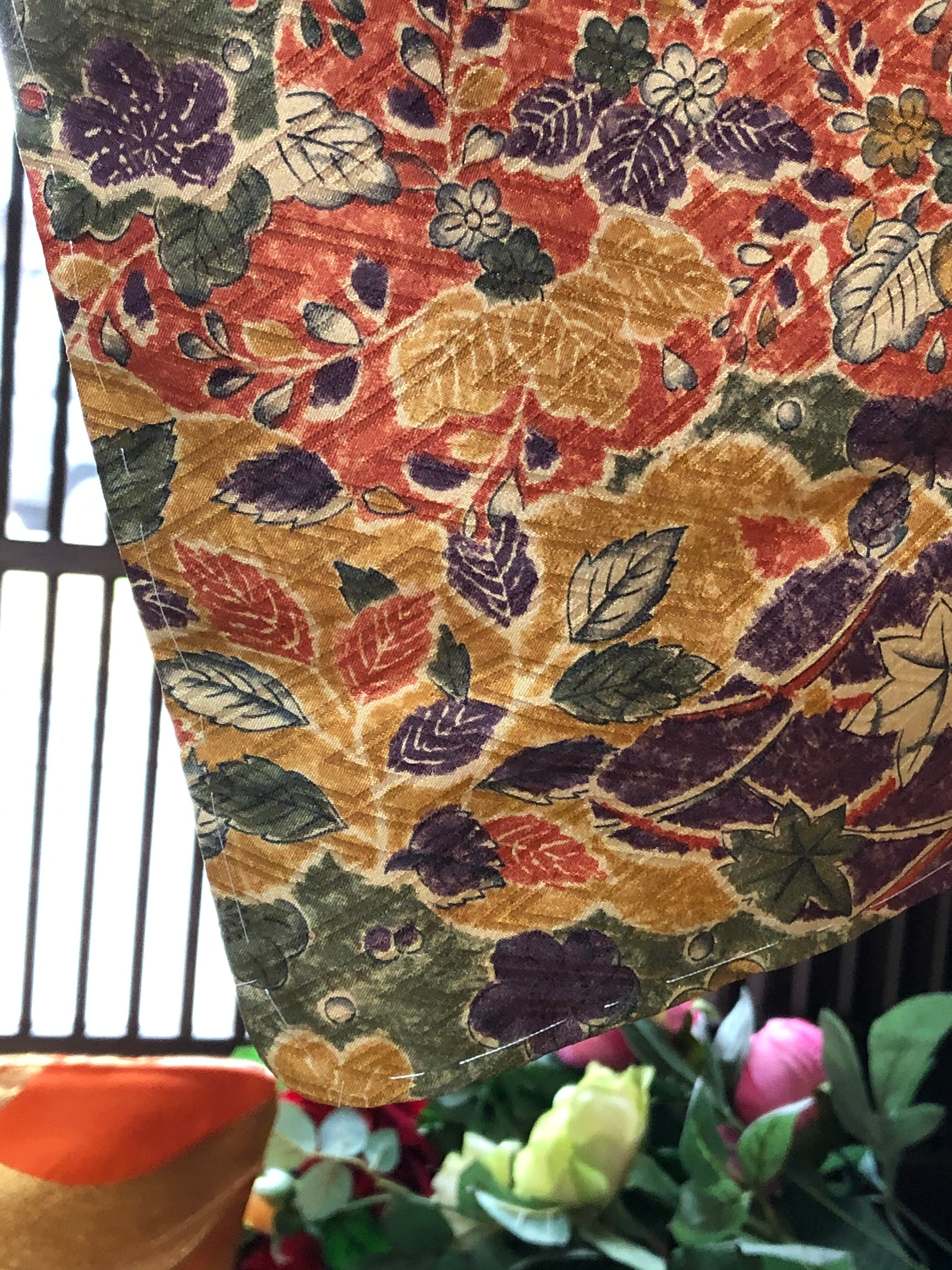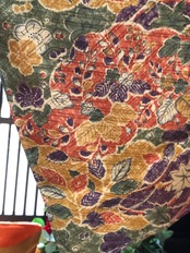 オレンジ、黄土色、緑、紫などで賑やかに紅葉や秋の葉が描かれた秋色小紋。