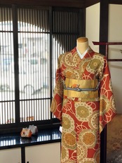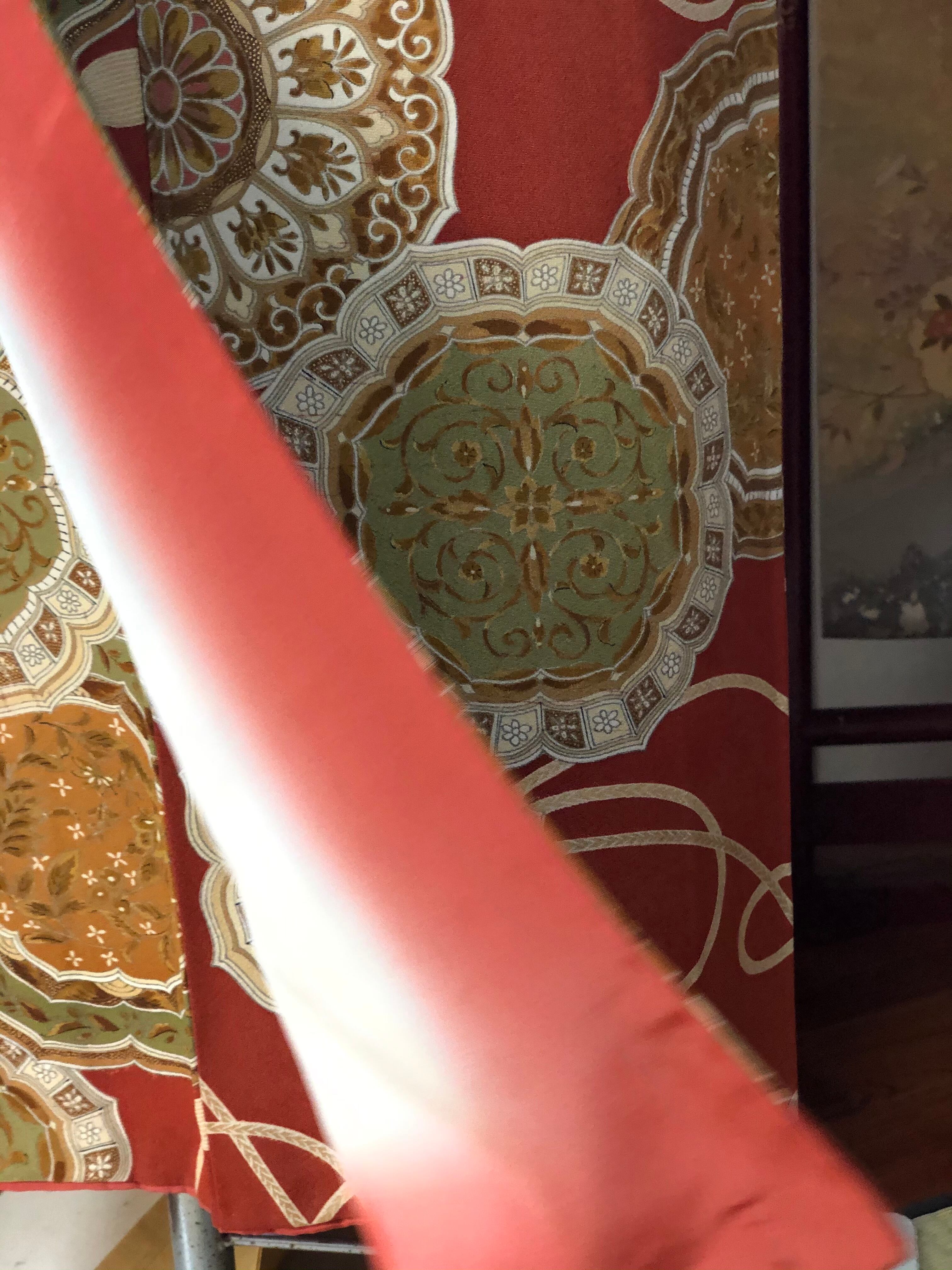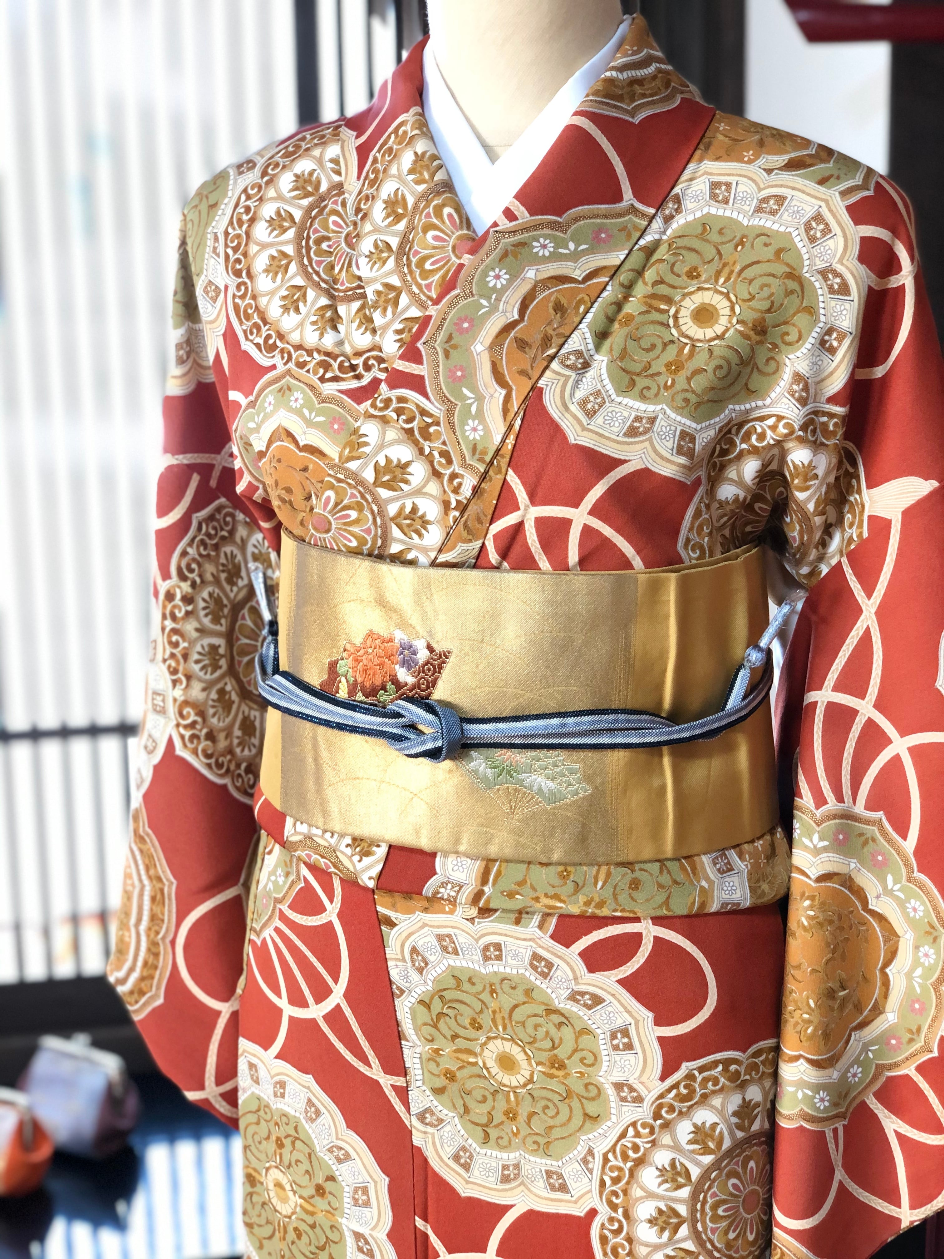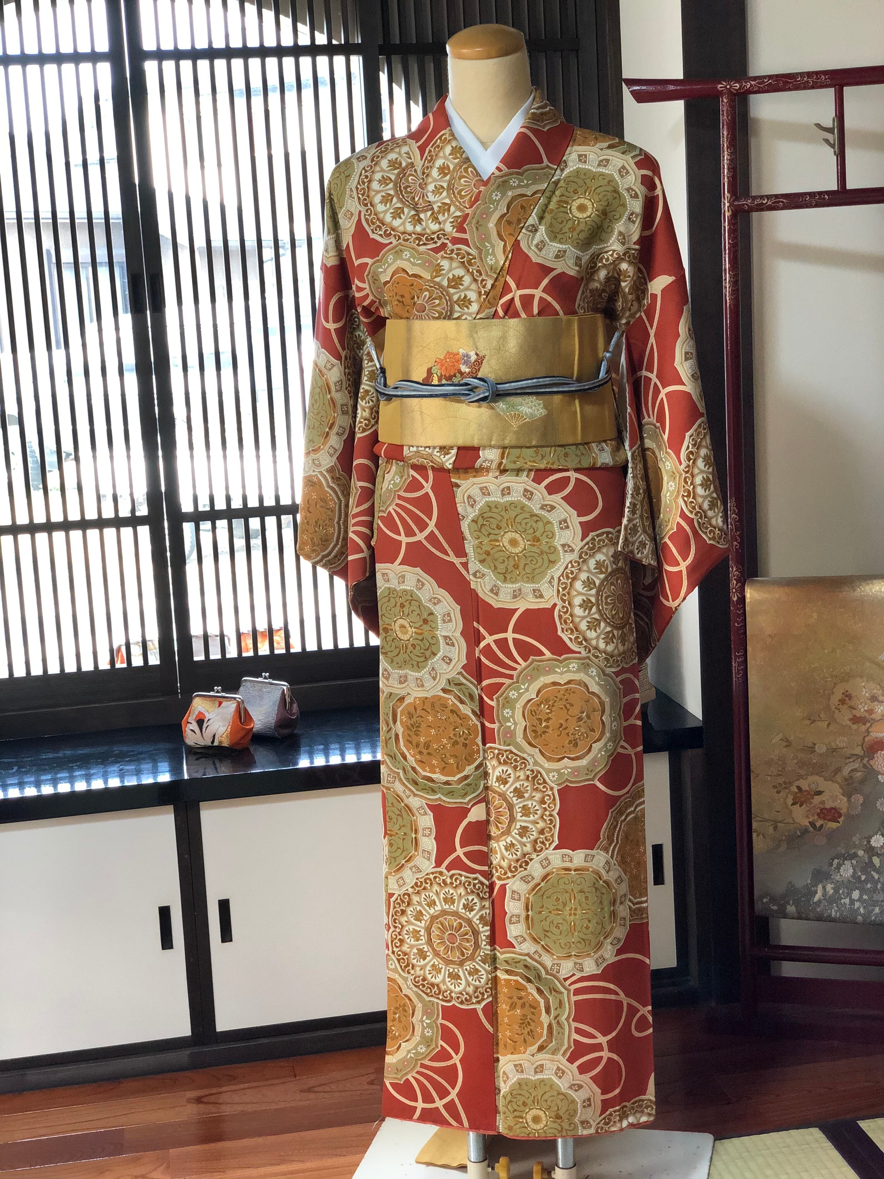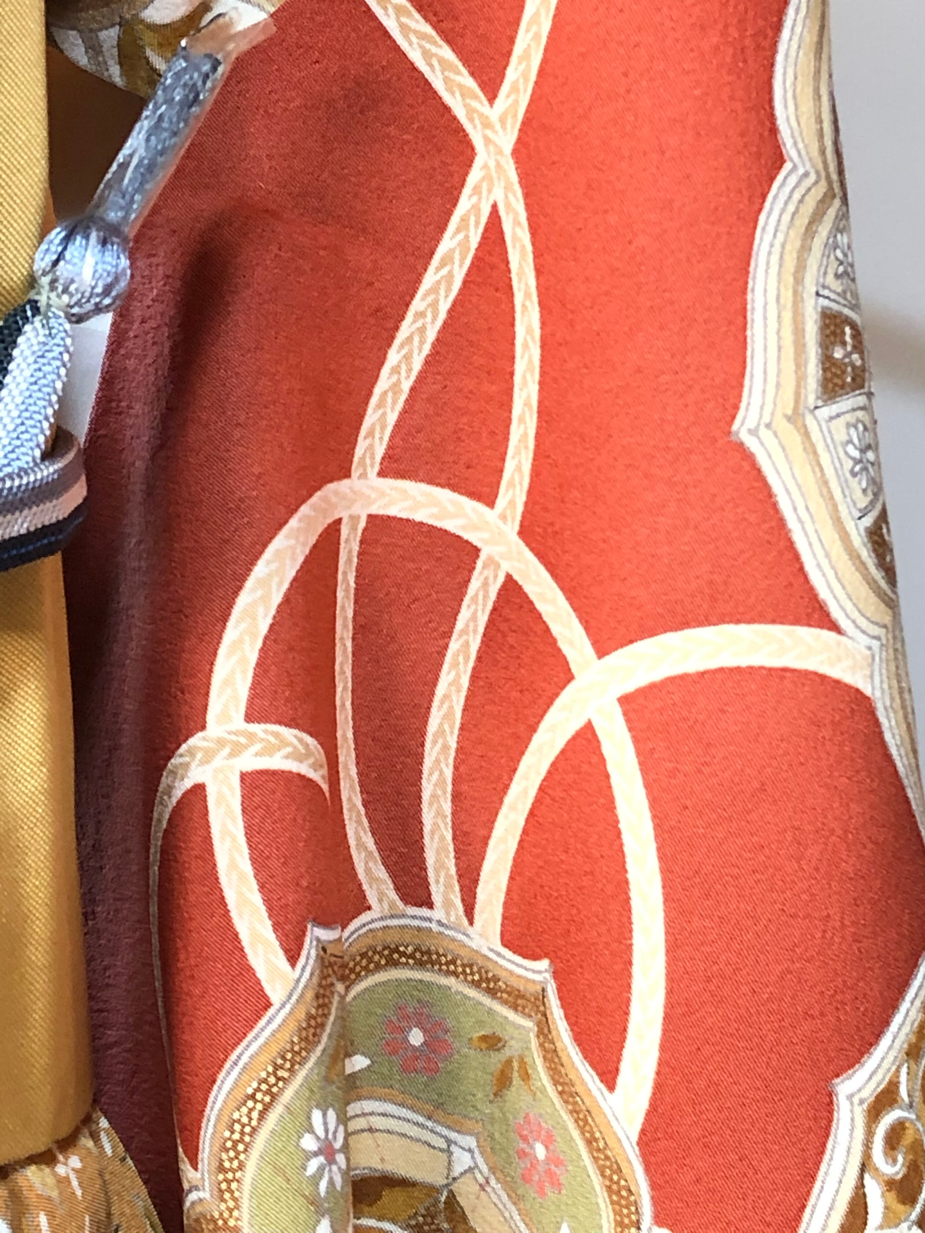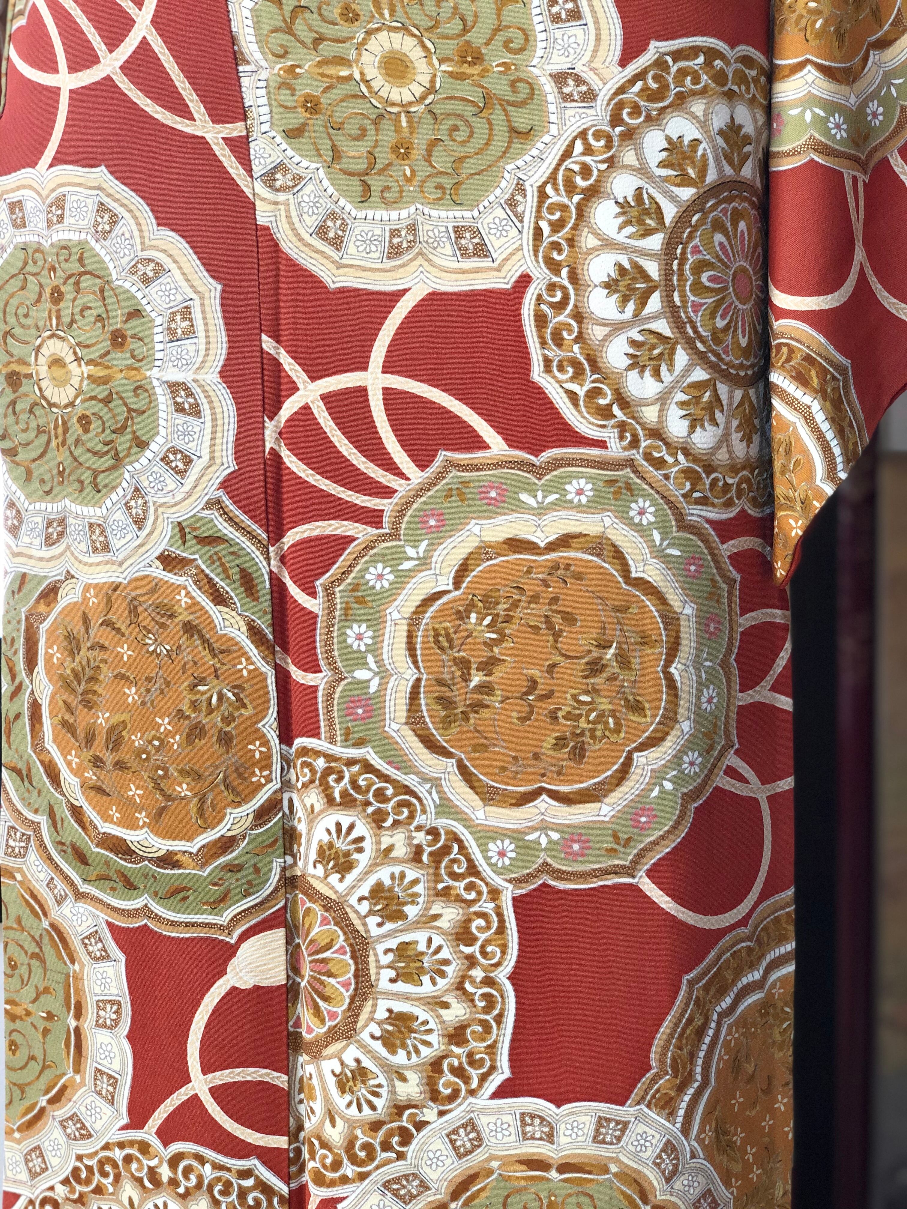 落ち着いた赤茶色の地に大胆に描かれた華紋。