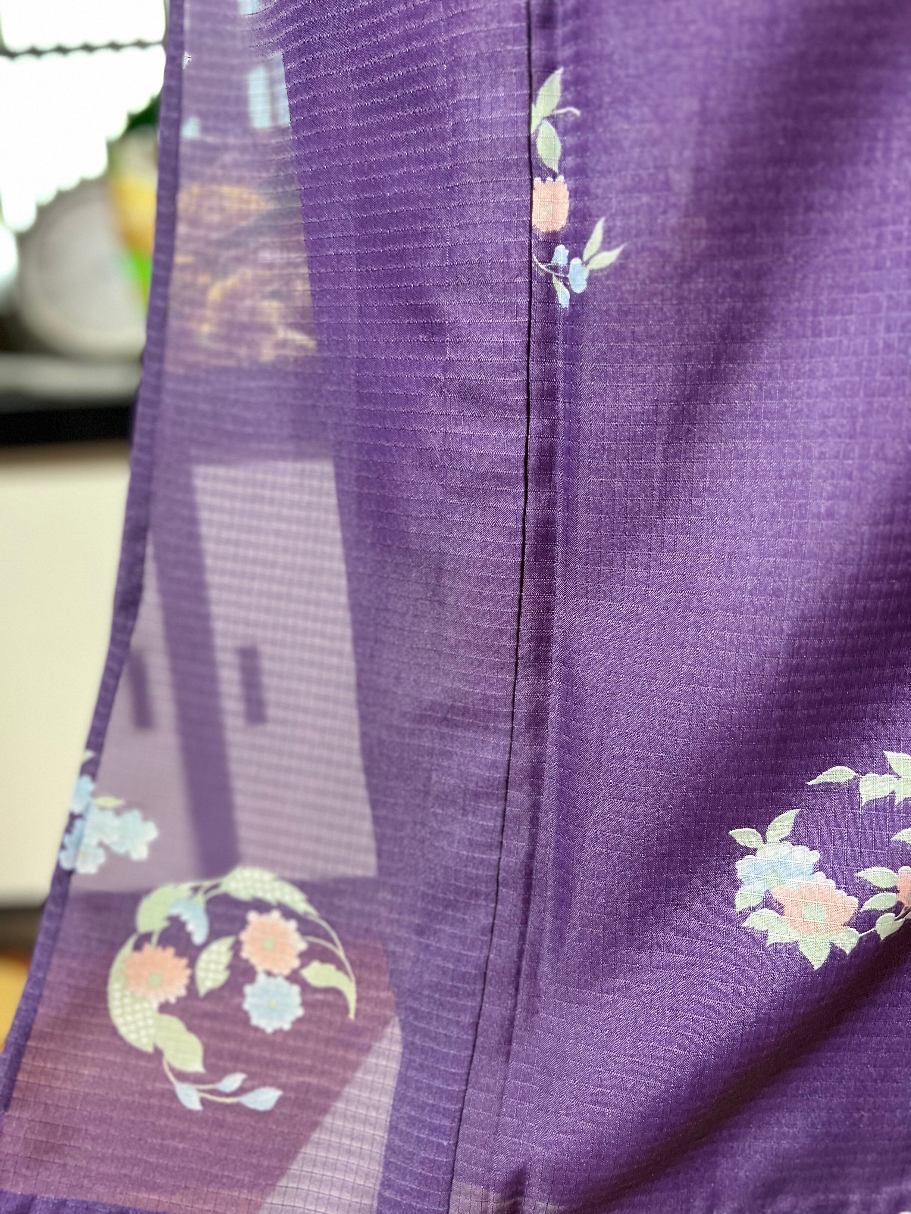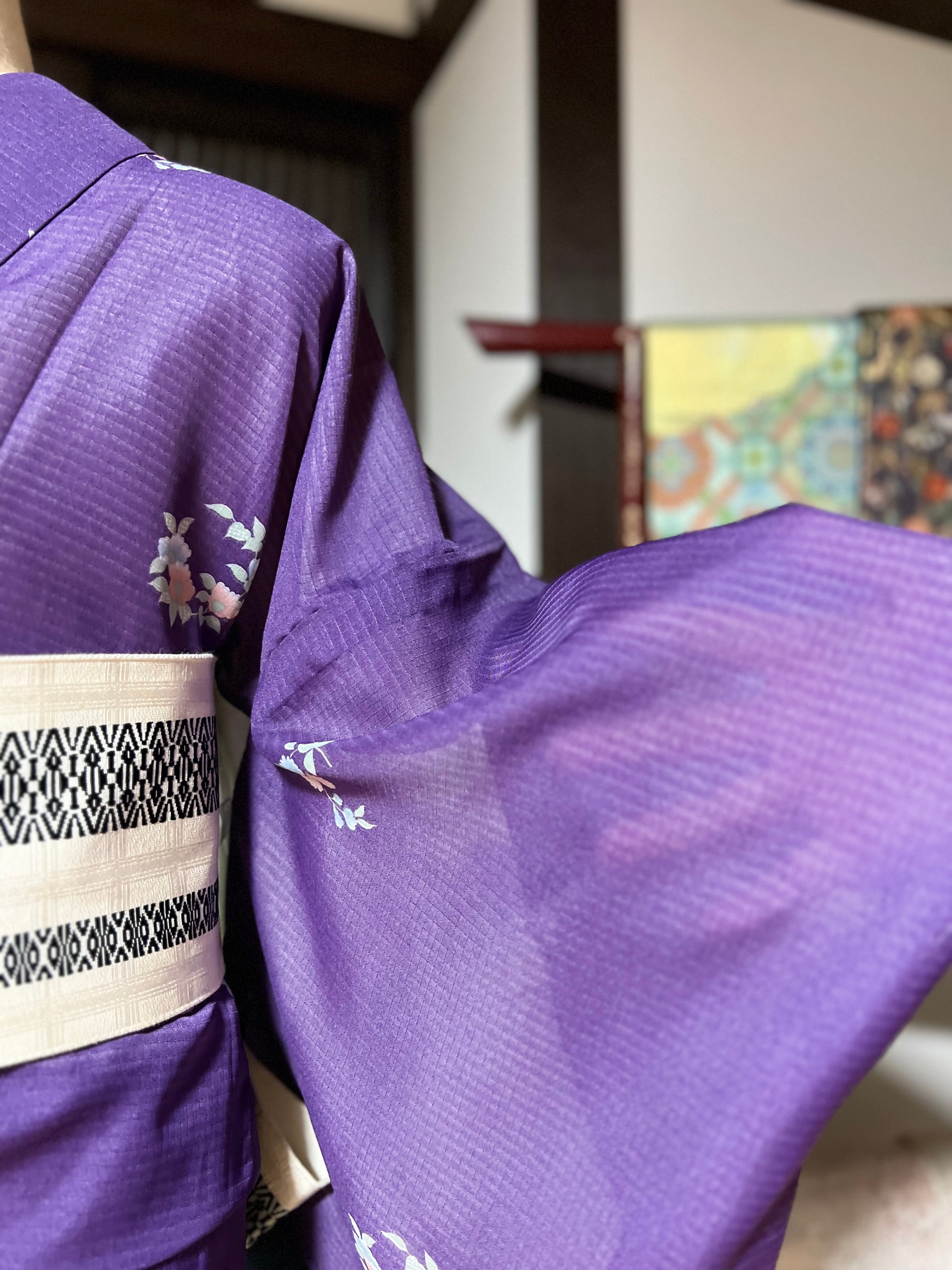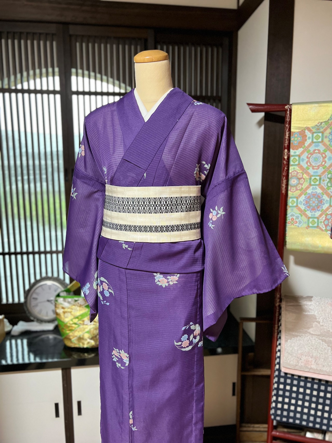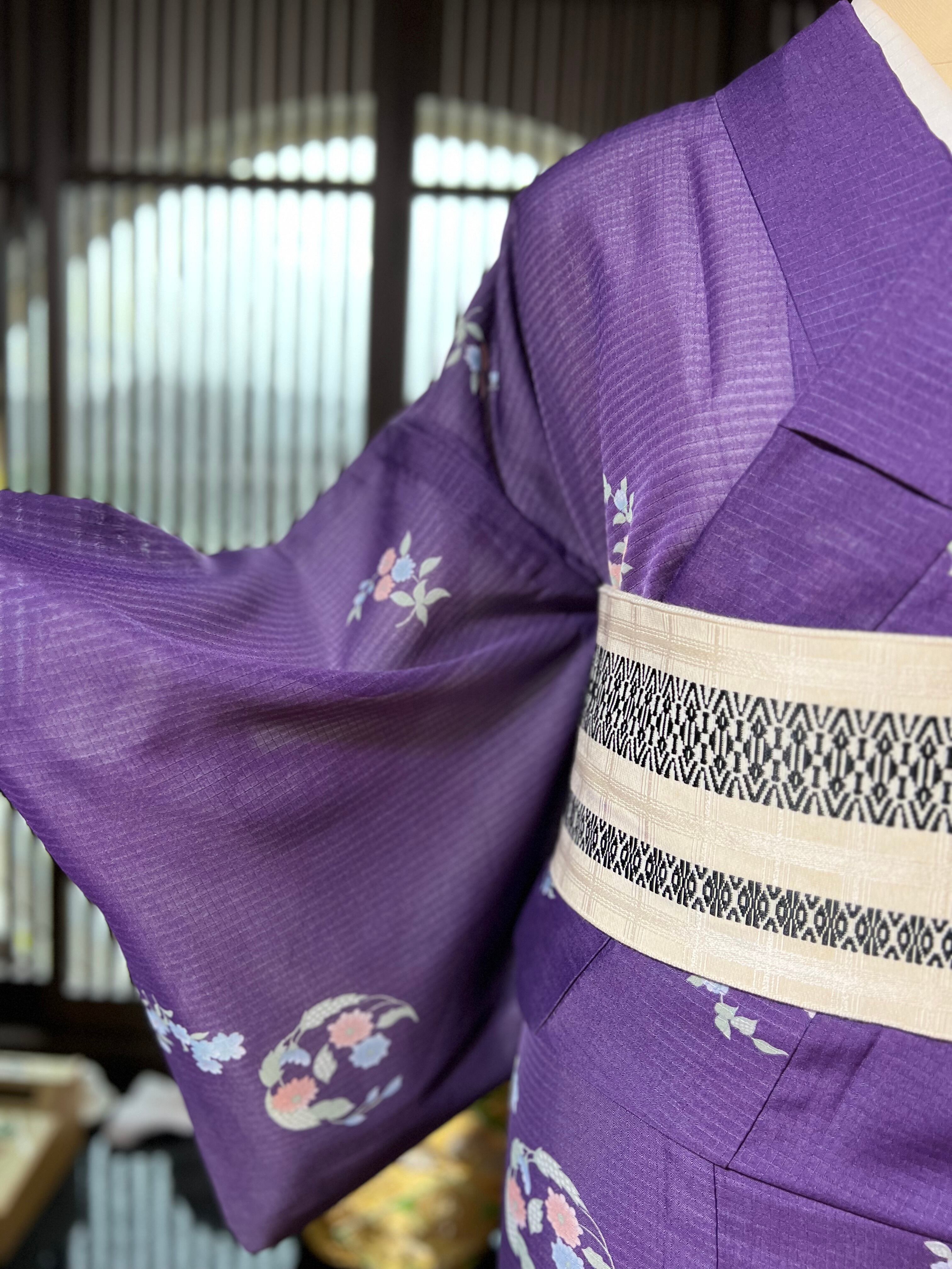 この紫夏小紋は、華やかさと上品さを持ち合わせた一枚です。特別な日のお出掛けやご婦人の集まりなど、大切な場面で心を躍らせること間違いありません。紫夏小紋を着ることで、あなたの存在感が一層際立つことでしょう。