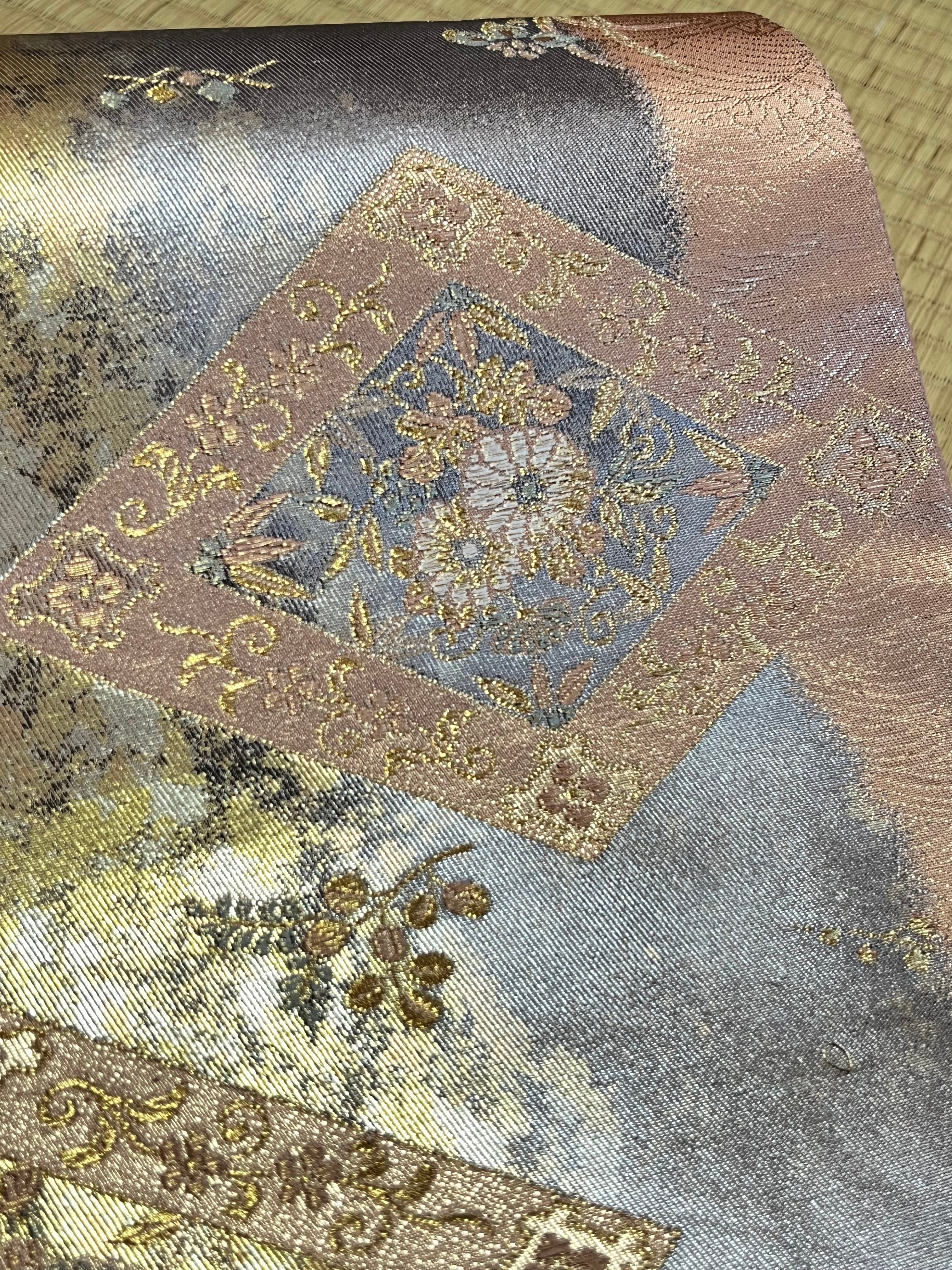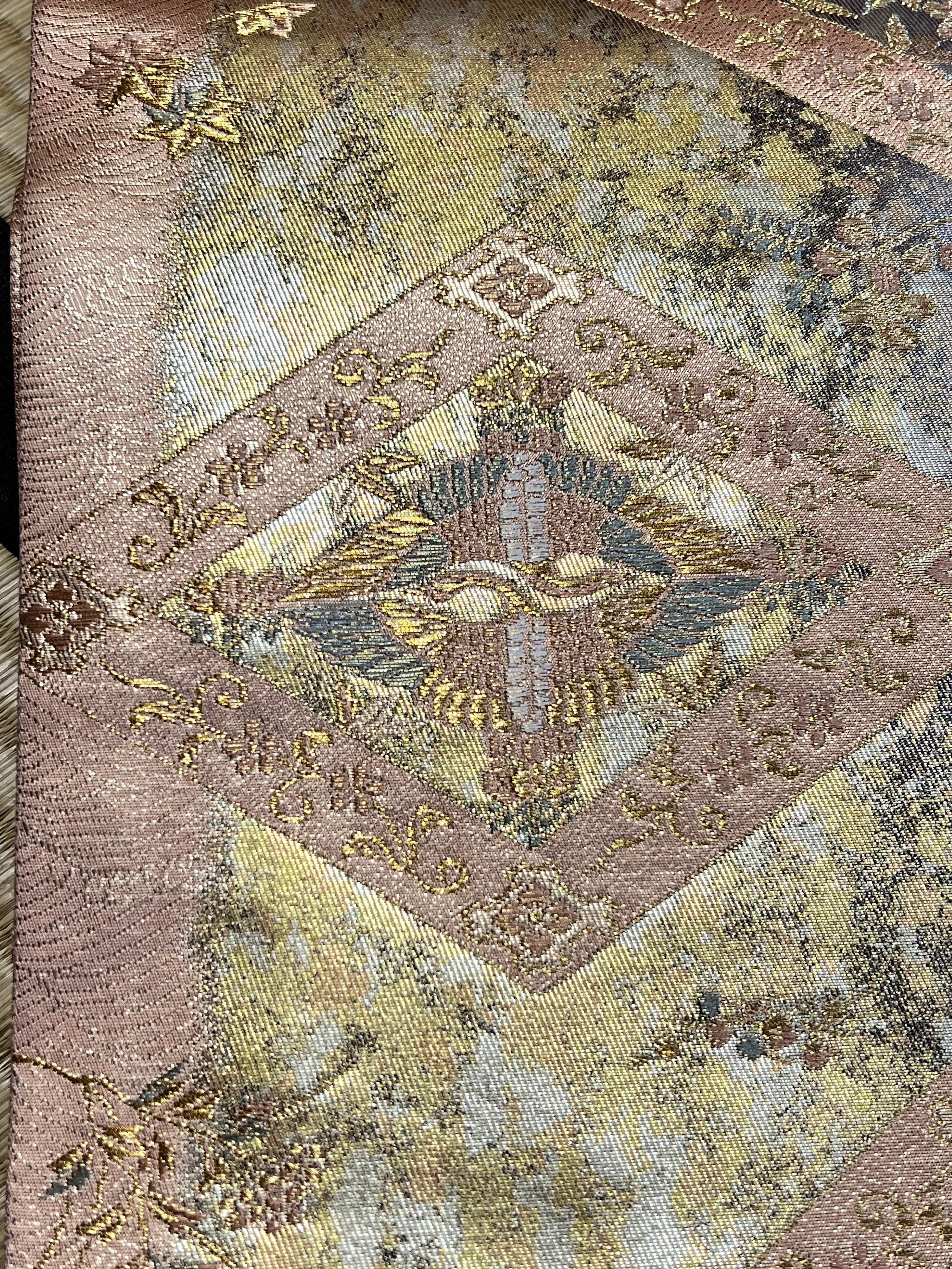 あなたの特別な日を、さらに特別なものにしてくれるピンクゴールド六通袋帯。どんなシーンでも輝きを放ち、あなたを一層美しく魅せてくれることでしょう。