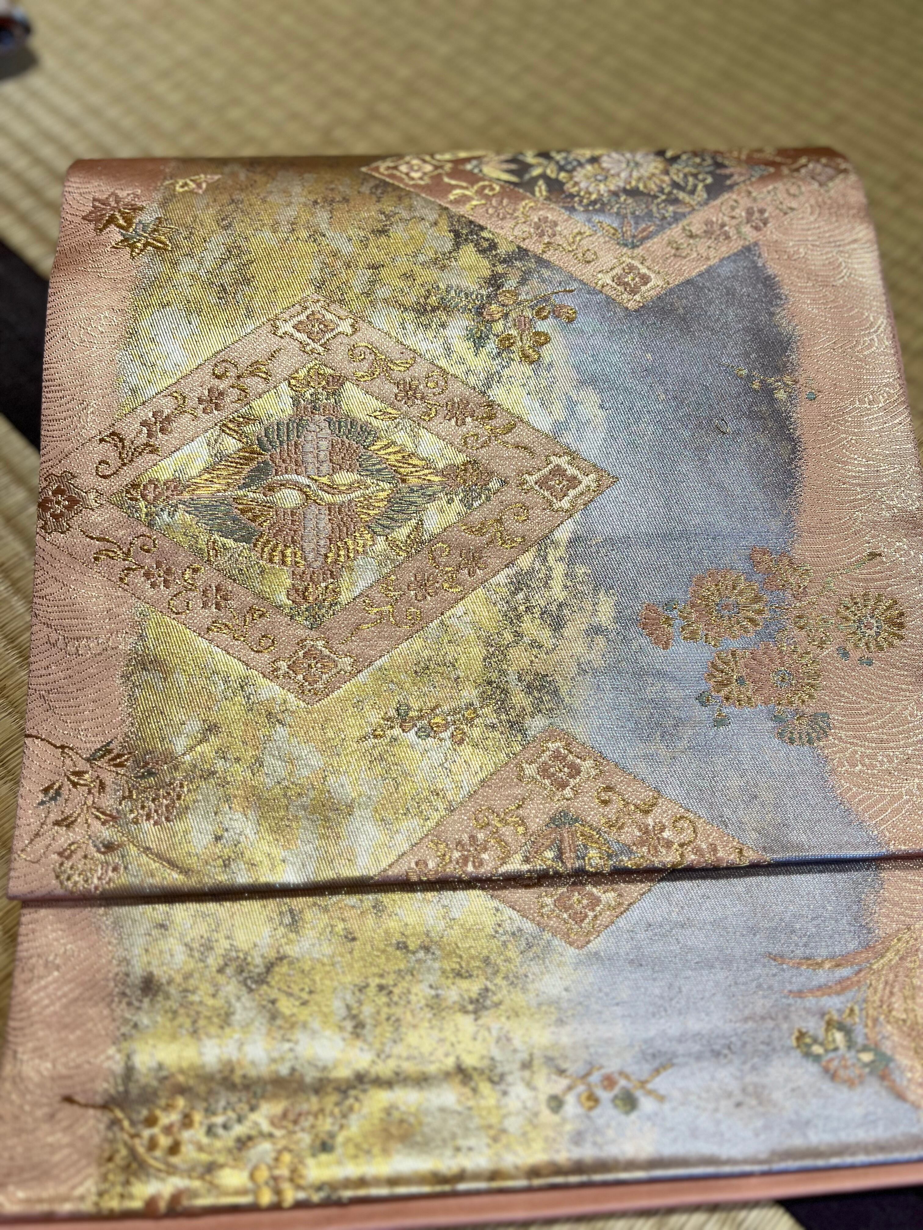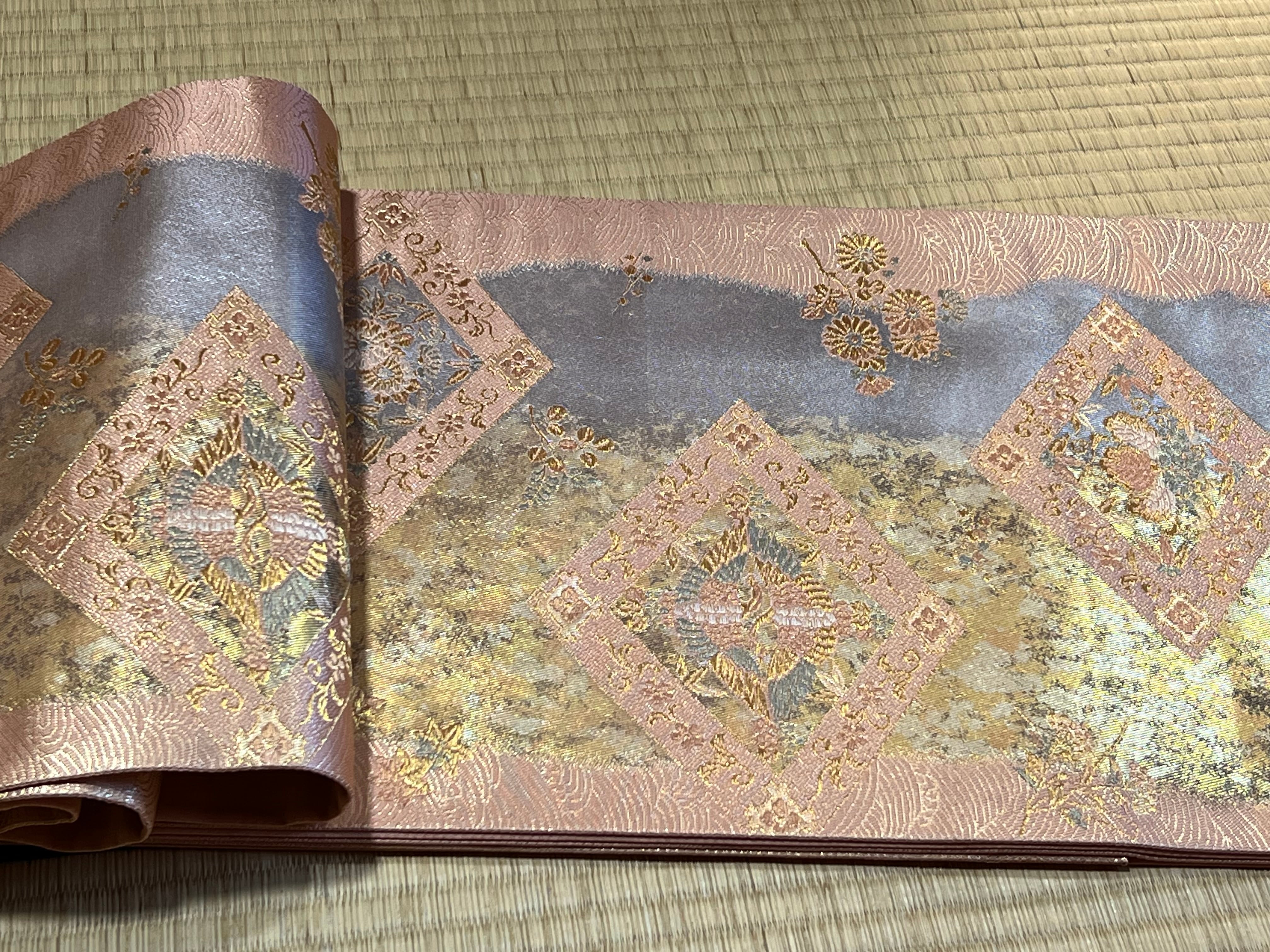 優雅な華やかさが漂うこの帯は、ピンクとゴールドの鮮やかな色合いと紫の差し色が特徴的で、桐、菊、鳳凰などが贅沢に描かれています。