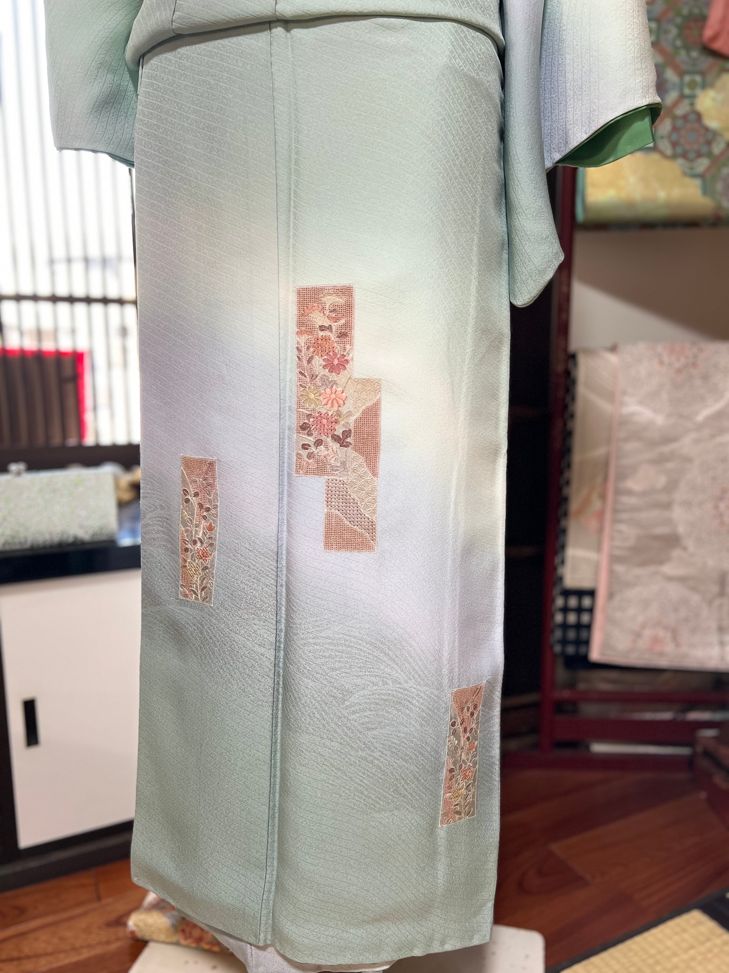 素敵な季節を彩る薄緑のグラデーション刺繍訪問着です。汕頭刺繍を施した、上品で華やかな一着です。卒業や入学、お正月などの特別なシーンにぴったりです。